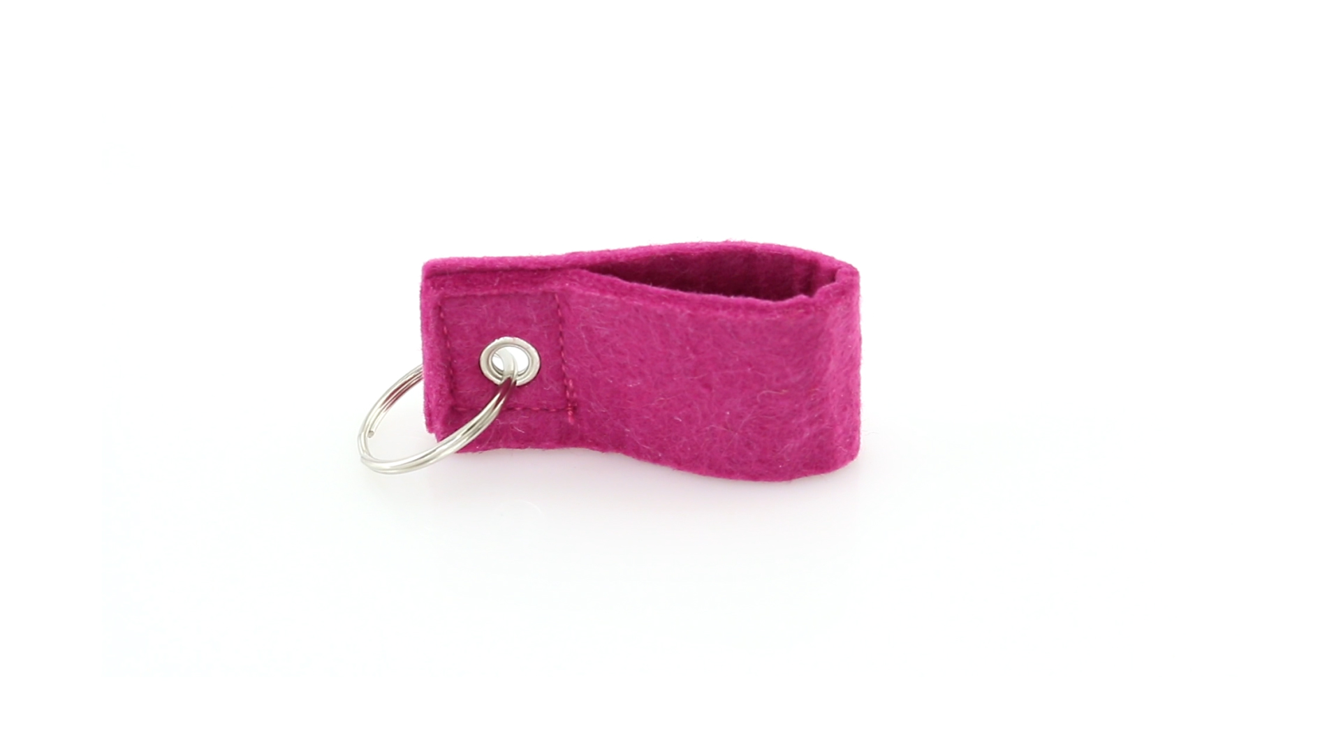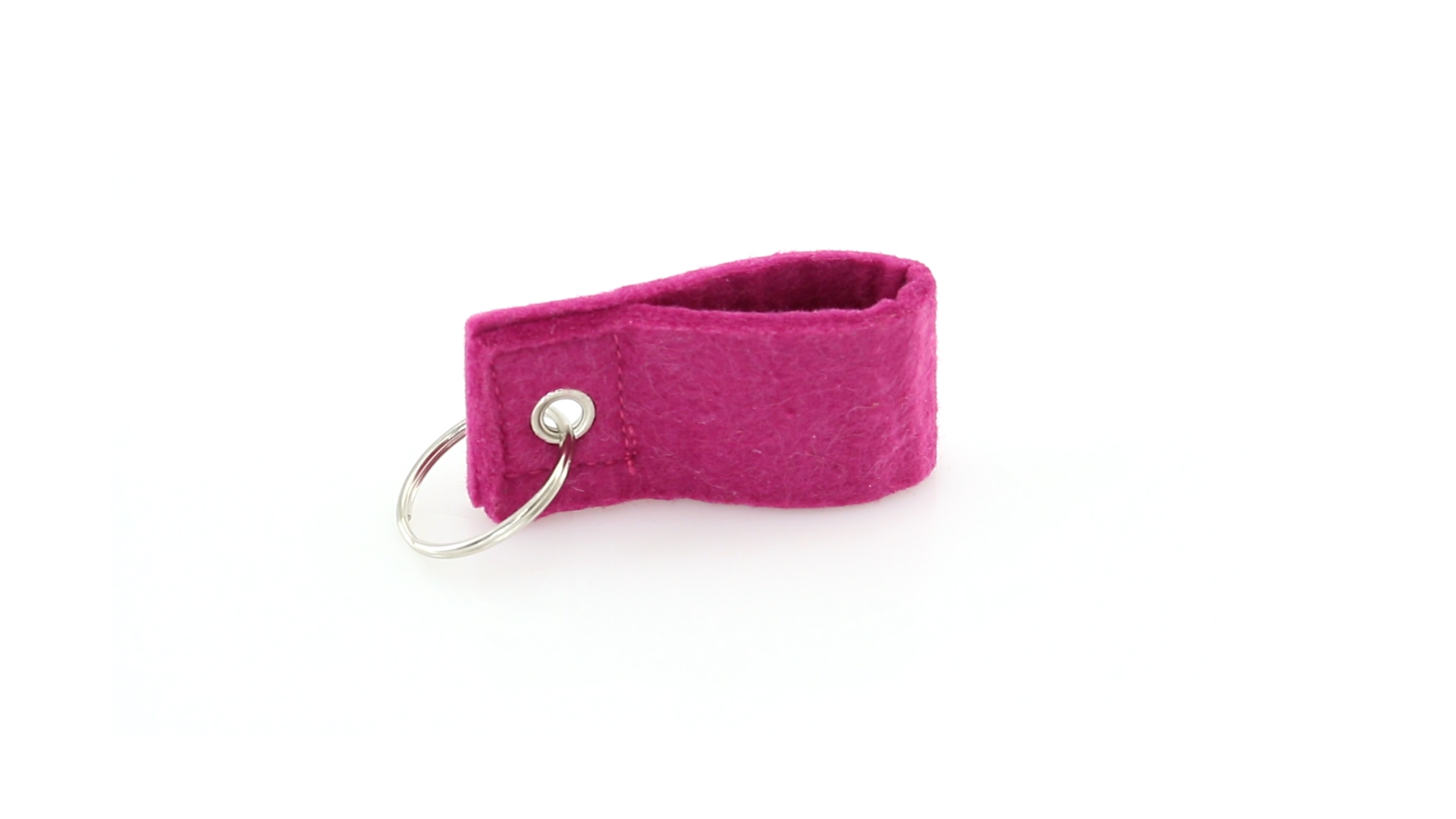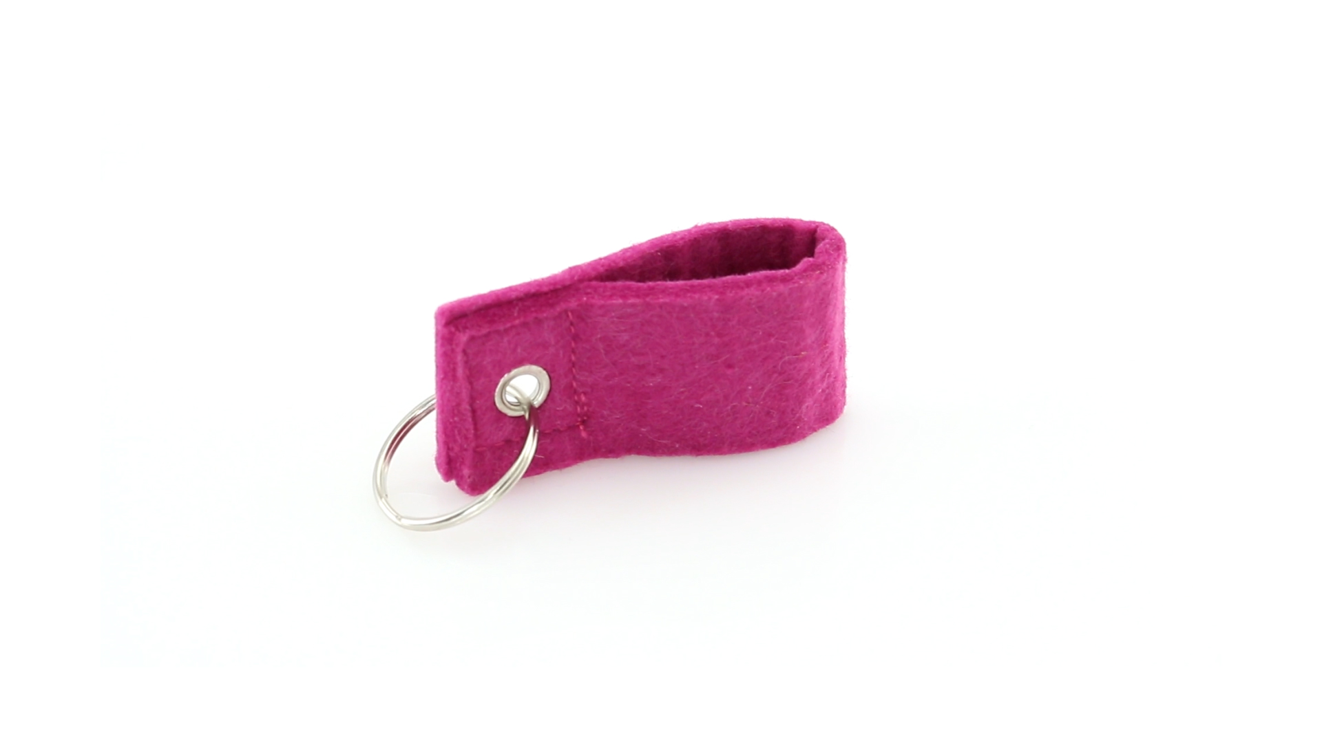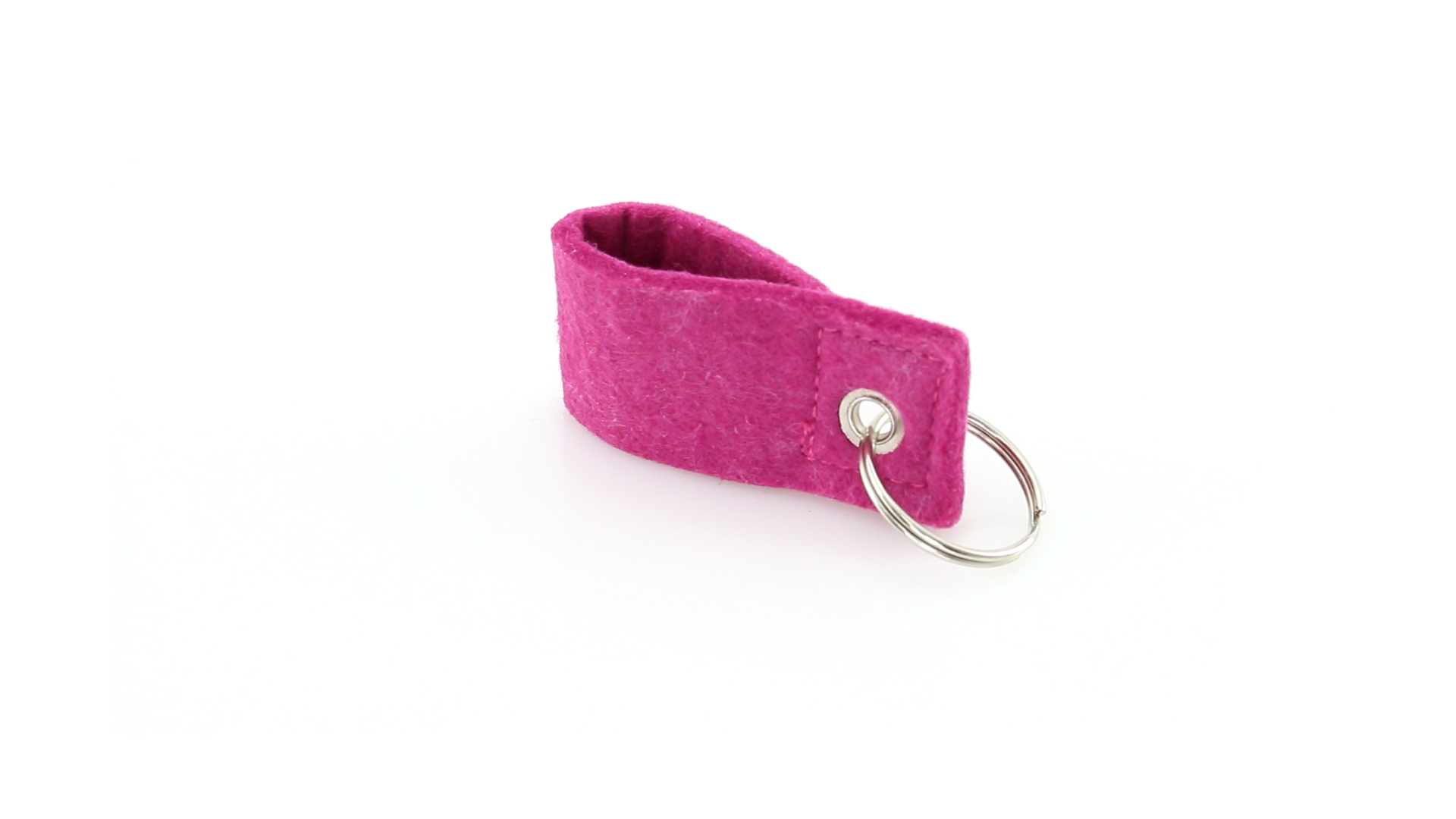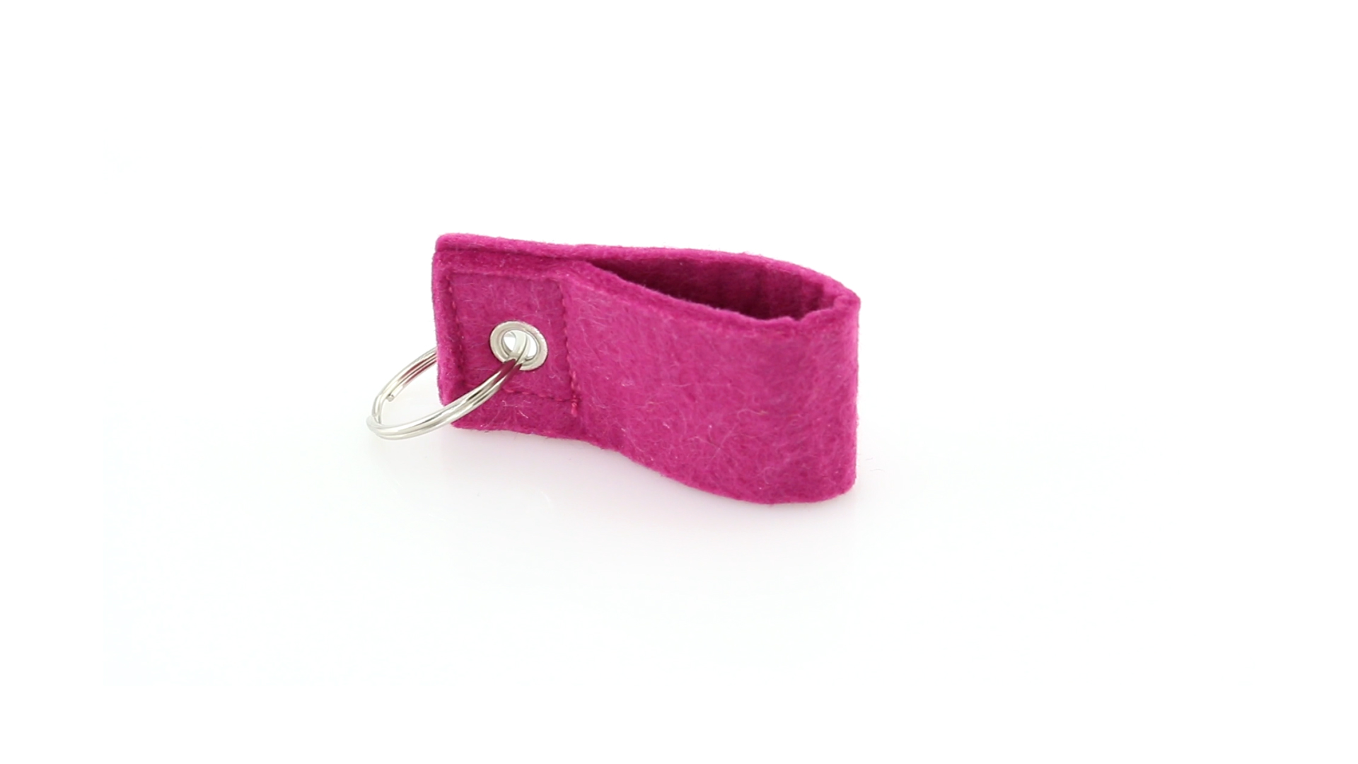 Schlüsselanhänger aus weichem Filz in verschiedenen kräftigen Farben mit Metallöse zur Verstärkung.