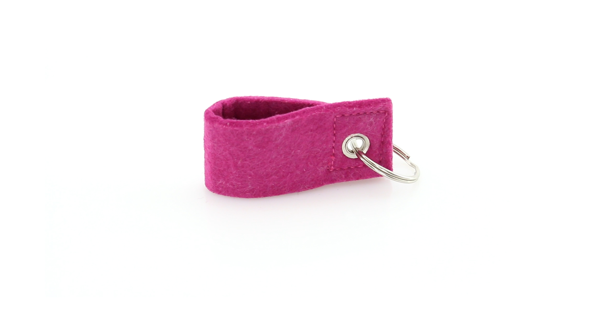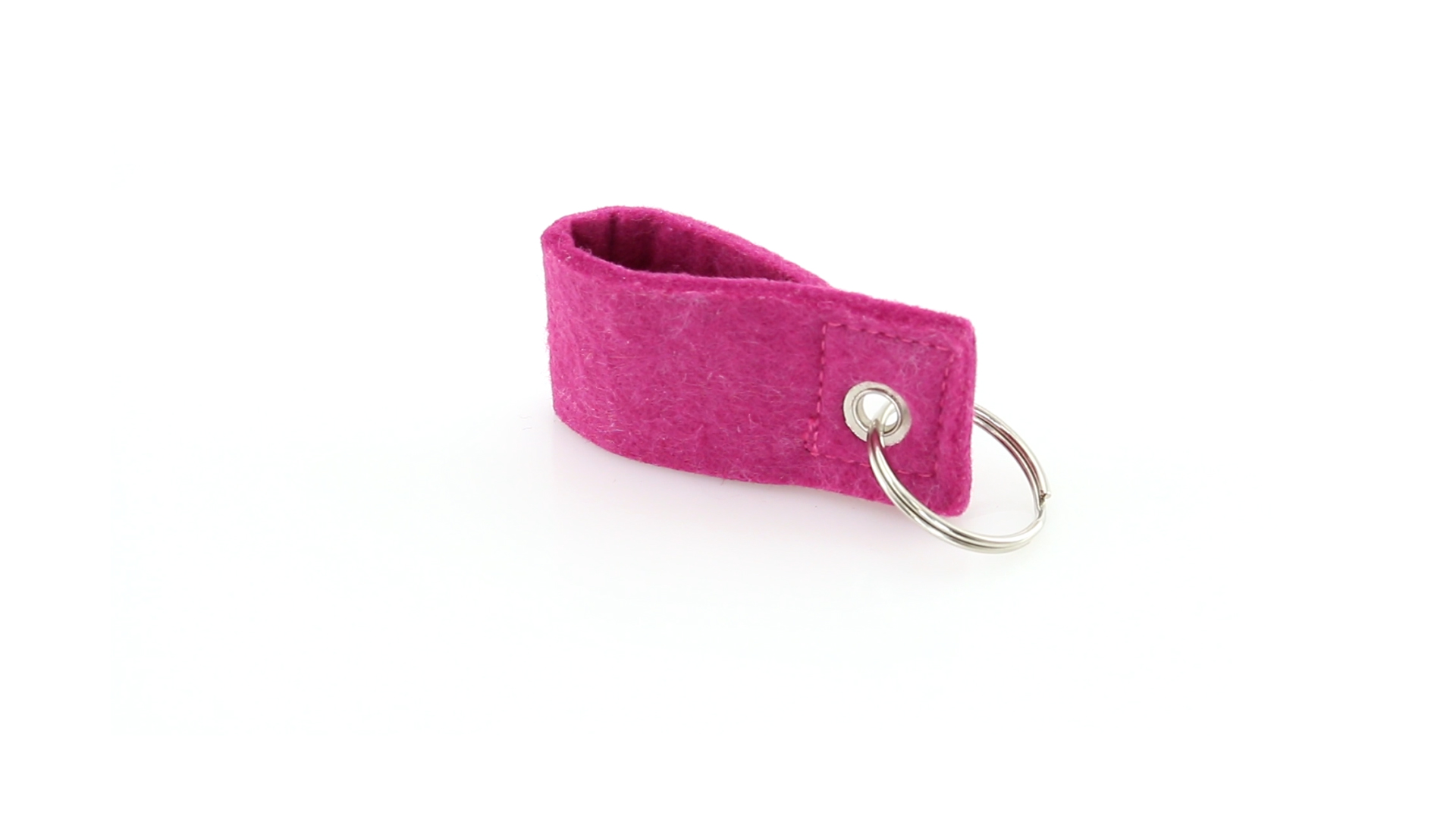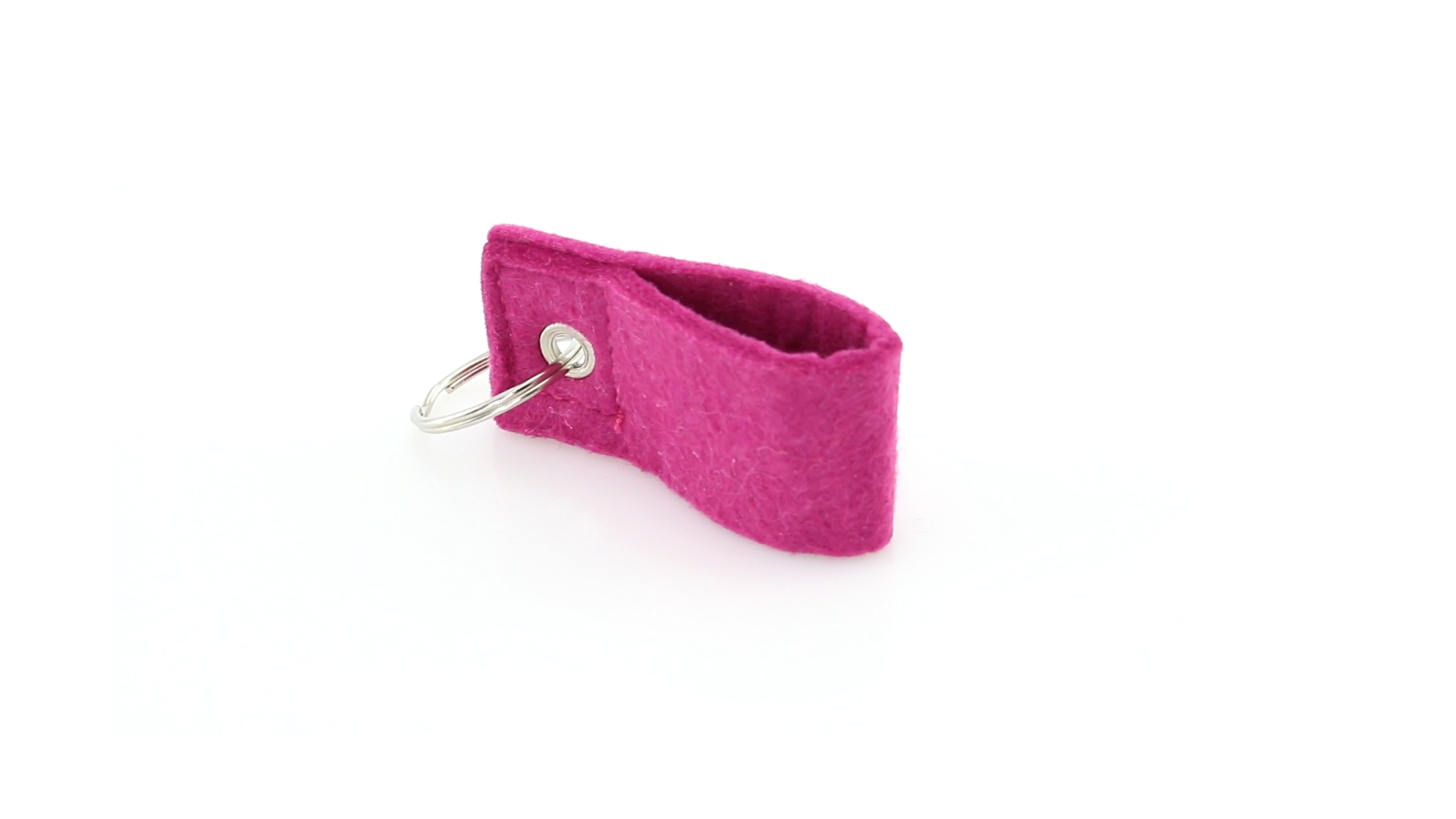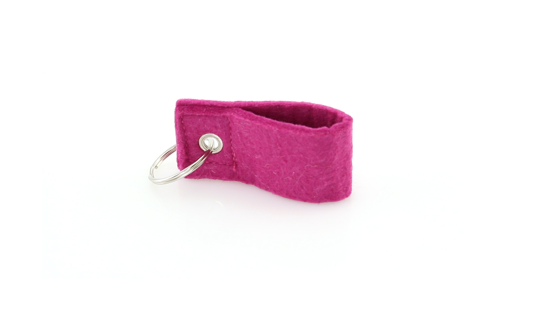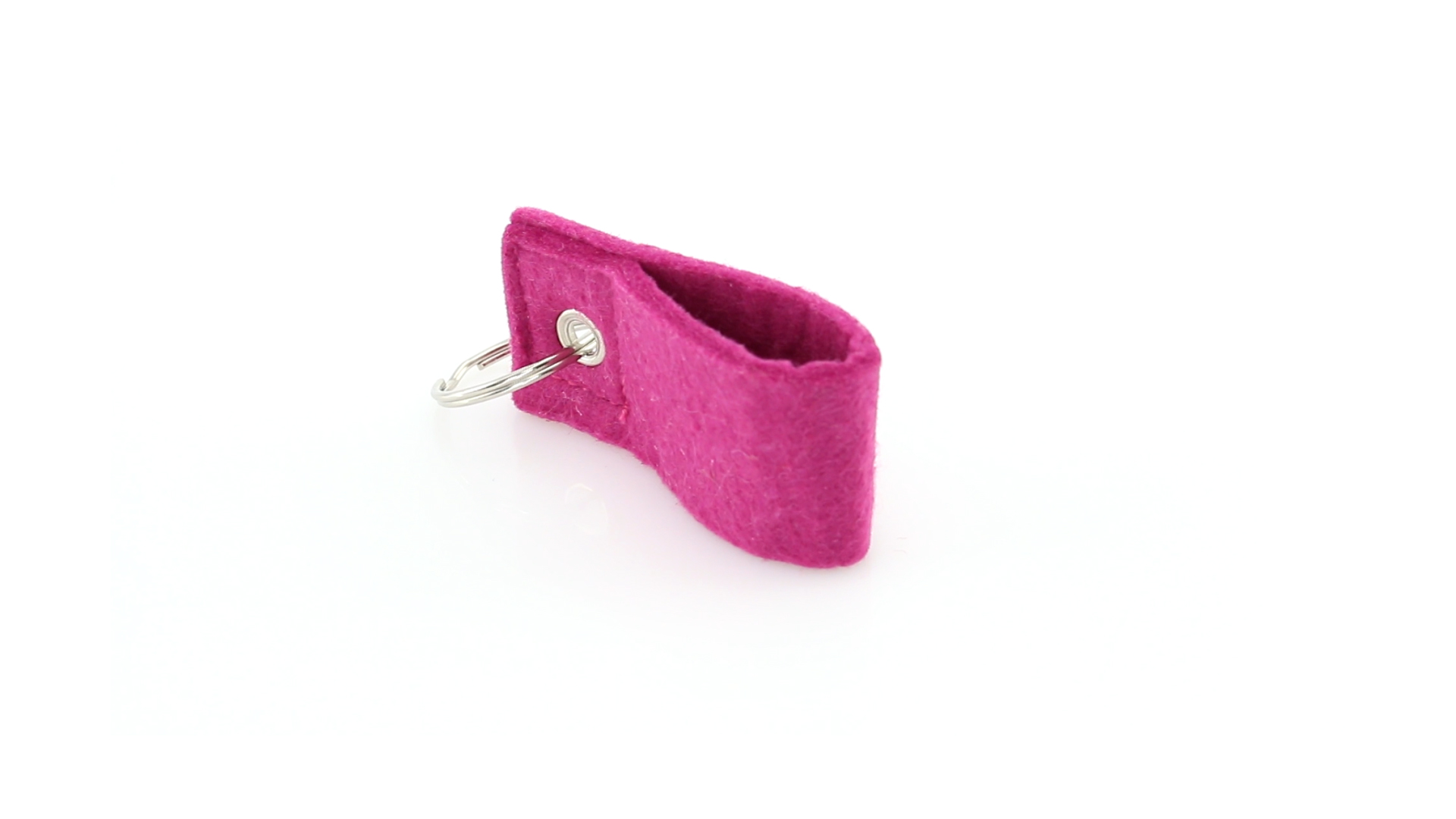 Schlüsselanhänger aus weichem Filz in verschiedenen kräftigen Farben mit Metallöse zur Verstärkung.