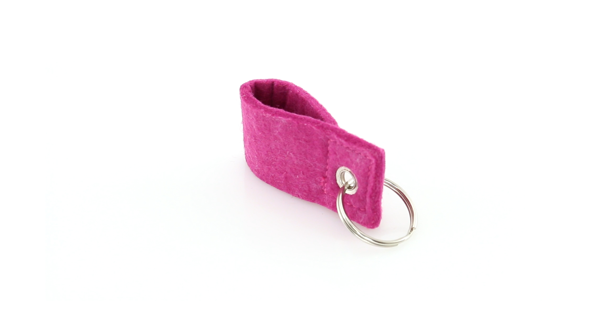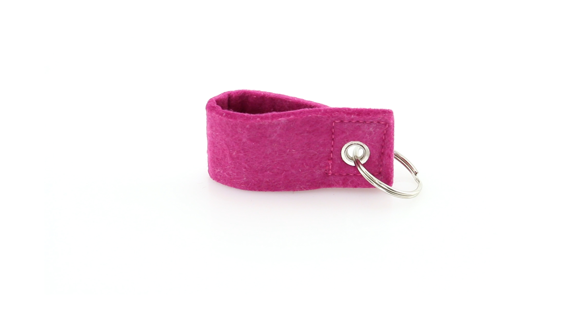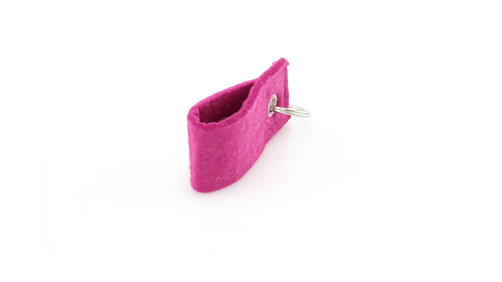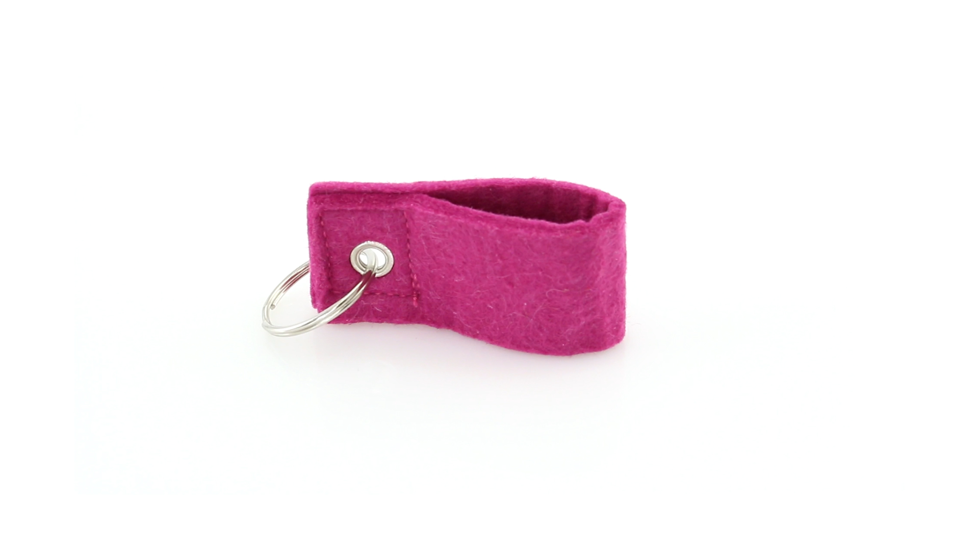 Schlüsselanhänger aus weichem Filz in verschiedenen kräftigen Farben mit Metallöse zur Verstärkung.