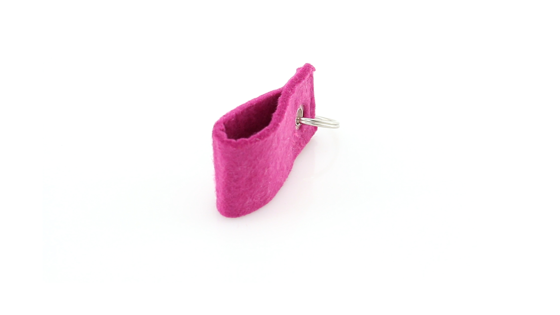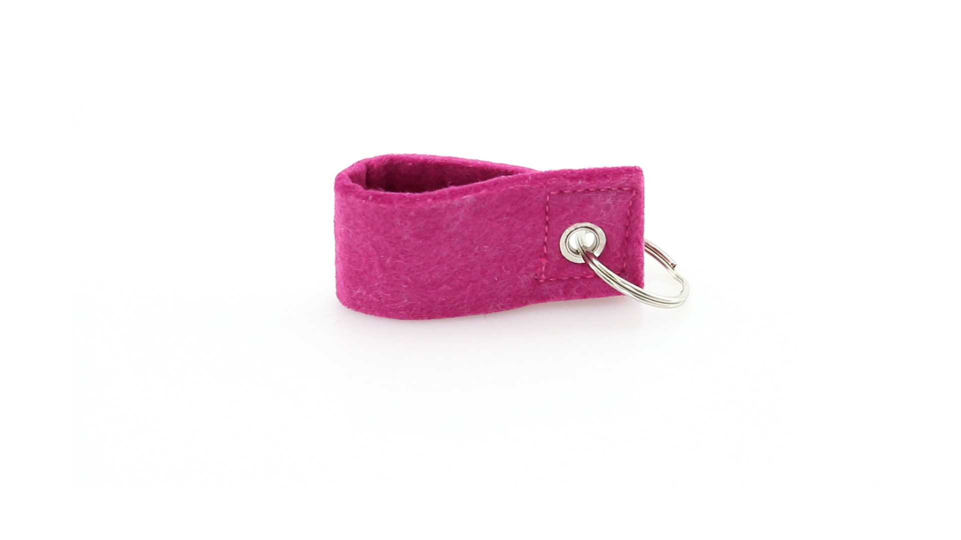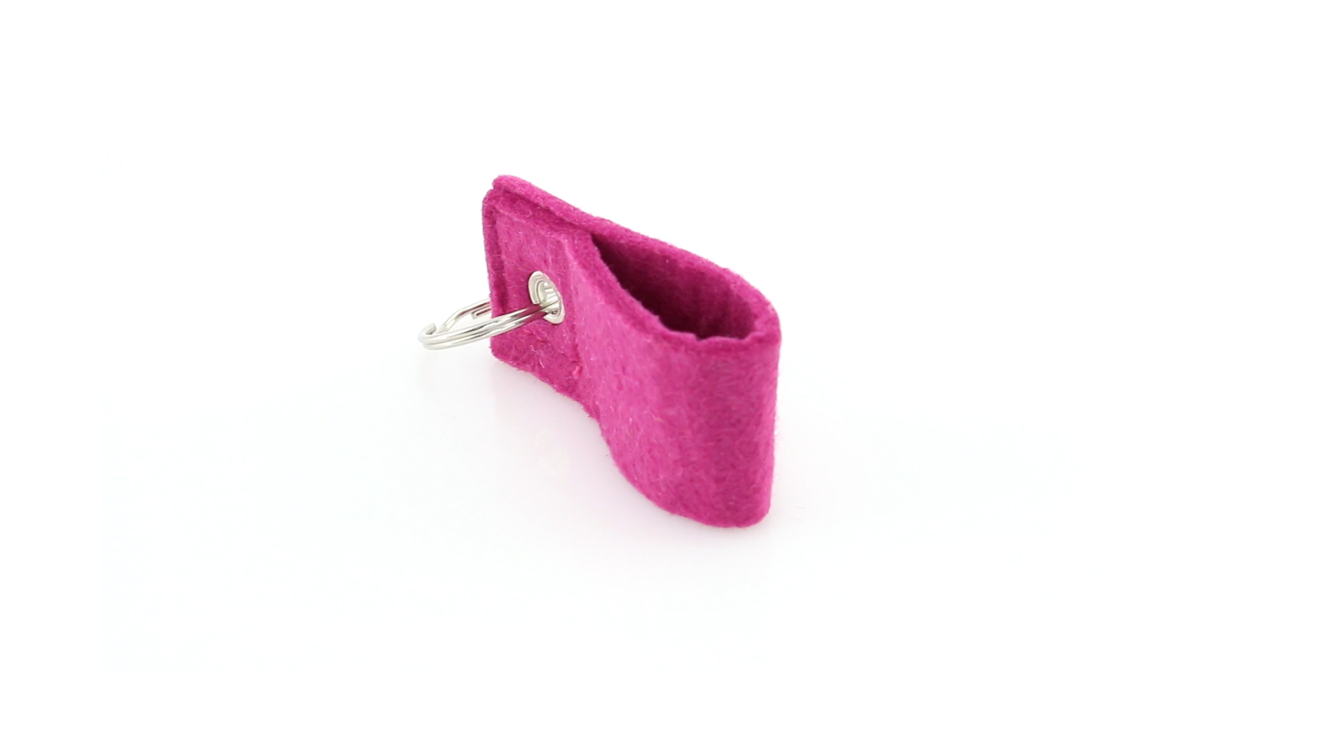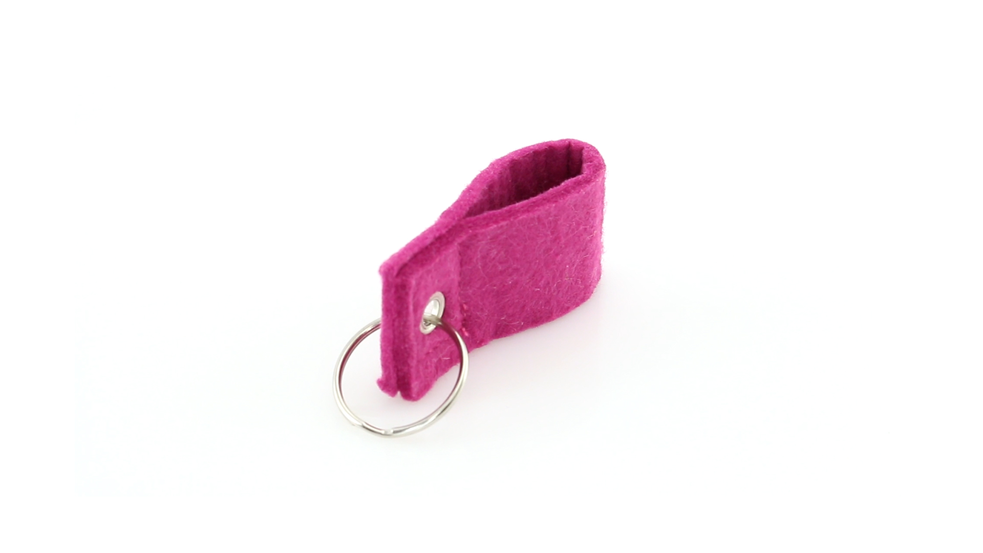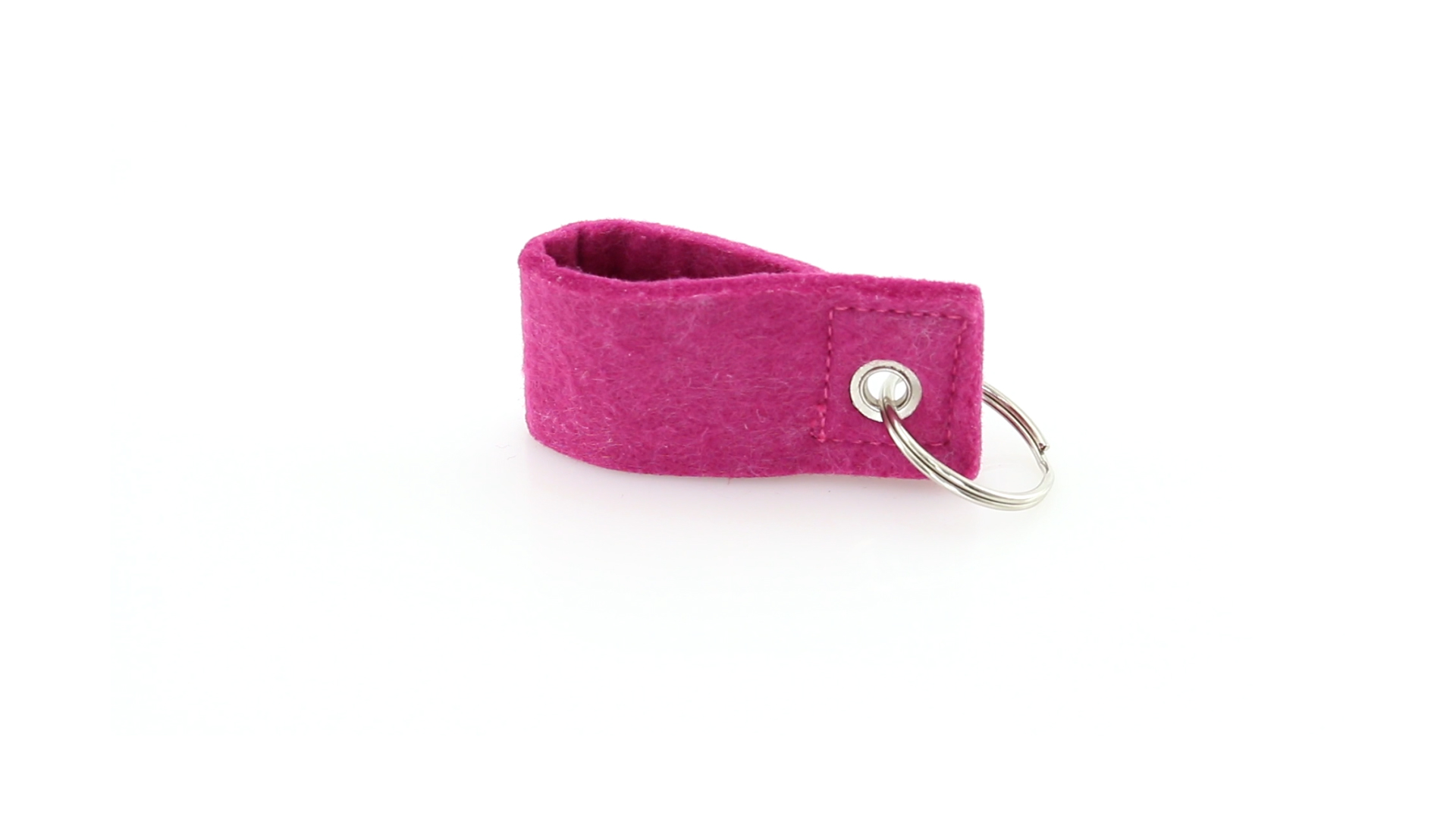 Schlüsselanhänger aus weichem Filz in verschiedenen kräftigen Farben mit Metallöse zur Verstärkung.