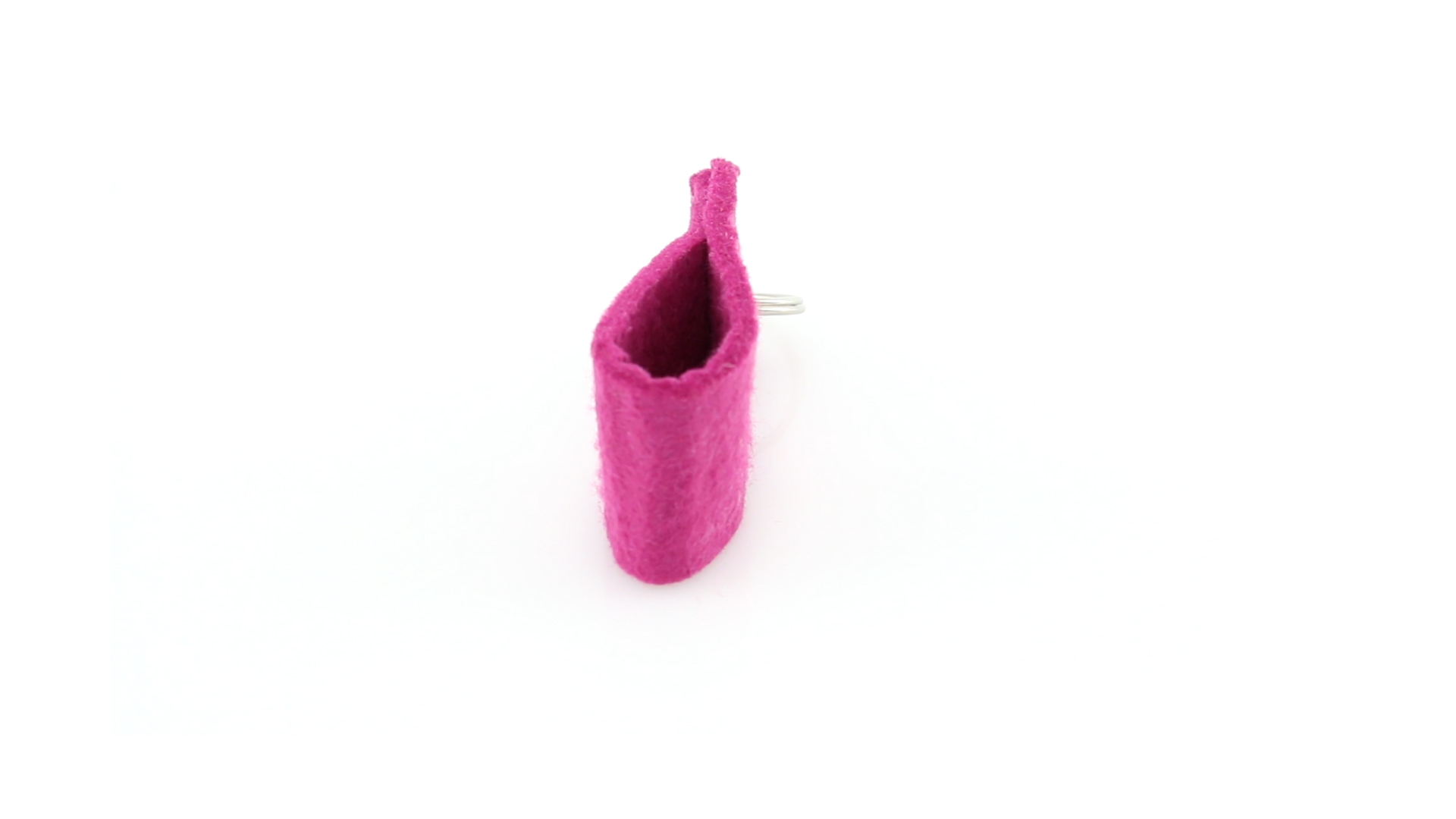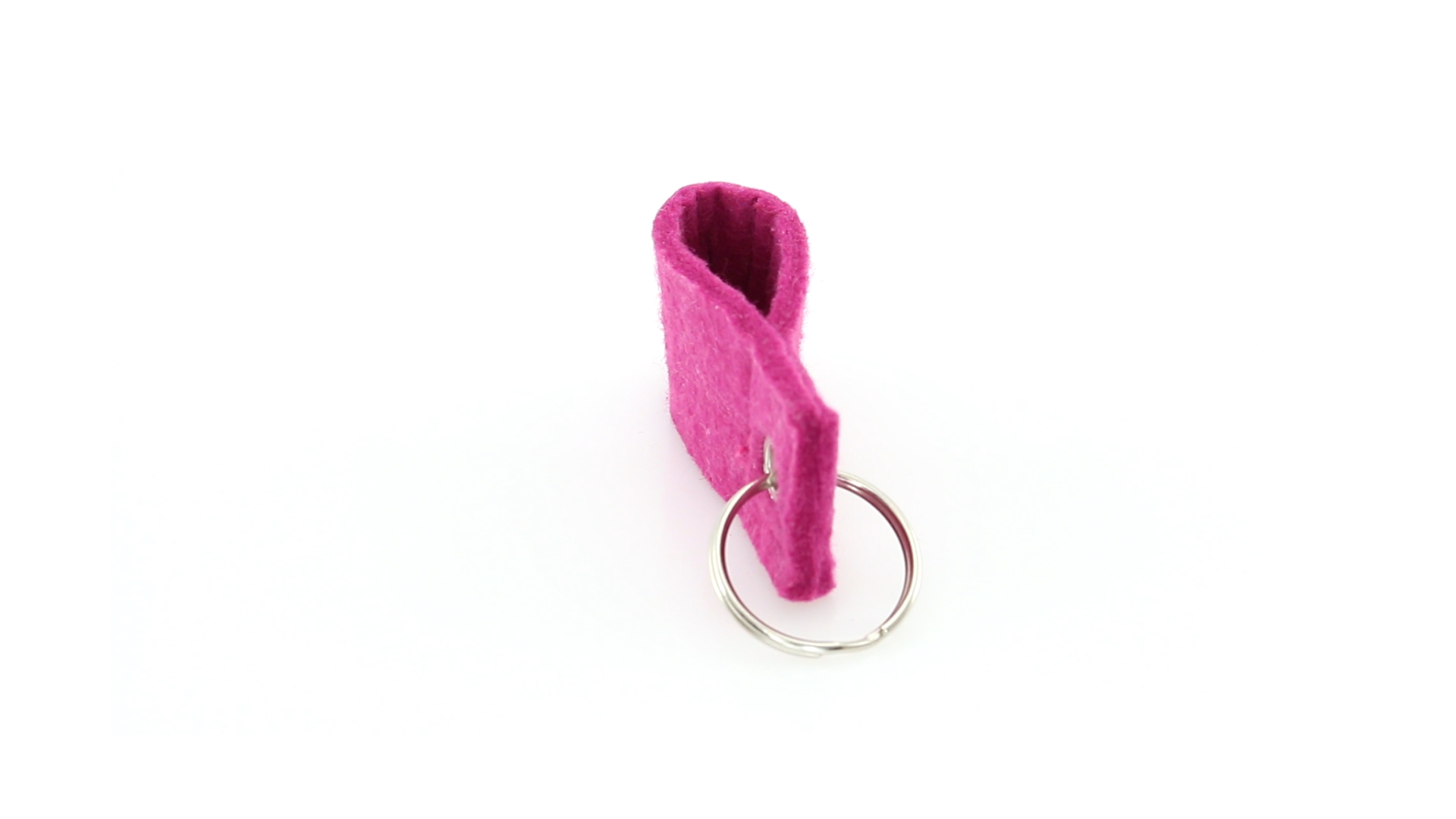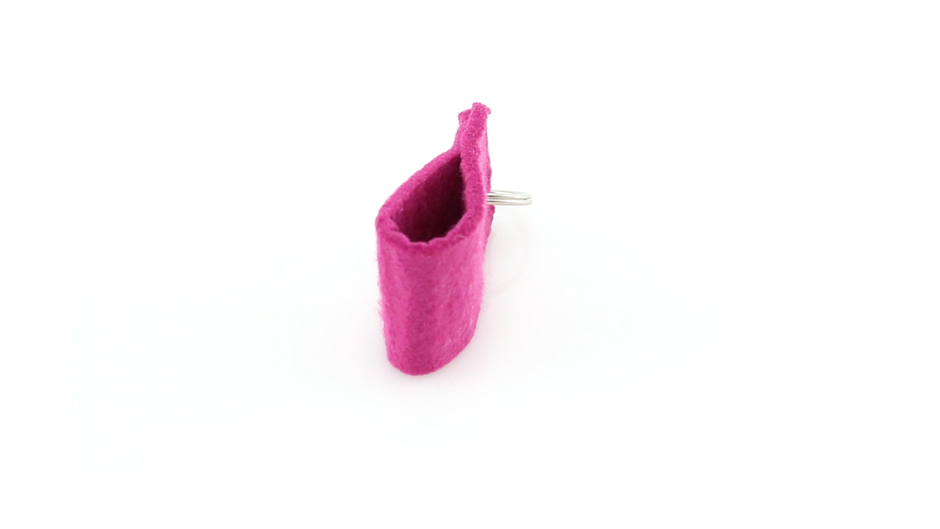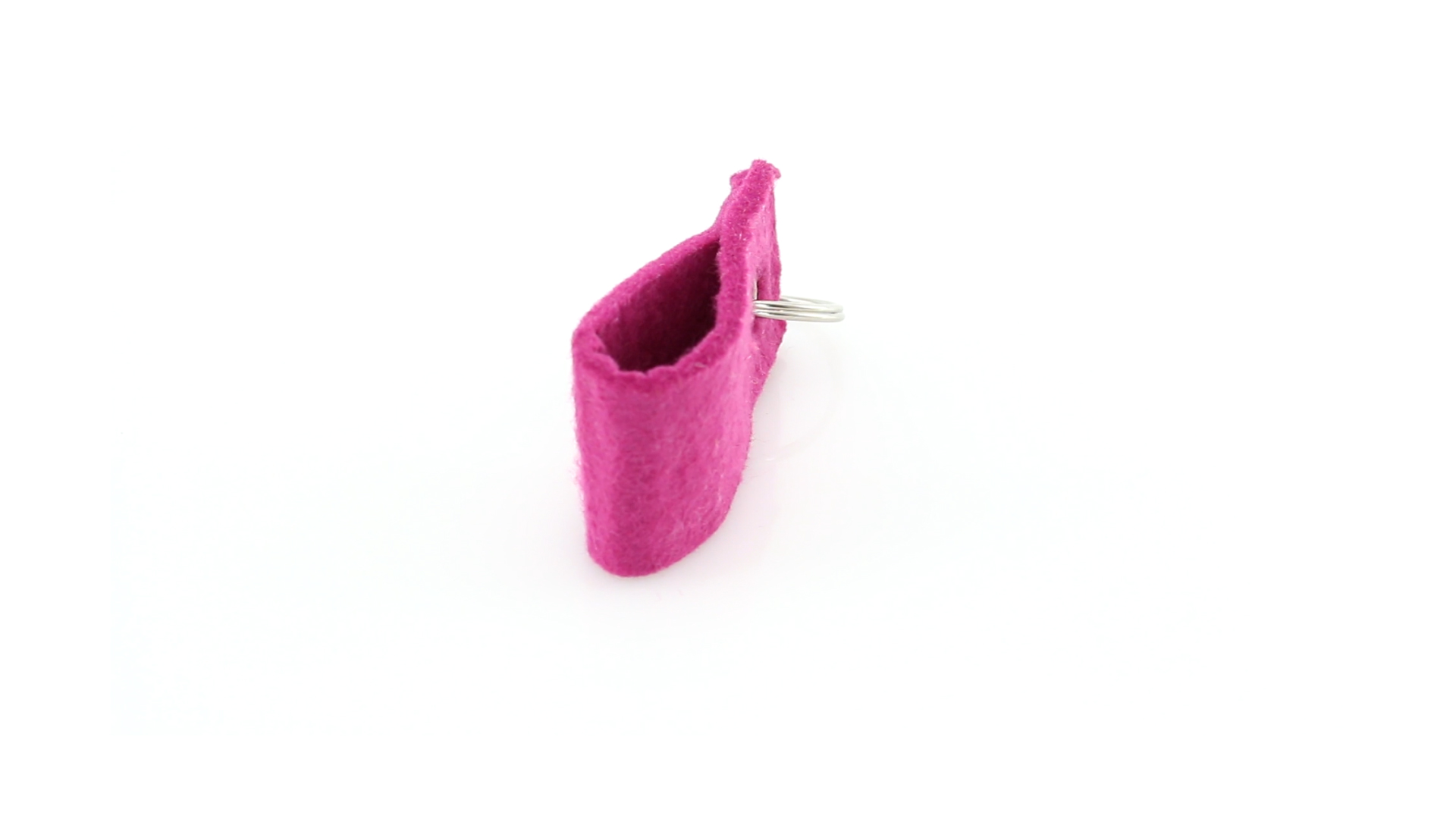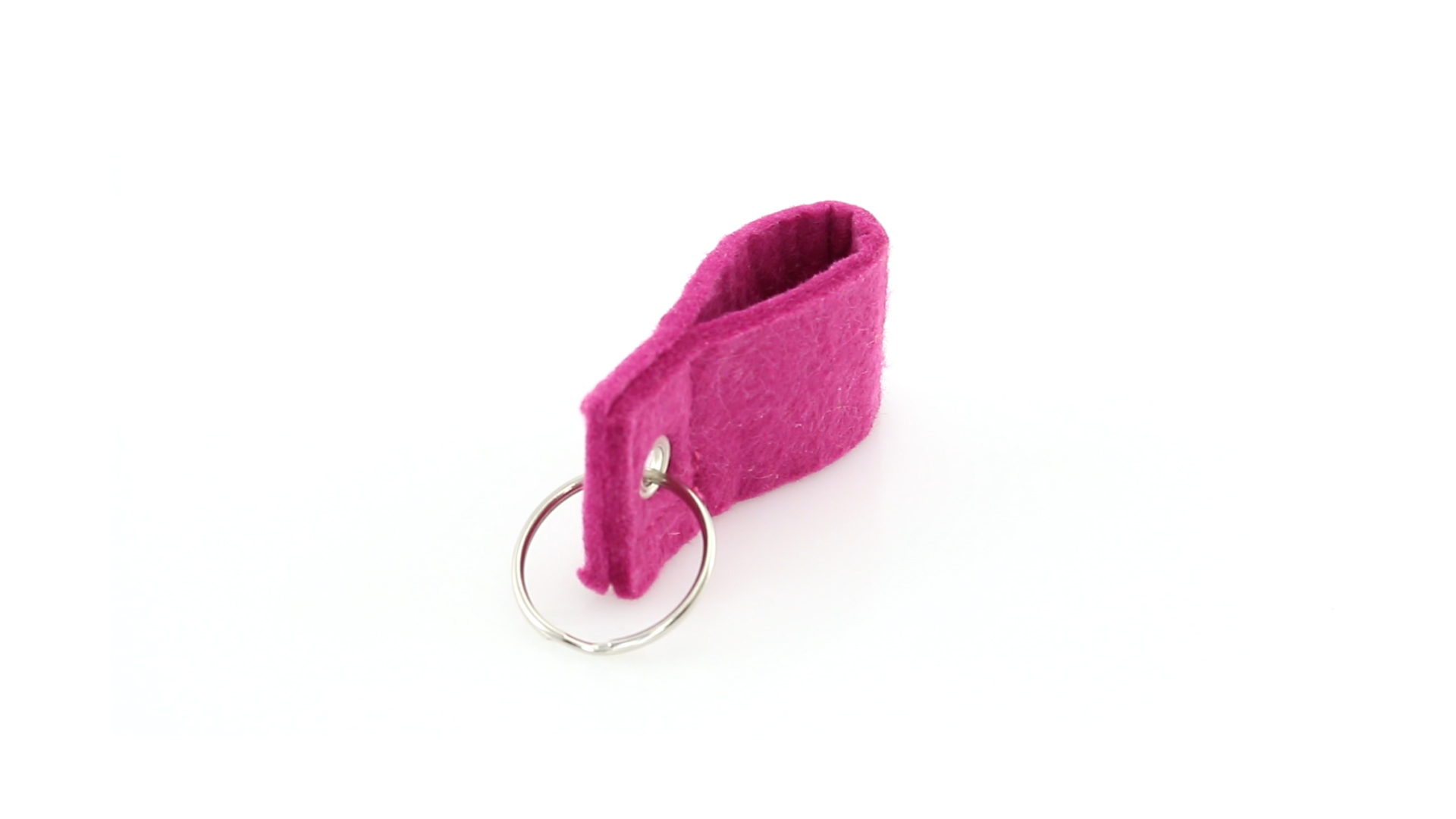Schlüsselanhänger aus weichem Filz in verschiedenen kräftigen Farben mit Metallöse zur Verstärkung.