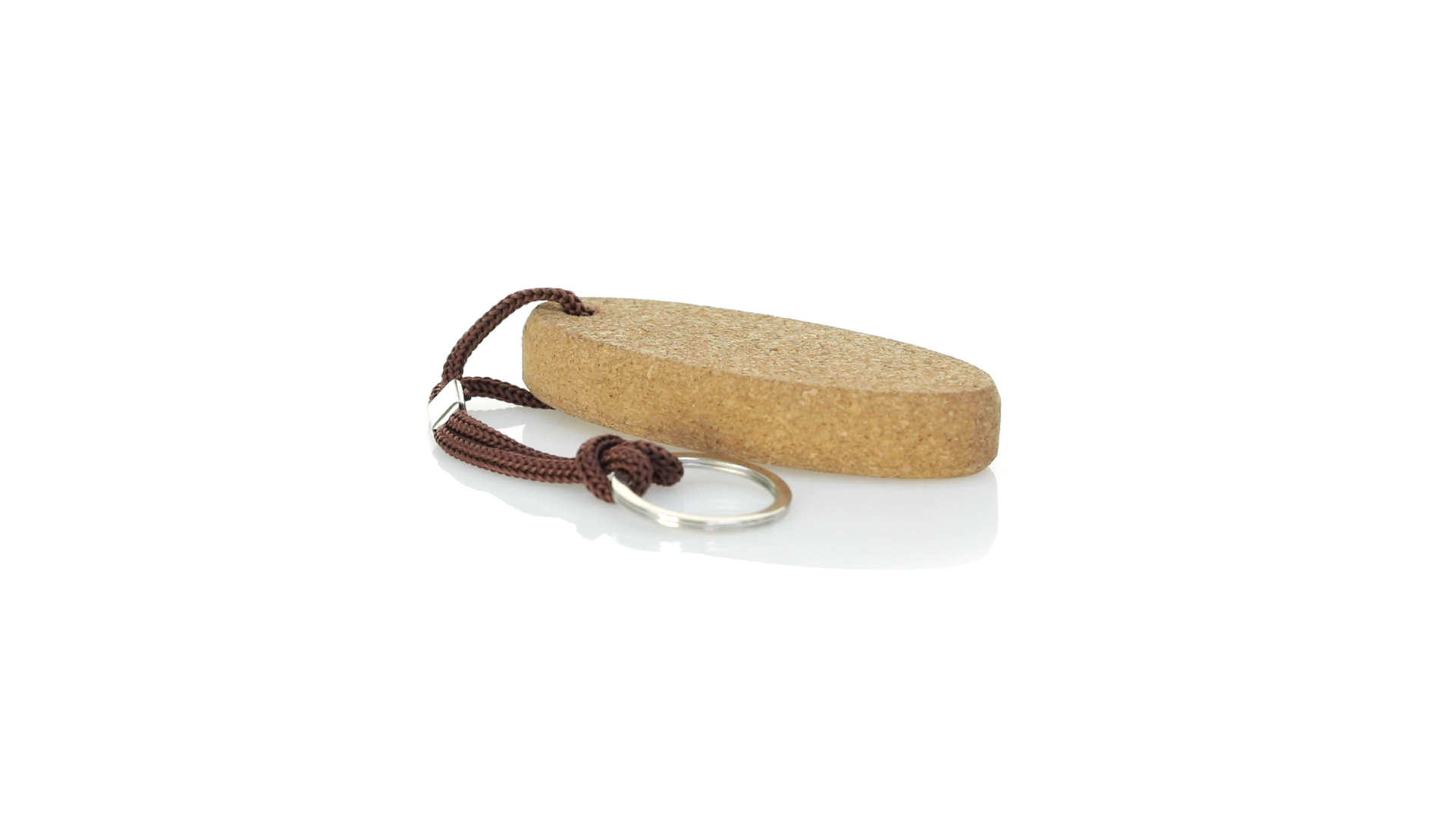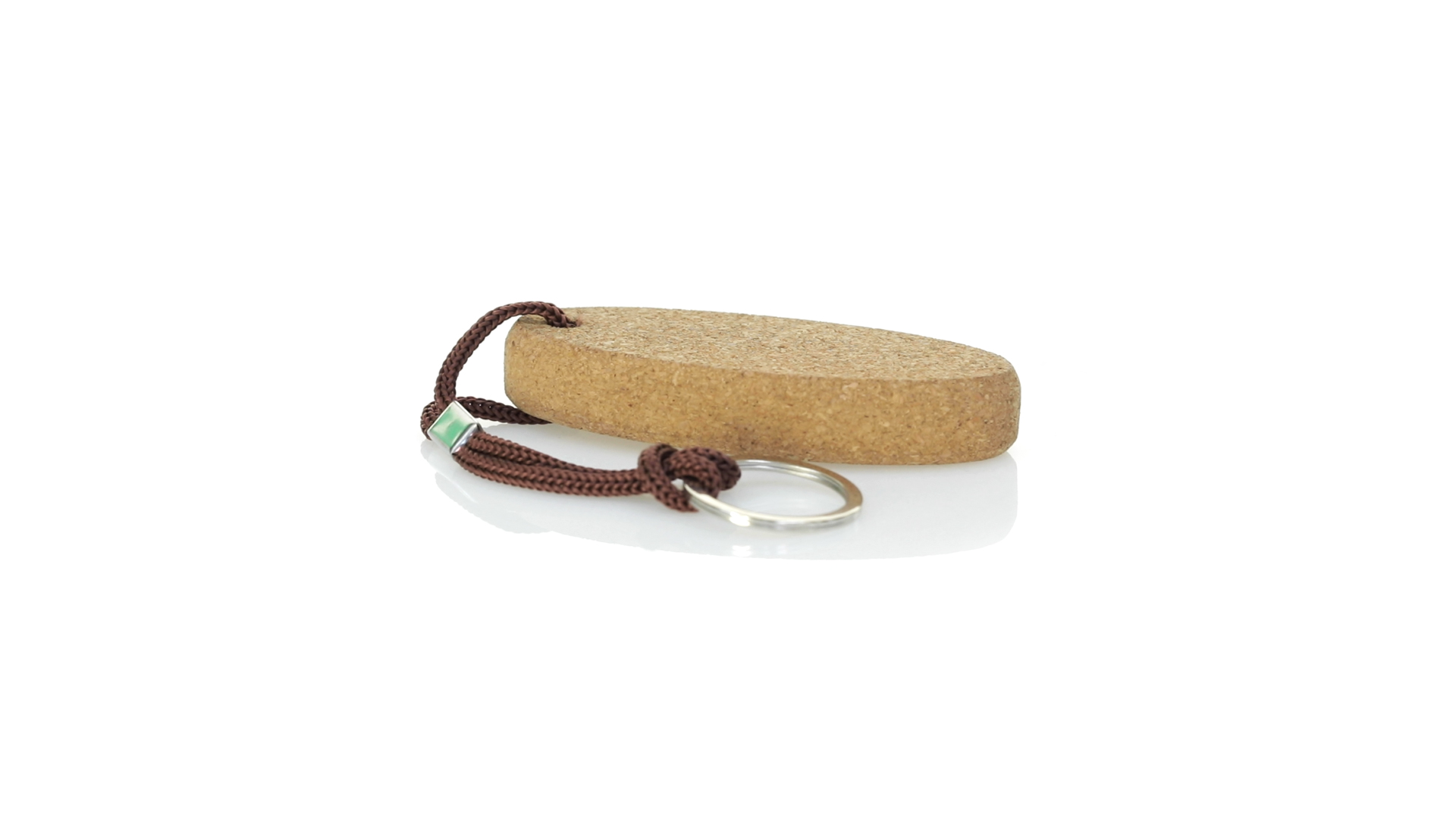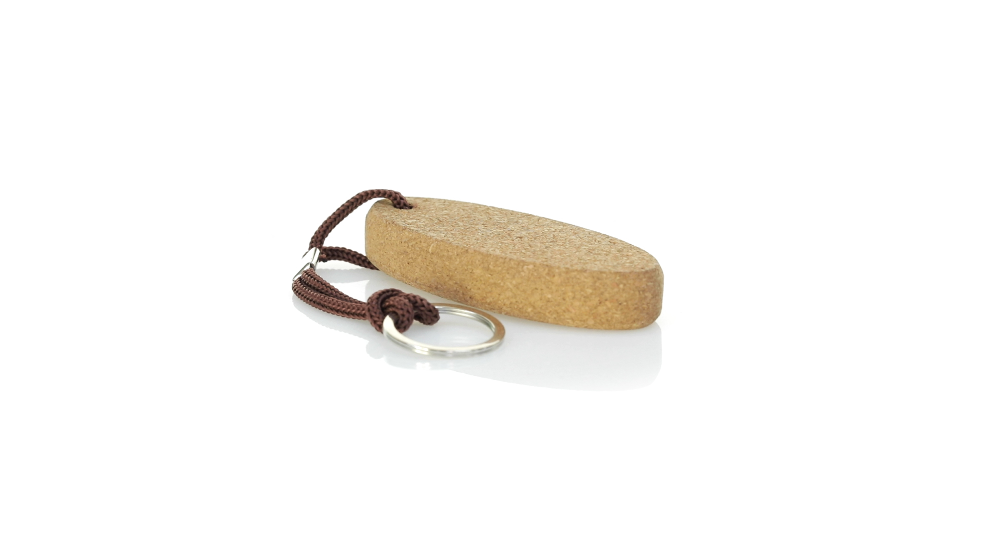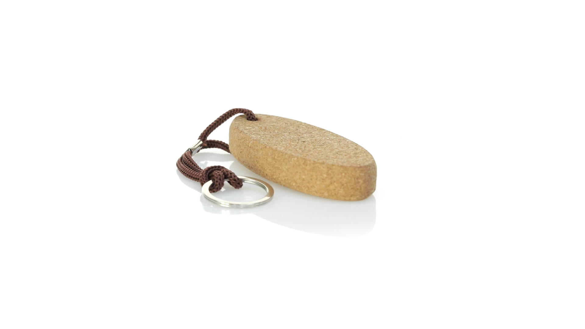 Schwimmender Schlüsselanhänger aus Naturkork, der die Verwendung natürlicher Materialien fördert und so zur Nachhaltigkeit des Planeten beiträgt. Mit Polyesterkordel und Metallring.