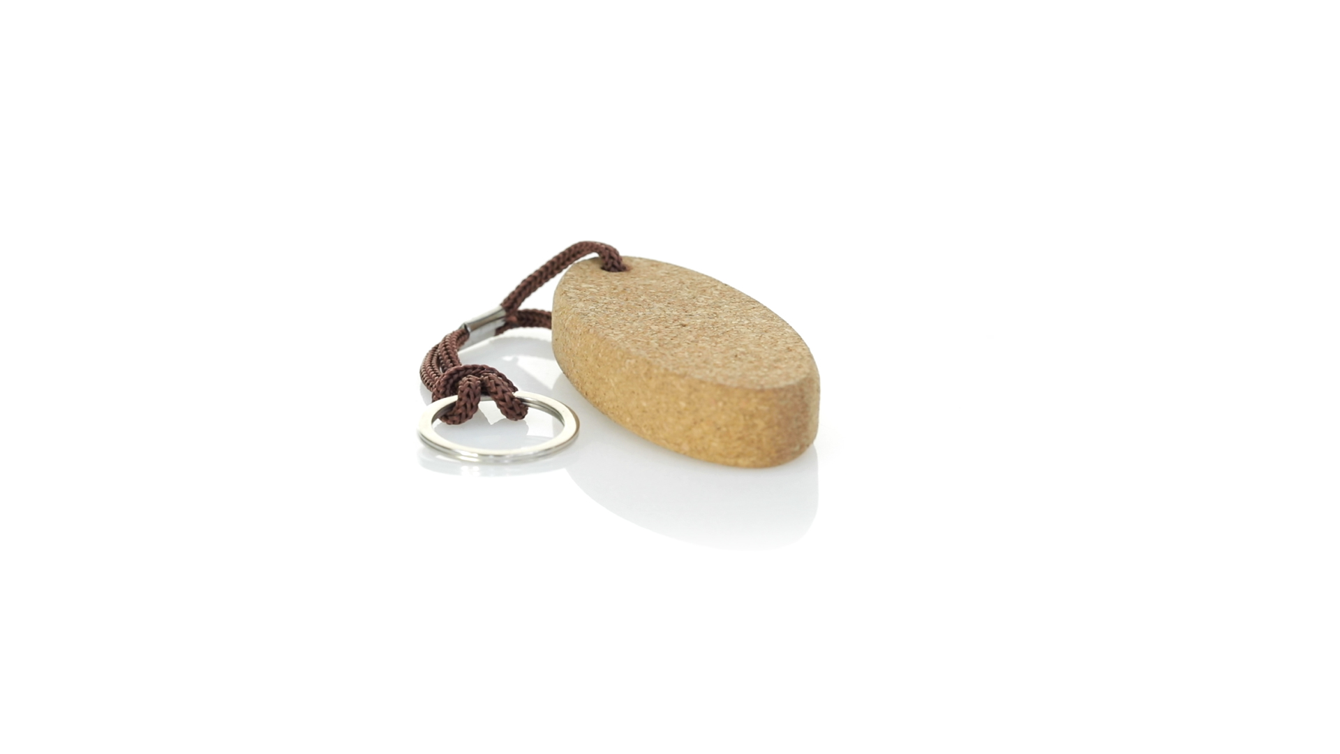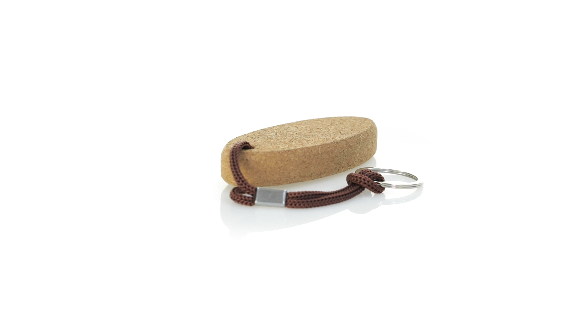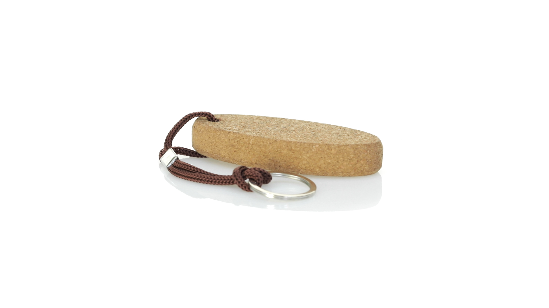 Schwimmender Schlüsselanhänger aus Naturkork, der die Verwendung natürlicher Materialien fördert und so zur Nachhaltigkeit des Planeten beiträgt. Mit Polyesterkordel und Metallring.