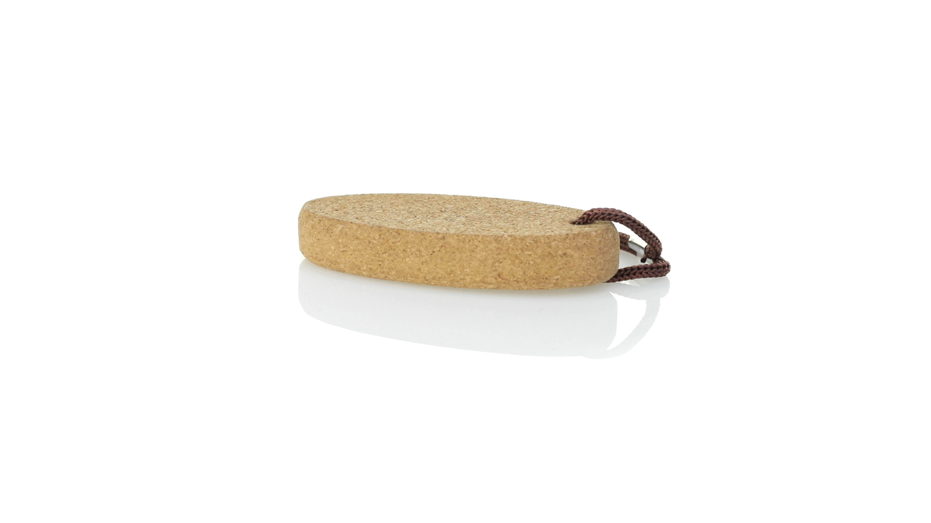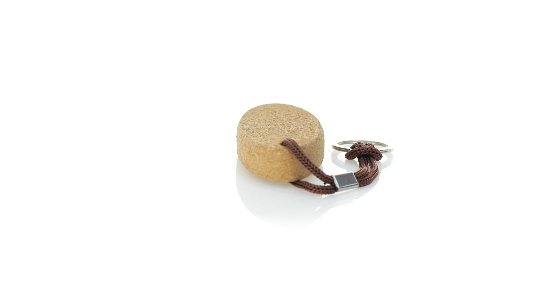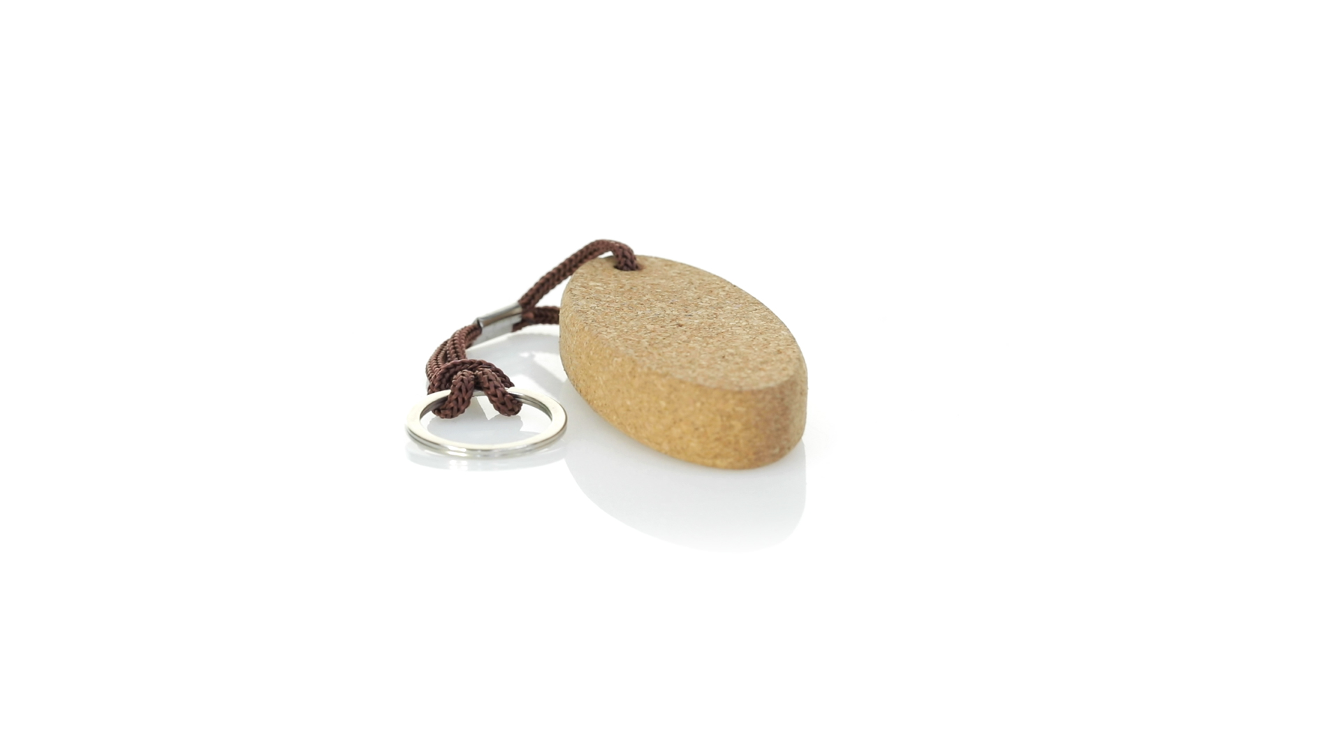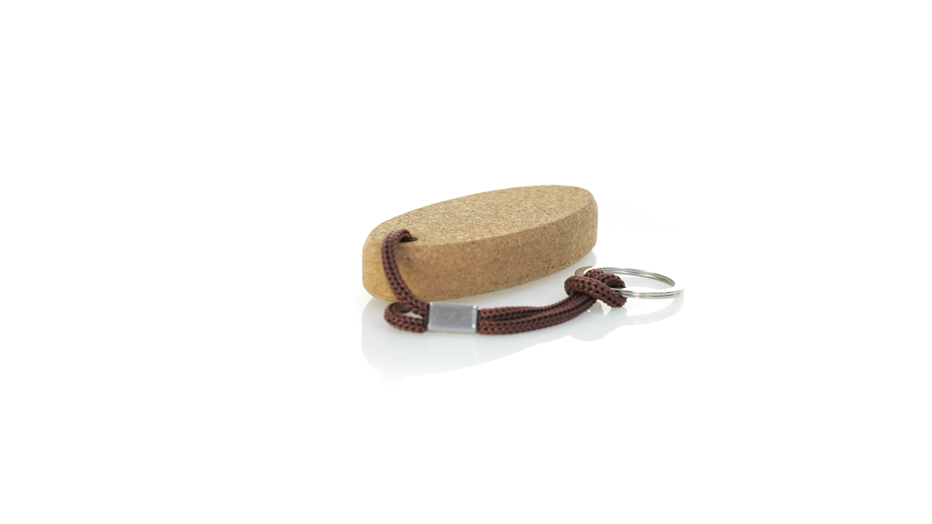 Schwimmender Schlüsselanhänger aus Naturkork, der die Verwendung natürlicher Materialien fördert und so zur Nachhaltigkeit des Planeten beiträgt. Mit Polyesterkordel und Metallring.