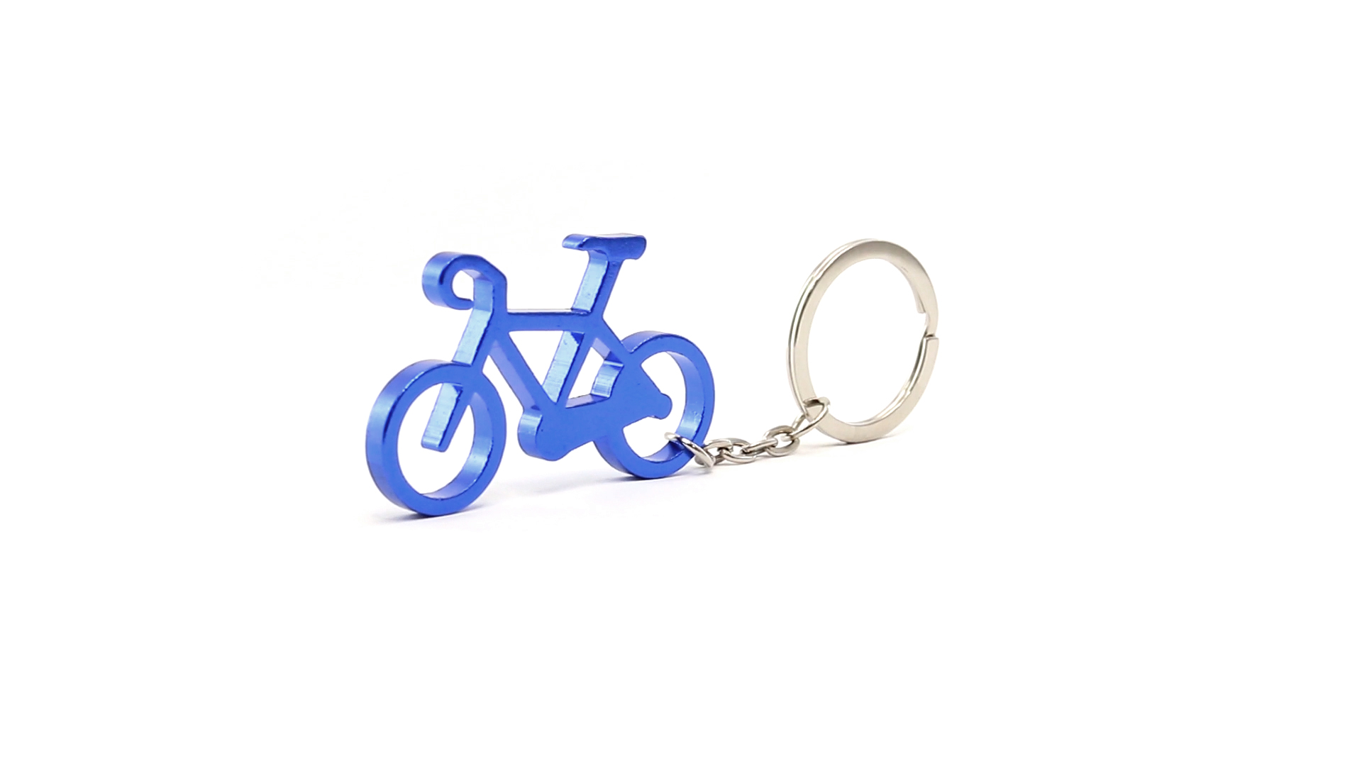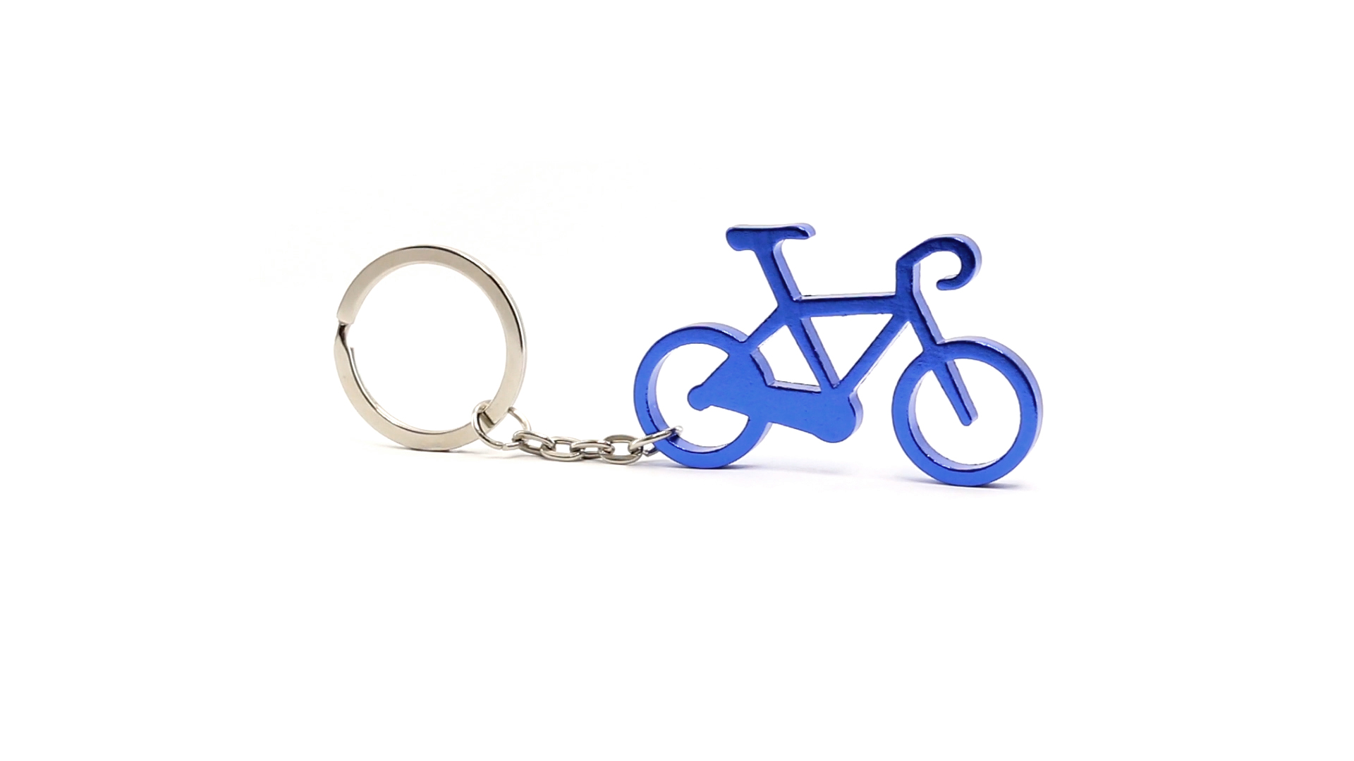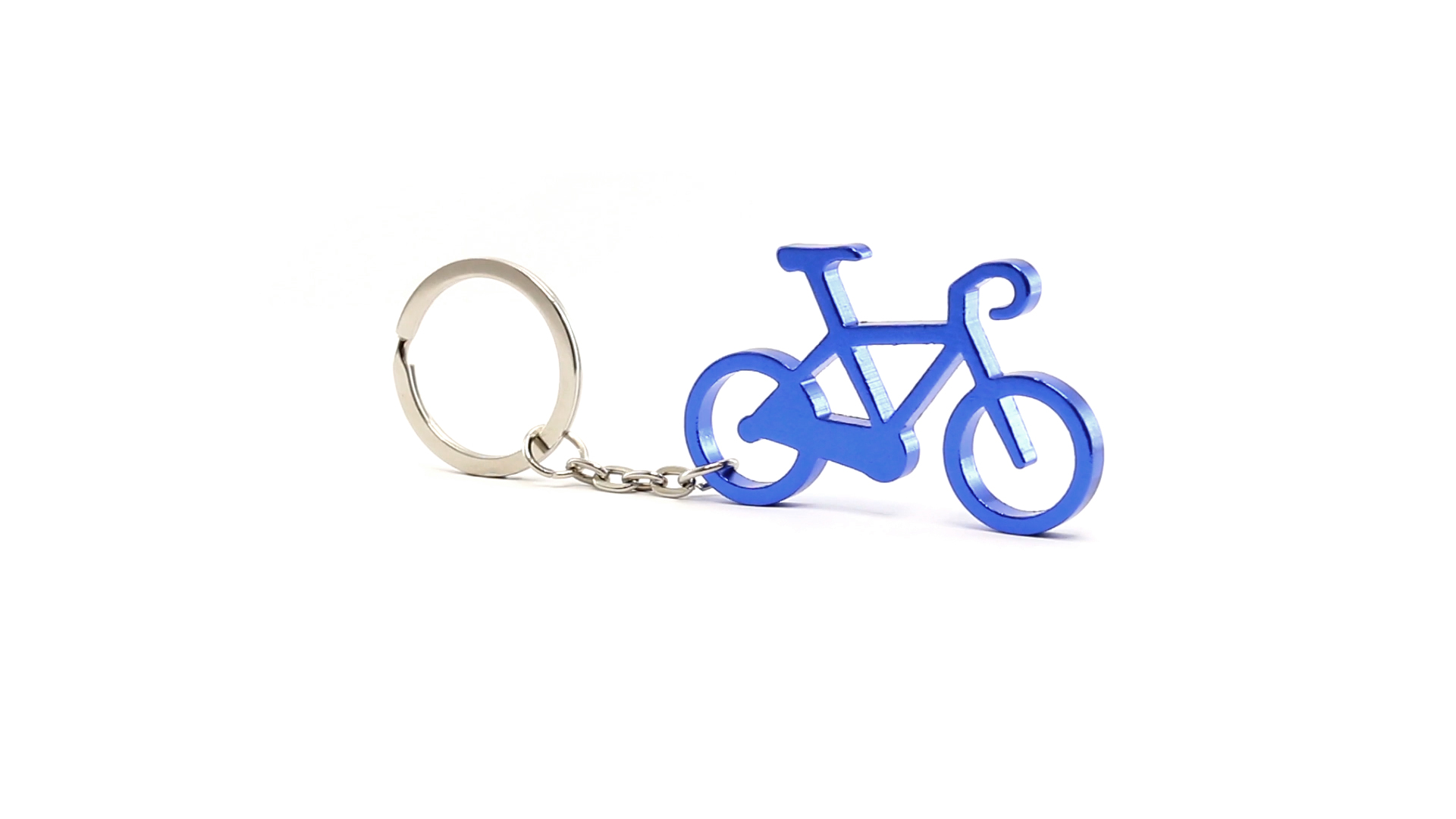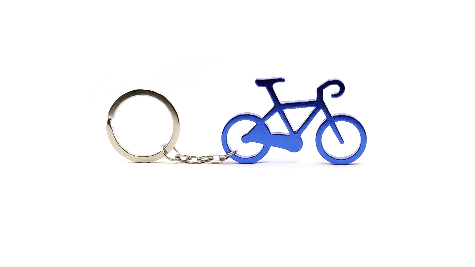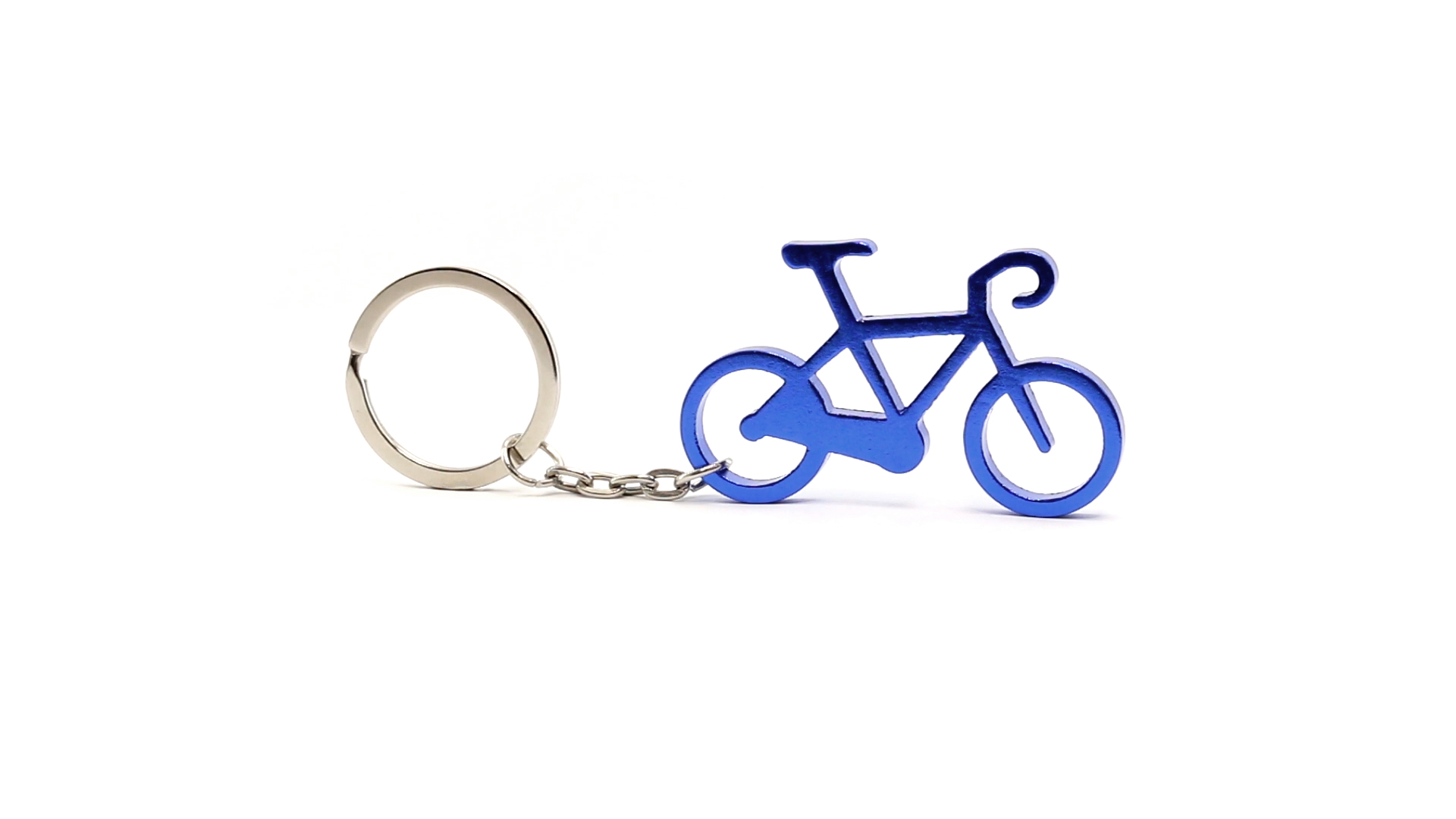 Schlüsselanhänger aus Aluminium mit Fahrrad-Form in verschiedenen lebendigen Farben. Speziell für den Laserdruck entwickelt.