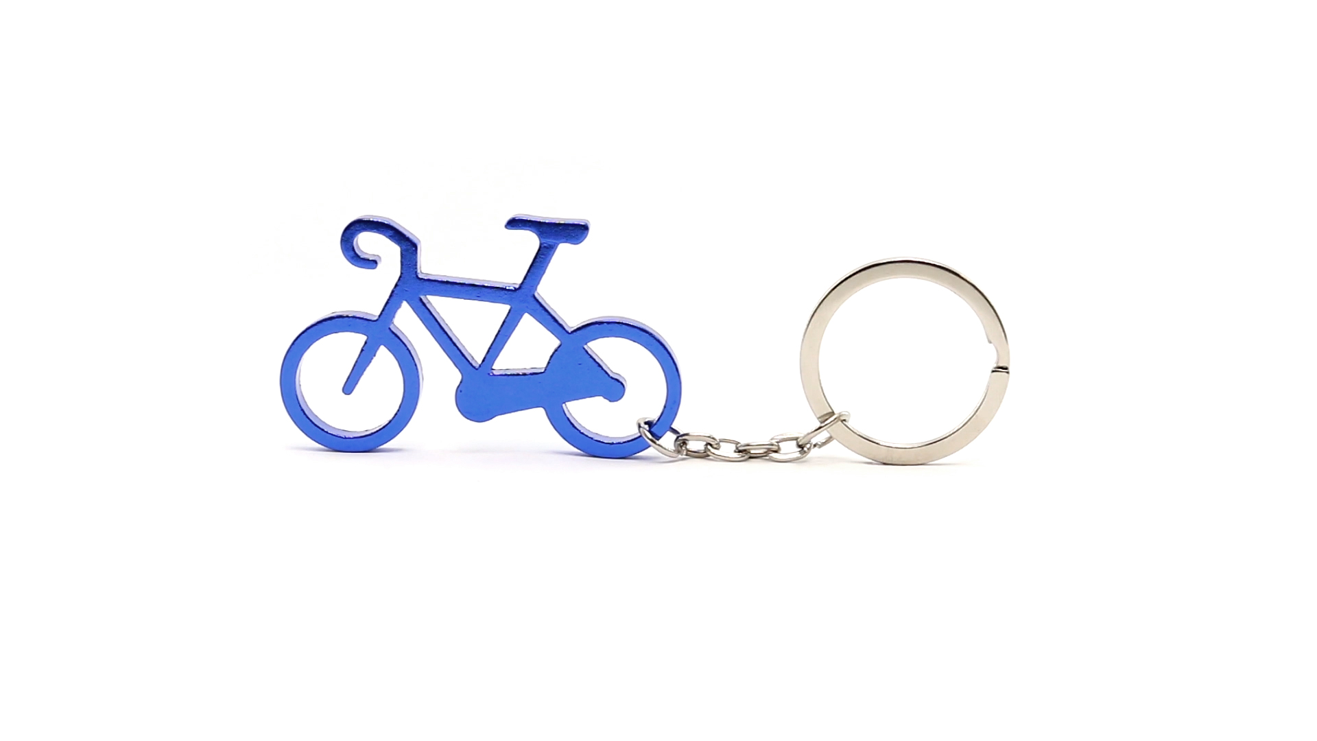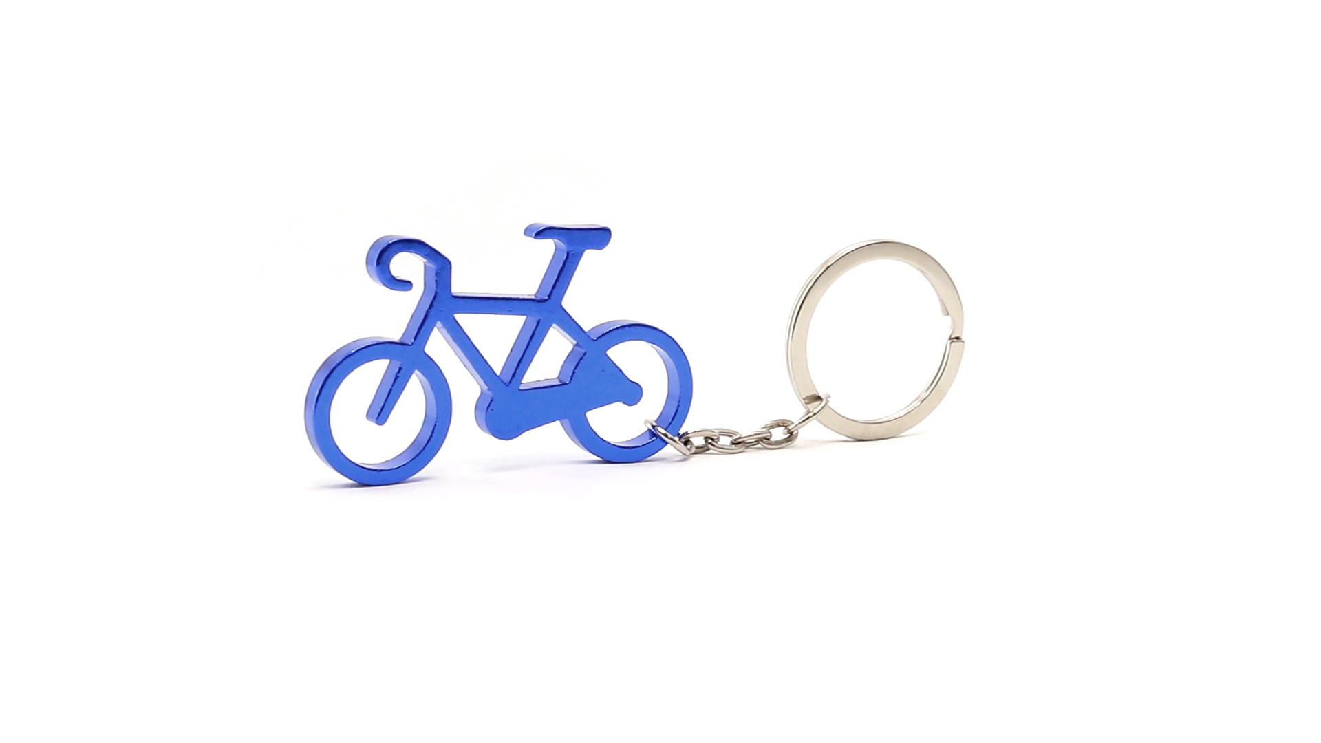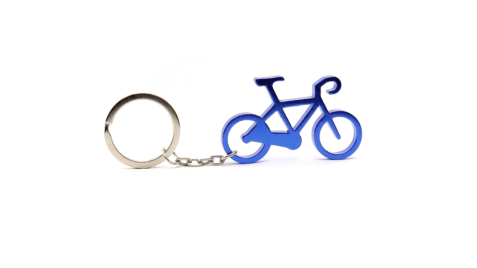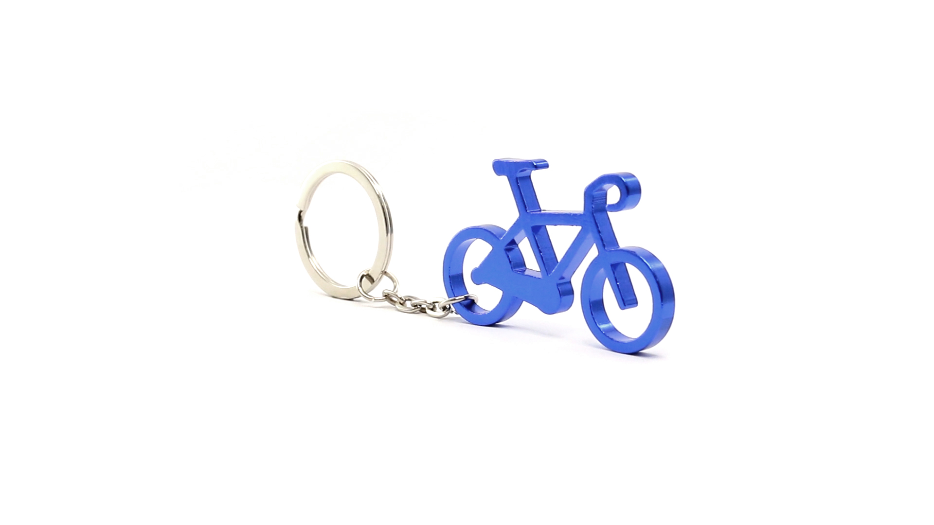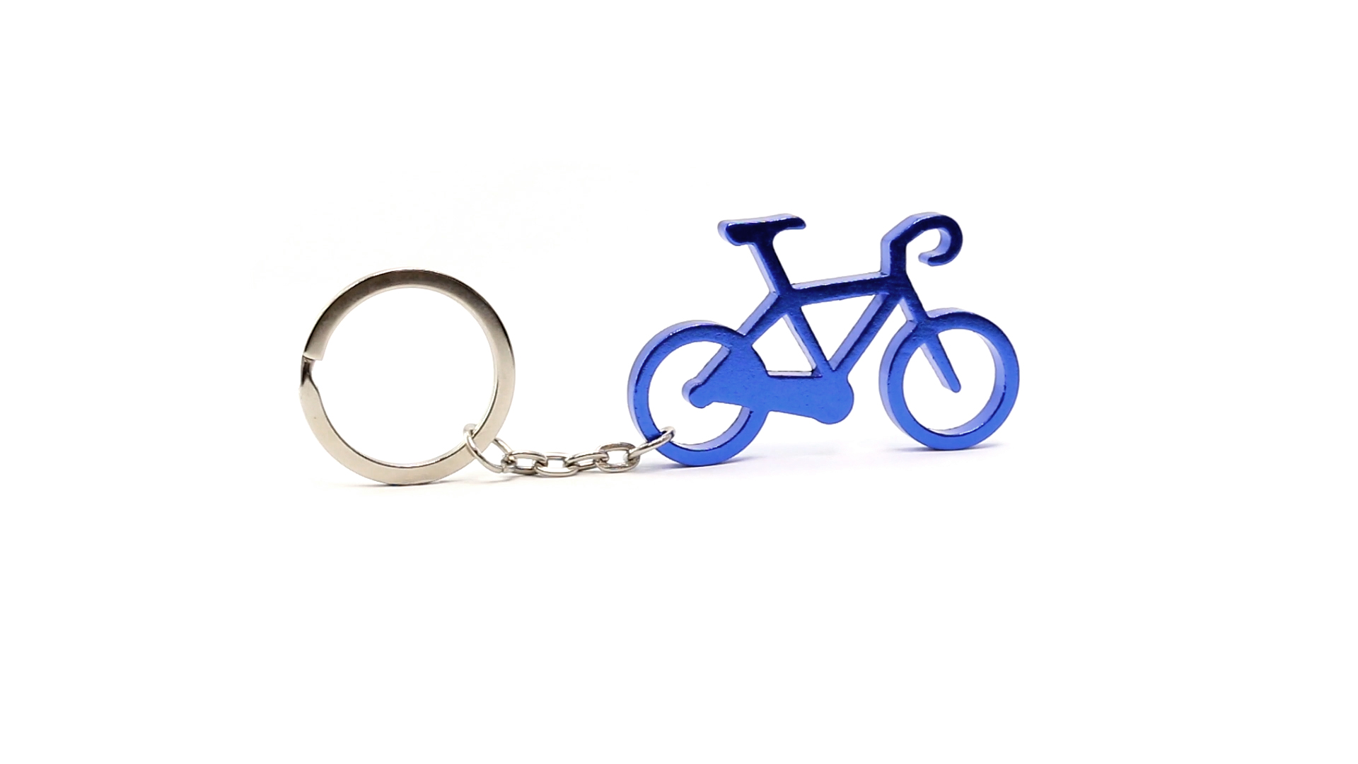 Schlüsselanhänger aus Aluminium mit Fahrrad-Form in verschiedenen lebendigen Farben. Speziell für den Laserdruck entwickelt.