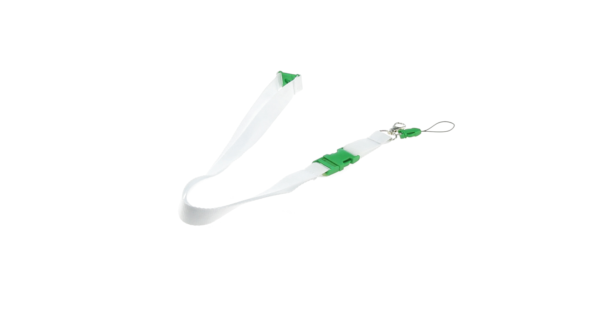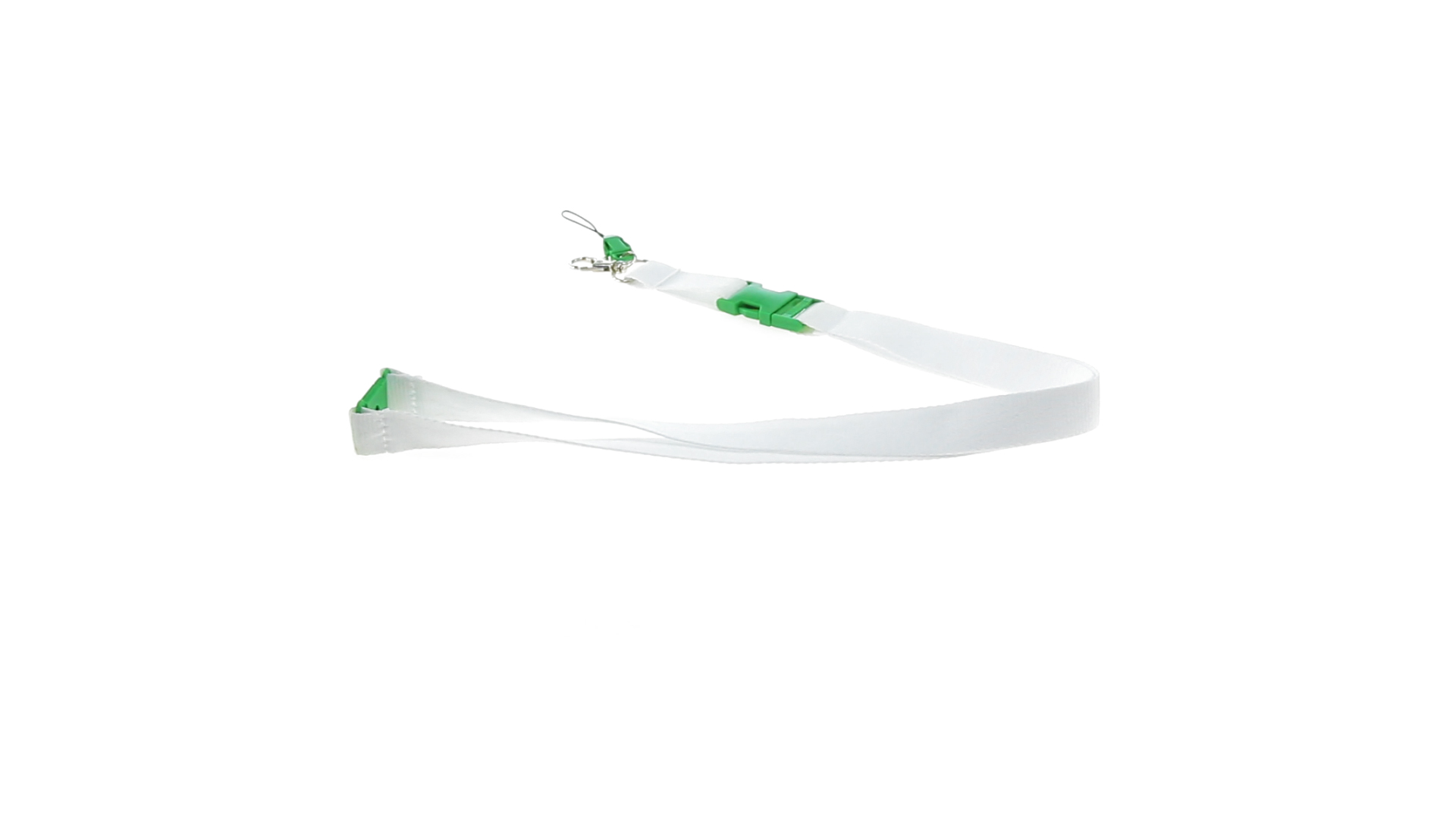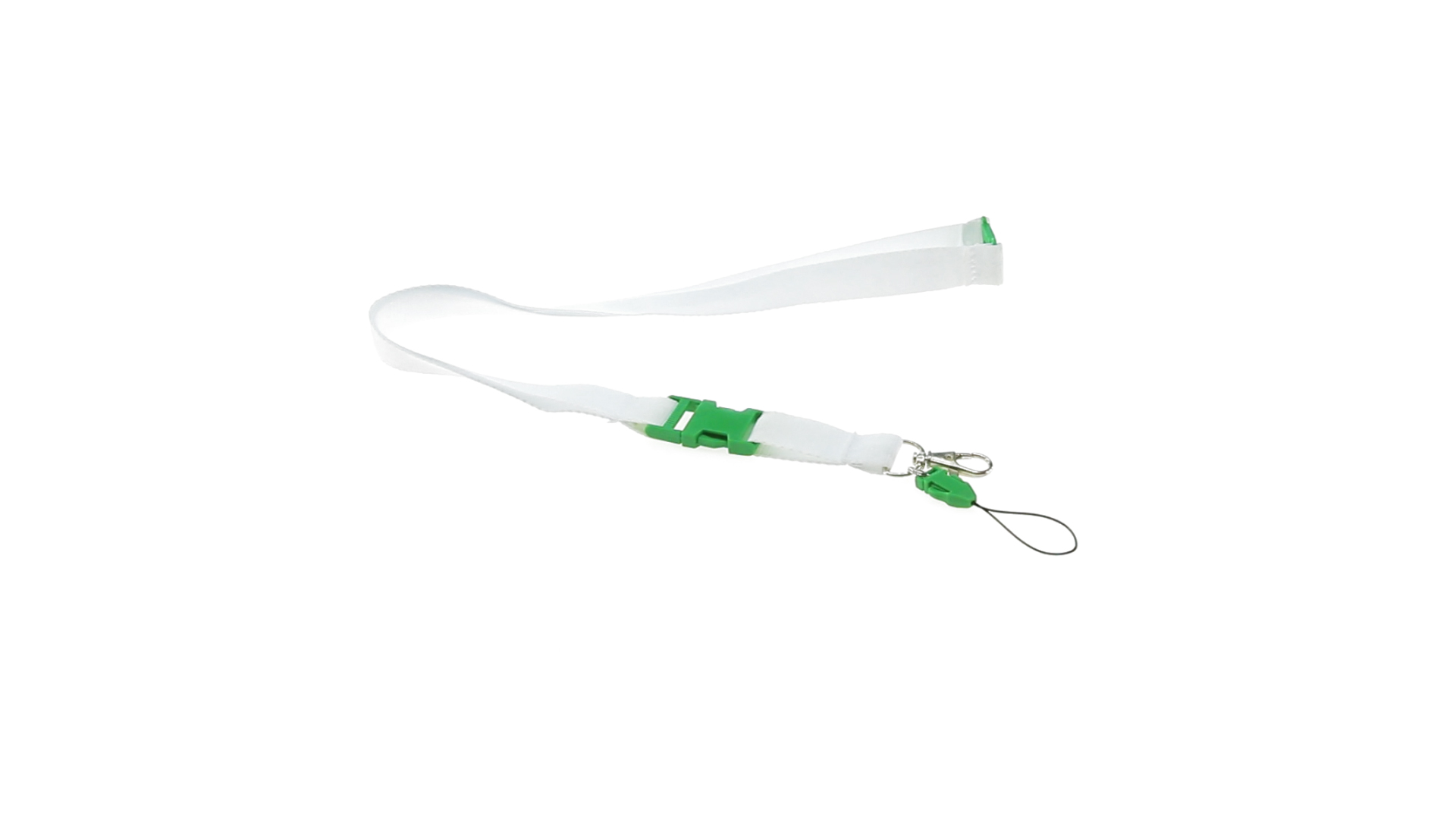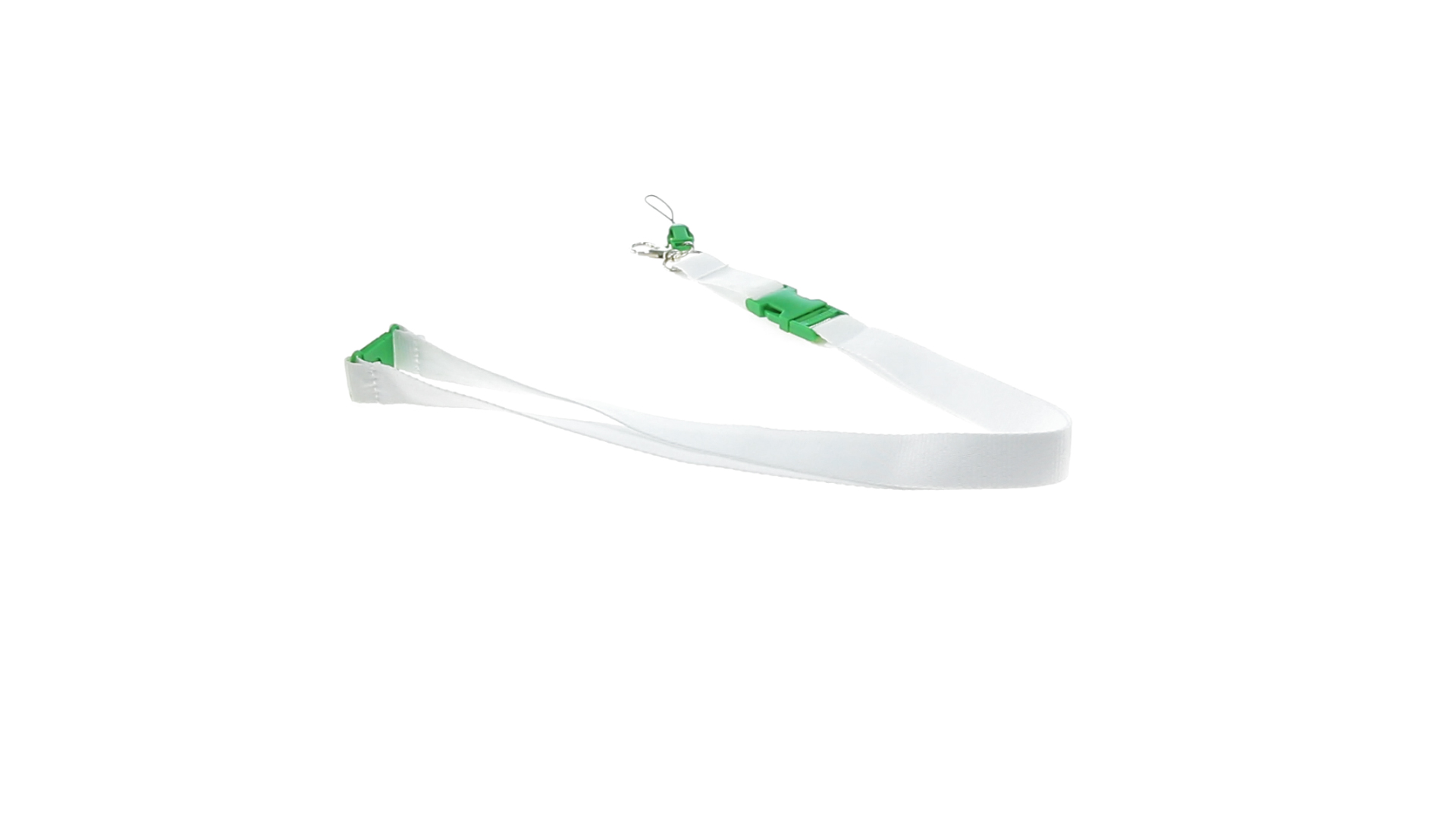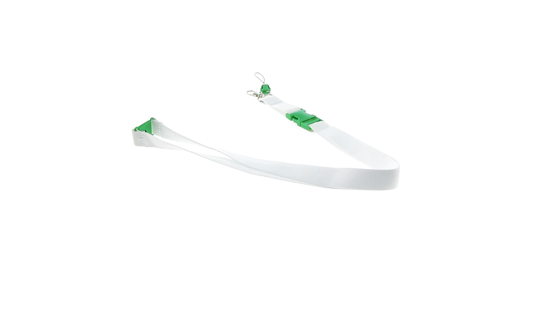 Lanyard aus resistentem, weichem Polyester in Weiss. Mit farblich passendem Klickverschluss in verschiedenen Farben sowie Metall-Karabiner und Schlaufe mit farblich passendem Klickverschluss. Speziell für den Sublimationsdruck entwickelt.