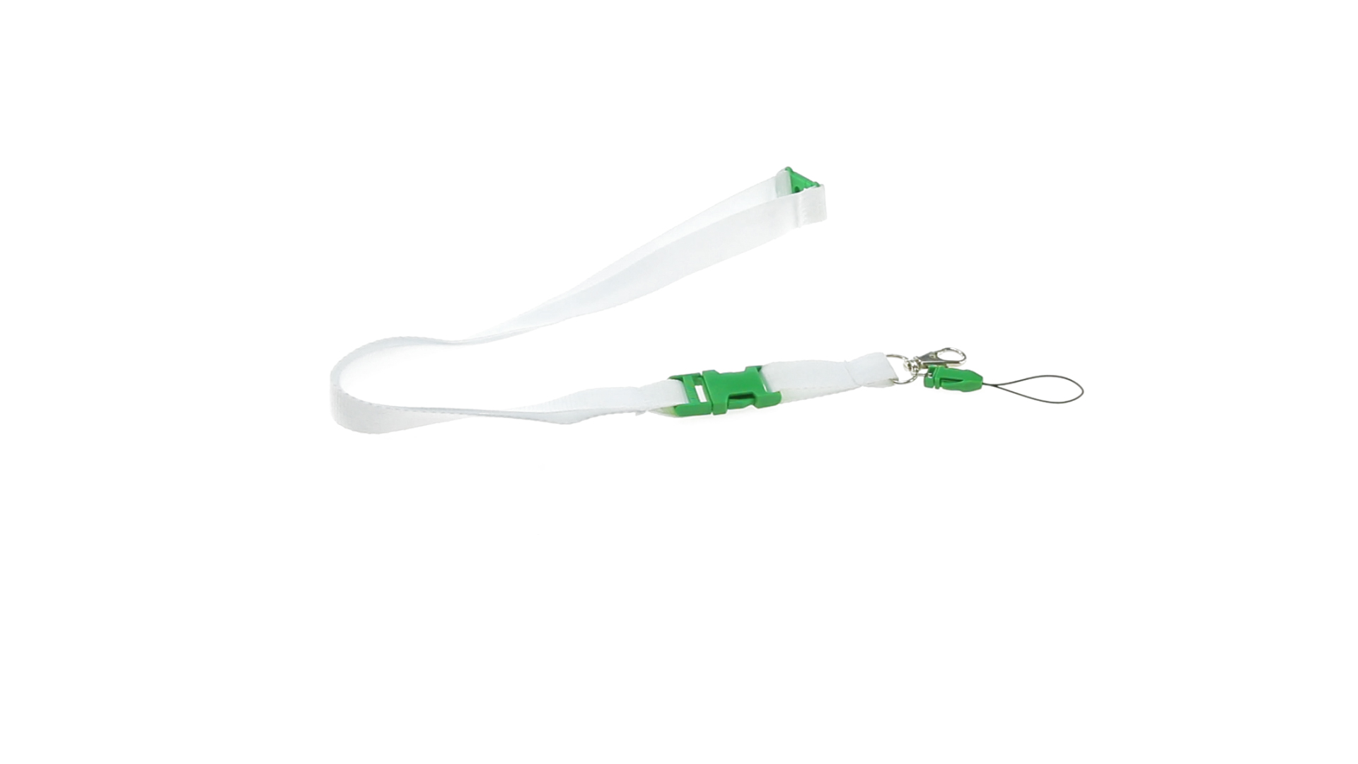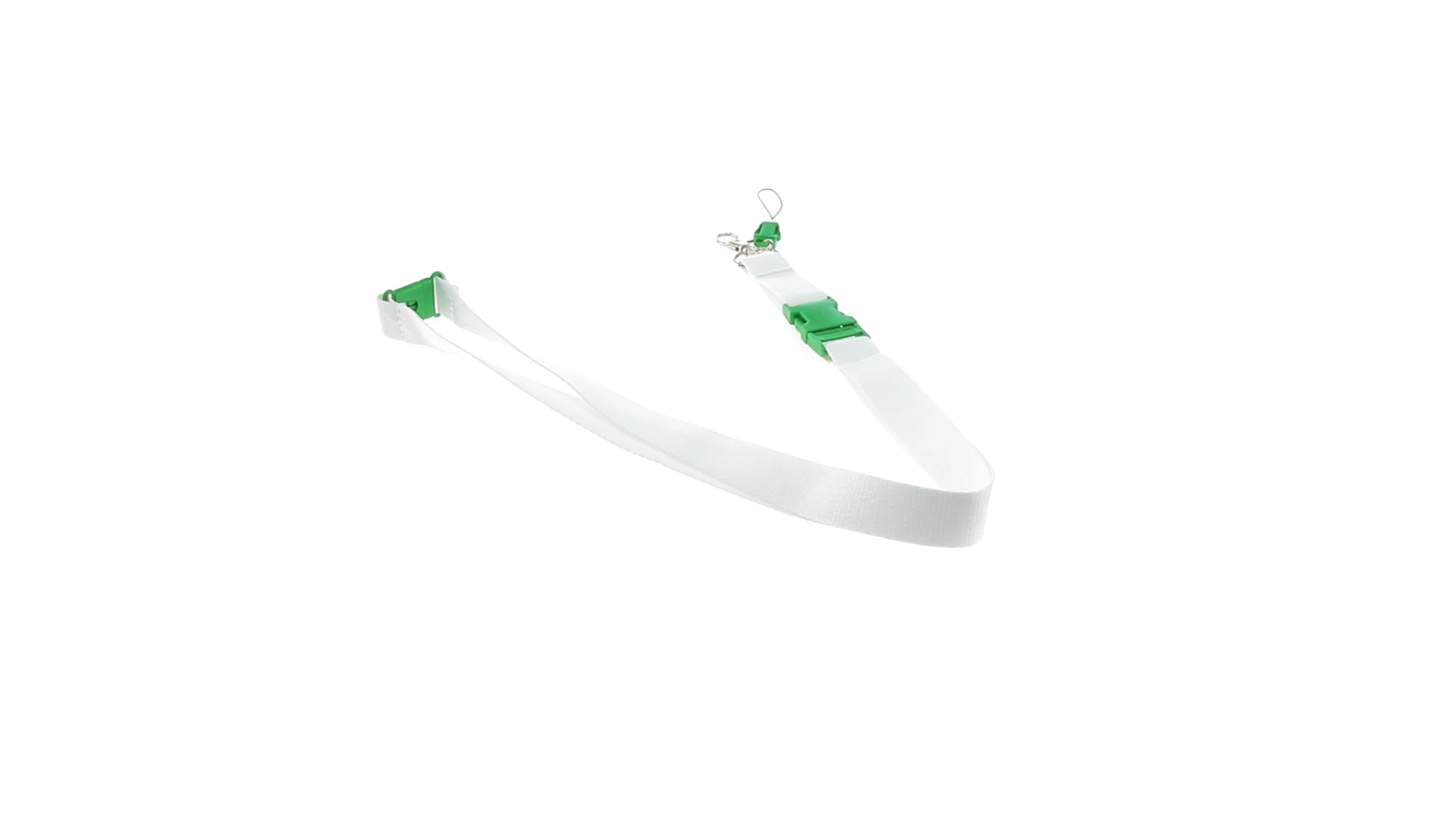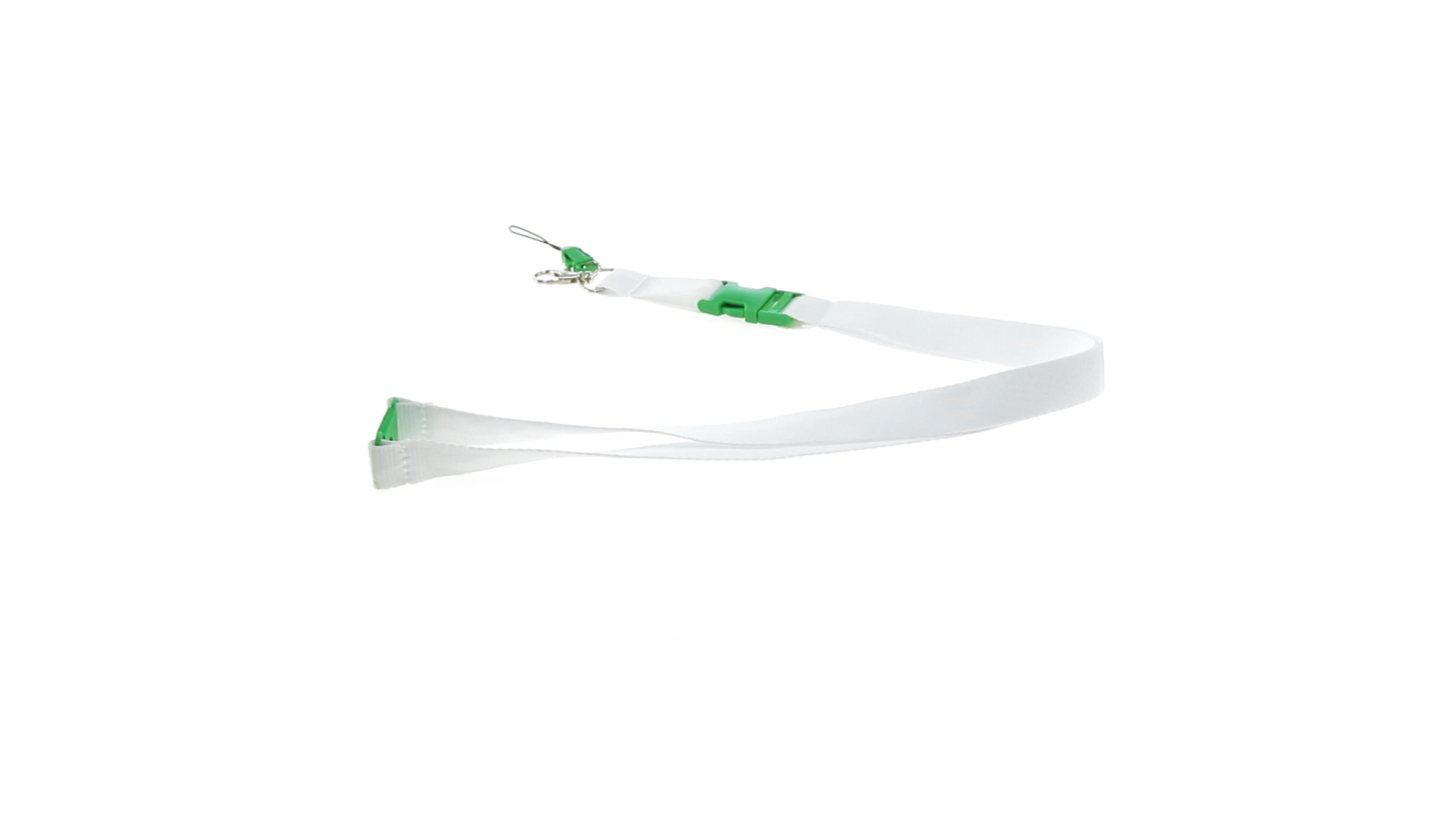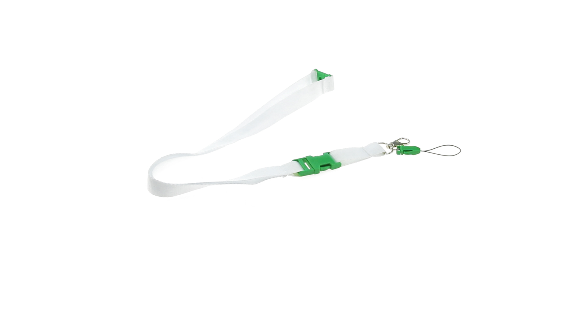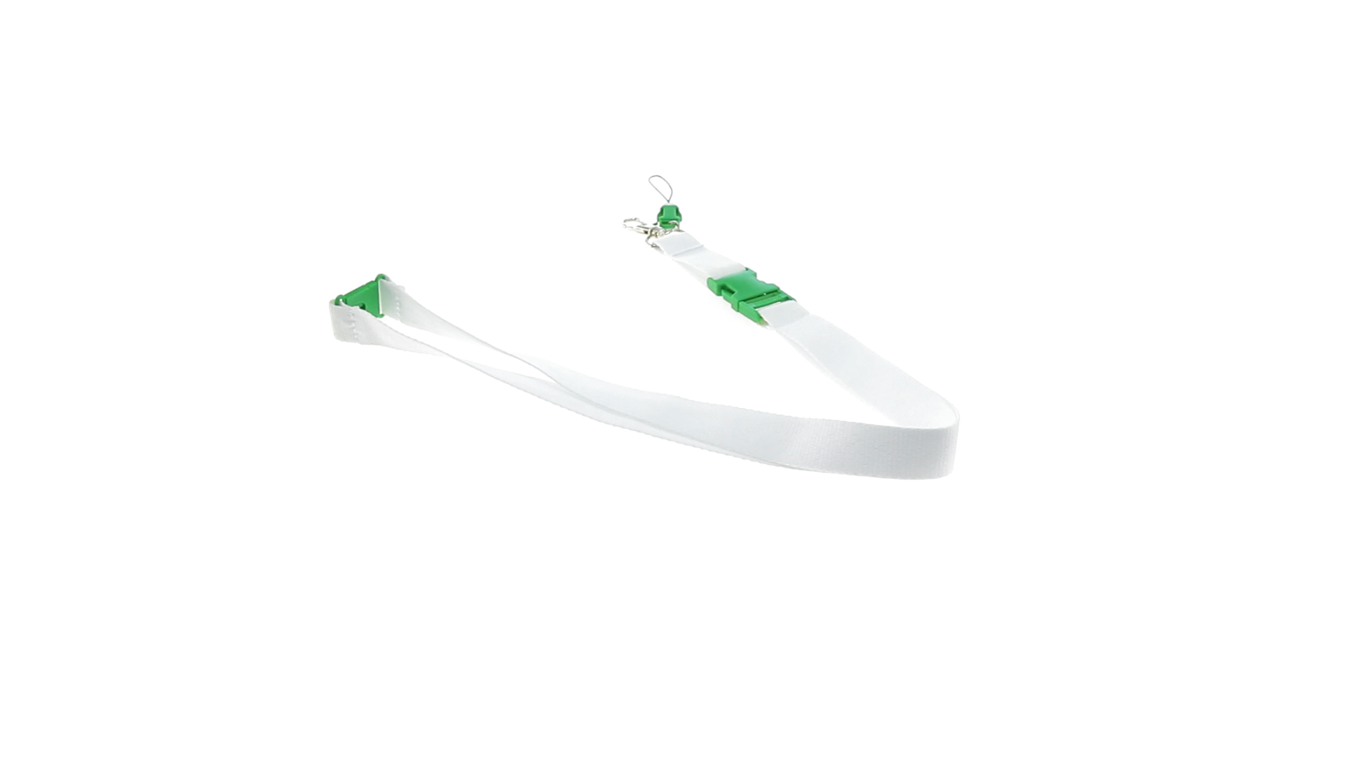 Lanyard aus resistentem, weichem Polyester in Weiss. Mit farblich passendem Klickverschluss in verschiedenen Farben sowie Metall-Karabiner und Schlaufe mit farblich passendem Klickverschluss. Speziell für den Sublimationsdruck entwickelt.