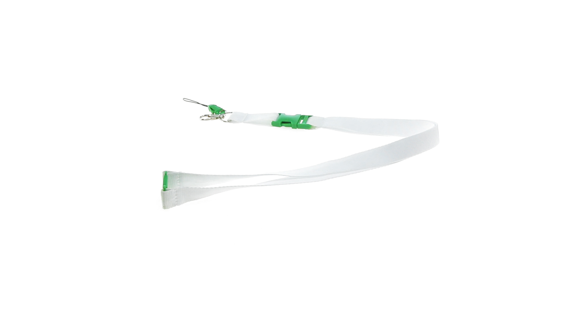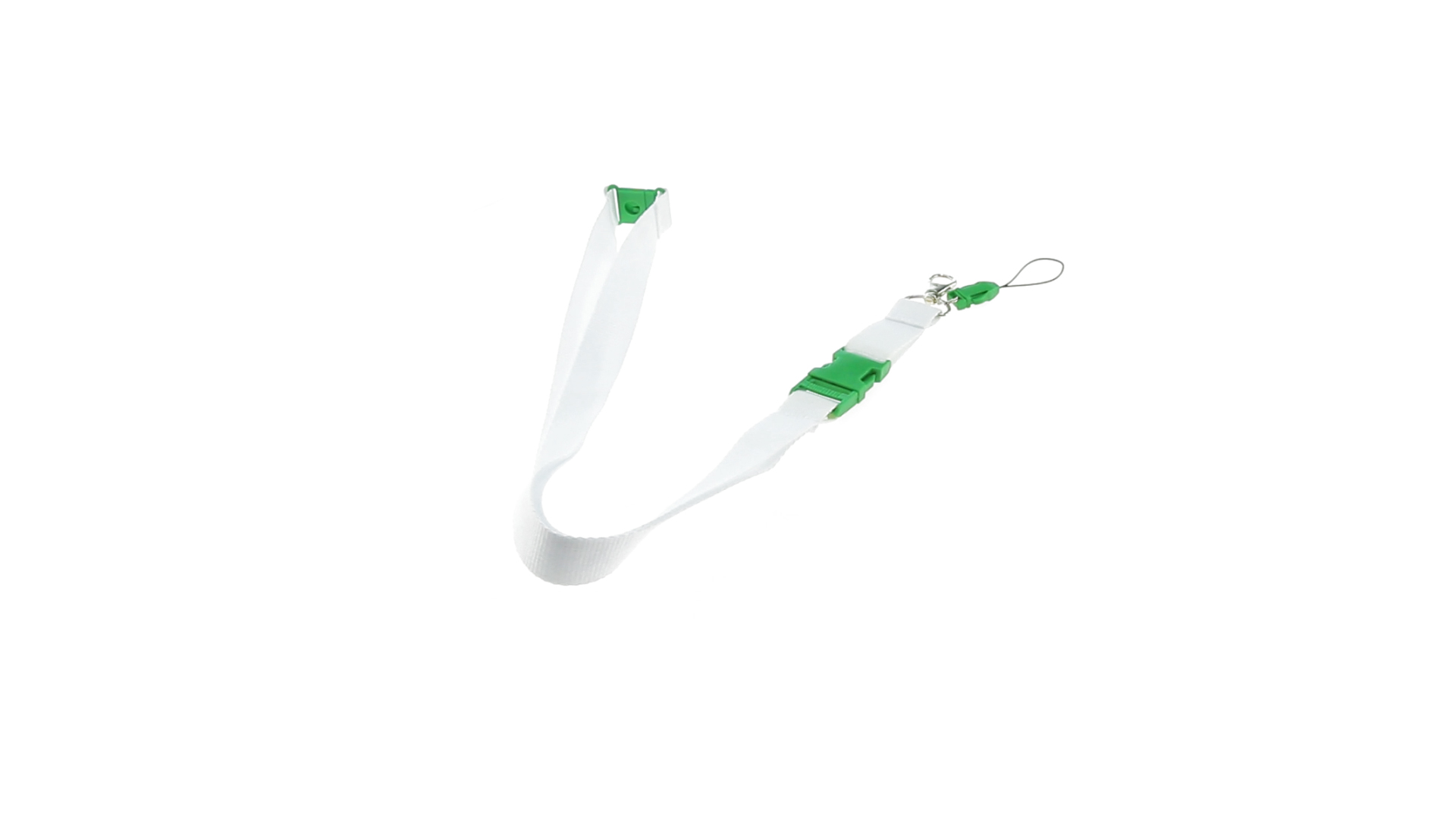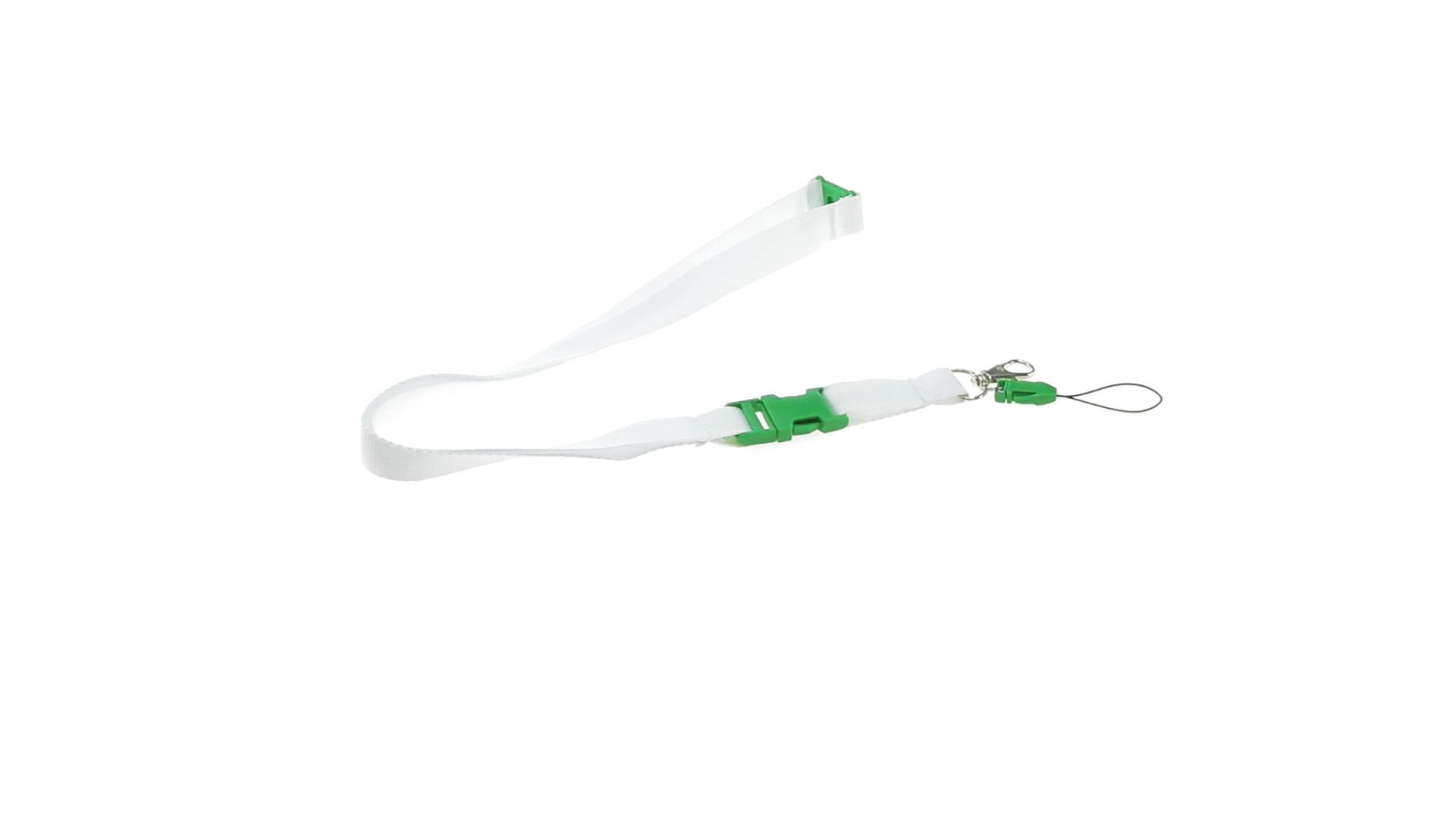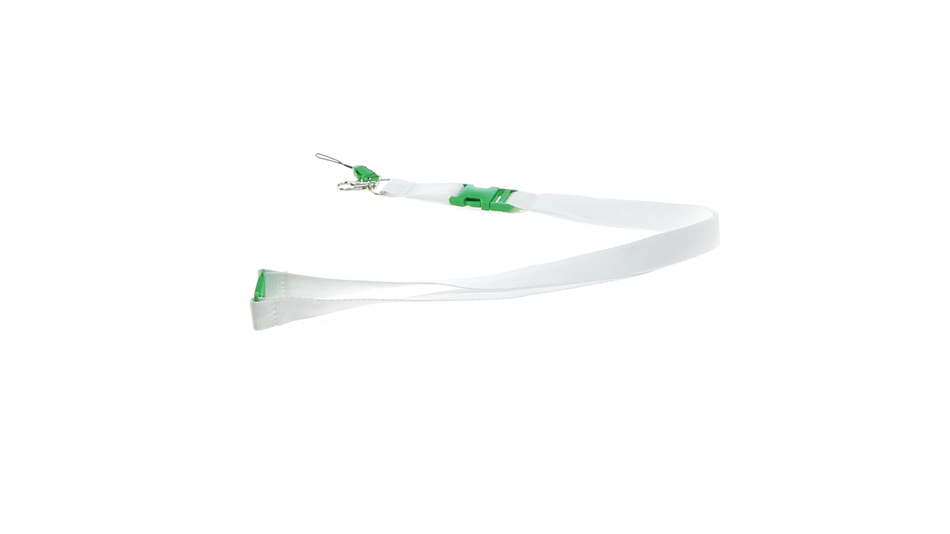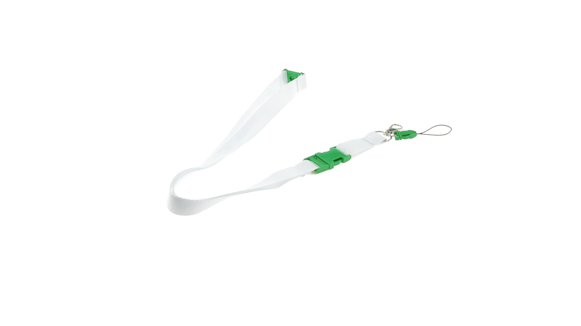 Lanyard aus resistentem, weichem Polyester in Weiss. Mit farblich passendem Klickverschluss in verschiedenen Farben sowie Metall-Karabiner und Schlaufe mit farblich passendem Klickverschluss. Speziell für den Sublimationsdruck entwickelt.