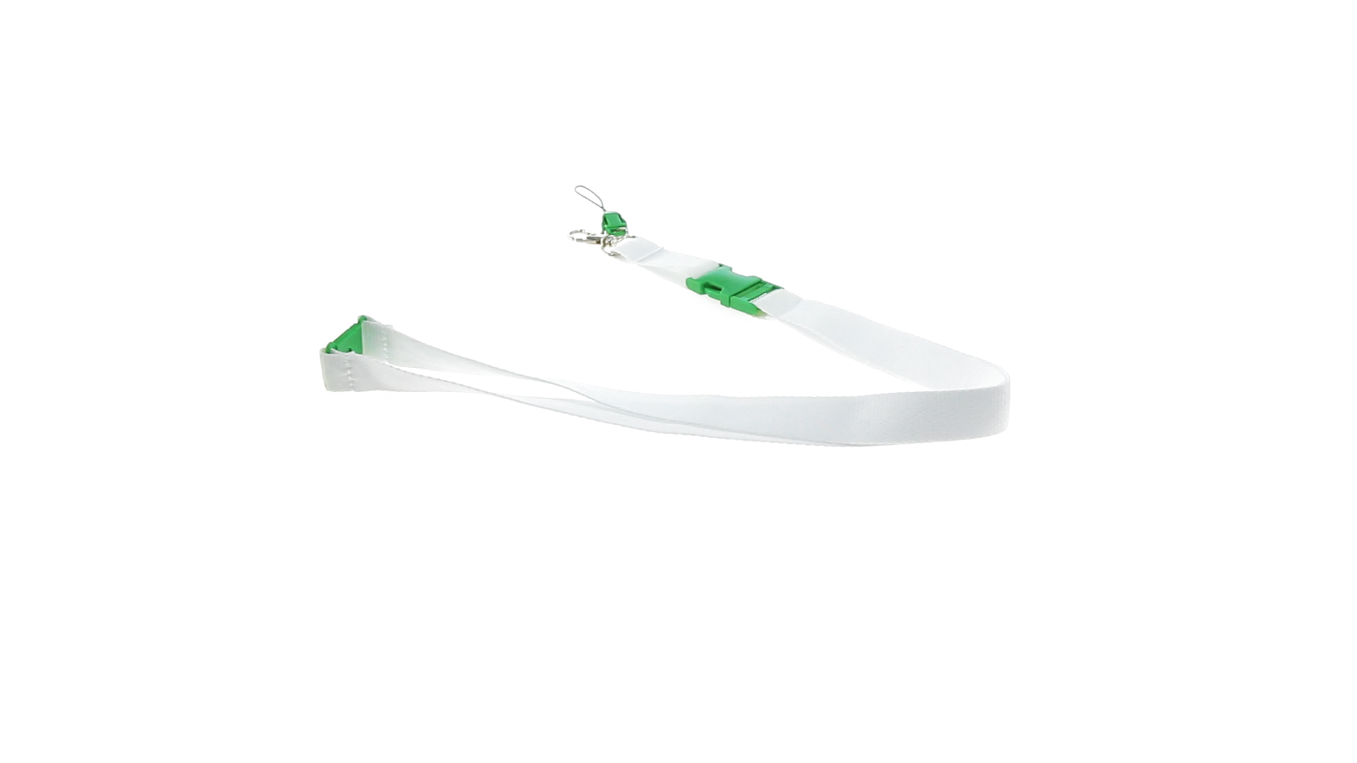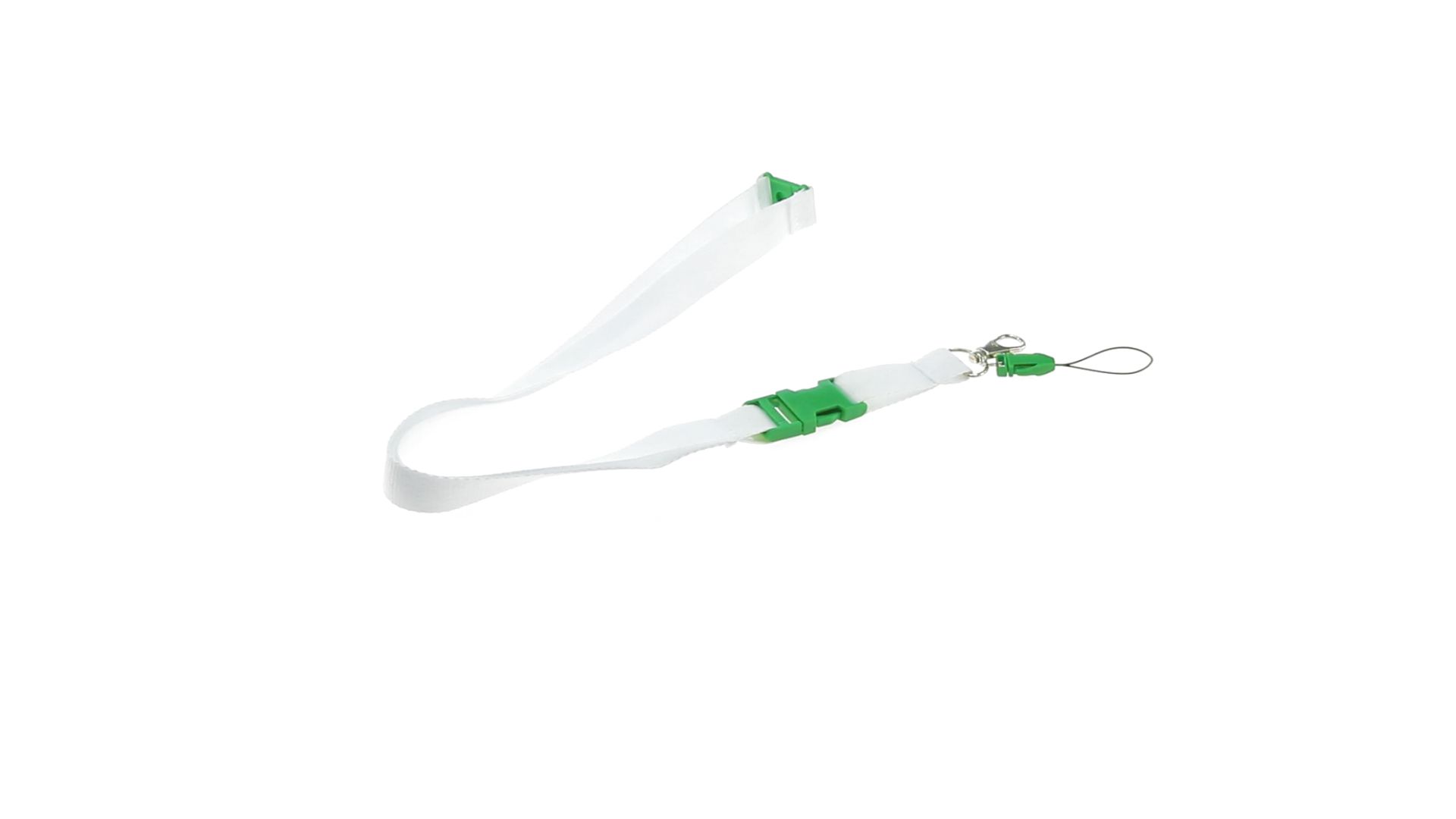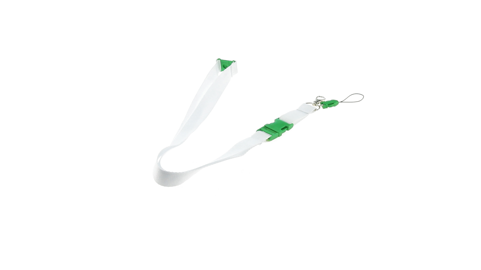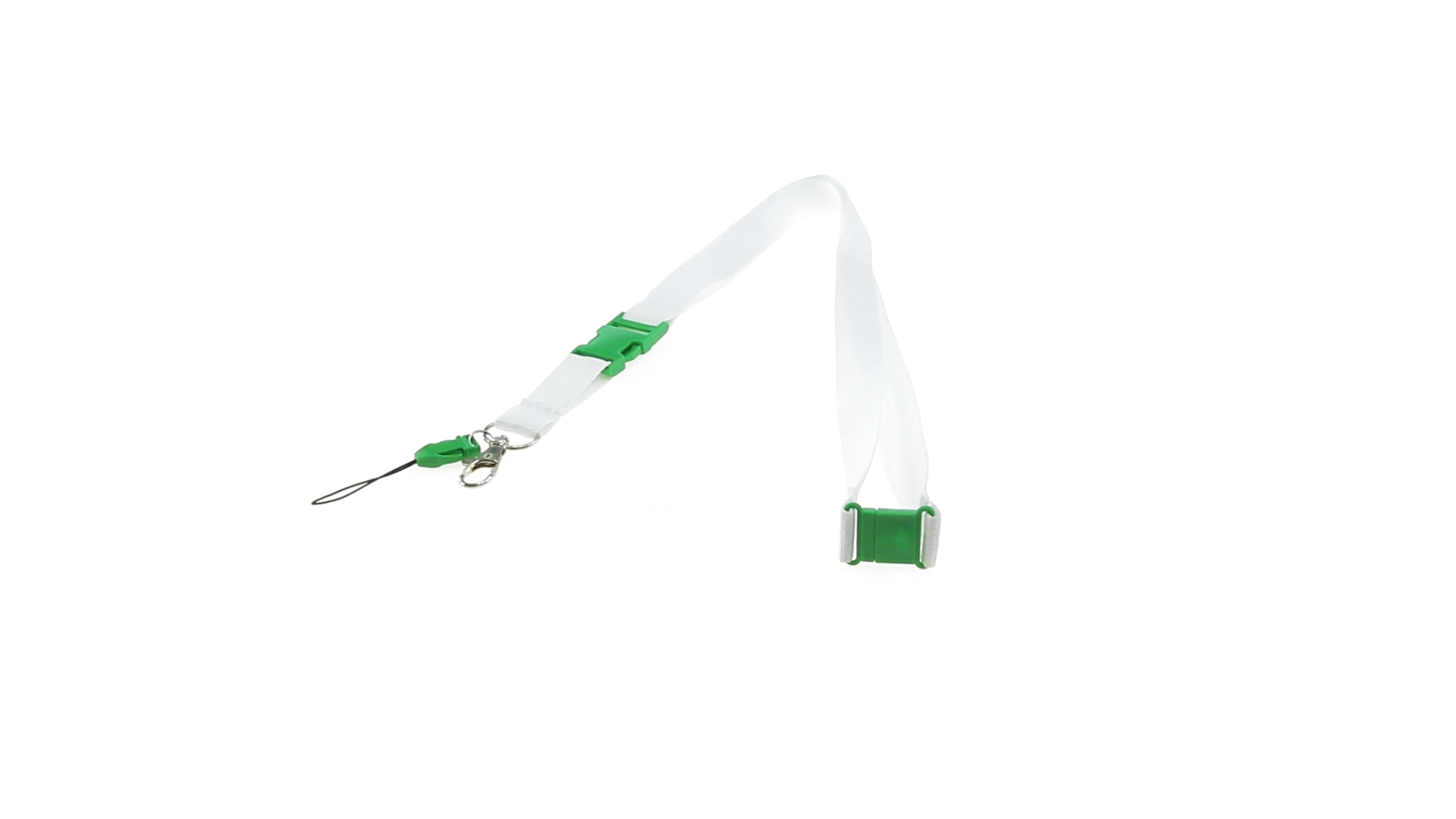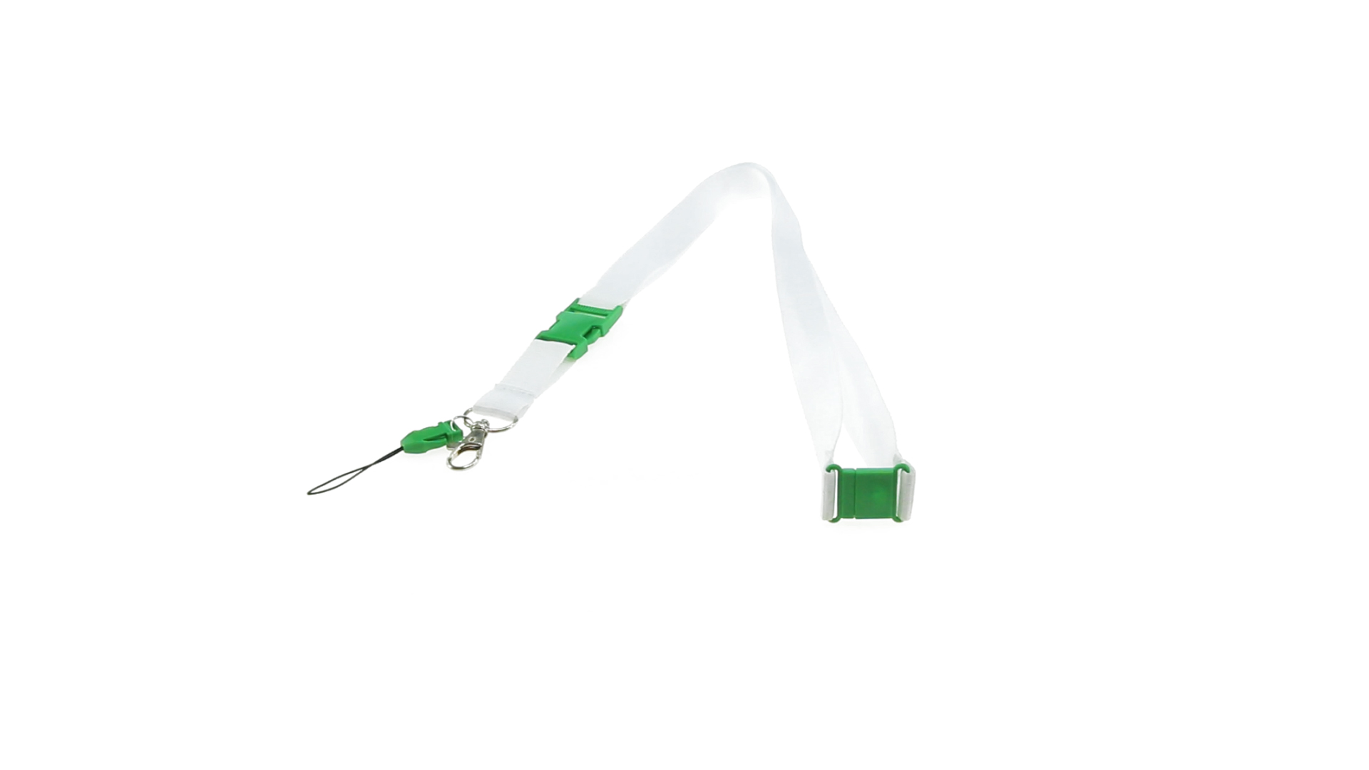 Lanyard aus resistentem, weichem Polyester in Weiss. Mit farblich passendem Klickverschluss in verschiedenen Farben sowie Metall-Karabiner und Schlaufe mit farblich passendem Klickverschluss. Speziell für den Sublimationsdruck entwickelt.