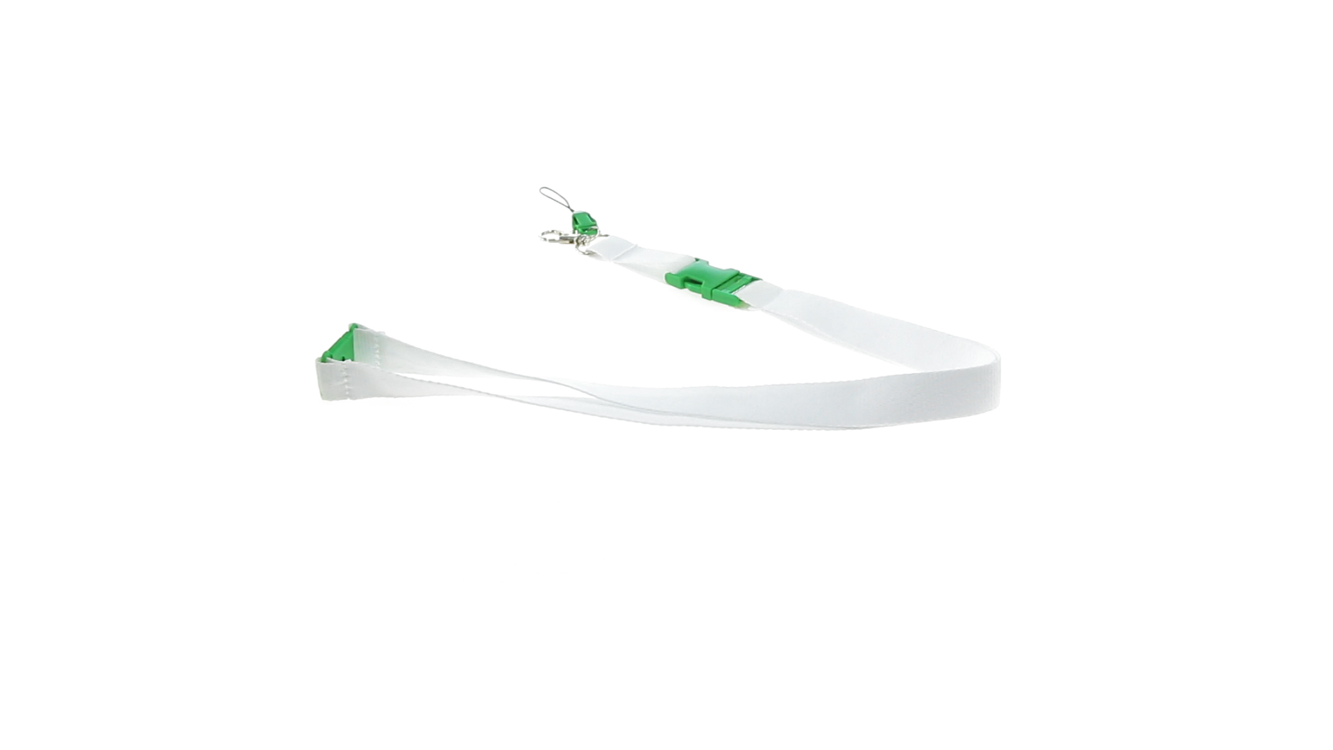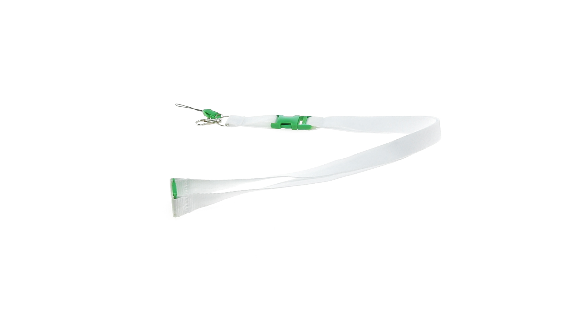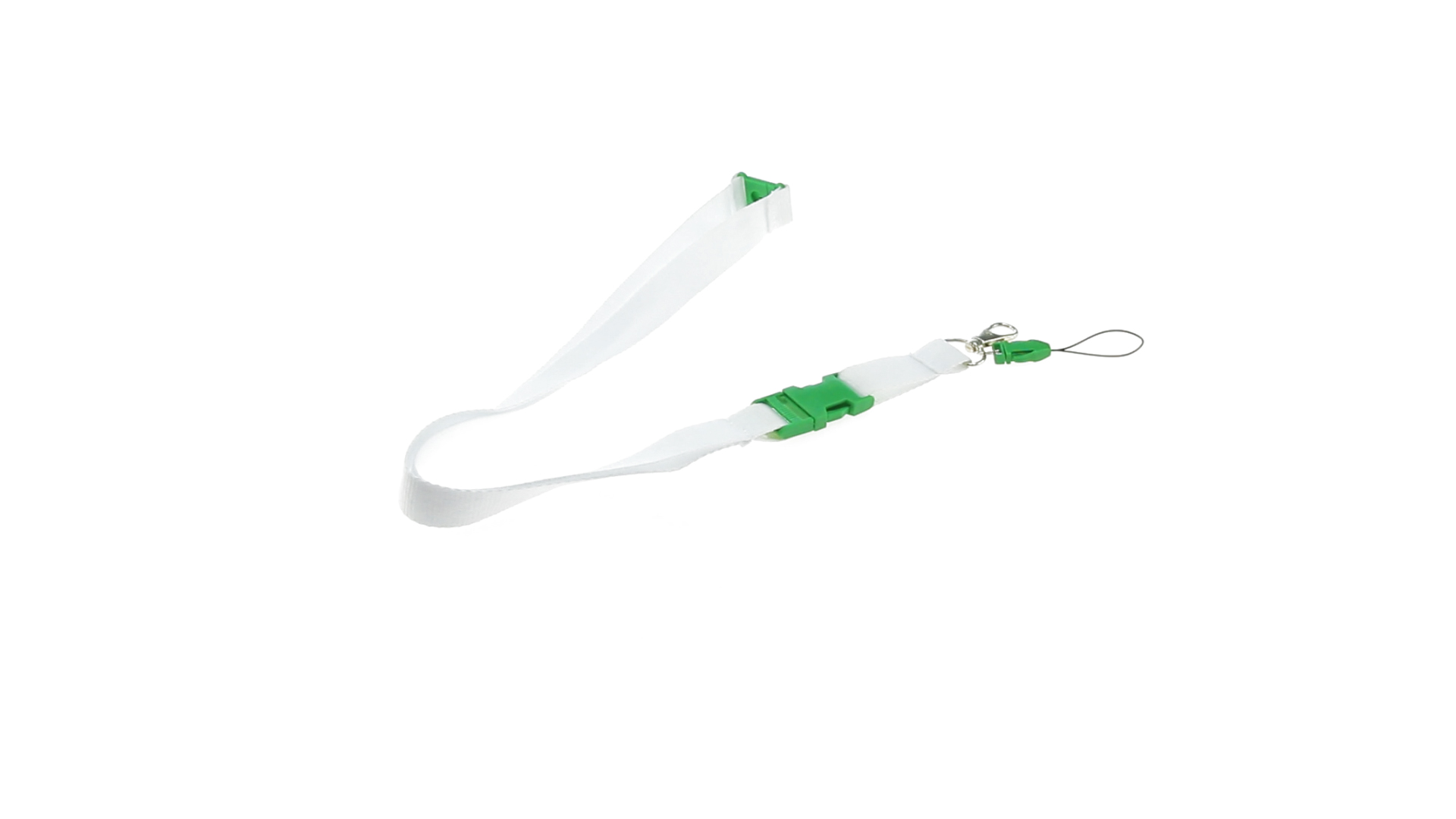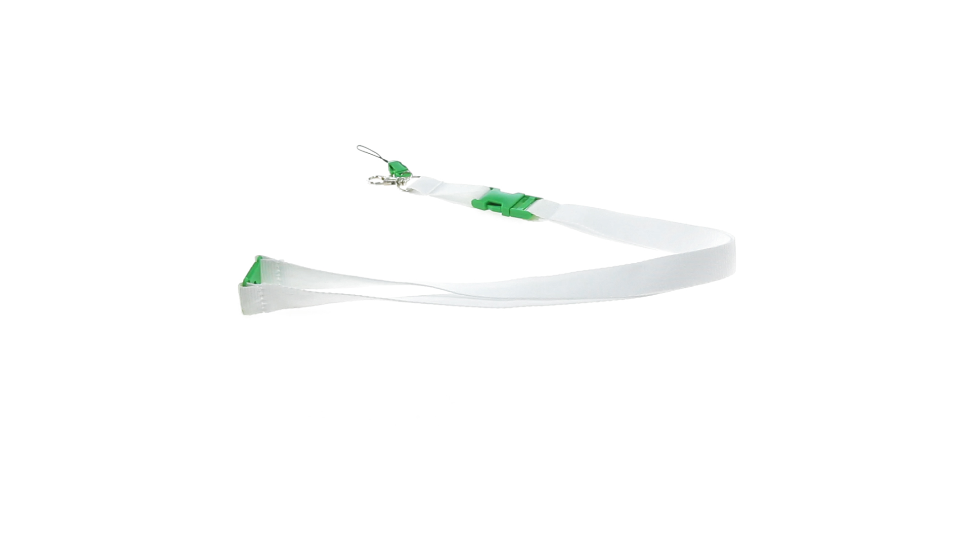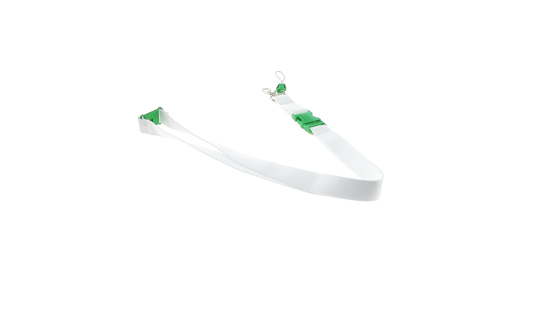 Lanyard aus resistentem, weichem Polyester in Weiss. Mit farblich passendem Klickverschluss in verschiedenen Farben sowie Metall-Karabiner und Schlaufe mit farblich passendem Klickverschluss. Speziell für den Sublimationsdruck entwickelt.