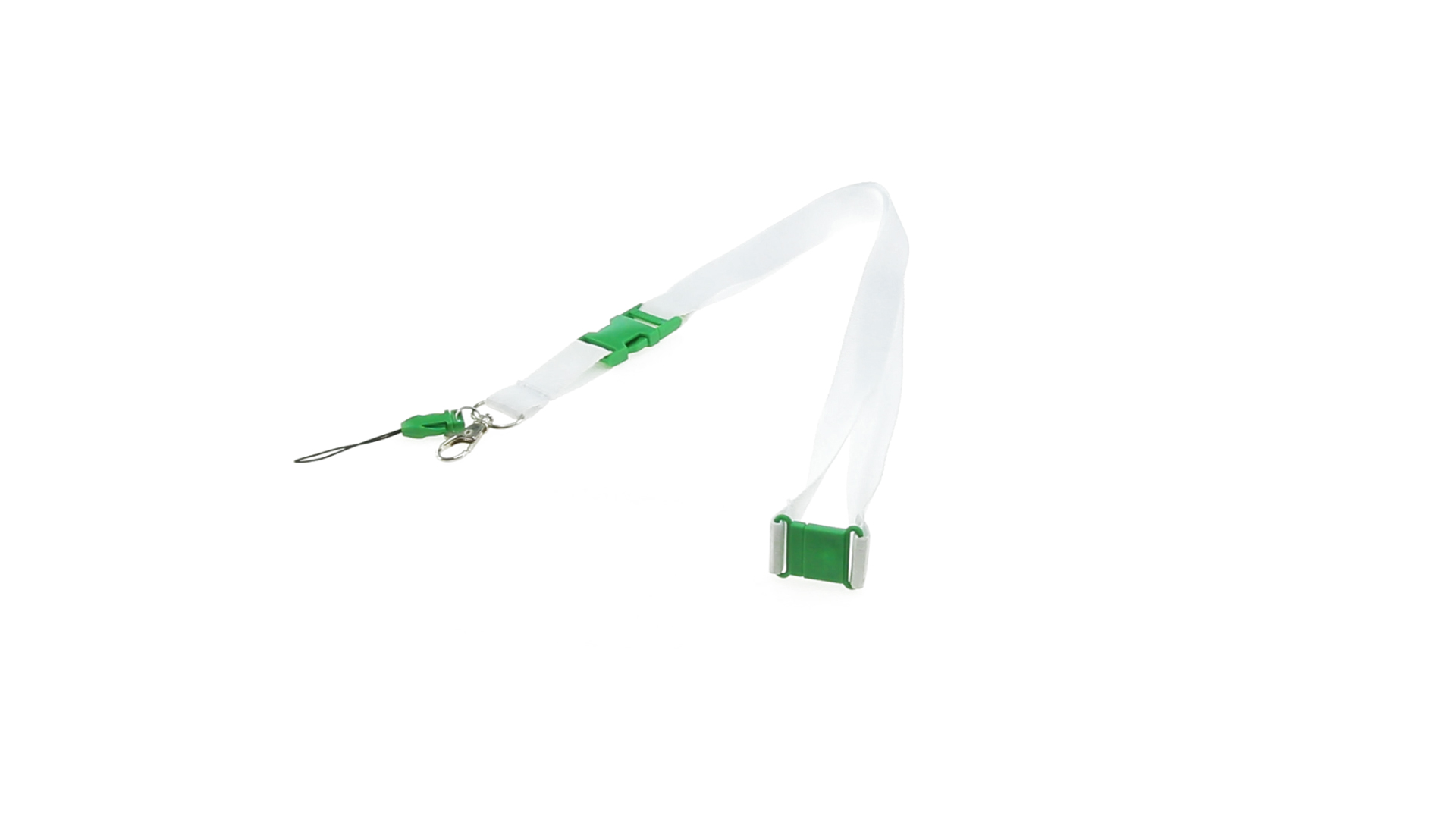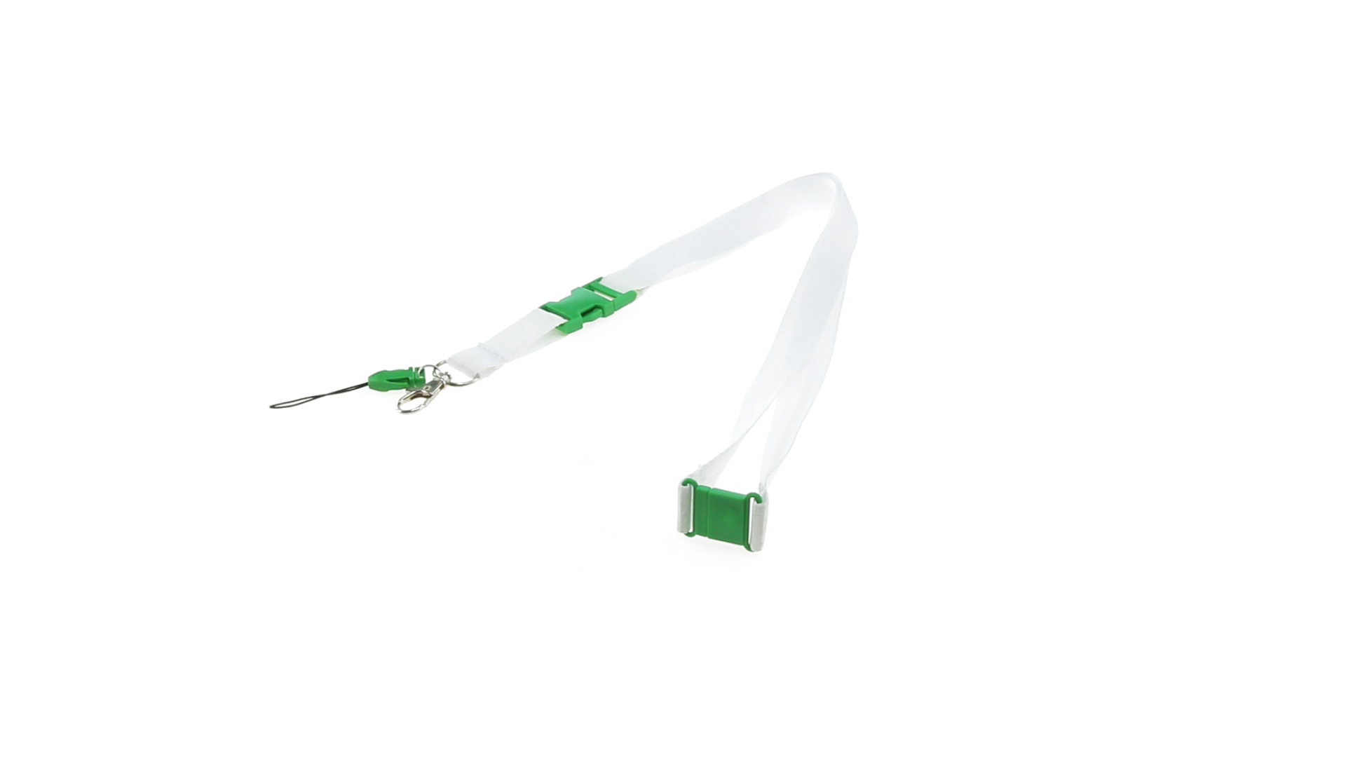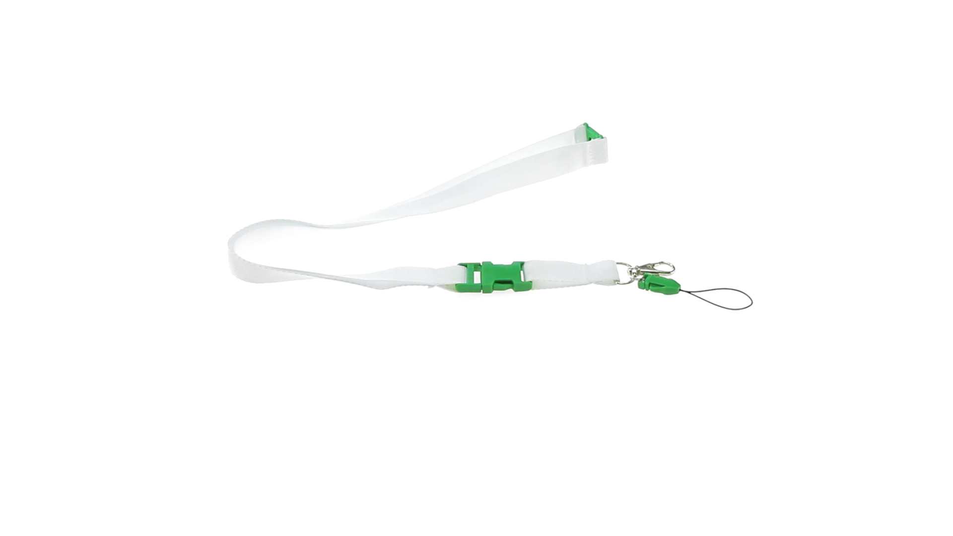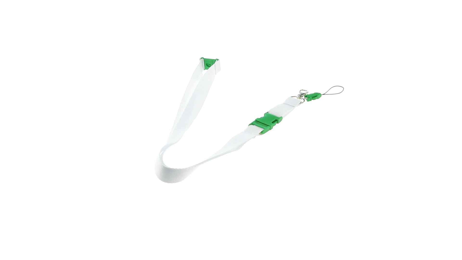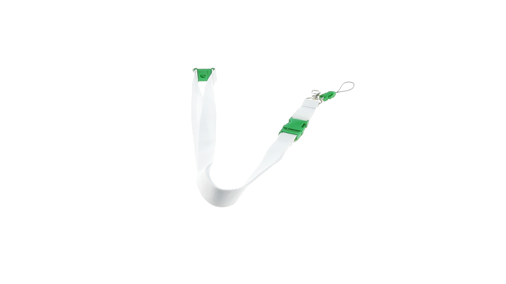 Lanyard aus resistentem, weichem Polyester in Weiss. Mit farblich passendem Klickverschluss in verschiedenen Farben sowie Metall-Karabiner und Schlaufe mit farblich passendem Klickverschluss. Speziell für den Sublimationsdruck entwickelt.