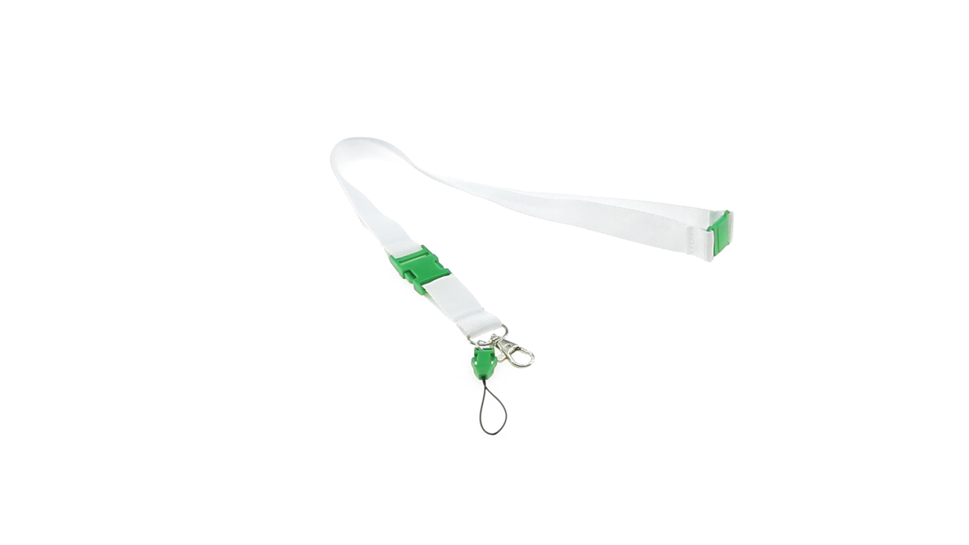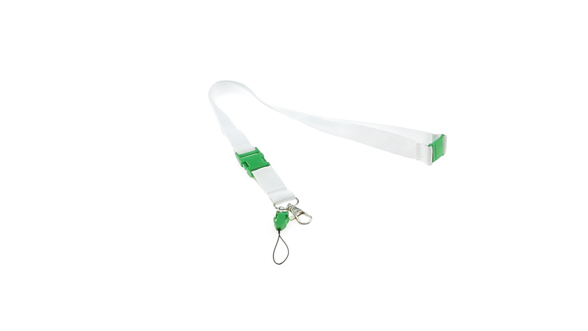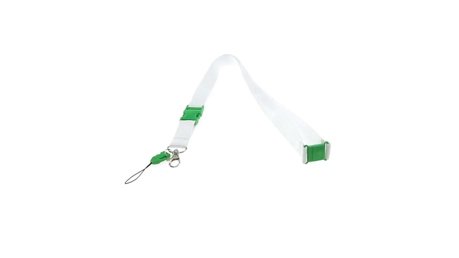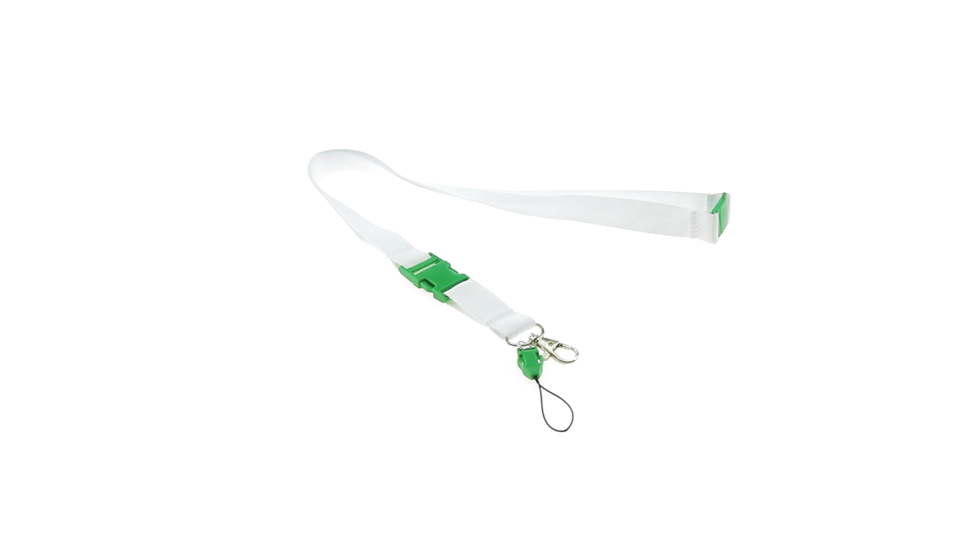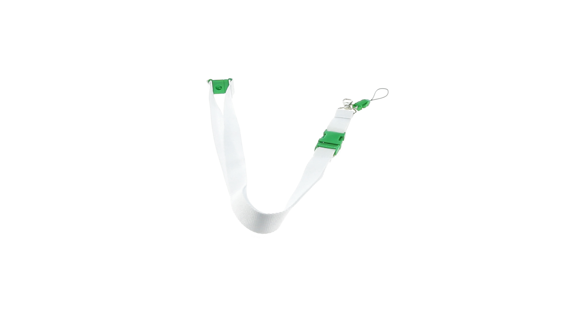 Lanyard aus resistentem, weichem Polyester in Weiss. Mit farblich passendem Klickverschluss in verschiedenen Farben sowie Metall-Karabiner und Schlaufe mit farblich passendem Klickverschluss. Speziell für den Sublimationsdruck entwickelt.