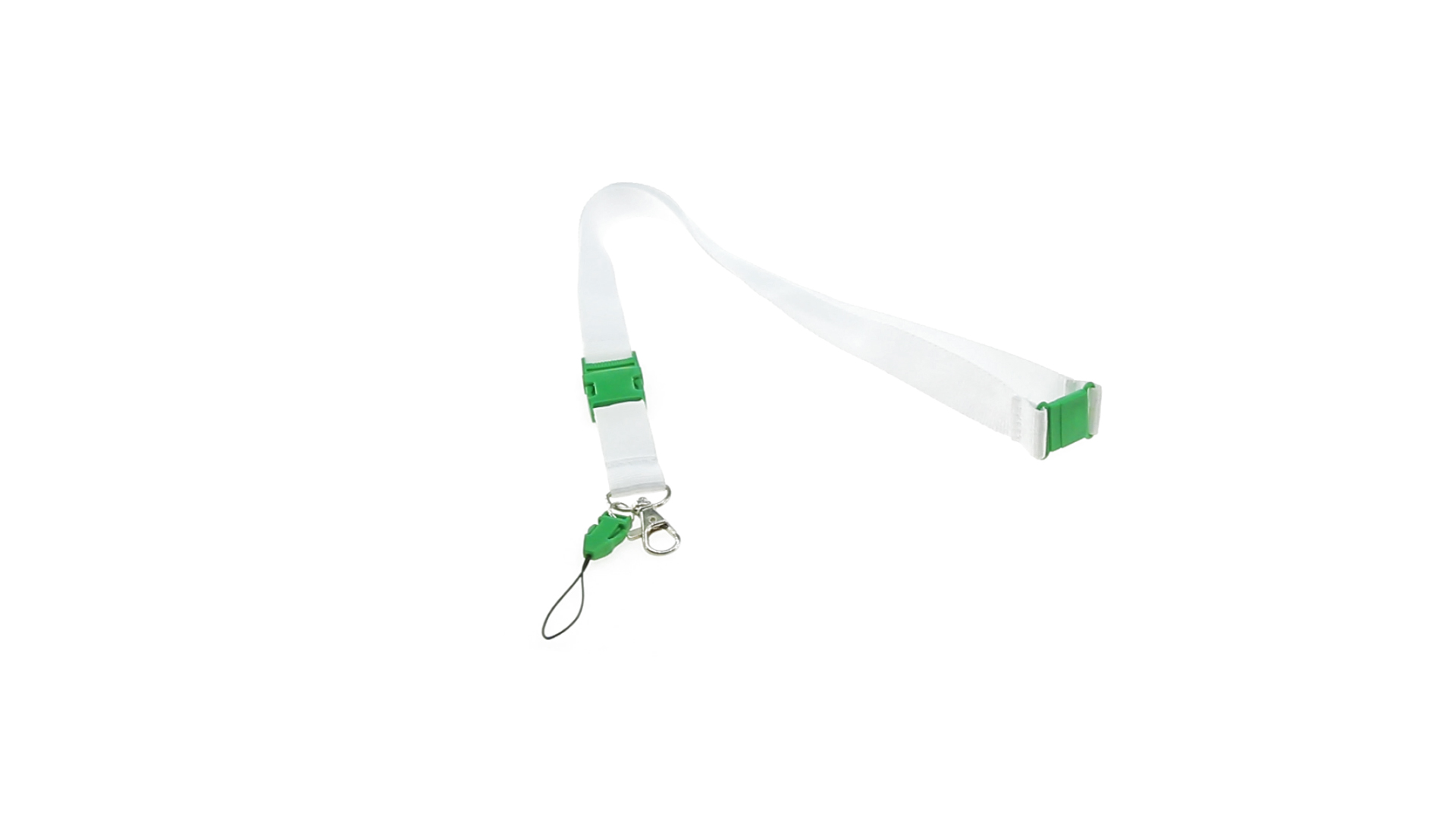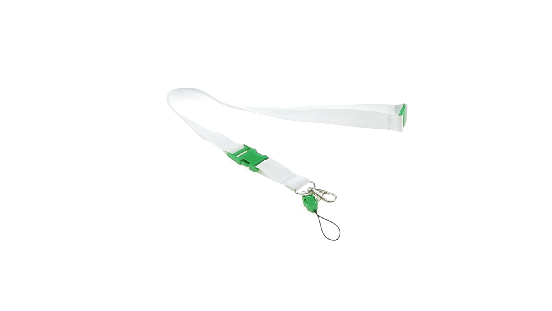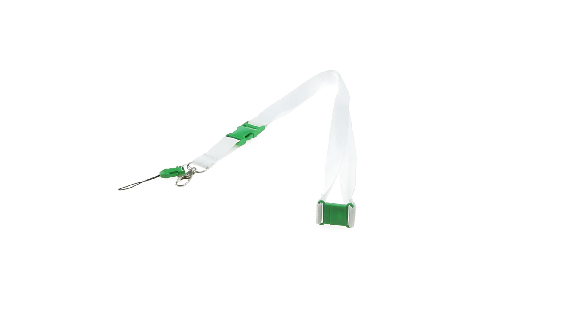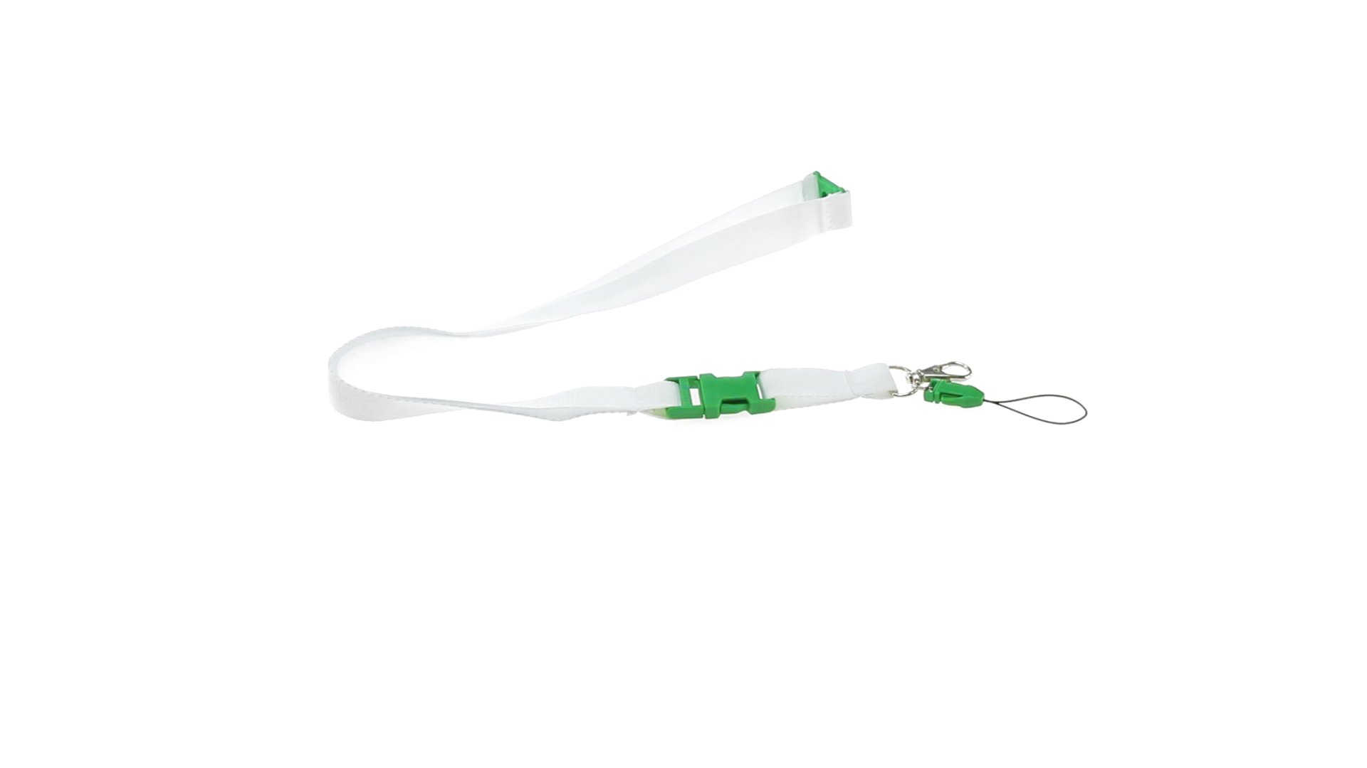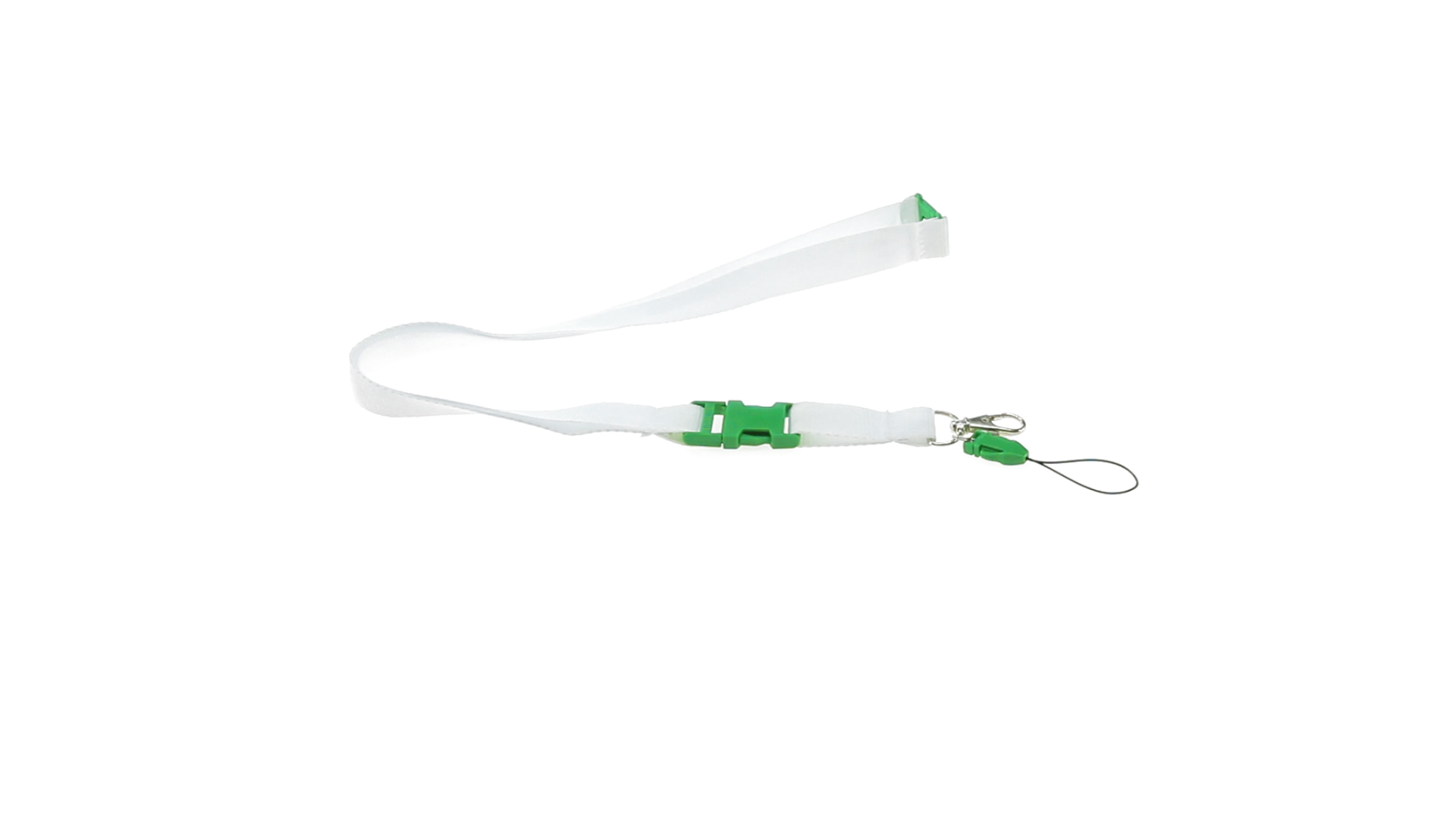 Lanyard aus resistentem, weichem Polyester in Weiss. Mit farblich passendem Klickverschluss in verschiedenen Farben sowie Metall-Karabiner und Schlaufe mit farblich passendem Klickverschluss. Speziell für den Sublimationsdruck entwickelt.