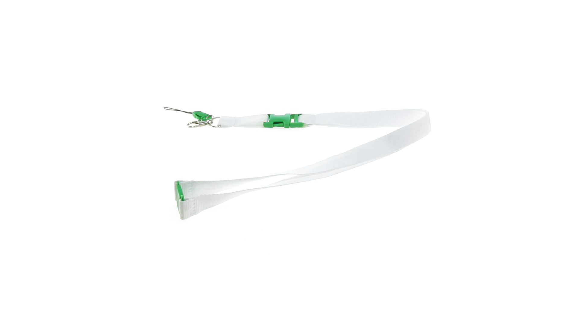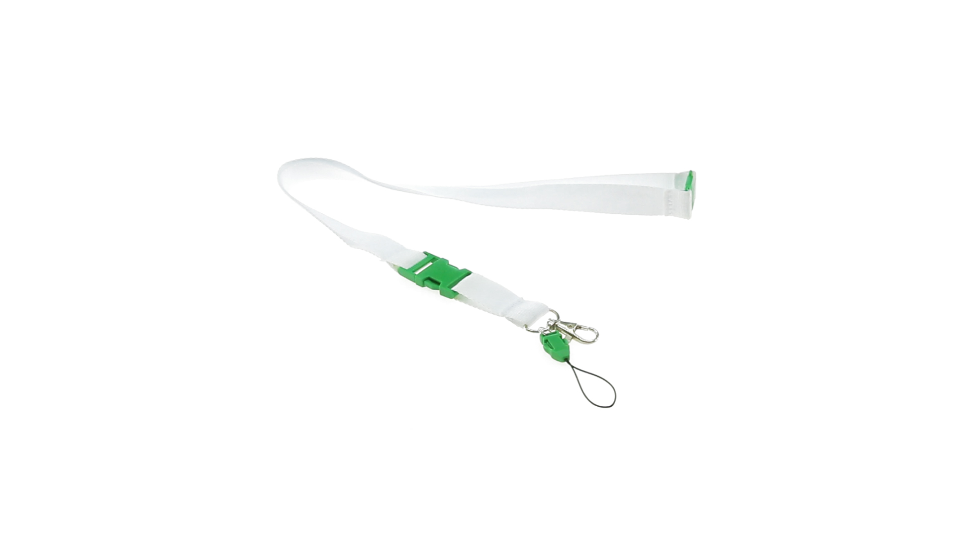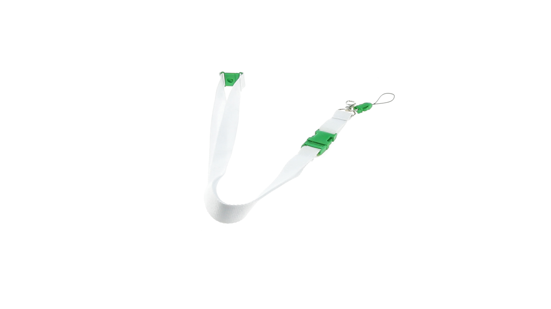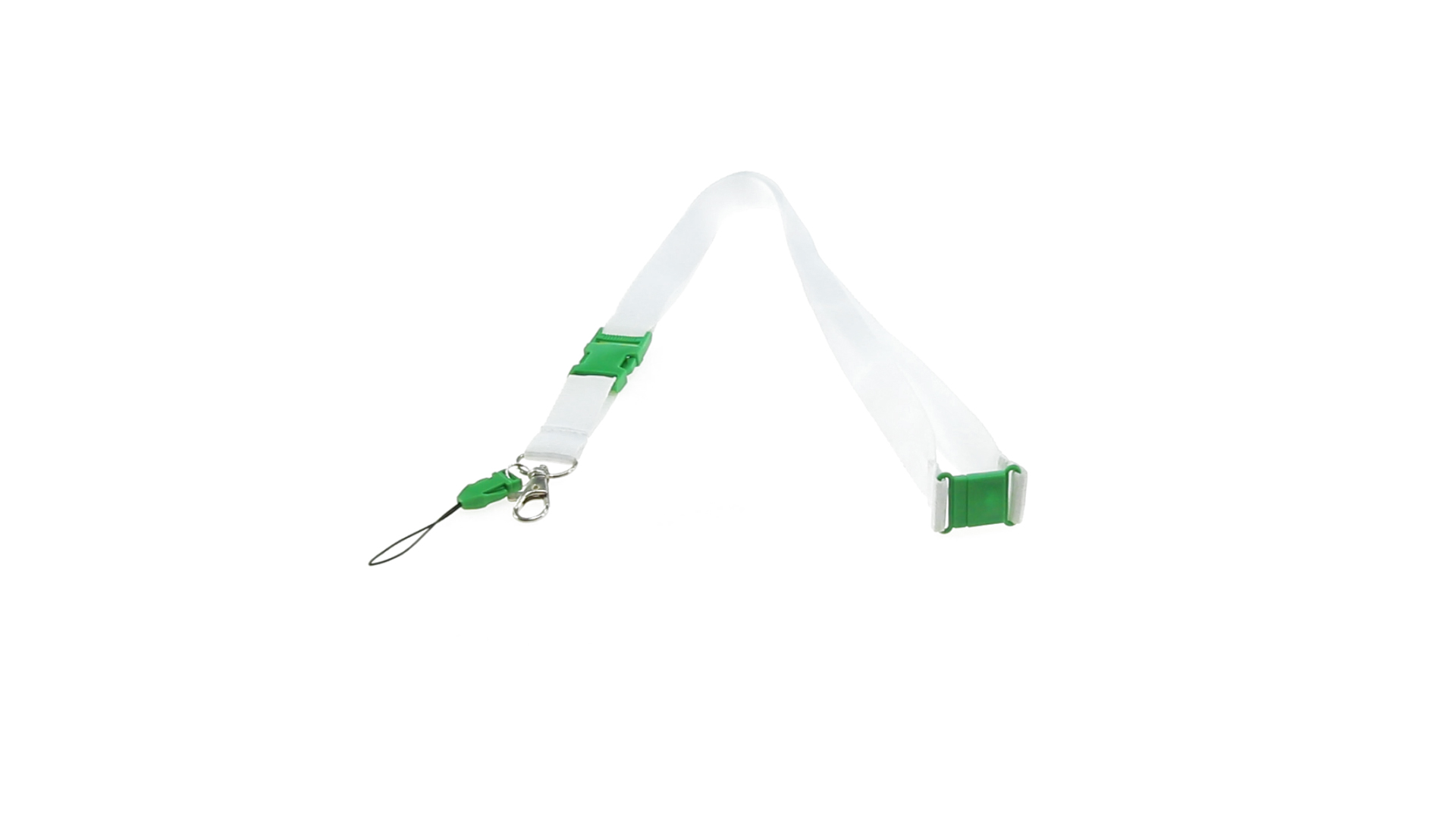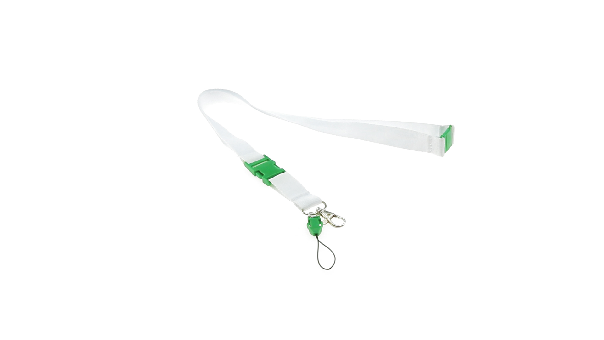 Lanyard aus resistentem, weichem Polyester in Weiss. Mit farblich passendem Klickverschluss in verschiedenen Farben sowie Metall-Karabiner und Schlaufe mit farblich passendem Klickverschluss. Speziell für den Sublimationsdruck entwickelt.