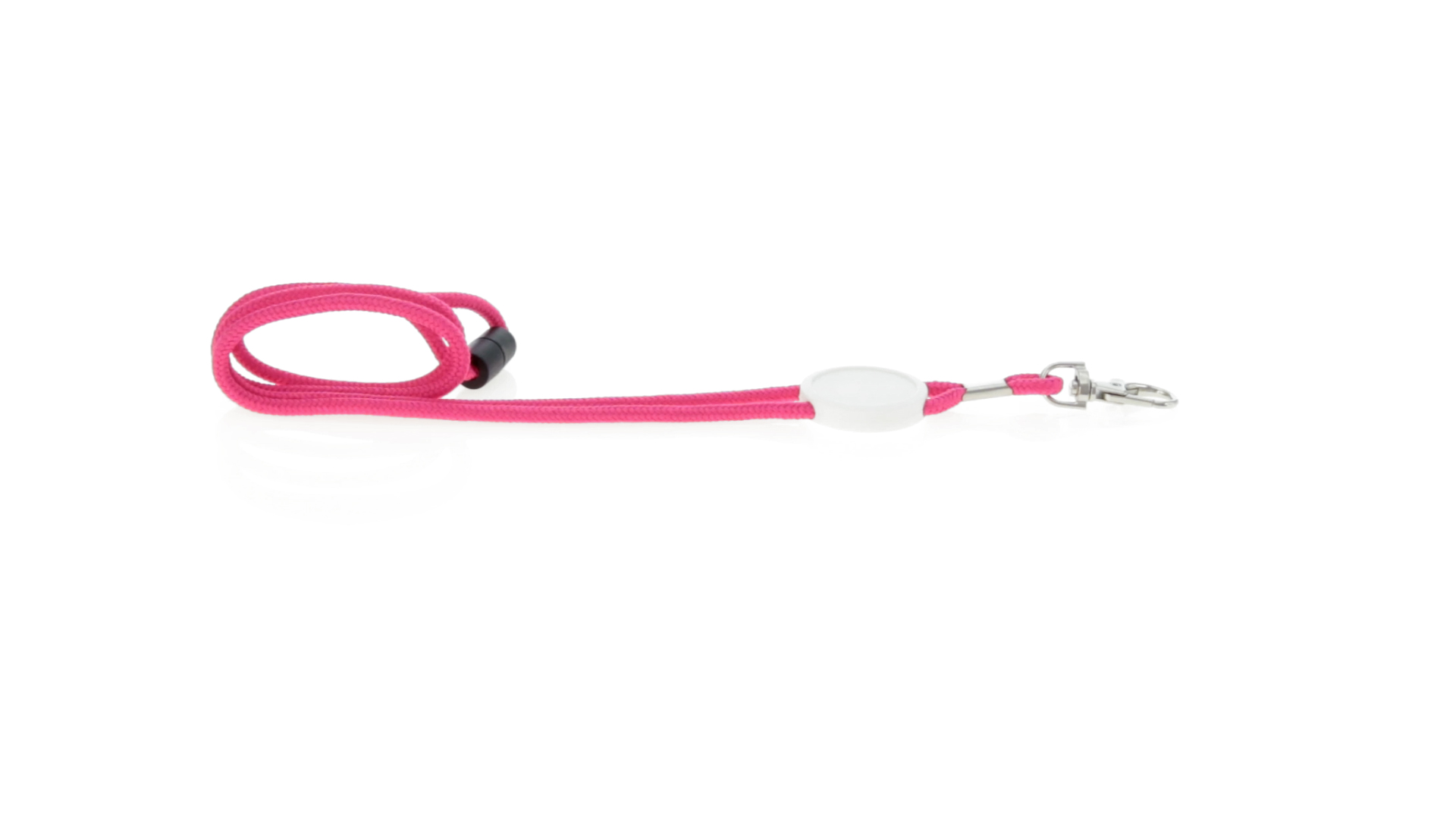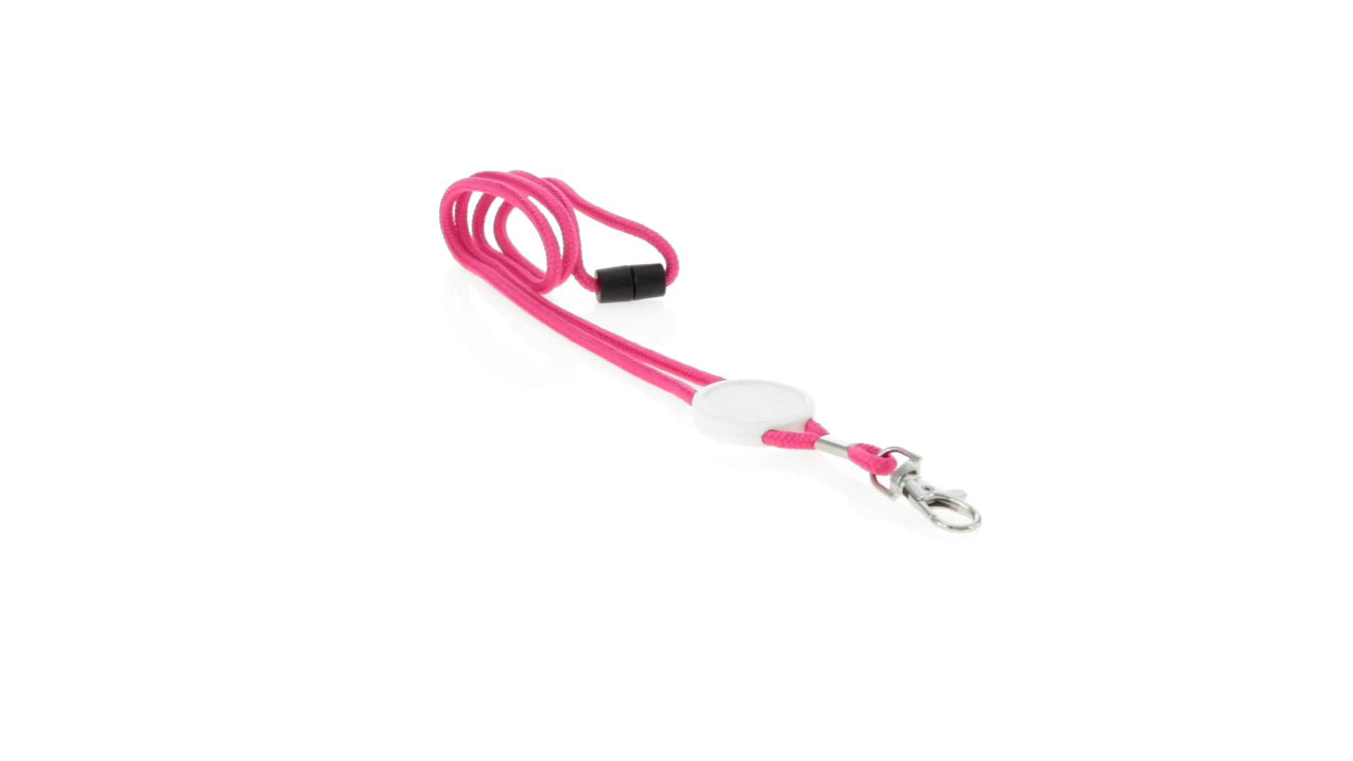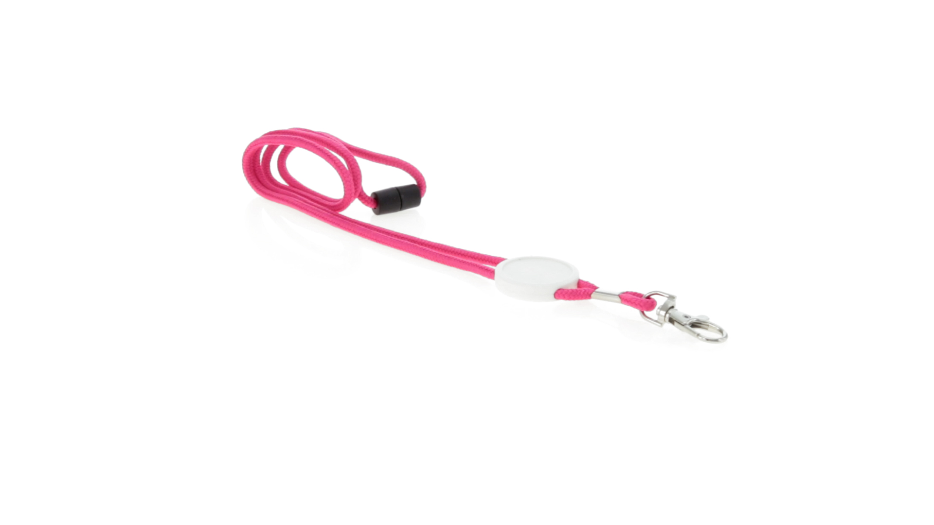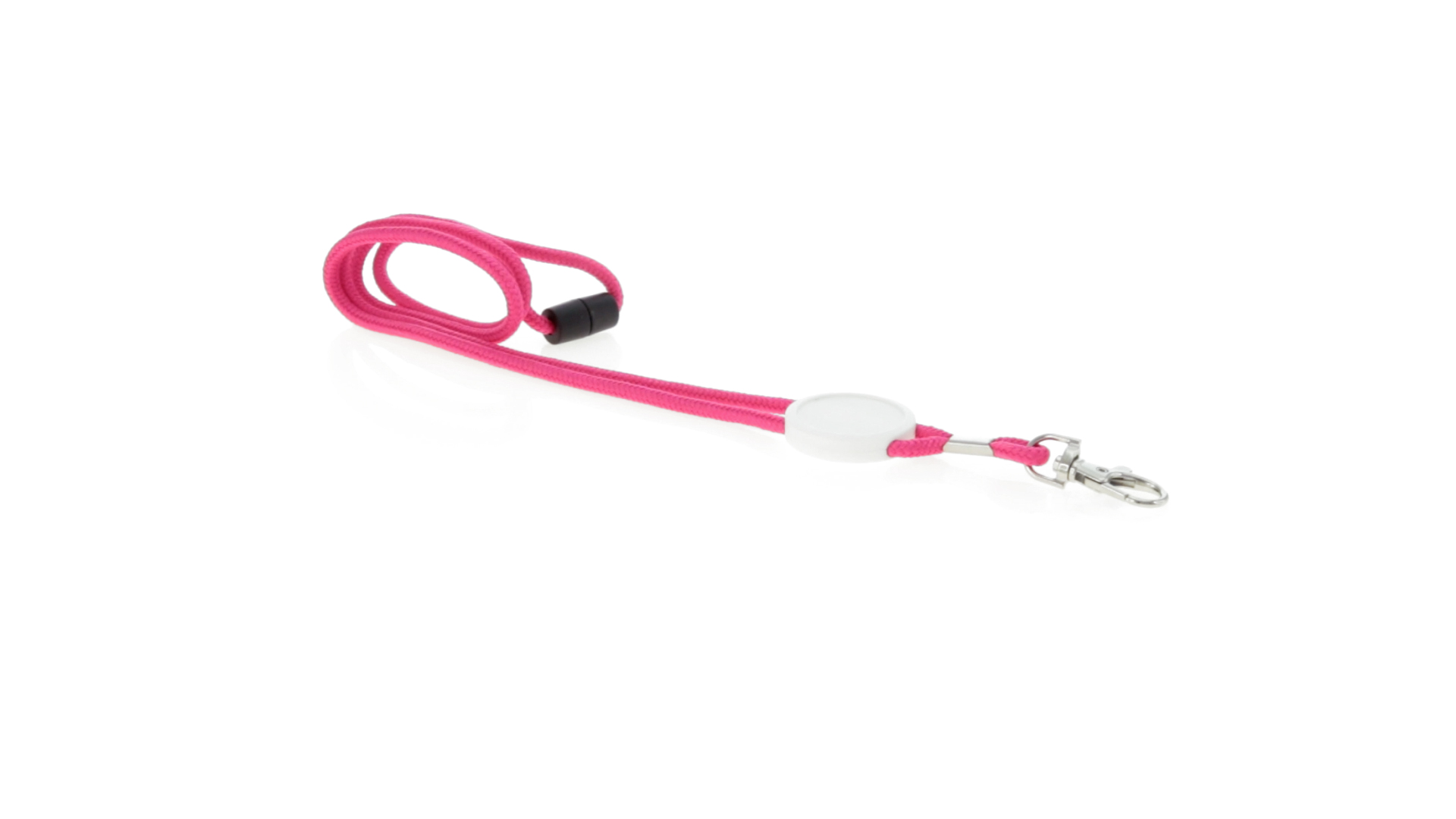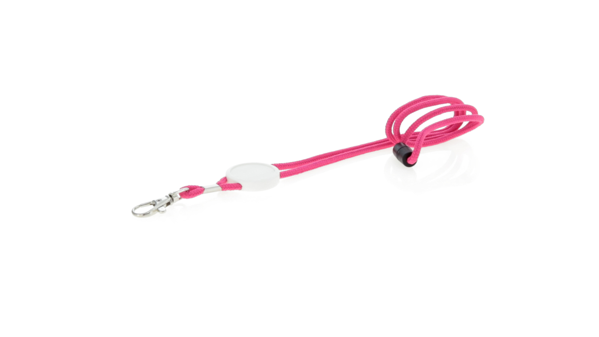 Lanyard mit robuster Kordel aus weichem Polyester in verschiedenen lebendigen Farben. Mit Klickverschluss am Nacken, Befestigungskarabiner aus Metall und zentraler Fläche zum Bedrucken.