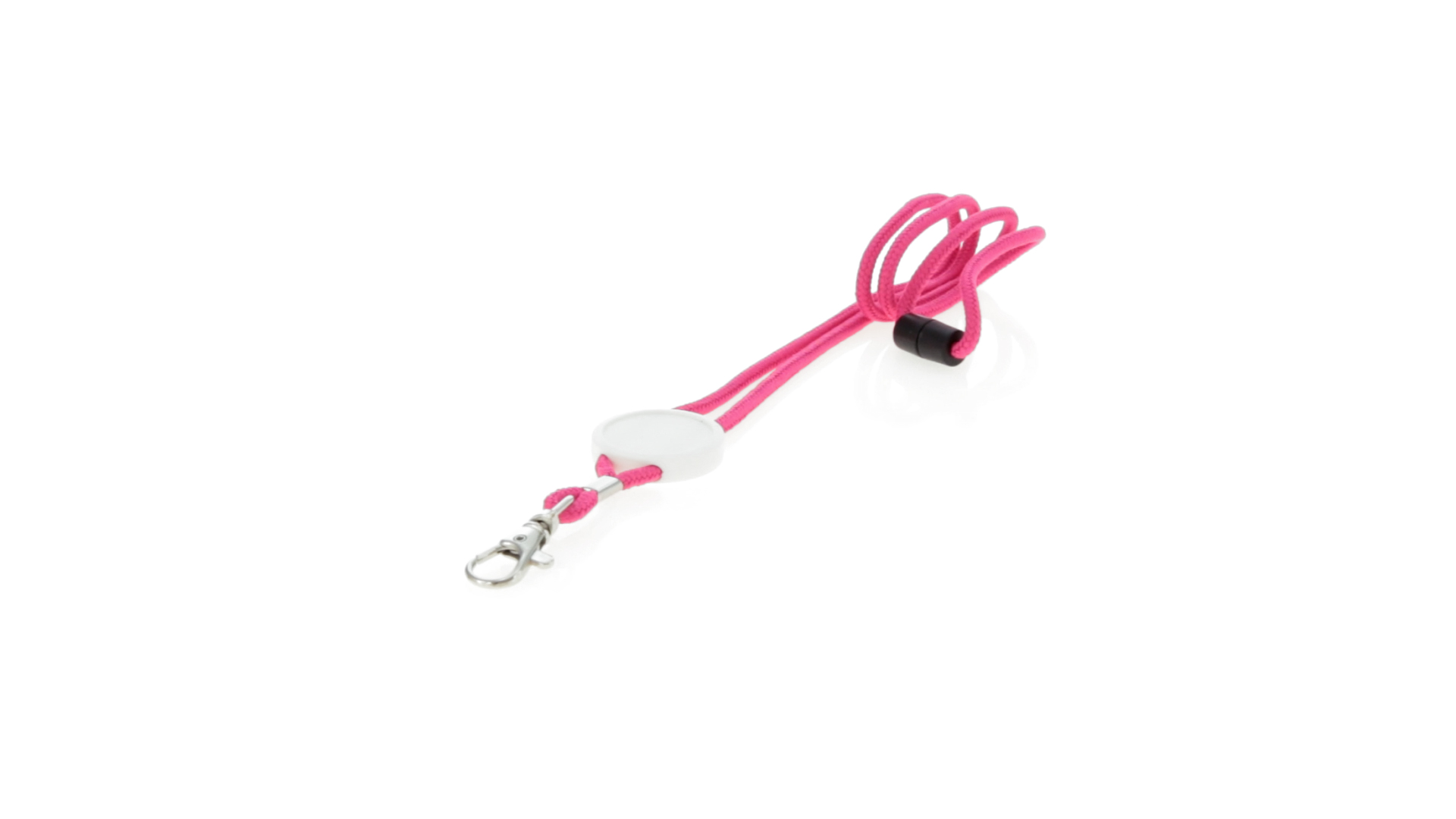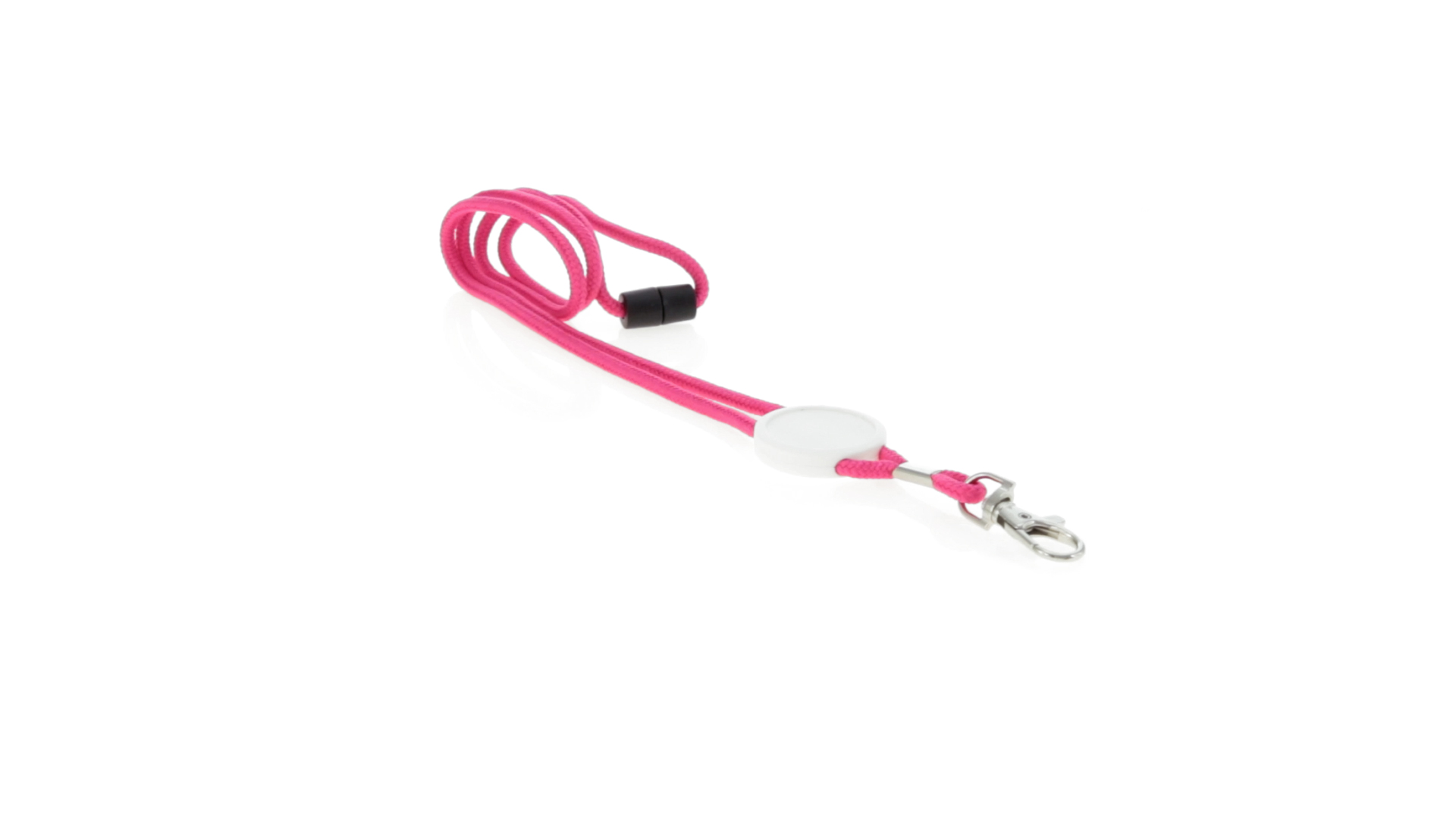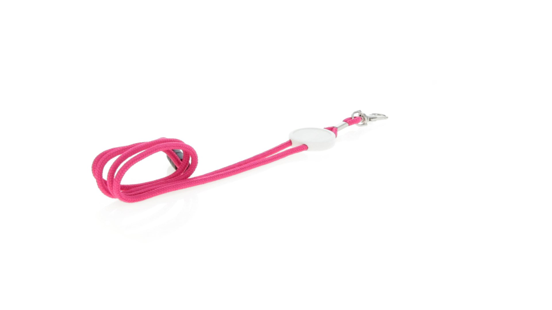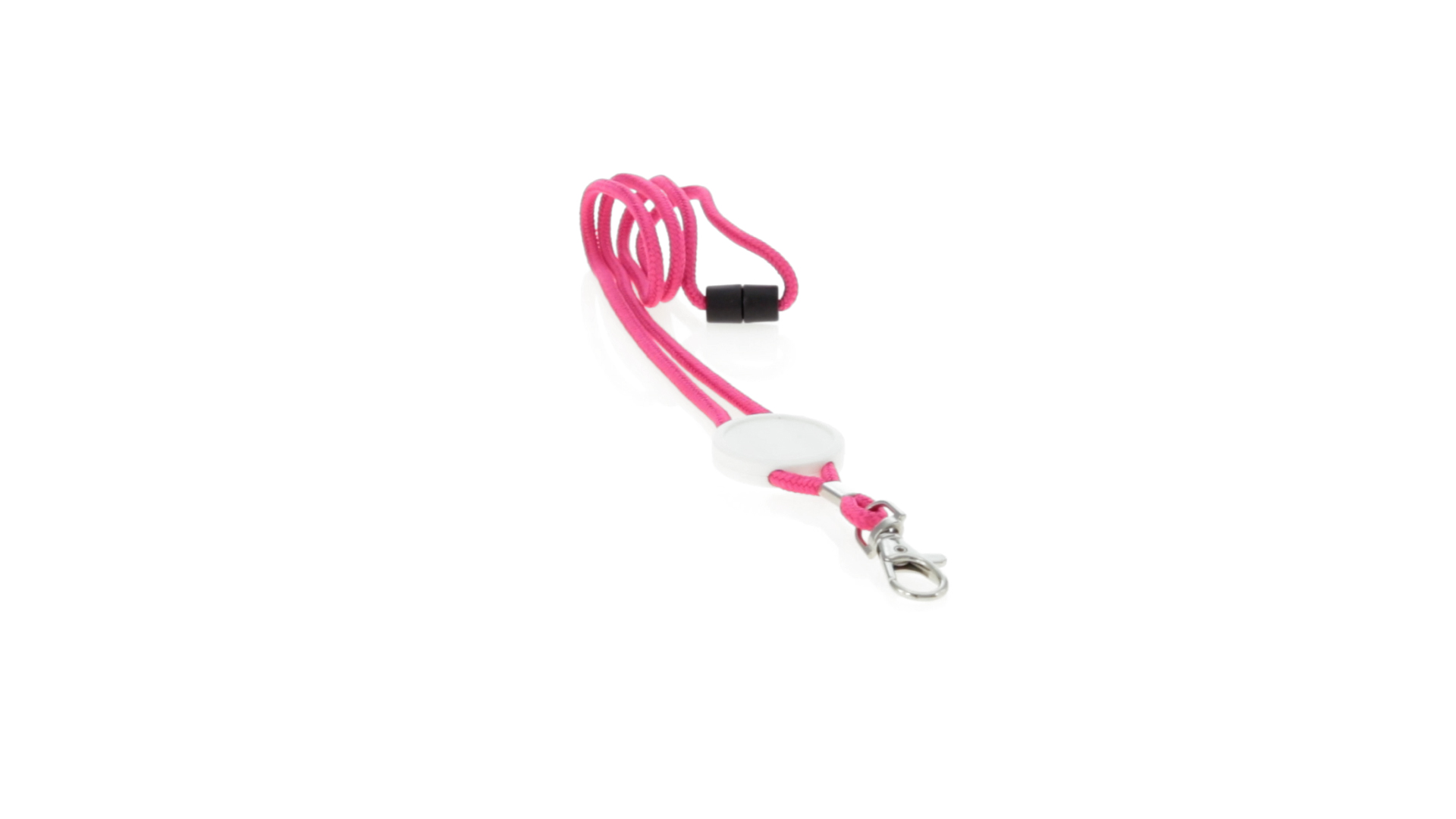 Lanyard mit robuster Kordel aus weichem Polyester in verschiedenen lebendigen Farben. Mit Klickverschluss am Nacken, Befestigungskarabiner aus Metall und zentraler Fläche zum Bedrucken.