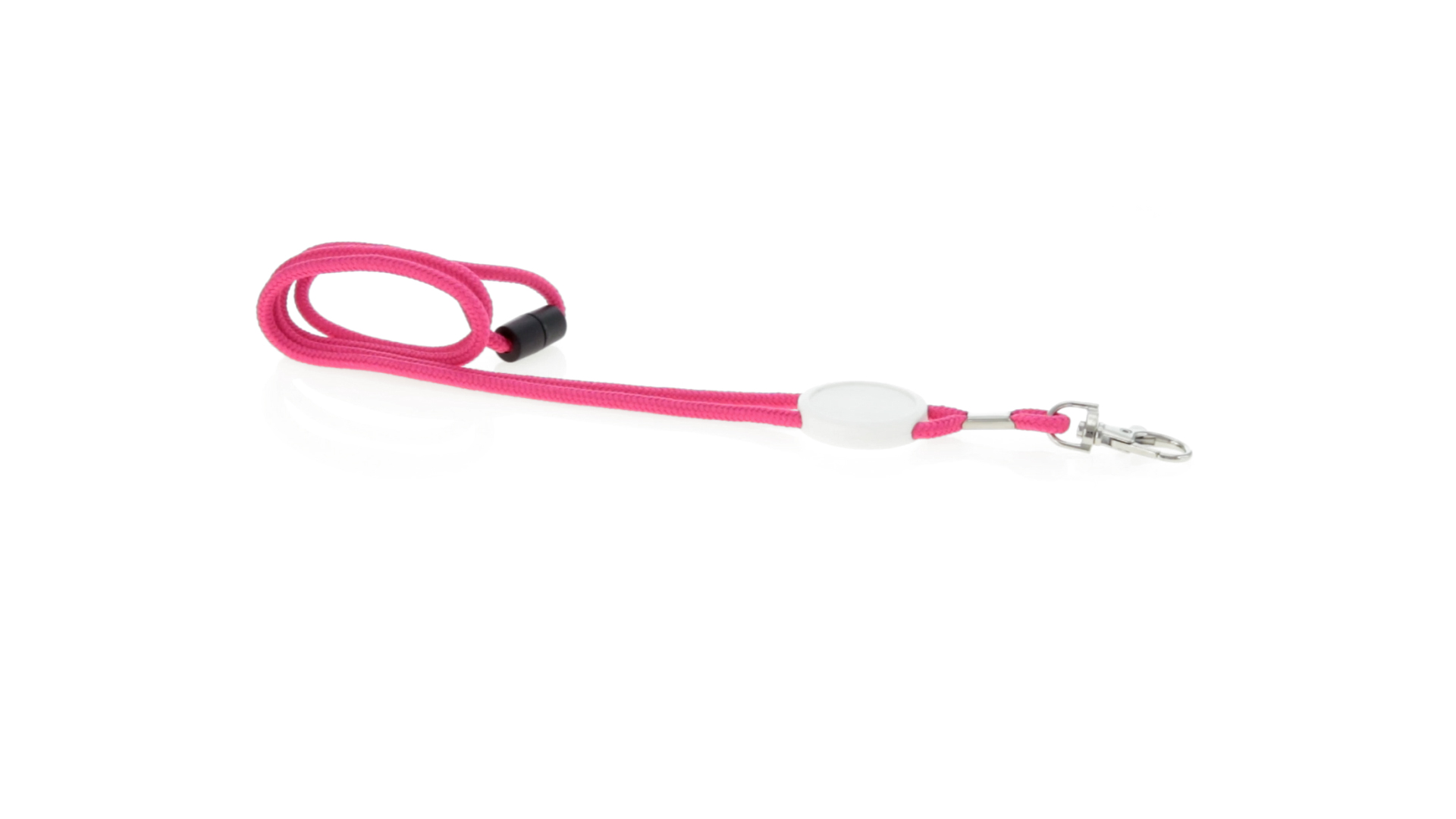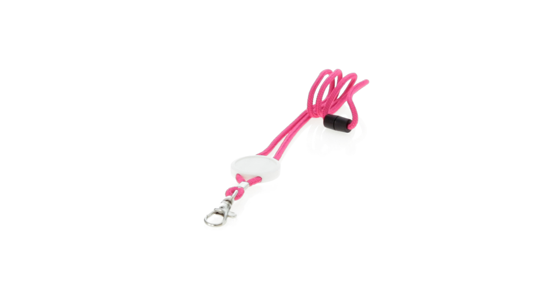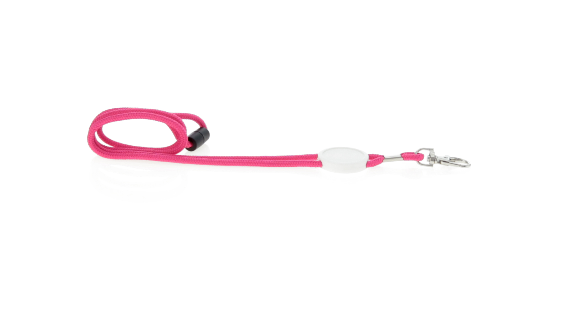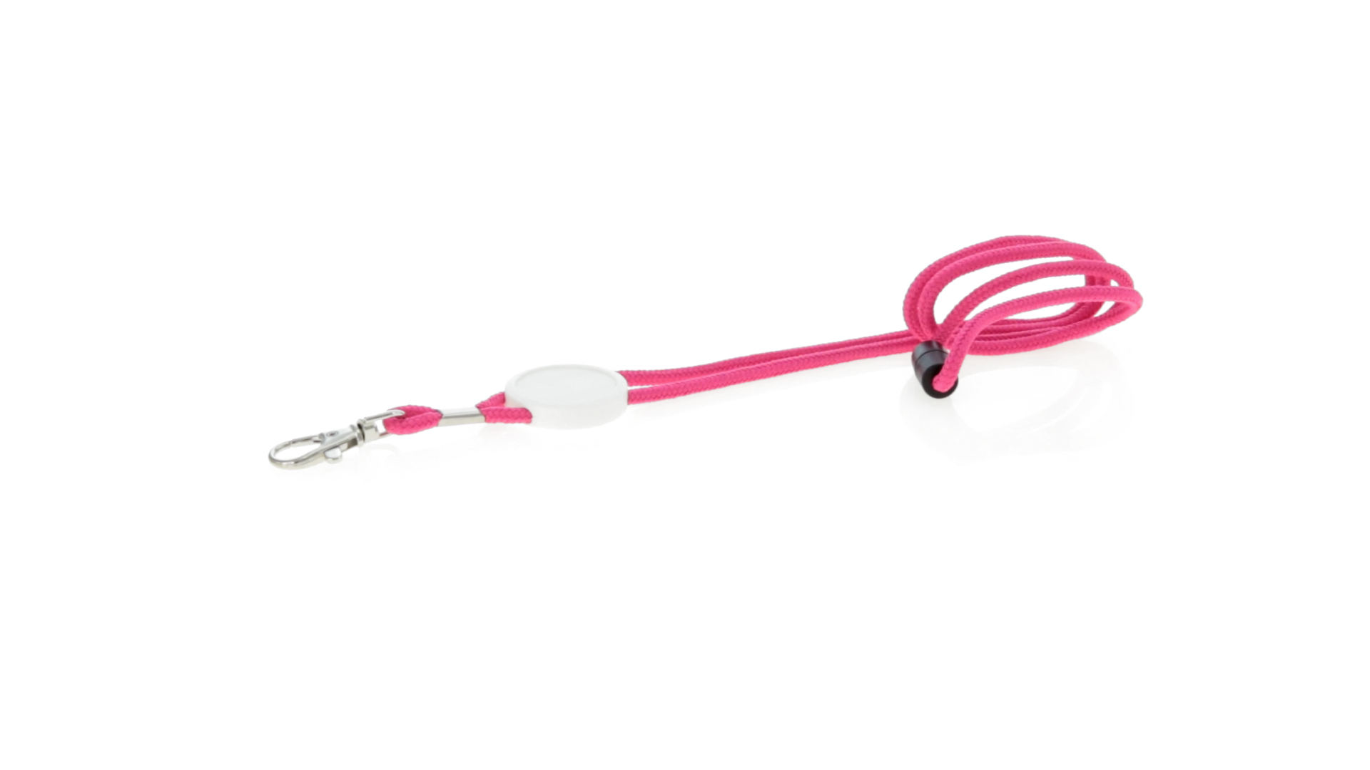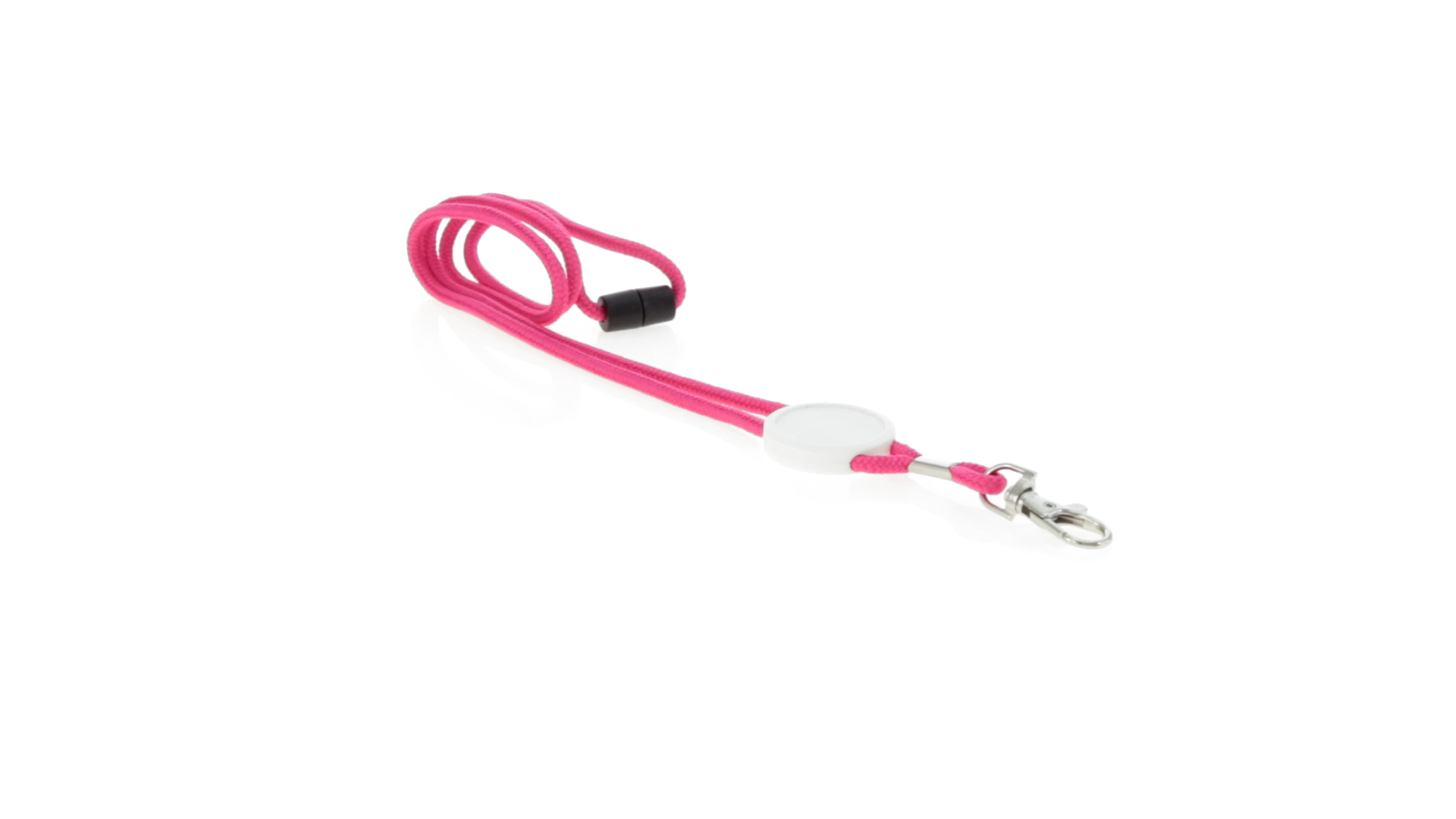 Lanyard mit robuster Kordel aus weichem Polyester in verschiedenen lebendigen Farben. Mit Klickverschluss am Nacken, Befestigungskarabiner aus Metall und zentraler Fläche zum Bedrucken.