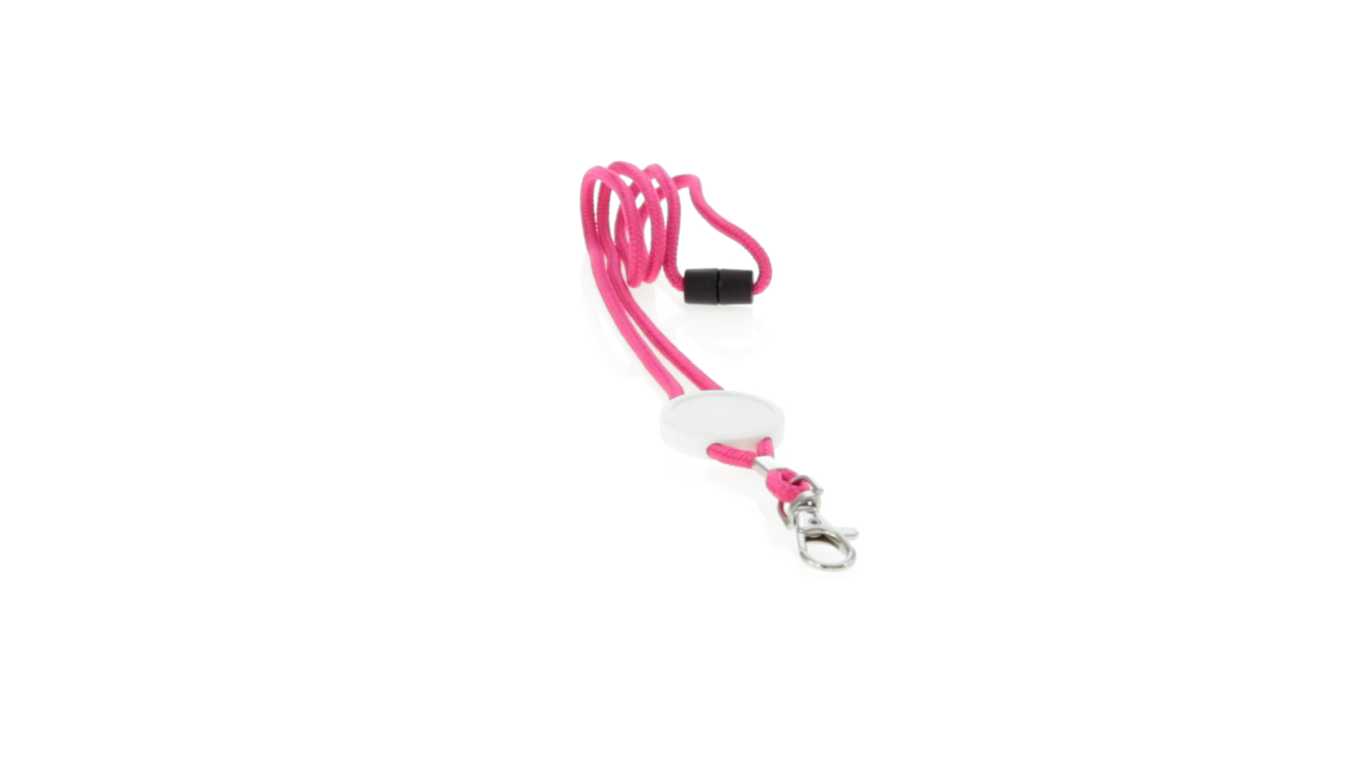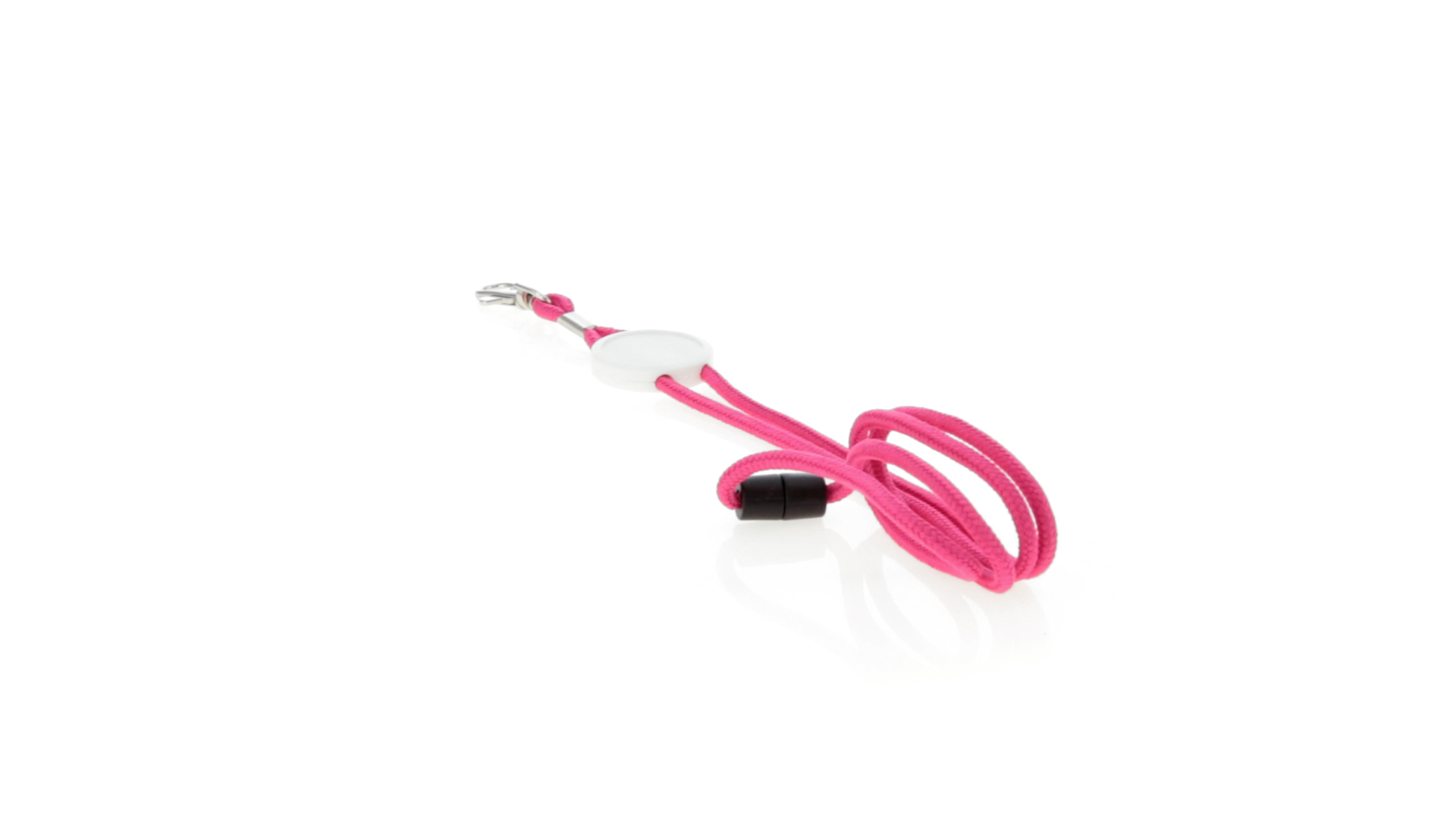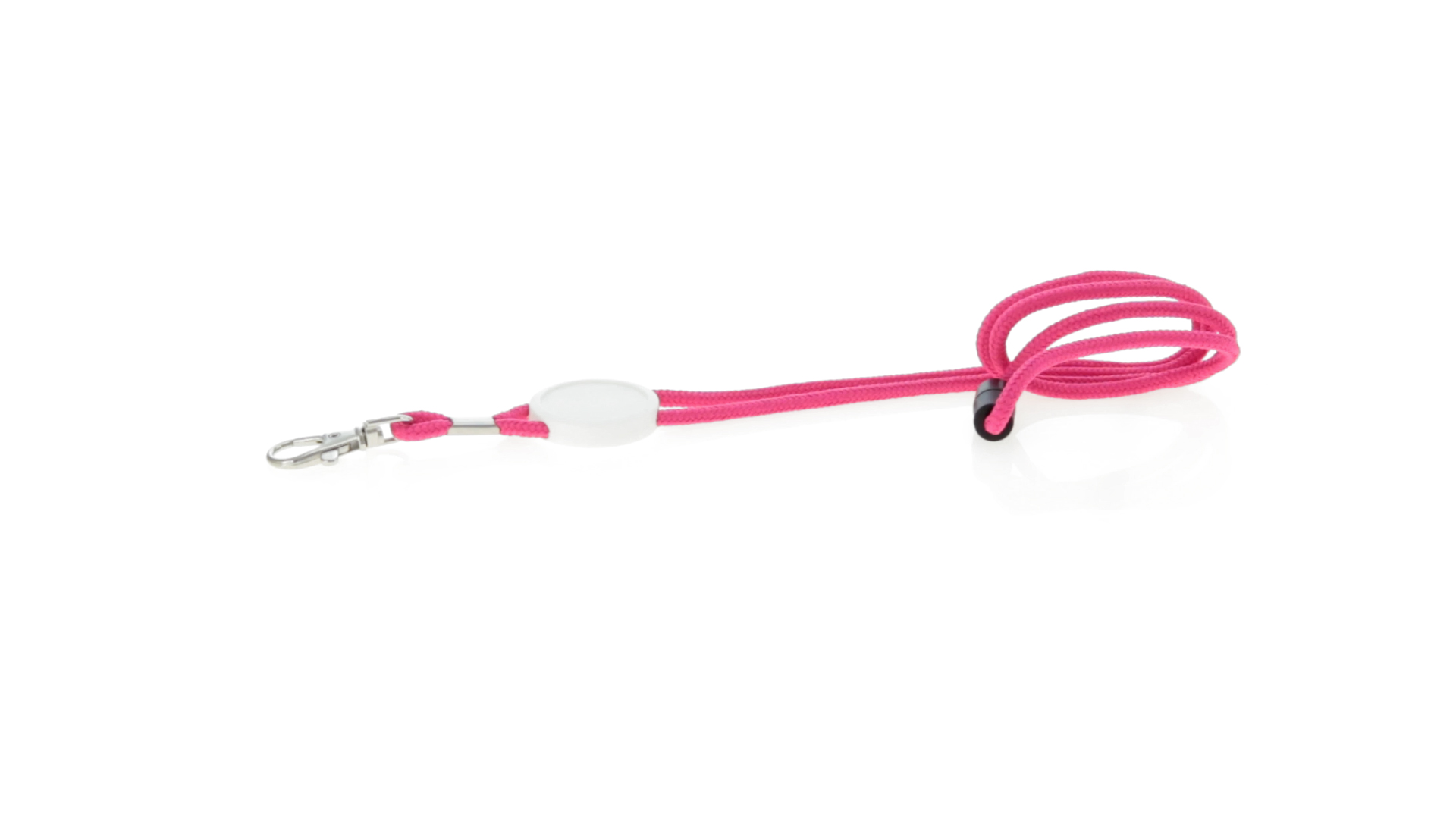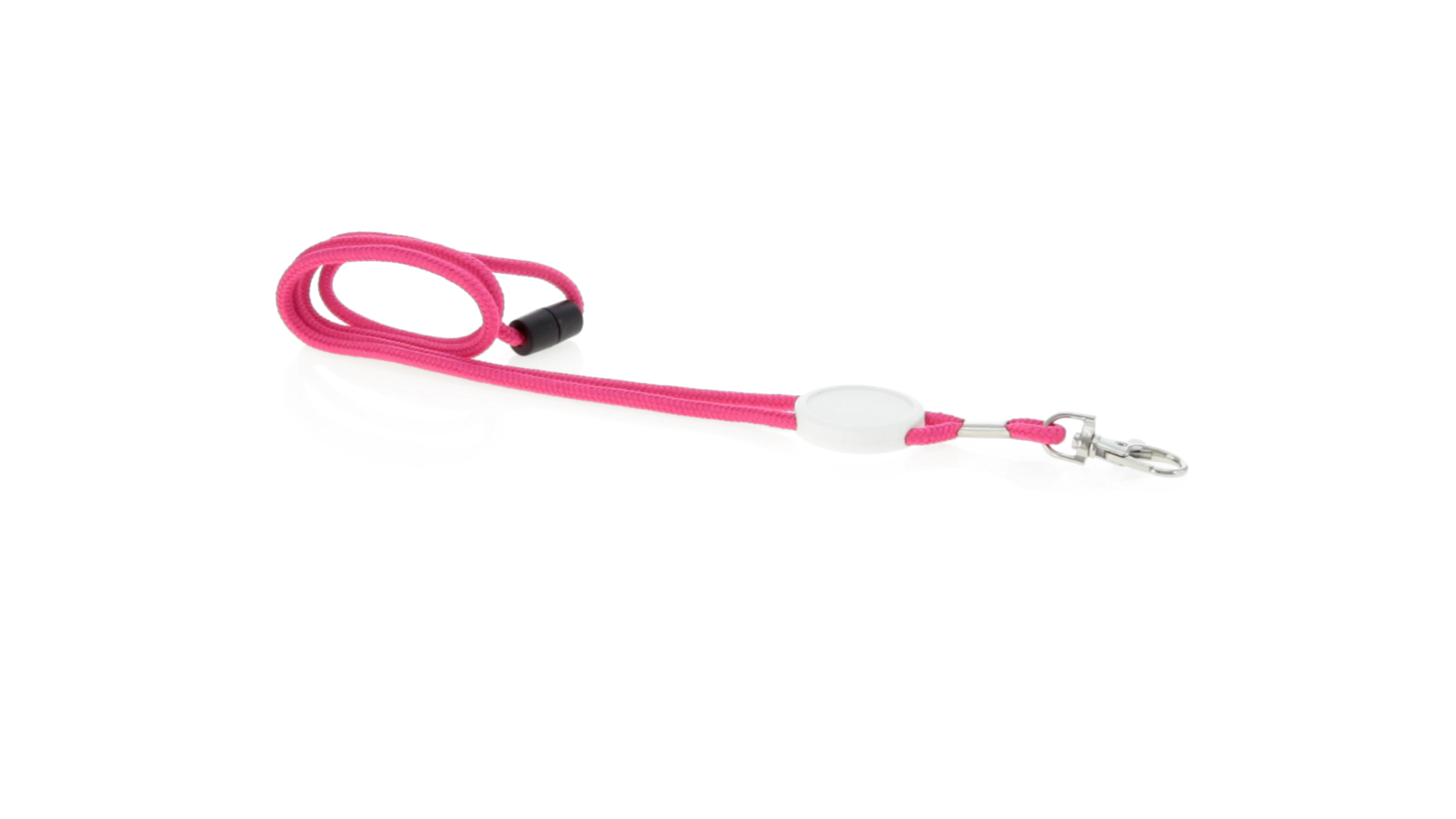 Lanyard mit robuster Kordel aus weichem Polyester in verschiedenen lebendigen Farben. Mit Klickverschluss am Nacken, Befestigungskarabiner aus Metall und zentraler Fläche zum Bedrucken.