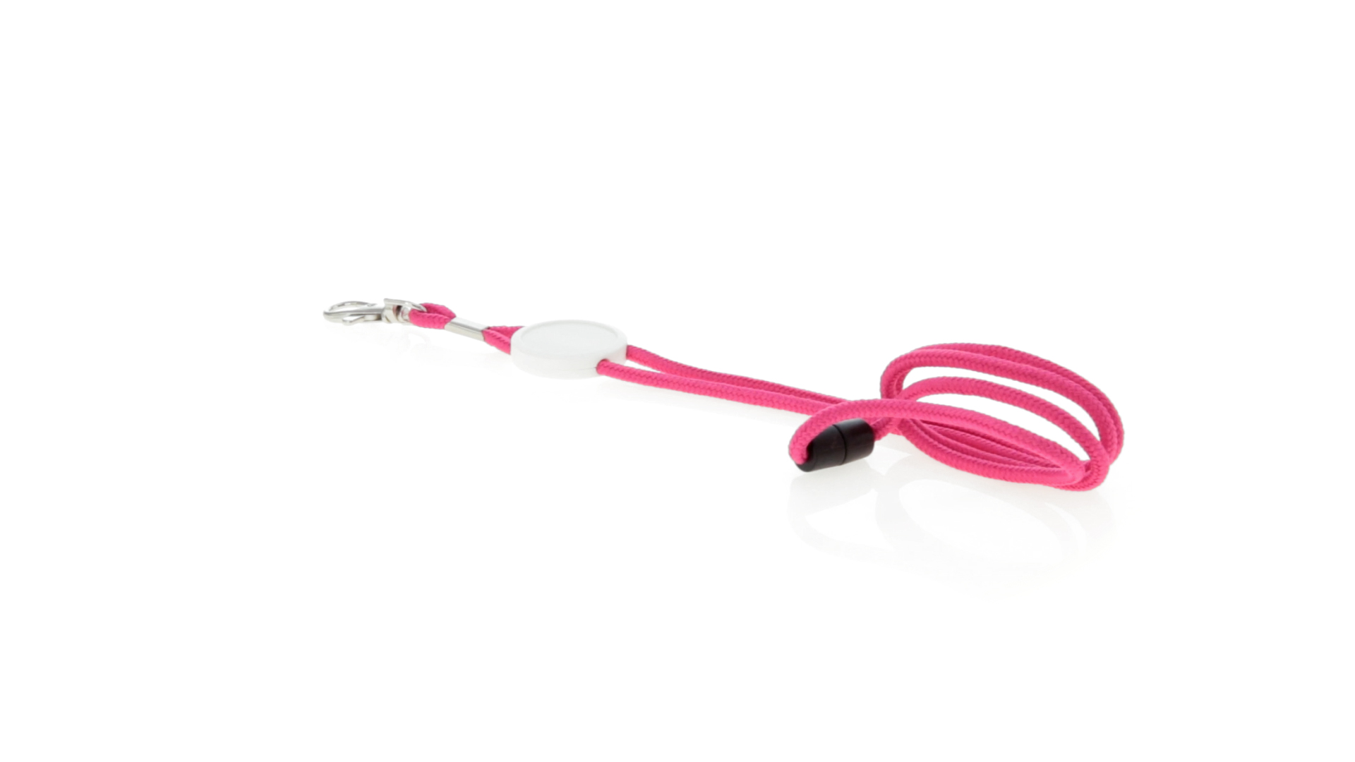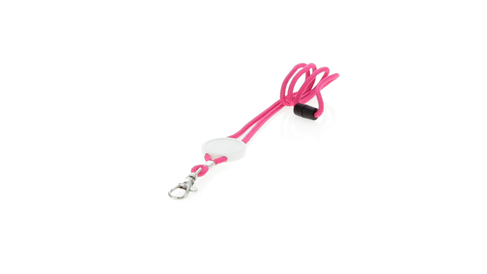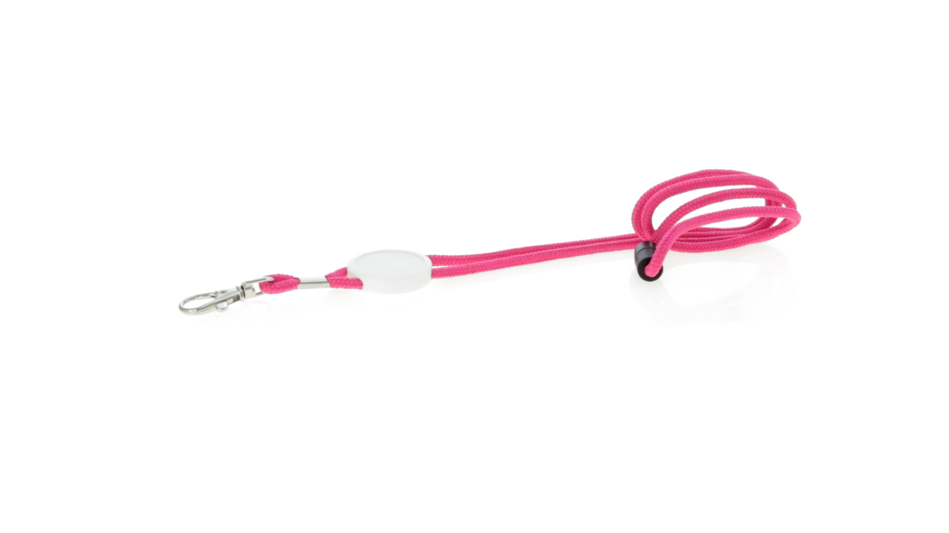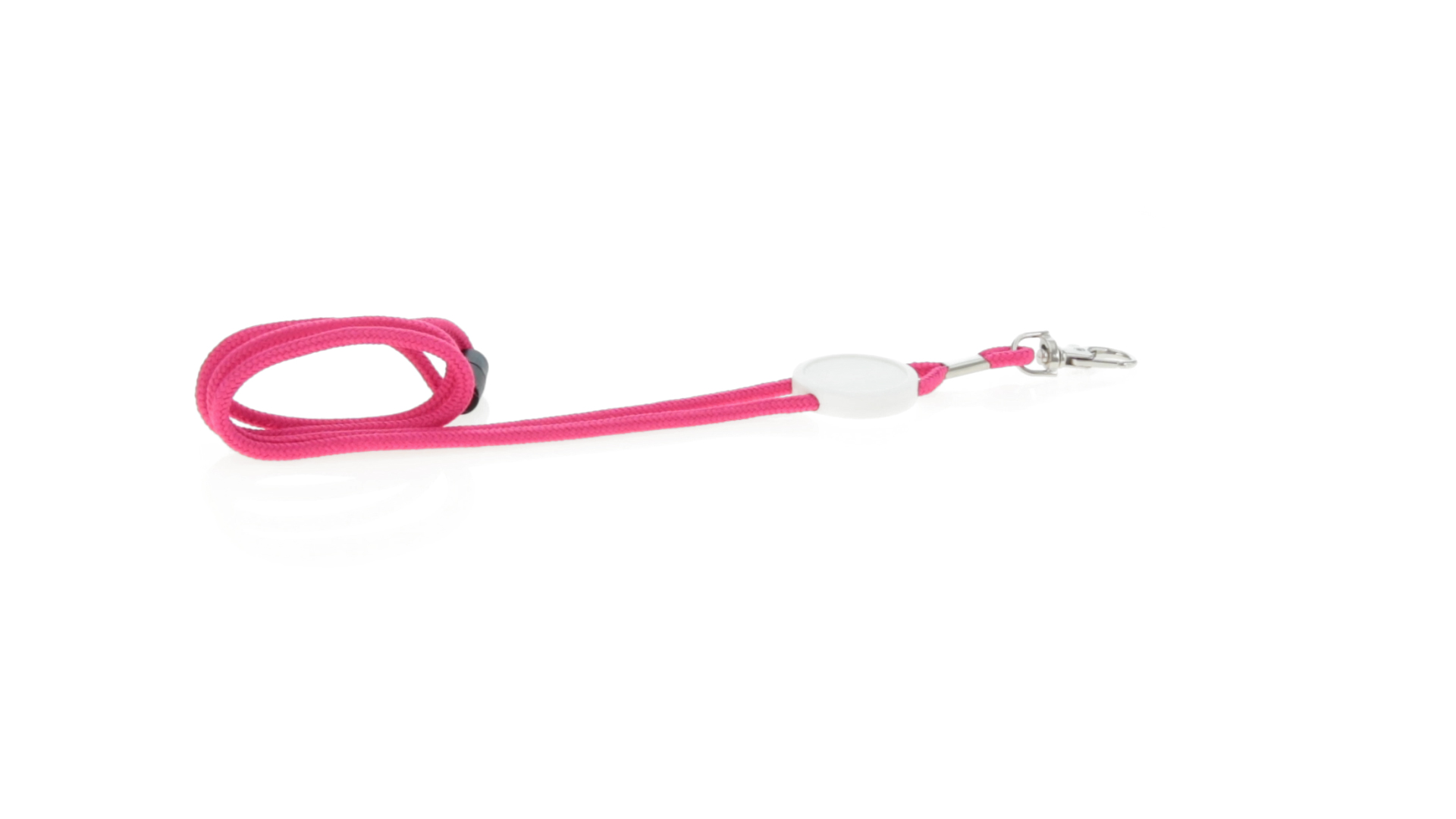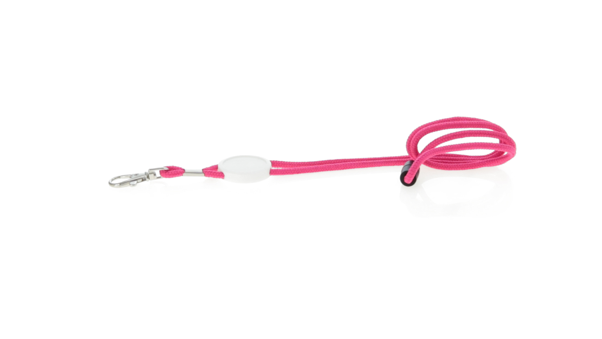 Lanyard mit robuster Kordel aus weichem Polyester in verschiedenen lebendigen Farben. Mit Klickverschluss am Nacken, Befestigungskarabiner aus Metall und zentraler Fläche zum Bedrucken.