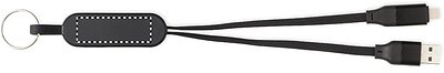 Schlüsselring mit Smartphone-Halter und 60W-Kabel. Gehäuse aus recyceltem ABS. Eingang: 2-in-1 Typ C und Typ A. Ausgang: Typ C und Mikro-B (2-in-1-Pin). Kabellänge: 26 cm.