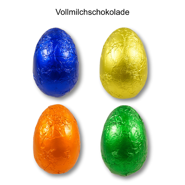 Du kannst zwischen den fröhlichen Farben Orange, Grün, Gelb und Blau wählen. So passt das Schoko Osterei perfekt zu Deinem Firmenauftritt oder zur gewünschten Osteraktion.