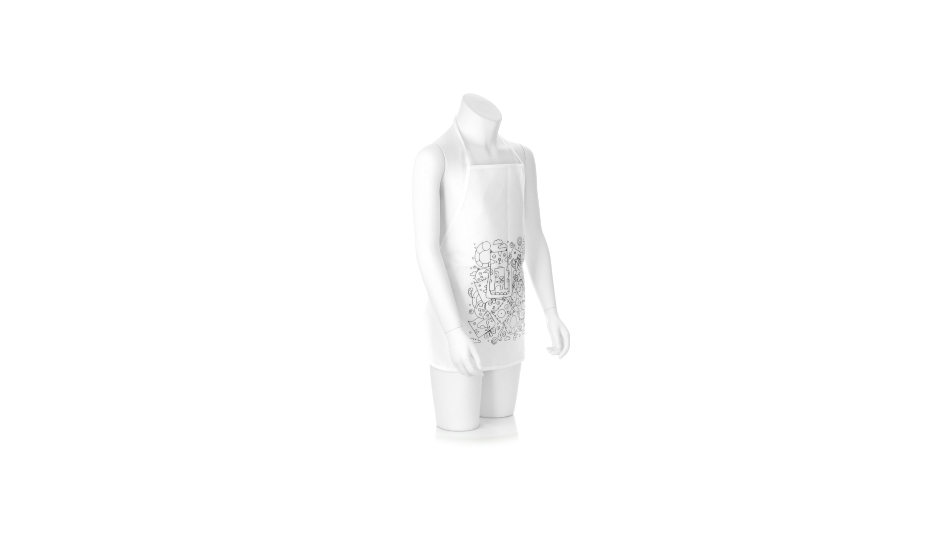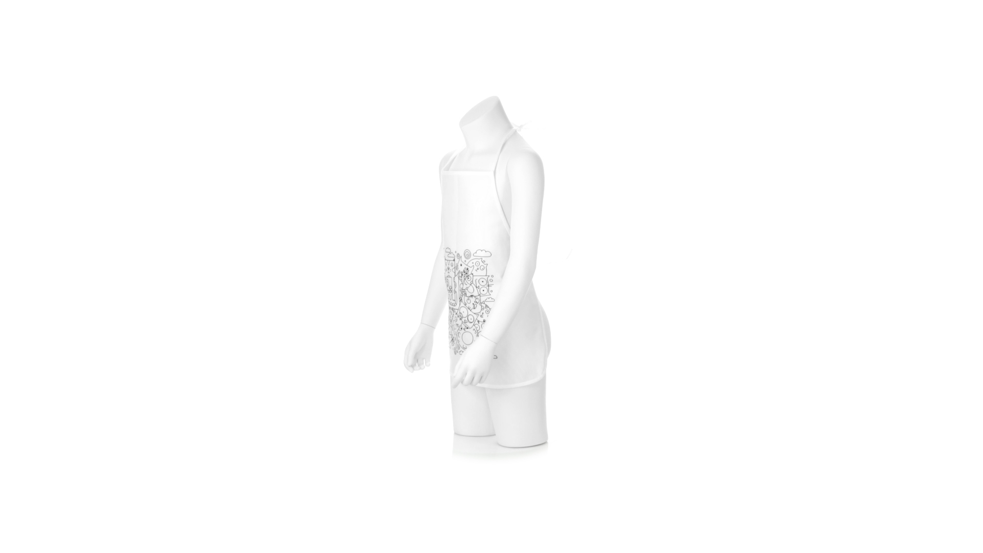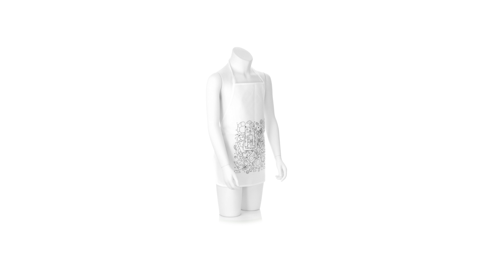 Non-Woven-Schürze in Weiss aus Faservlies. Speziell entwickelt für das Bemalen mit Filzstiften. Enthält 5 Filzstifte mit zylinderförmigem Gehäuse in verschiedenen Farben. Mit Bändern zum Verstellen an Nacken und Taille.
