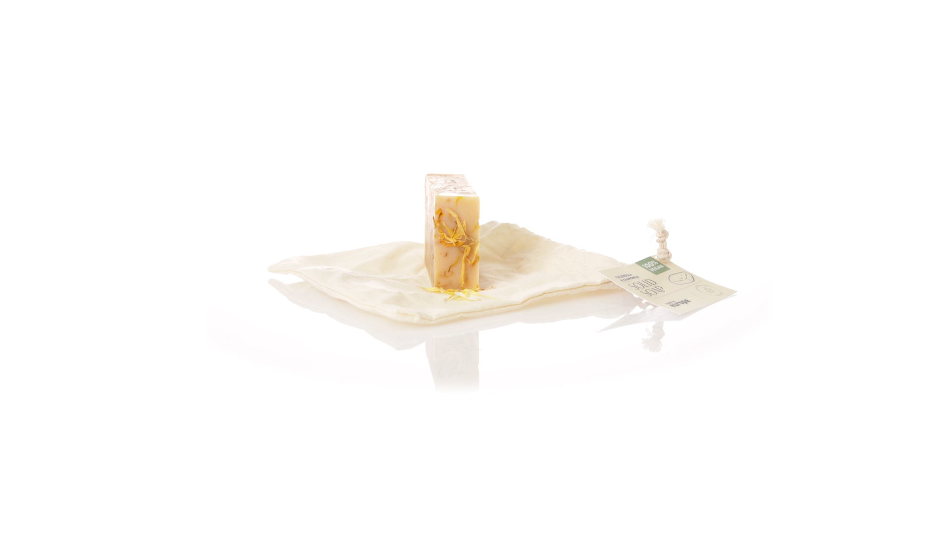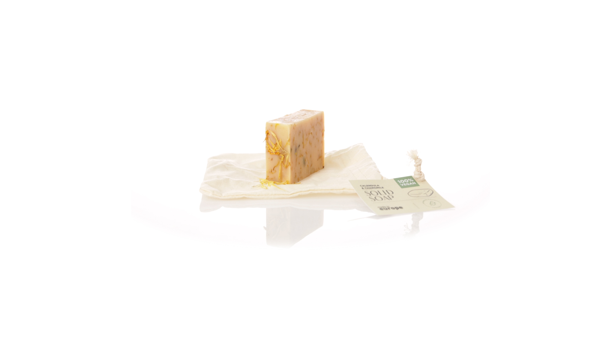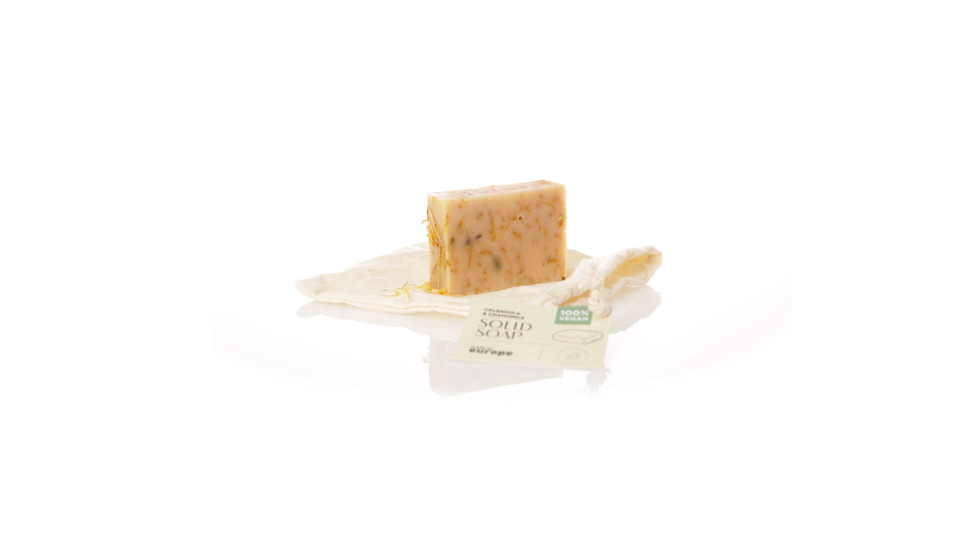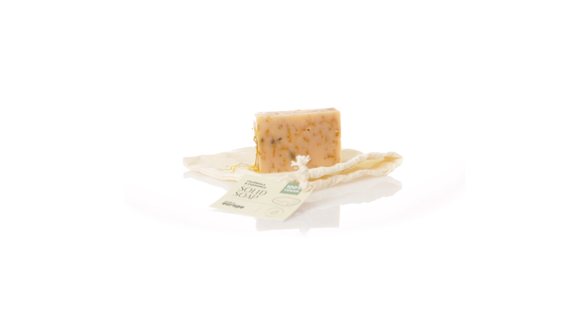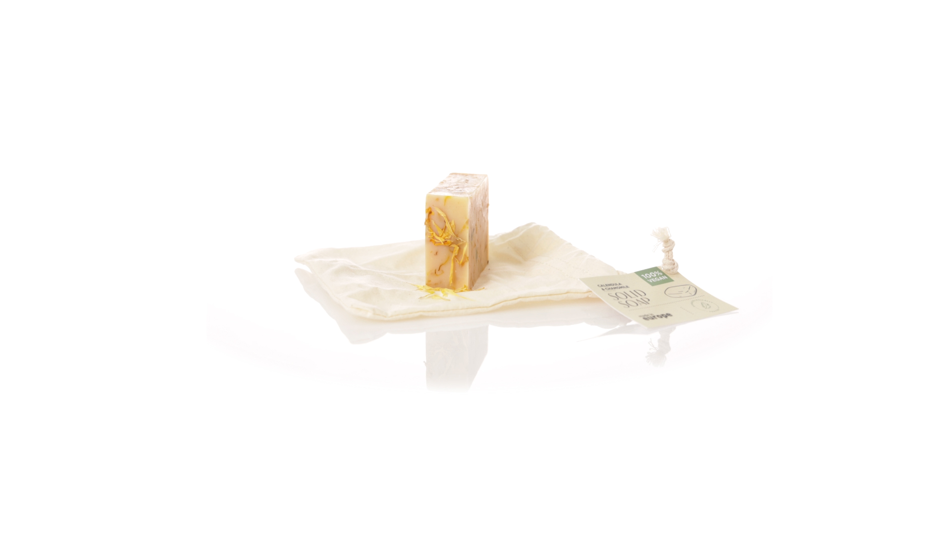 Veganes Seifenstück von 100 gr. Calendula und Kamillenduft mit beruhigenden, feuchtigkeitsspendenden und reparierenden Eigenschaften. Dermatologisch getestet und in Europa hergestellt. Präsentiert in einer individuellen Baumwolltasche mit Kordelzugverschluss und einem unverwechselbaren Etikett.Nachhaltiges und 100% veganes Produkt ohne tierische Inhaltsstoffe. Für diese Produkte wurden keine Tierversuche durchgeführt, um den Schutz und den Respekt für alle Tiere zu fördern.
