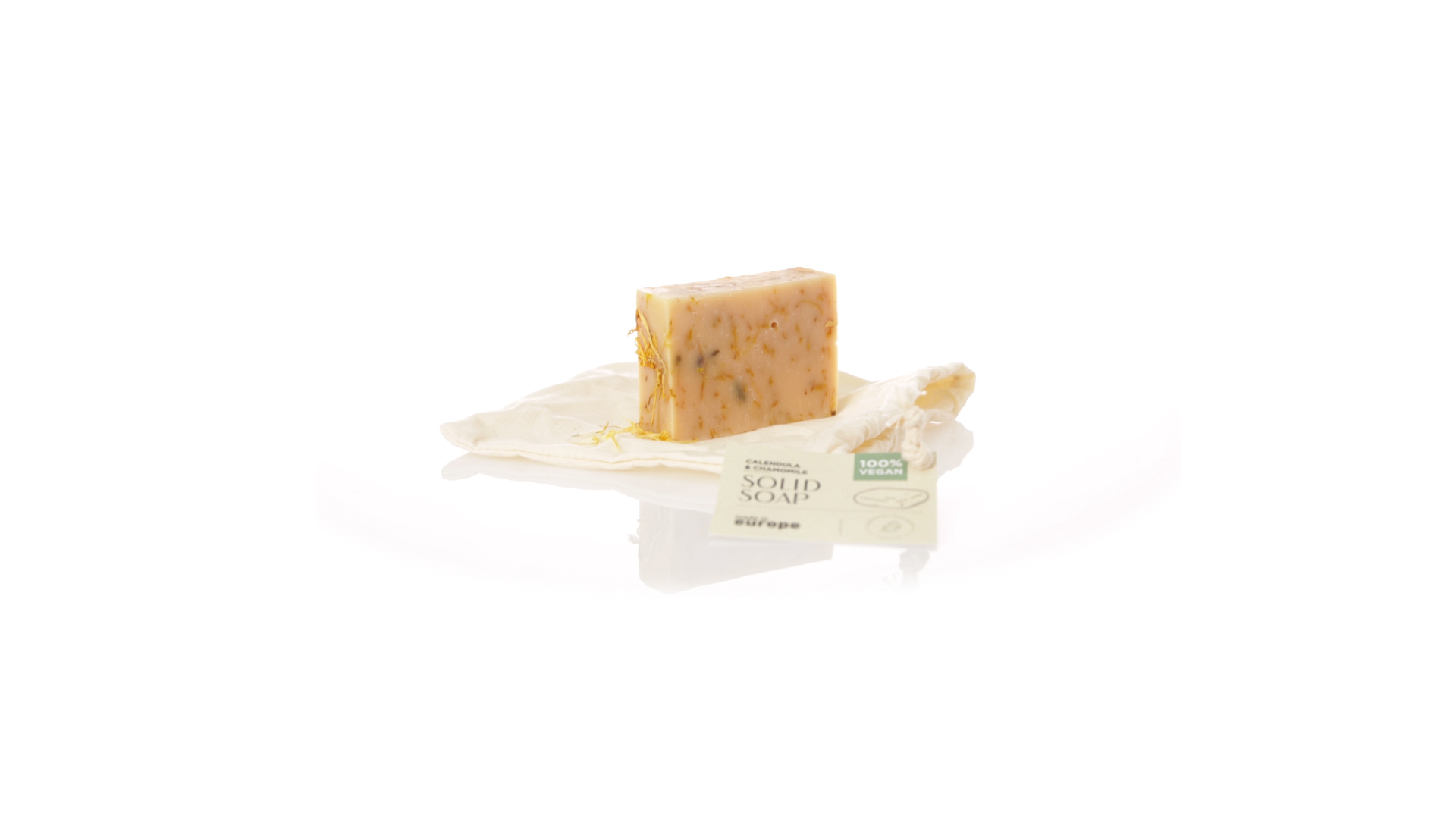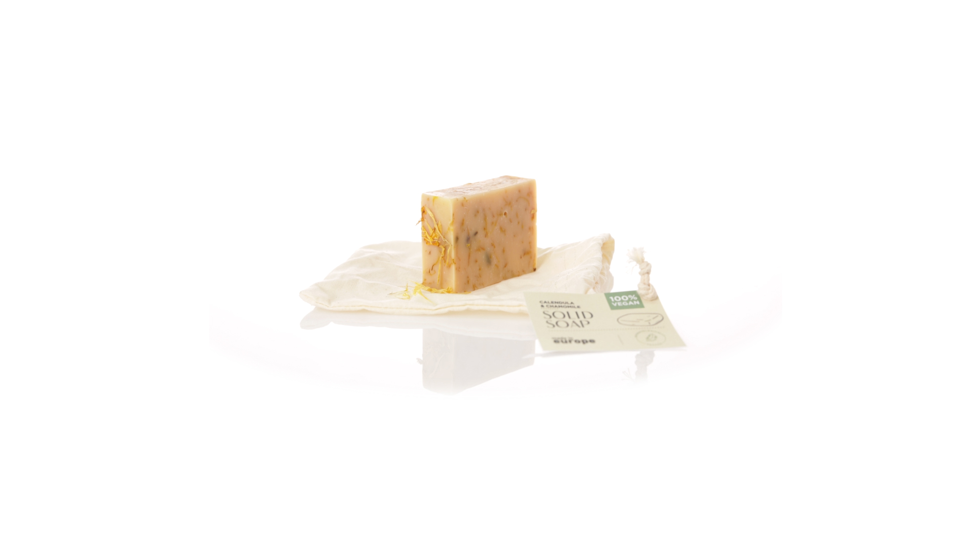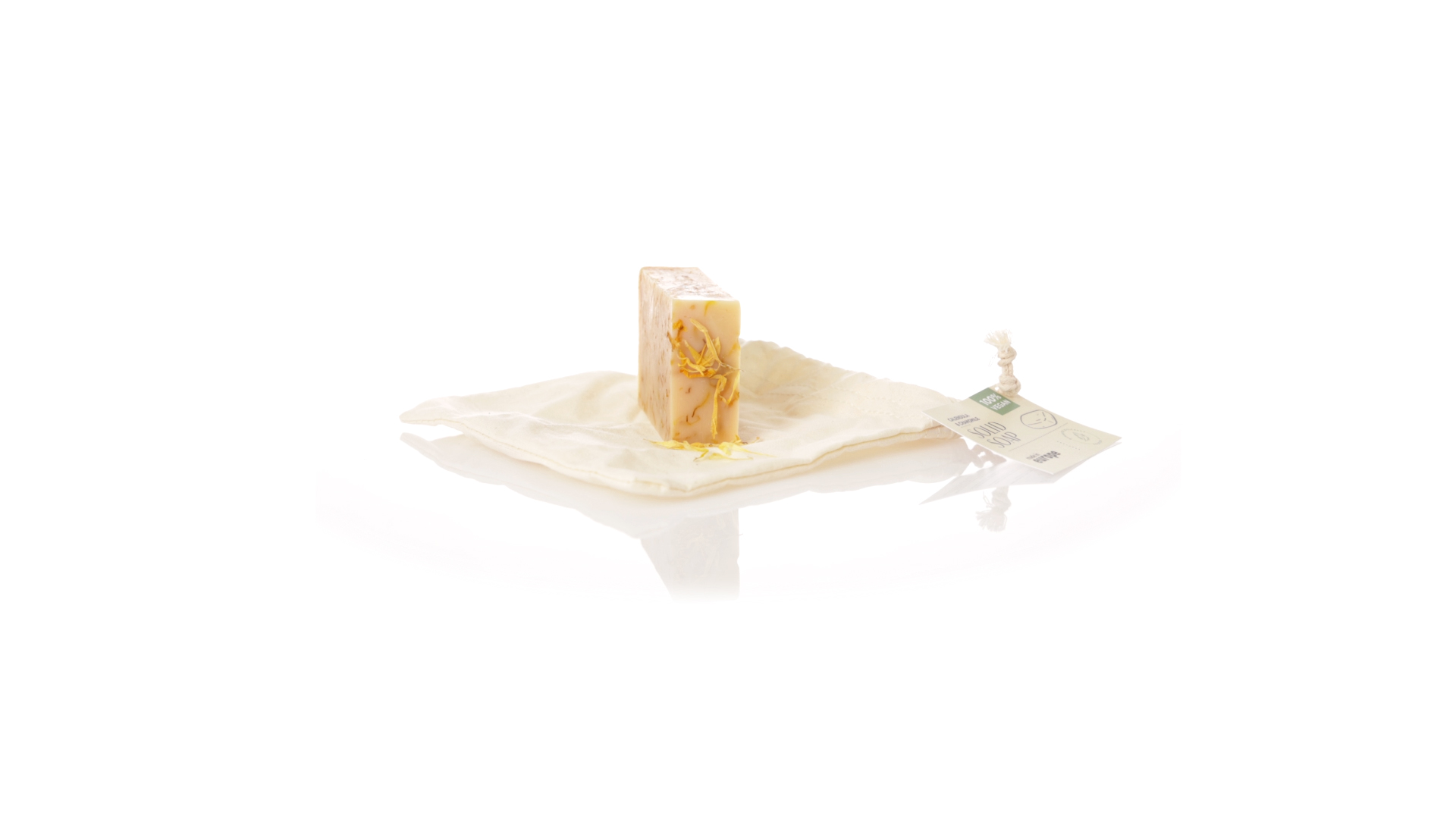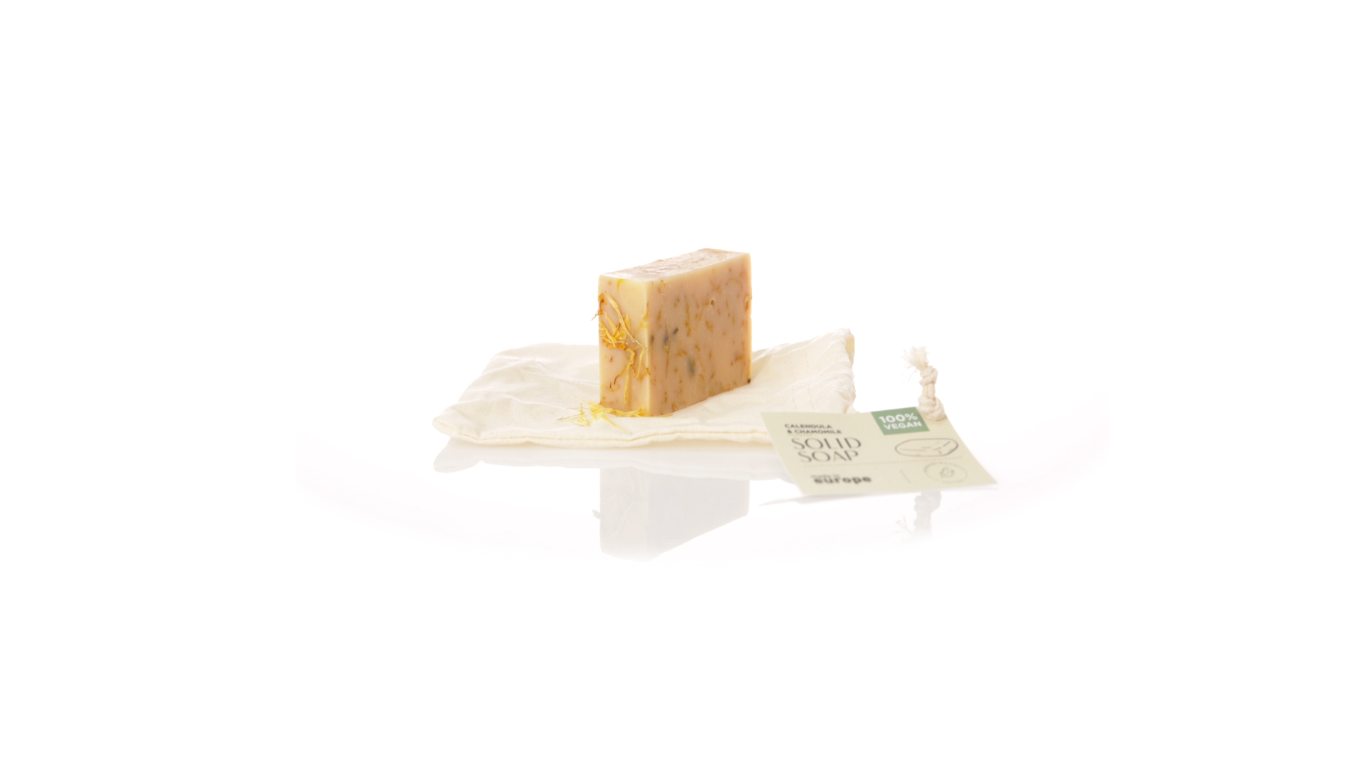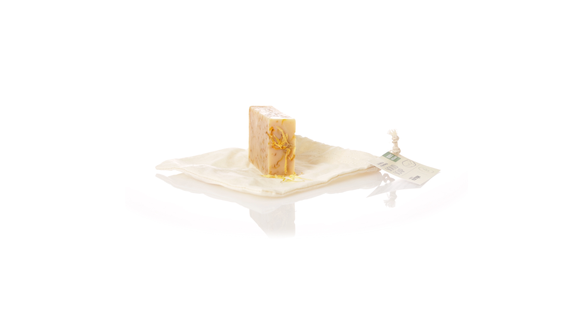 Veganes Seifenstück von 100 gr. Calendula und Kamillenduft mit beruhigenden, feuchtigkeitsspendenden und reparierenden Eigenschaften. Dermatologisch getestet und in Europa hergestellt. Präsentiert in einer individuellen Baumwolltasche mit Kordelzugverschluss und einem unverwechselbaren Etikett.Nachhaltiges und 100% veganes Produkt ohne tierische Inhaltsstoffe. Für diese Produkte wurden keine Tierversuche durchgeführt, um den Schutz und den Respekt für alle Tiere zu fördern.