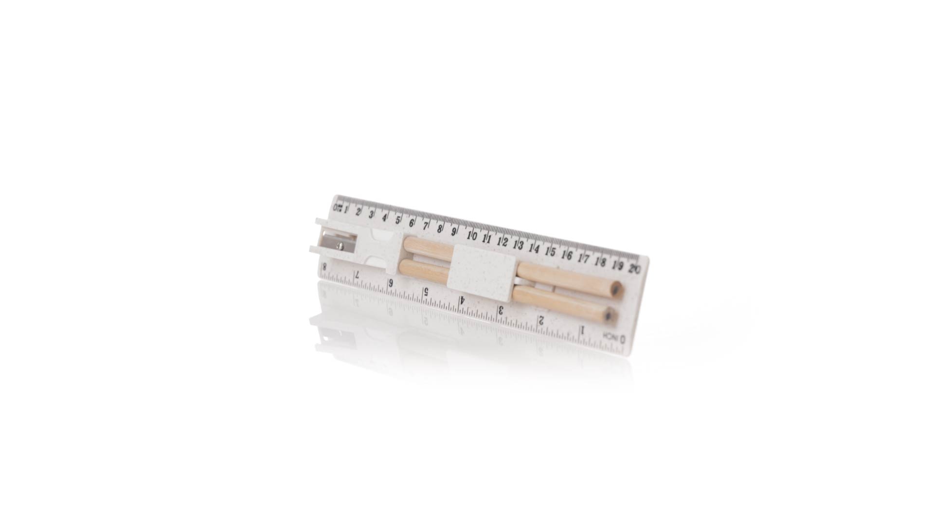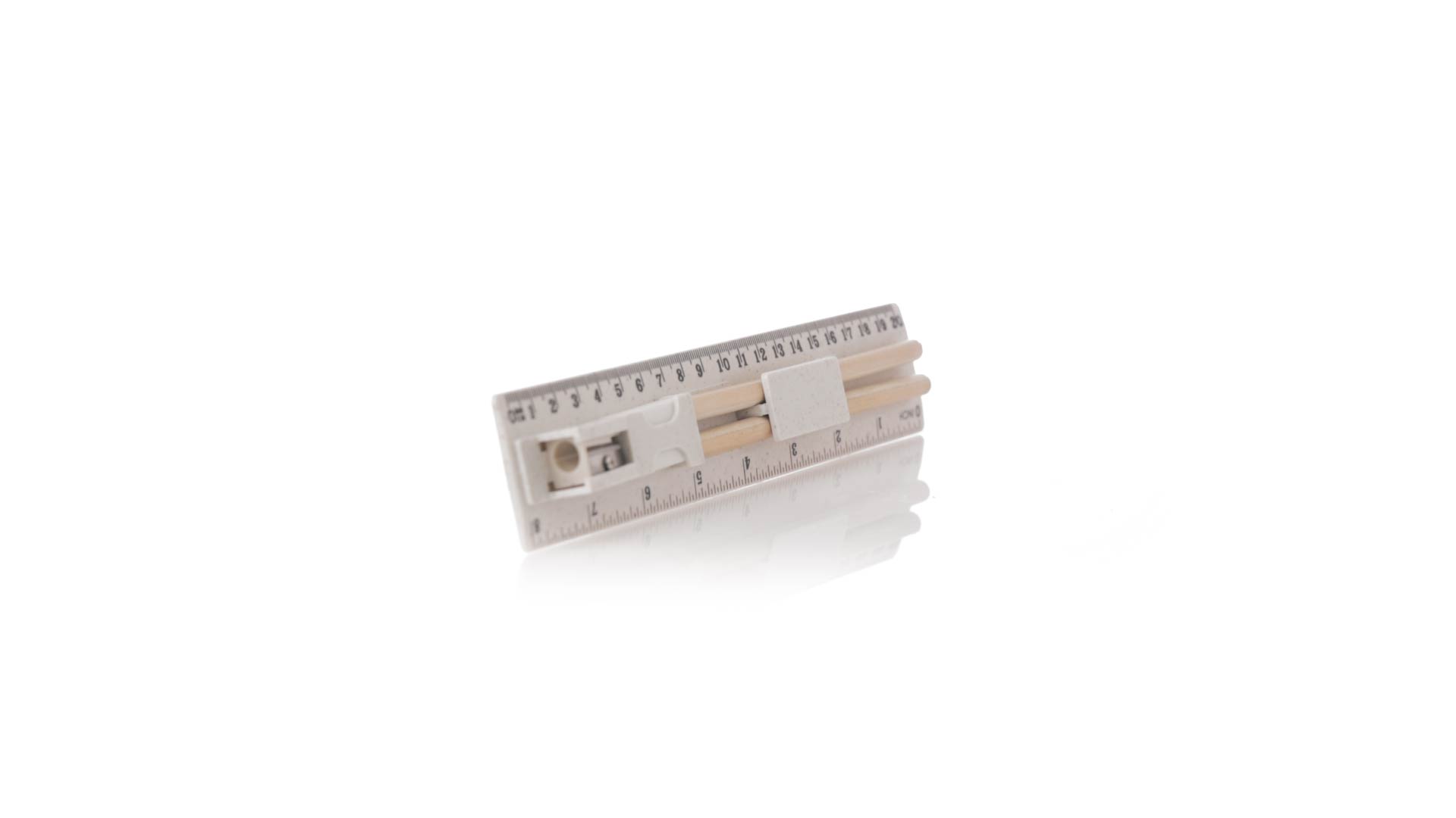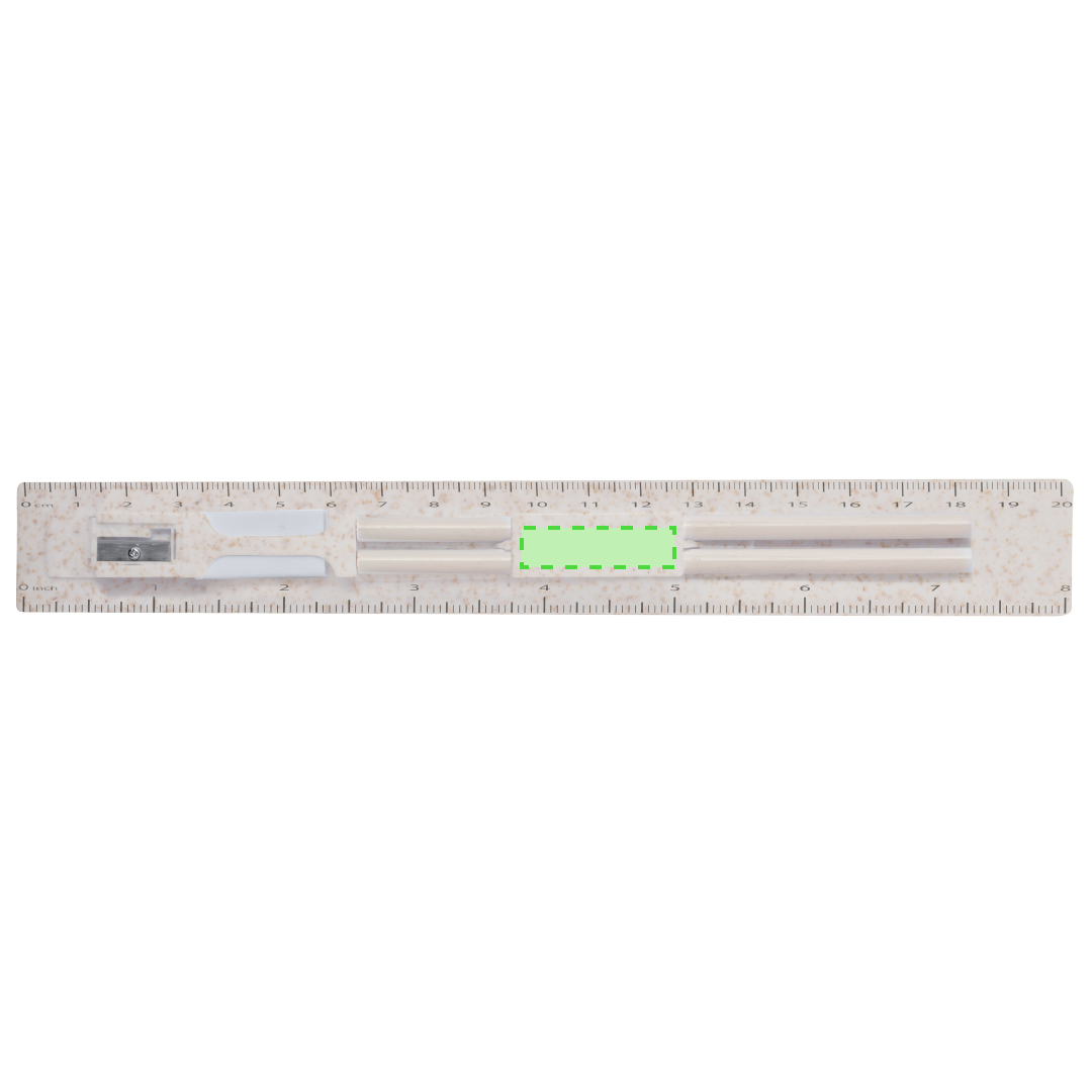 5-teiliges Set aus Weizenstroh. Inklusive 2 Holzstifte mit schwarzer Mine und weissem zylindrischen Körper; Radiergummi, und Spitzer. Präsentiert in einem Etui mit Lineal von 20 cm/8 Zoll, mit Fächern für die verschiedenen Elemente des Sets. Einzeln verpackt in einer weissen Papiertüte.Weizenstroh fördert die Verwendung von natürlichen Rohstoffen und reduziert so den Schadstoffausstoss.