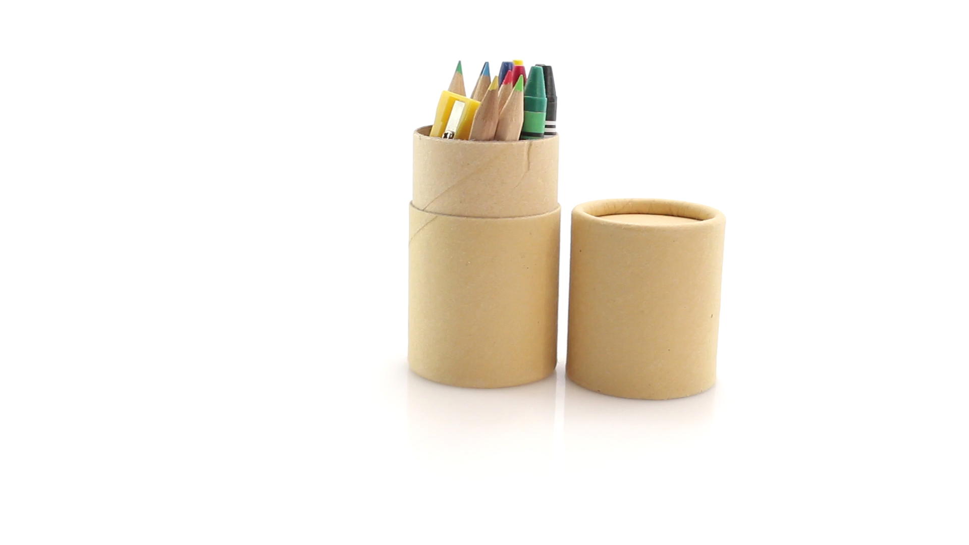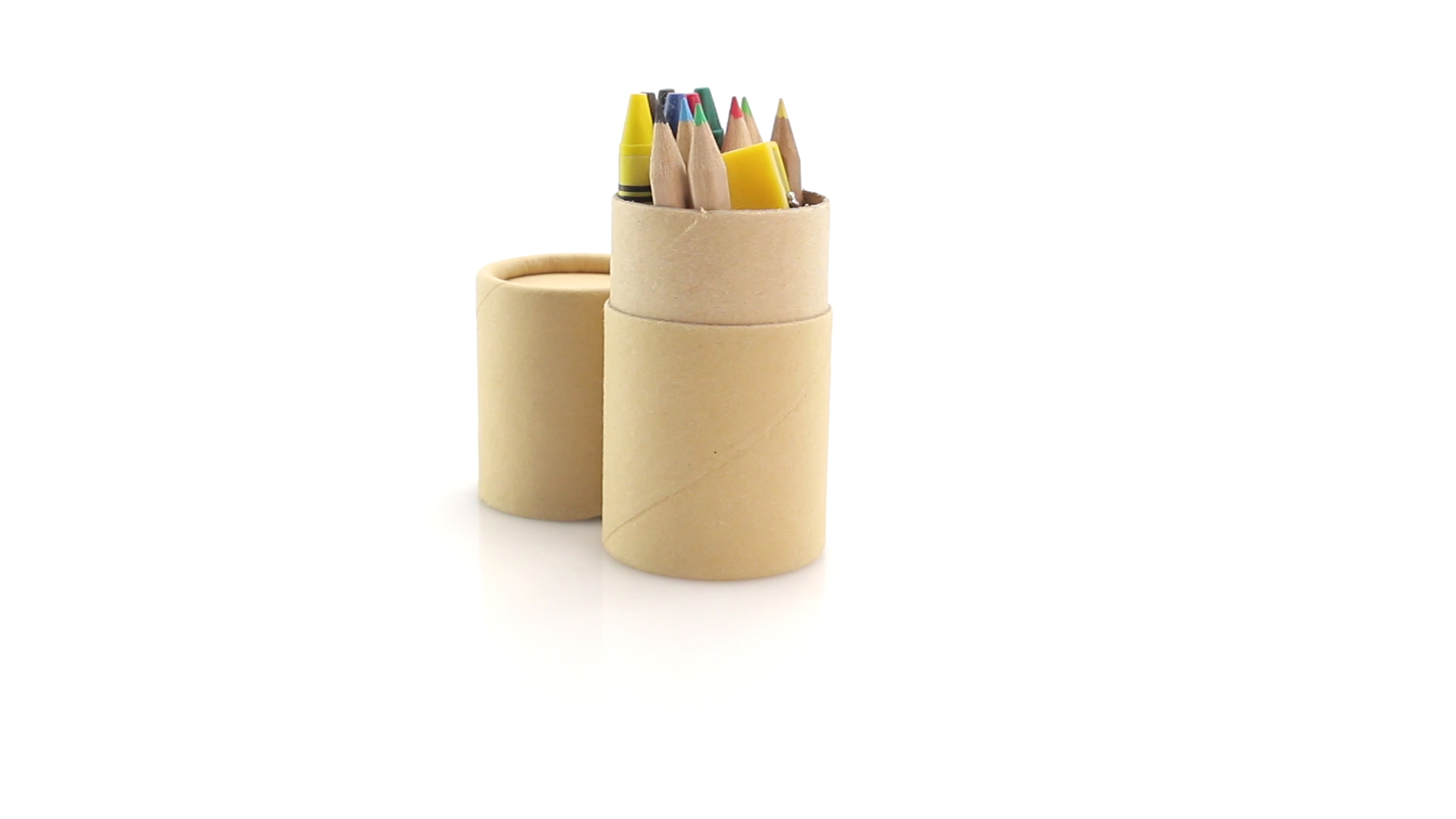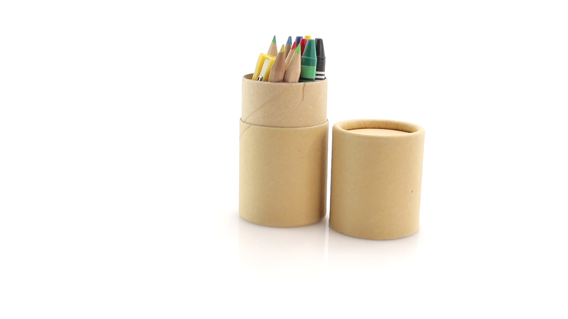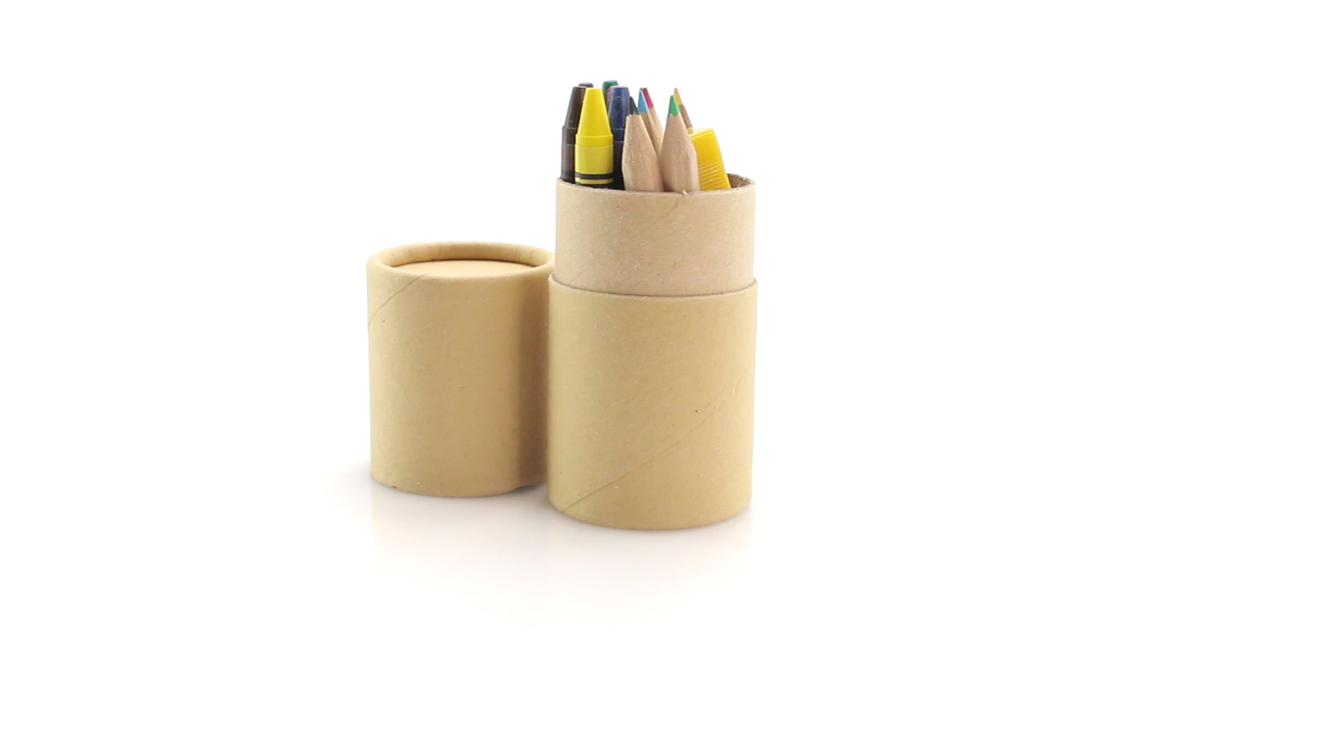 13-teiliges Set in zylinderförmigem Etui aus Naturkarton. Beinhaltet 6 hölzerne Buntstifte mit sechseckigem Körper in Naturfarbe und Minen in verschiedenen Farben sowie Anspitzer in Gelb und 6 zylinderförmige Wachsmalstifte in verschiedenen lebendigen Farben.