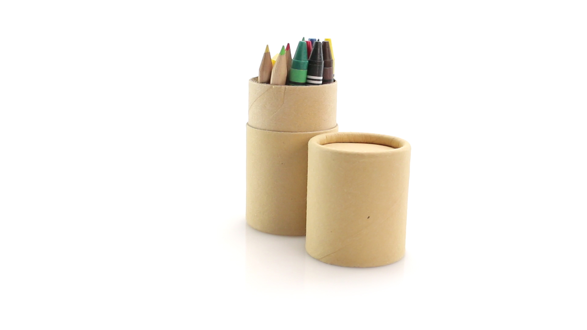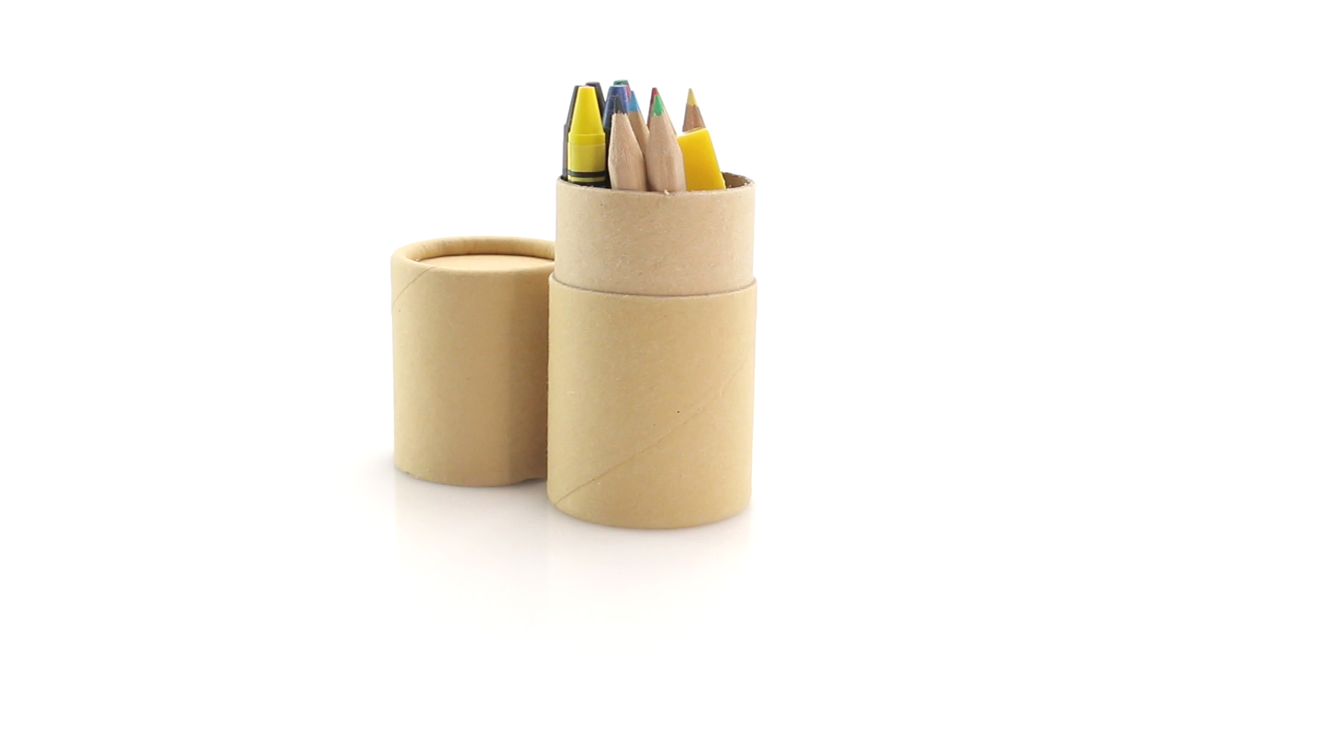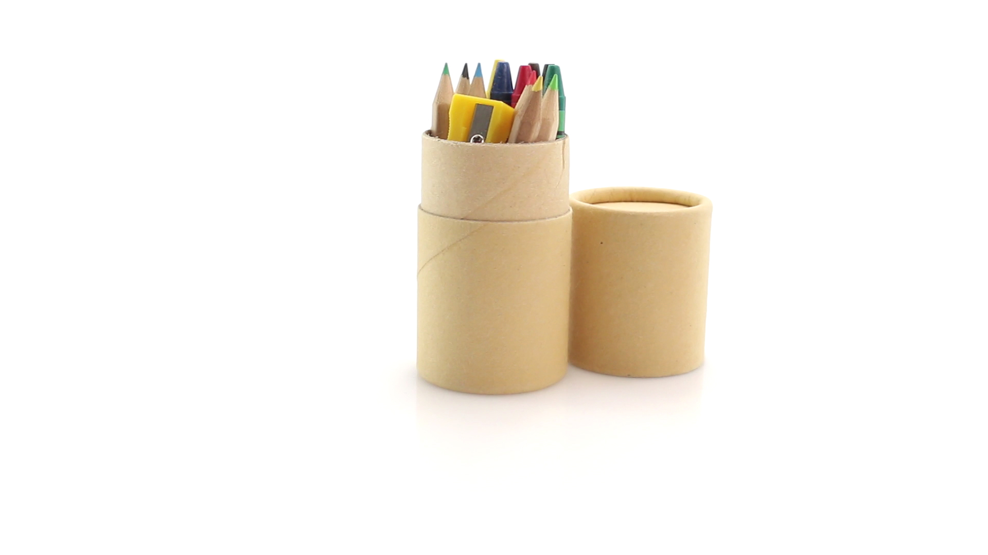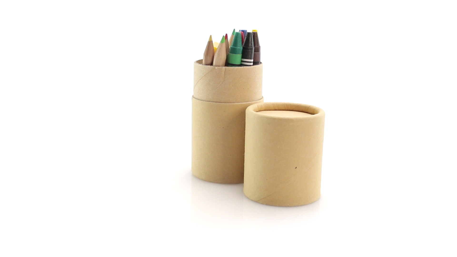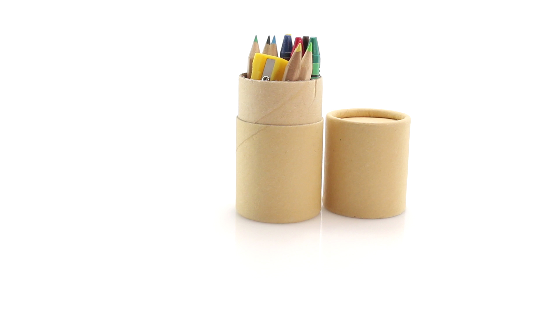 13-teiliges Set in zylinderförmigem Etui aus Naturkarton. Beinhaltet 6 hölzerne Buntstifte mit sechseckigem Körper in Naturfarbe und Minen in verschiedenen Farben sowie Anspitzer in Gelb und 6 zylinderförmige Wachsmalstifte in verschiedenen lebendigen Farben.