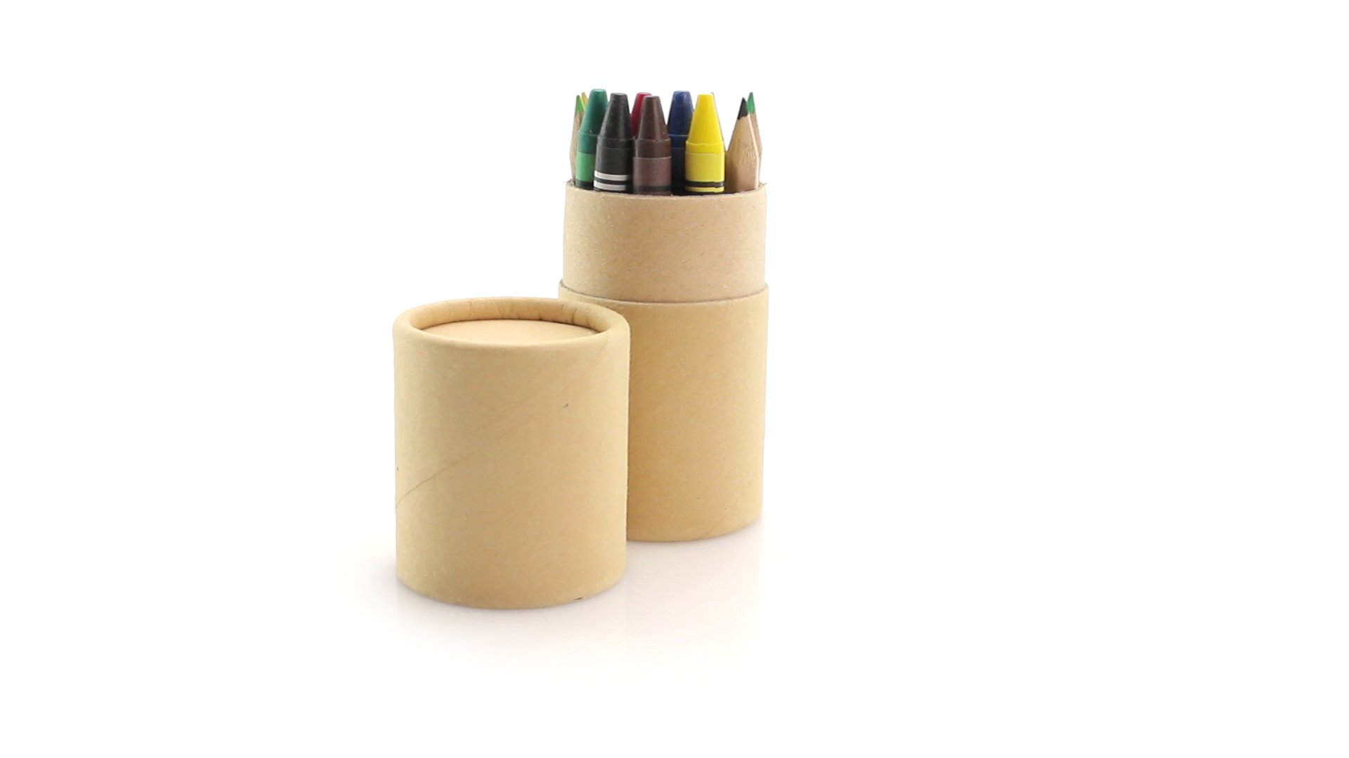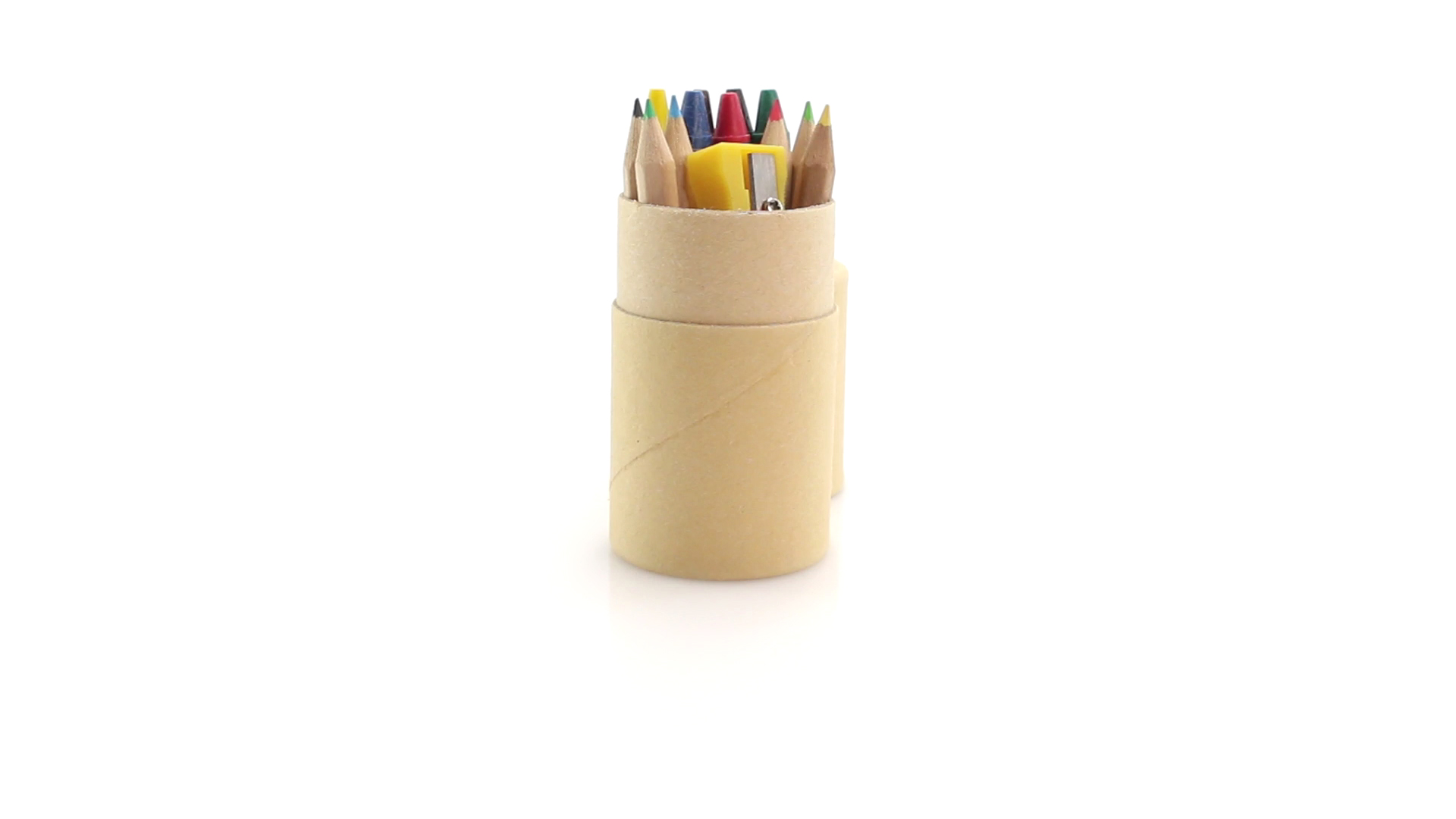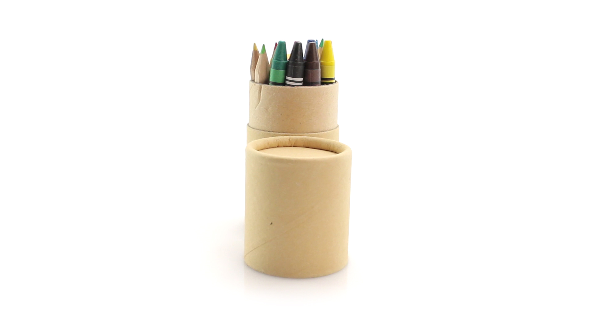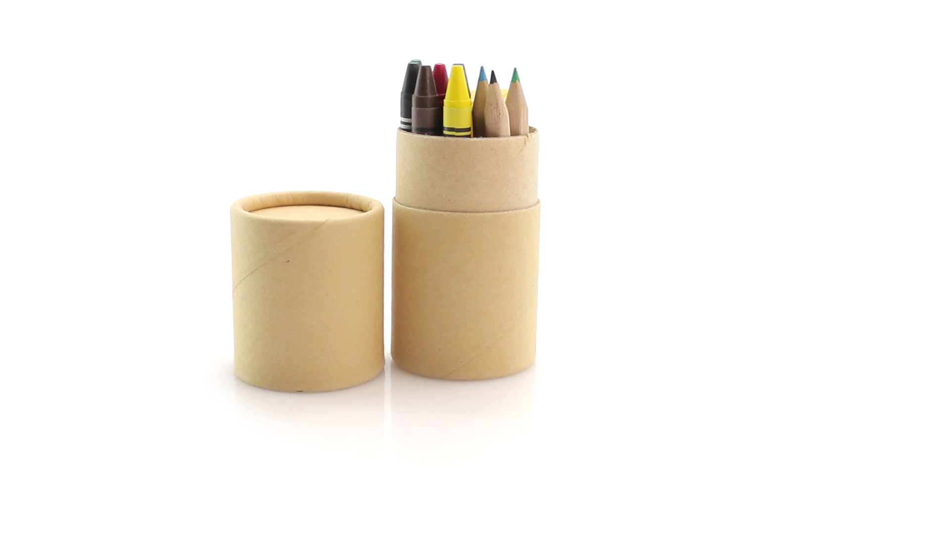 13-teiliges Set in zylinderförmigem Etui aus Naturkarton. Beinhaltet 6 hölzerne Buntstifte mit sechseckigem Körper in Naturfarbe und Minen in verschiedenen Farben sowie Anspitzer in Gelb und 6 zylinderförmige Wachsmalstifte in verschiedenen lebendigen Farben.