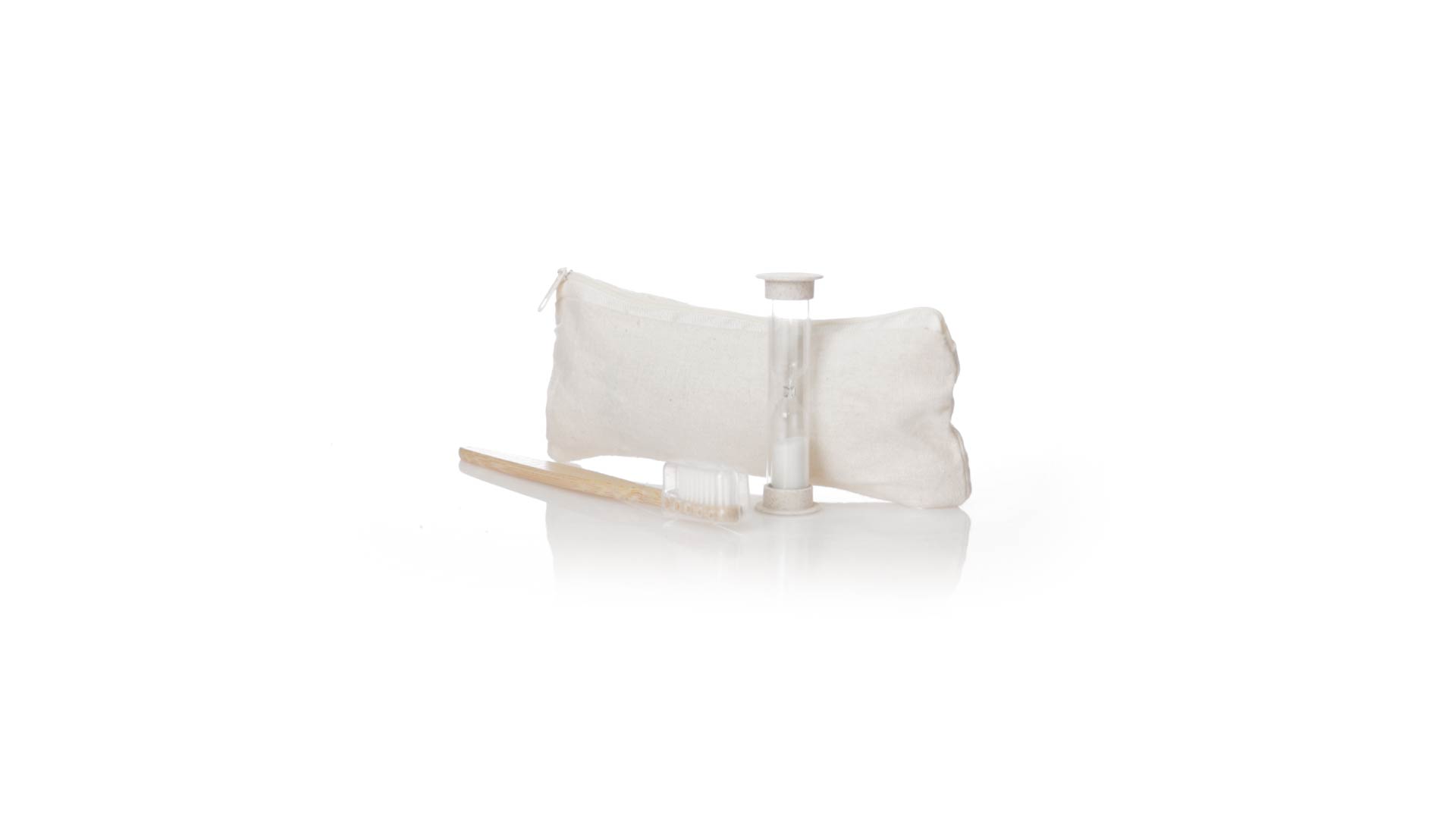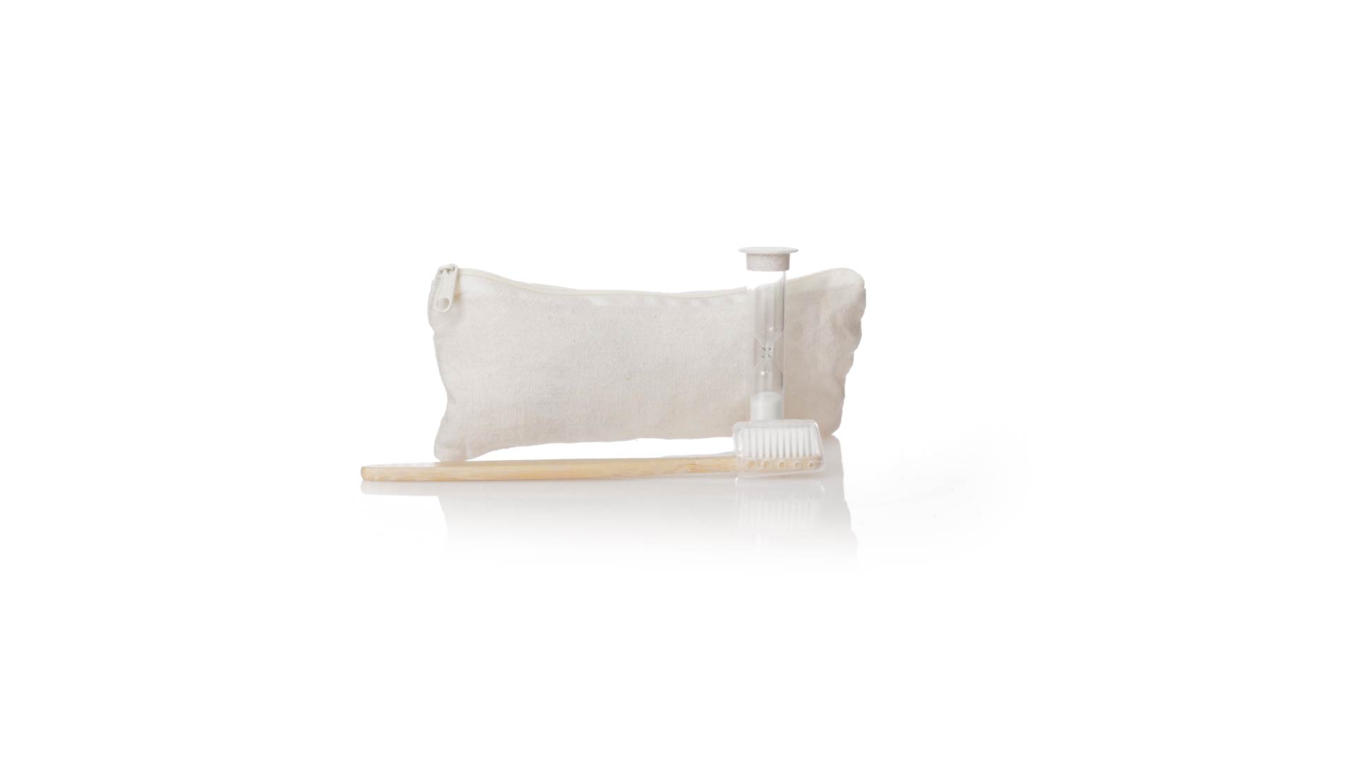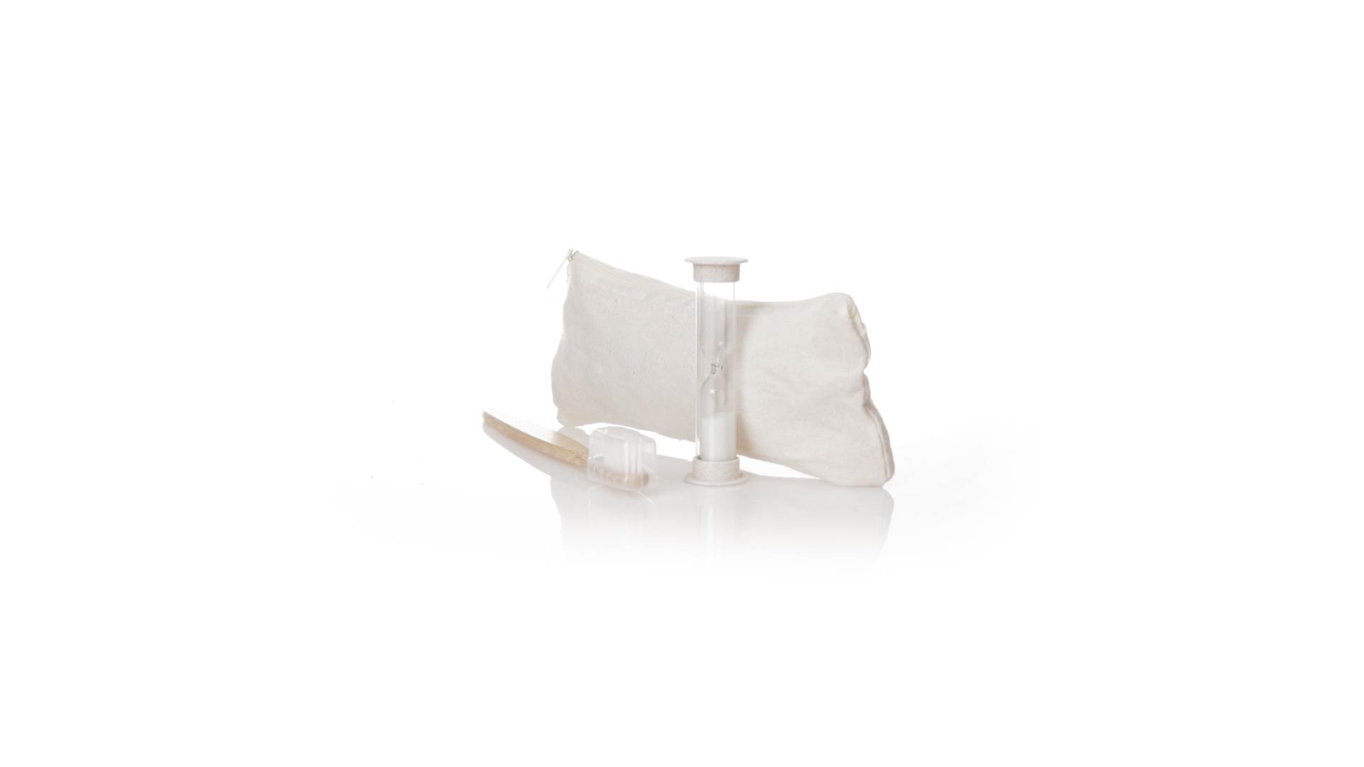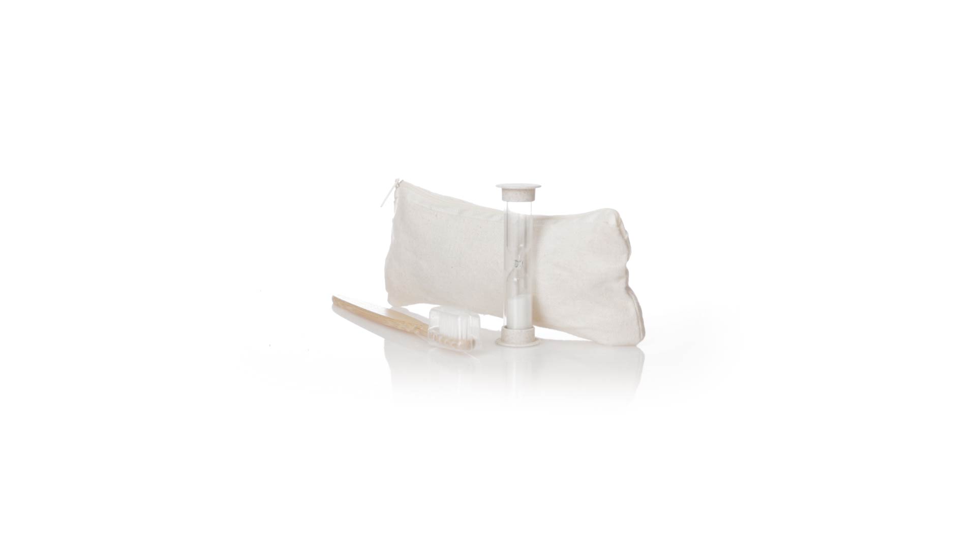 Zahnbürsten- und Sanduhr-Set aus Bambus und Weizenstroh. Inklusive Zahnbürste mit ergonomischem Griff aus weichem Bambus, mit Schutzhaube. Ausserdem inklusive einer 2-Minuten-Sanduhr aus Weizenstroh. Präsentiert in einem praktischen Etui aus atmungsaktiver Baumwolle.