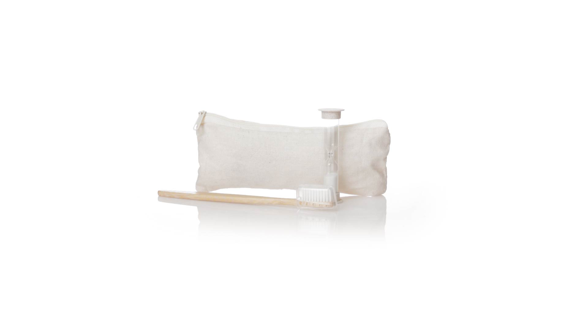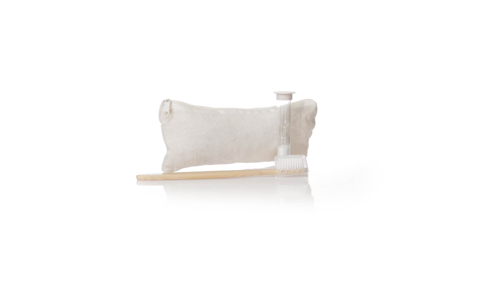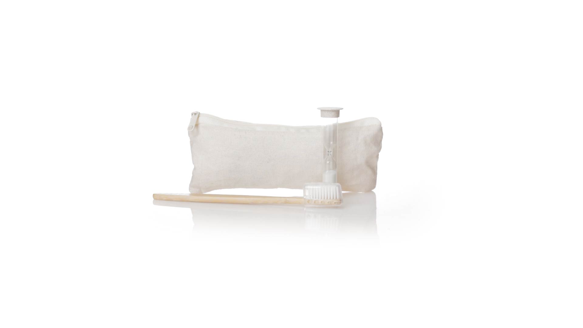 Zahnbürsten- und Sanduhr-Set aus Bambus und Weizenstroh. Inklusive Zahnbürste mit ergonomischem Griff aus weichem Bambus, mit Schutzhaube. Ausserdem inklusive einer 2-Minuten-Sanduhr aus Weizenstroh. Präsentiert in einem praktischen Etui aus atmungsaktiver Baumwolle.