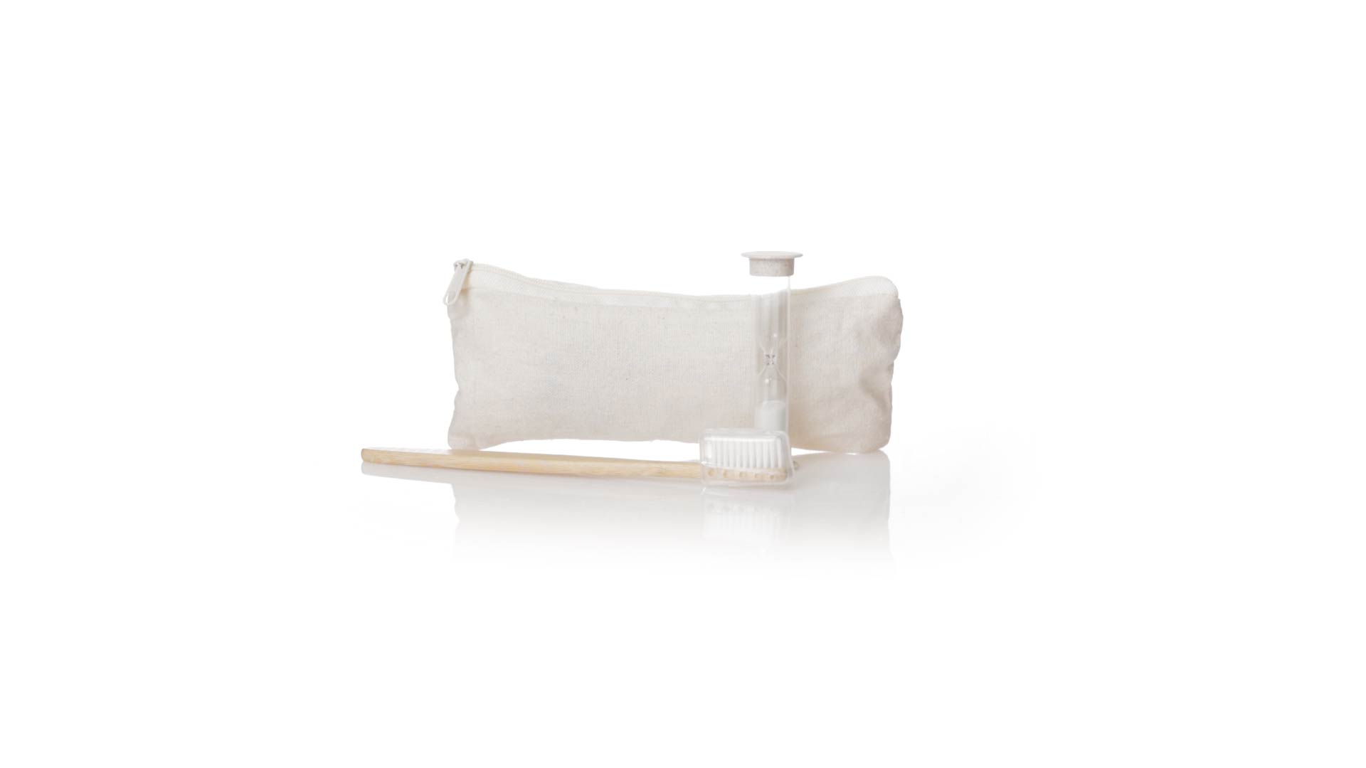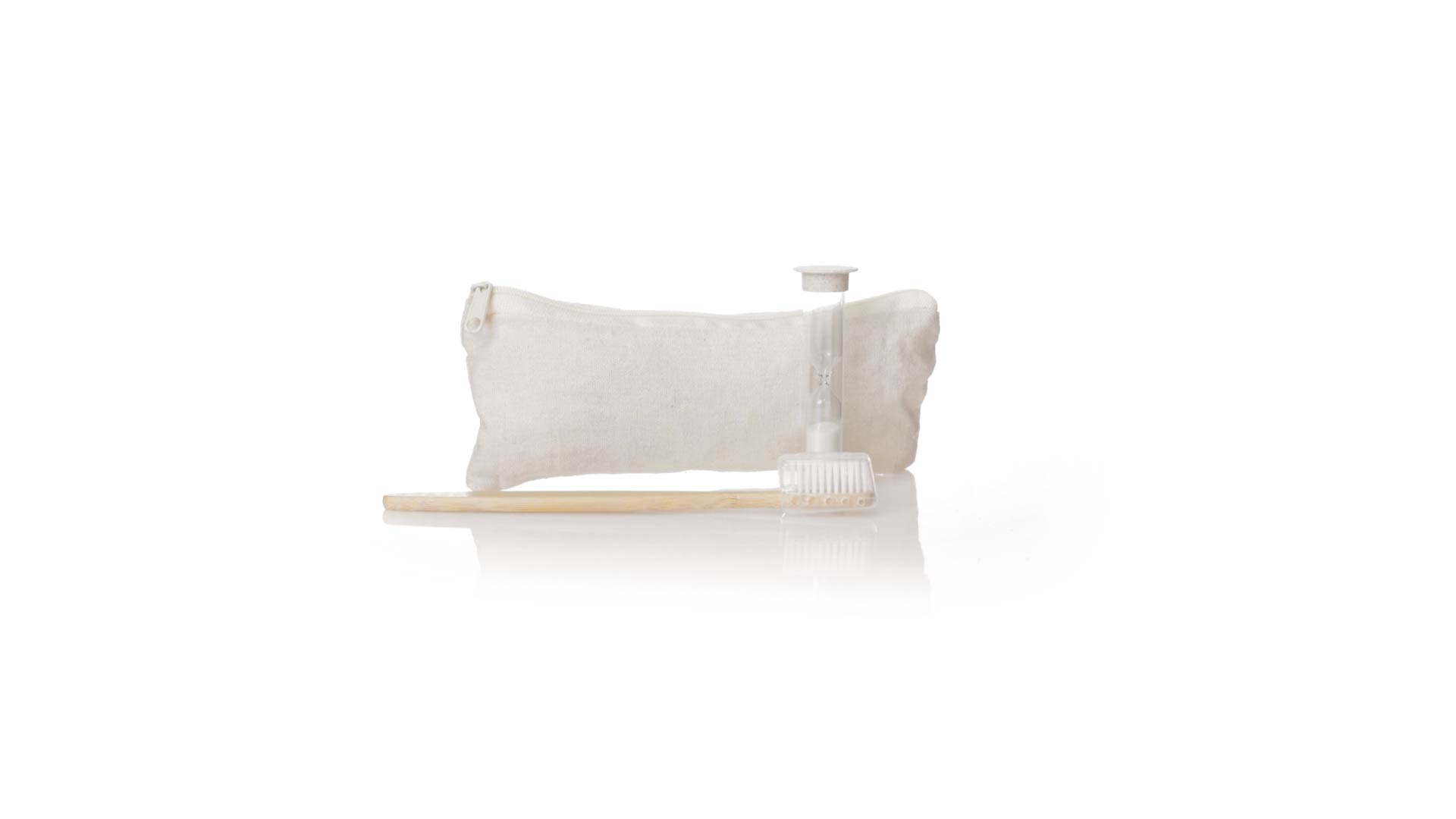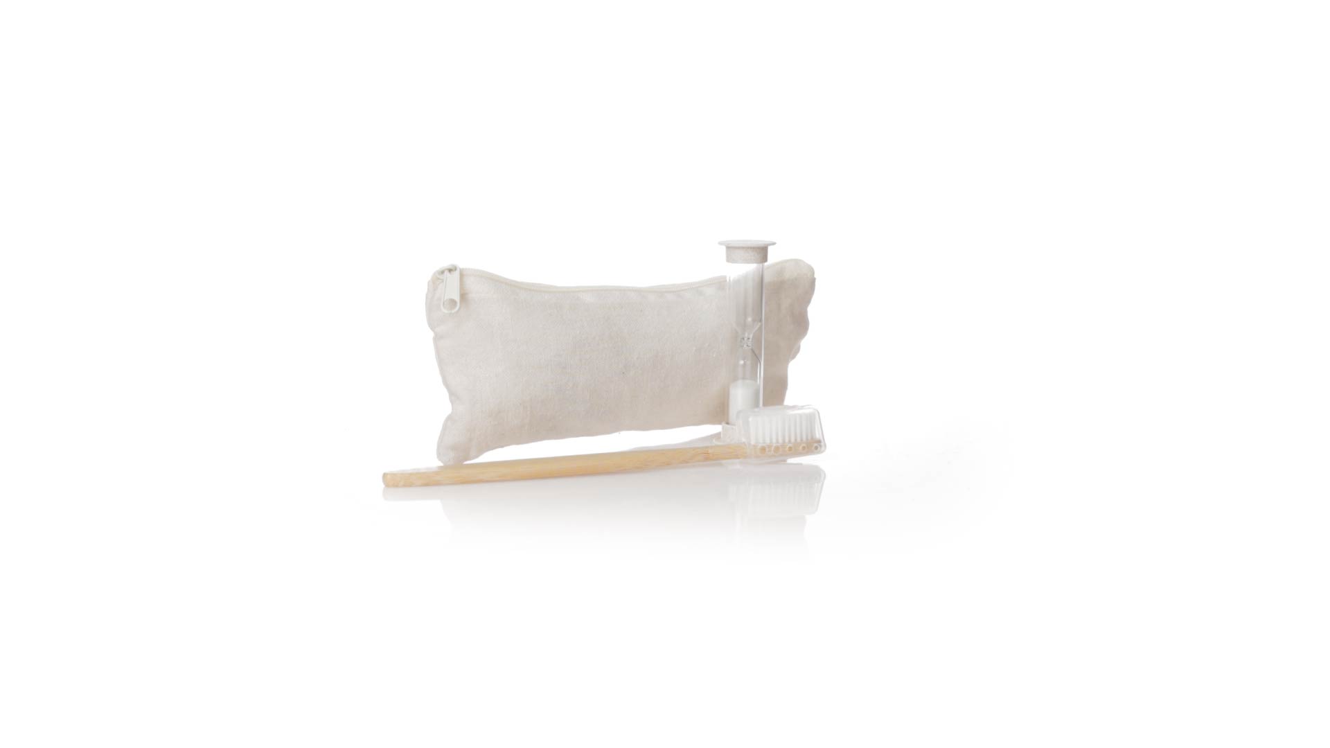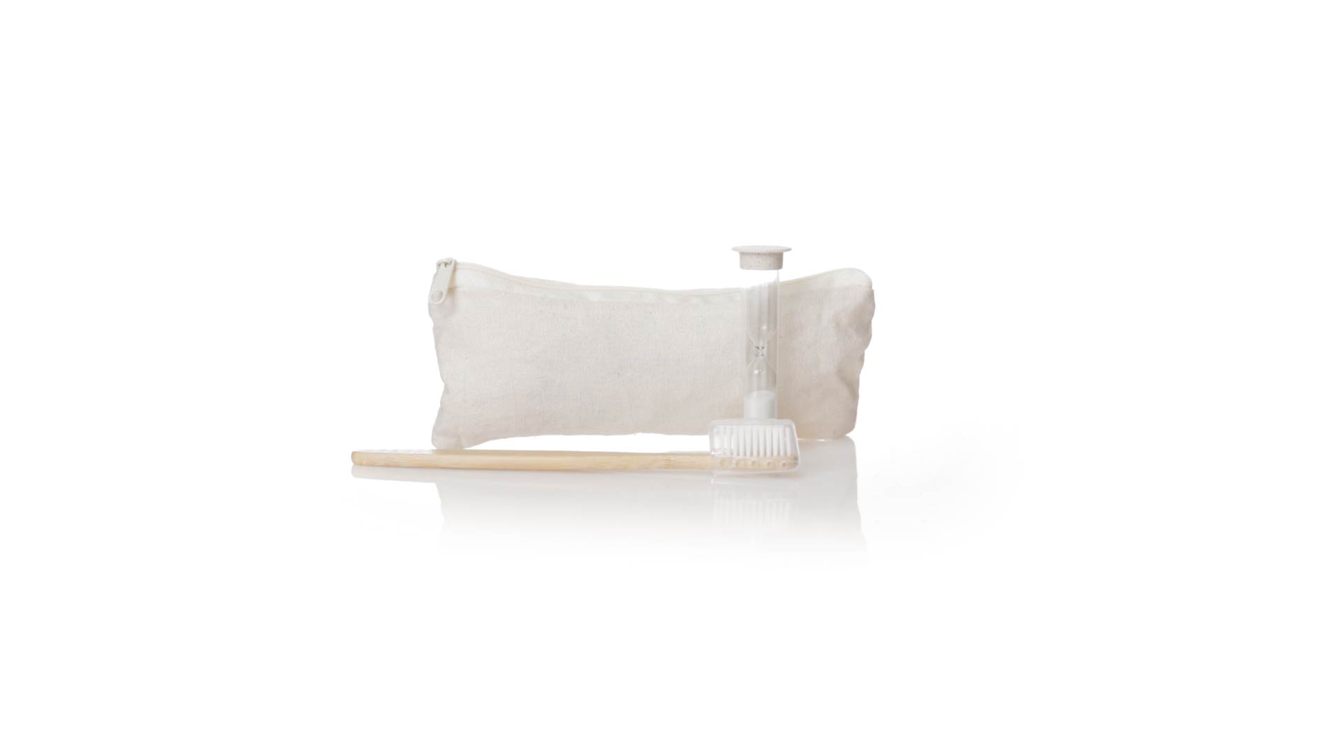 Zahnbürsten- und Sanduhr-Set aus Bambus und Weizenstroh. Inklusive Zahnbürste mit ergonomischem Griff aus weichem Bambus, mit Schutzhaube. Ausserdem inklusive einer 2-Minuten-Sanduhr aus Weizenstroh. Präsentiert in einem praktischen Etui aus atmungsaktiver Baumwolle.