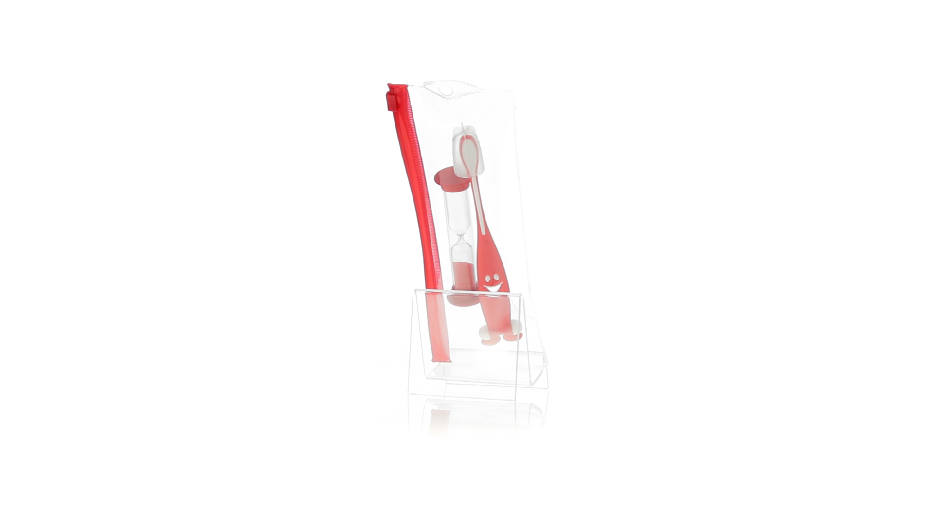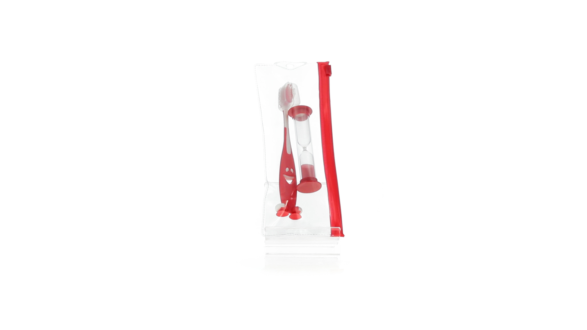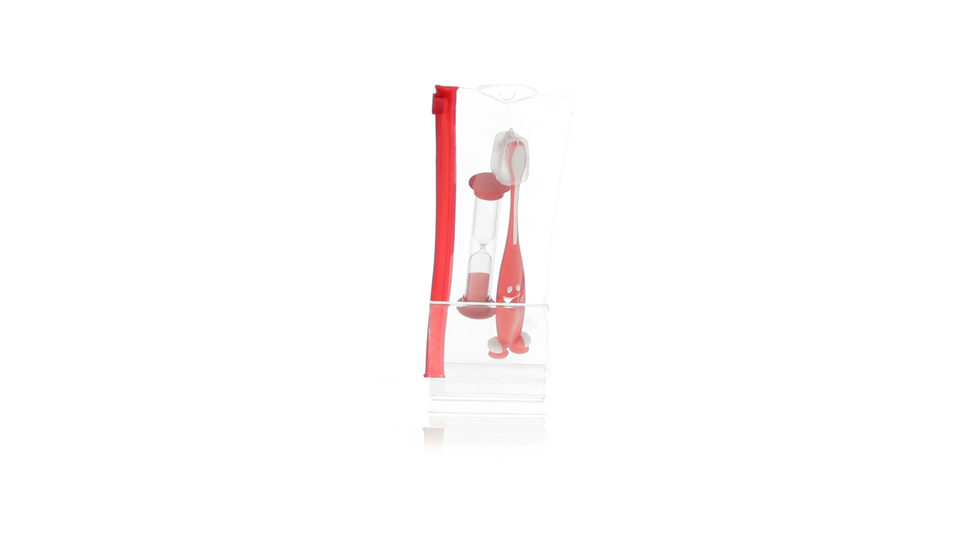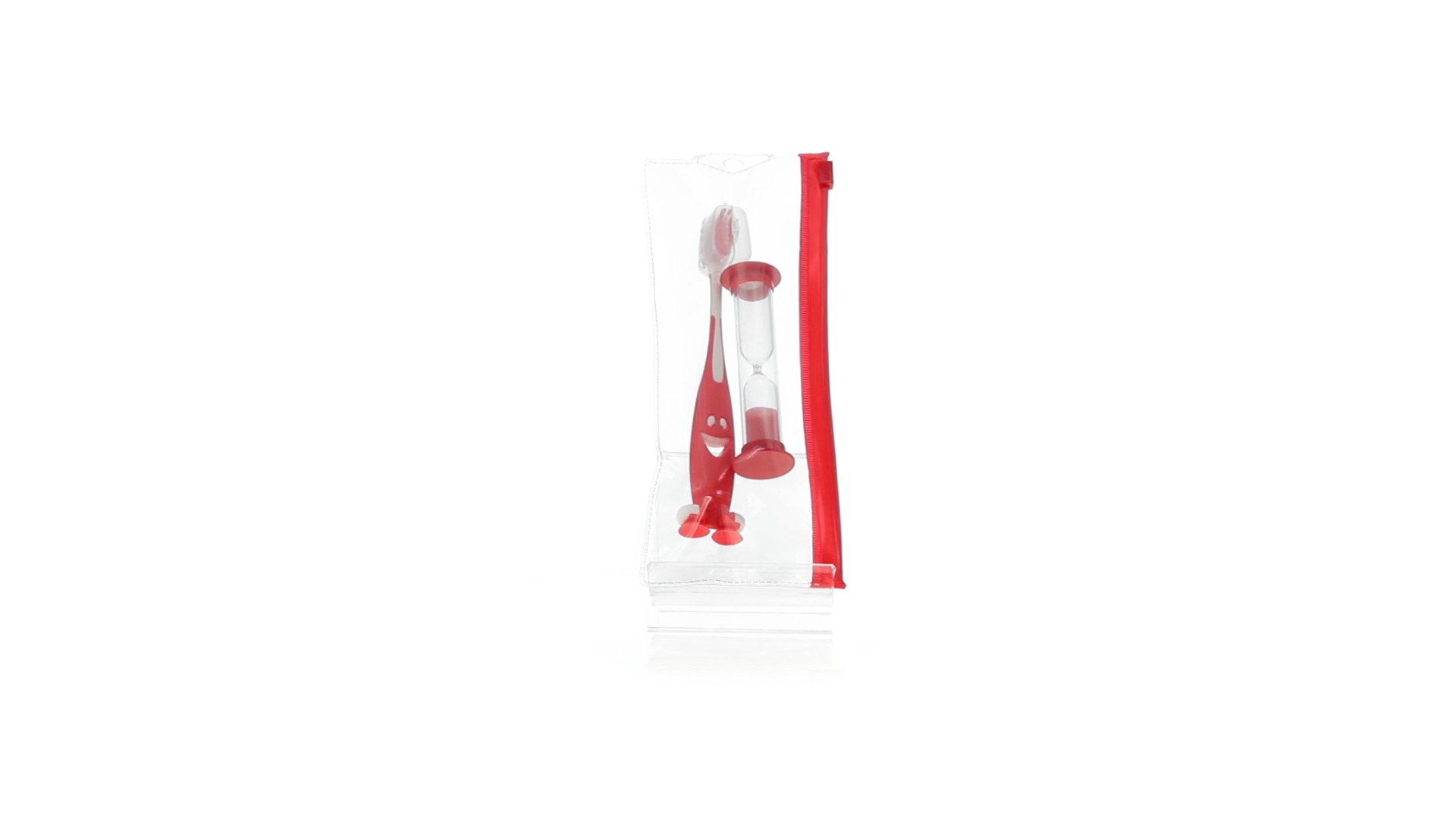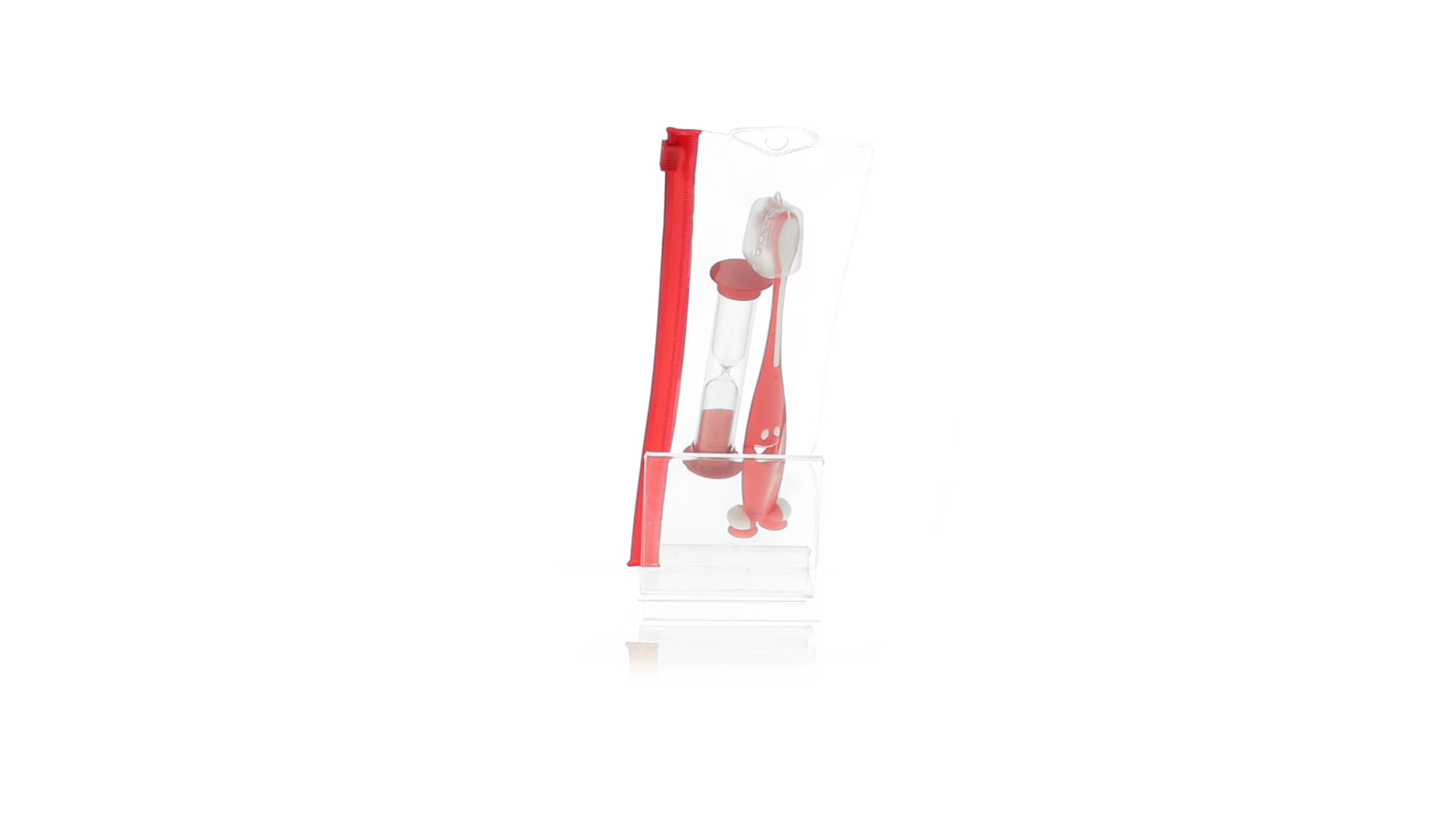 Set aus Zahnbürste und Sanduhr in kräftigen Farben. Enthält Zahnbürste mit lebhaftem Design, weichem Griff und Saugnapf an der Basis sowie eine 2-Minuten-Sanduhr. Präsentiert in einer individuellen Tasche mit Ziplock-Verschluss.