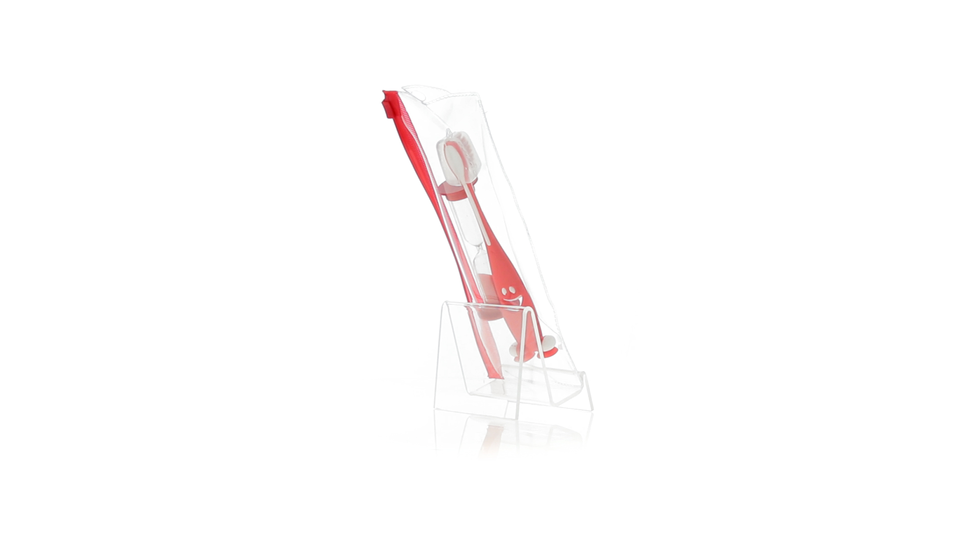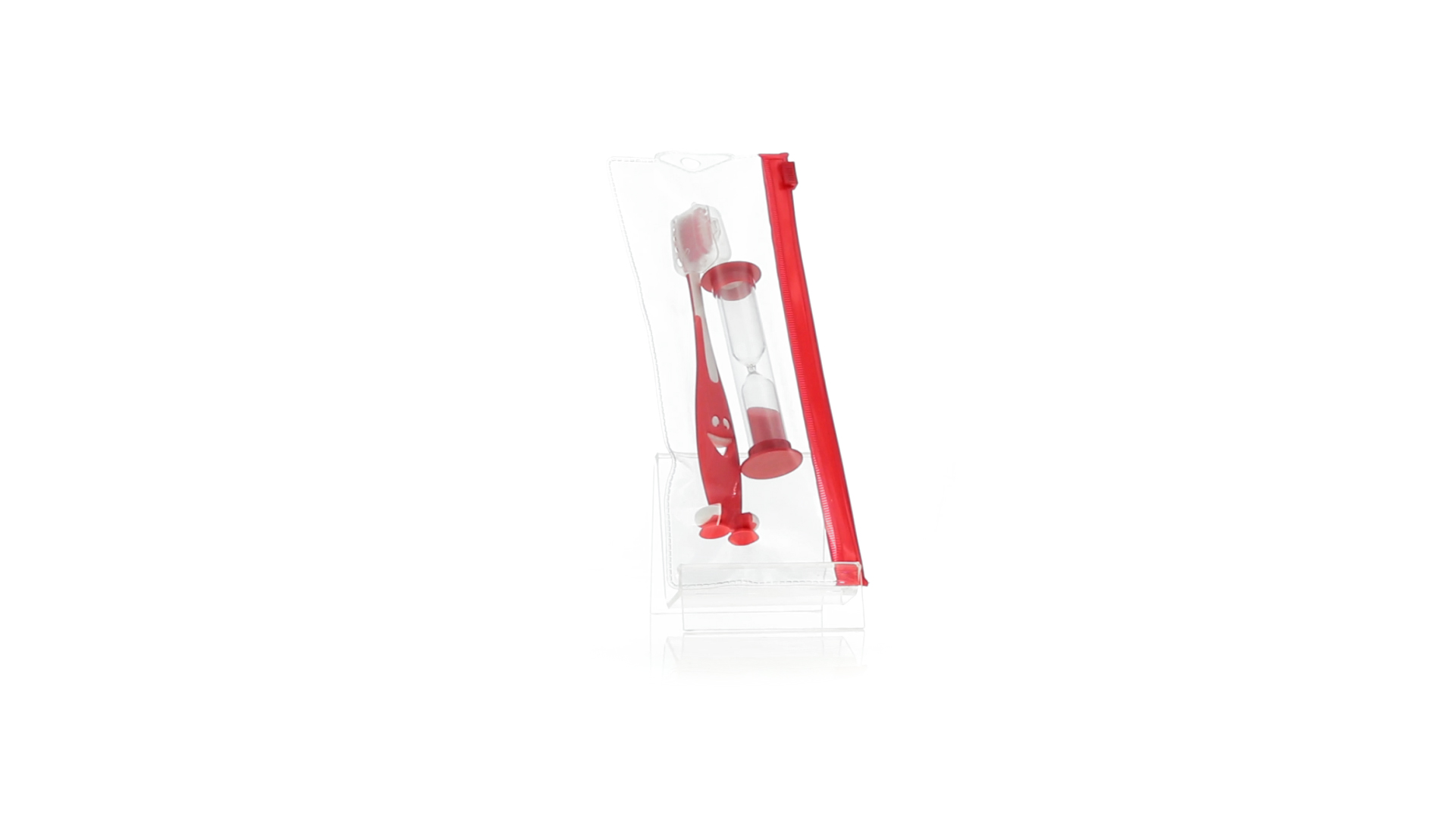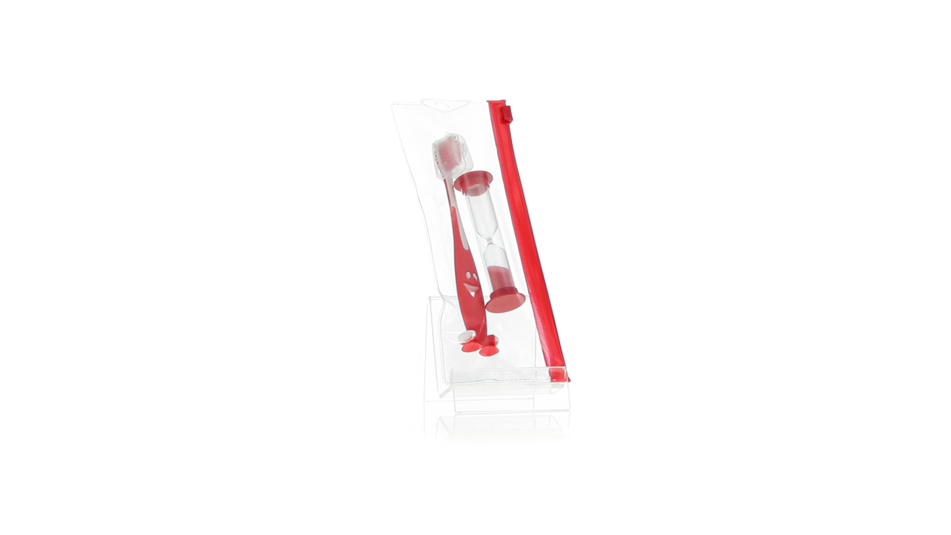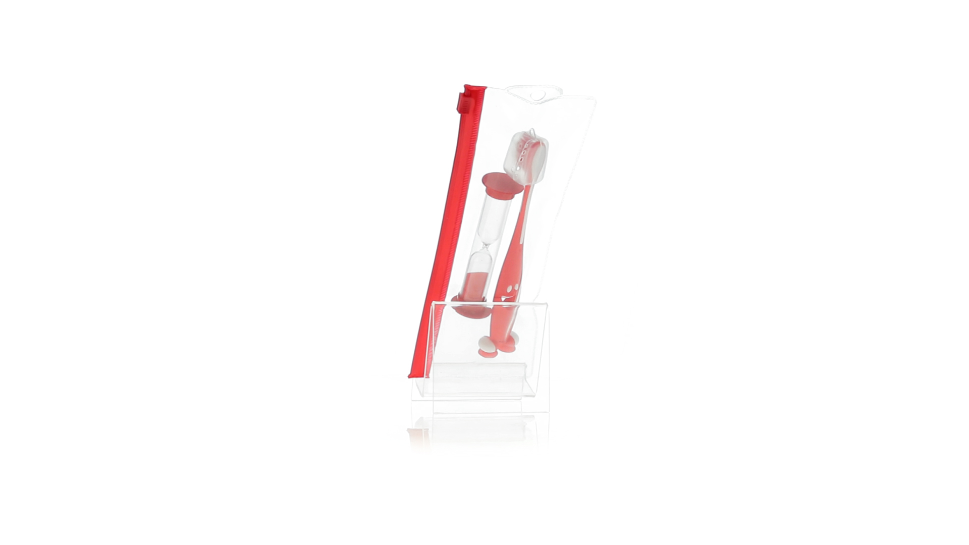Set aus Zahnbürste und Sanduhr in kräftigen Farben. Enthält Zahnbürste mit lebhaftem Design, weichem Griff und Saugnapf an der Basis sowie eine 2-Minuten-Sanduhr. Präsentiert in einer individuellen Tasche mit Ziplock-Verschluss.