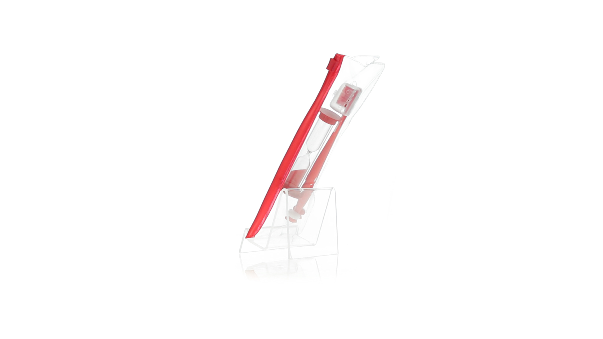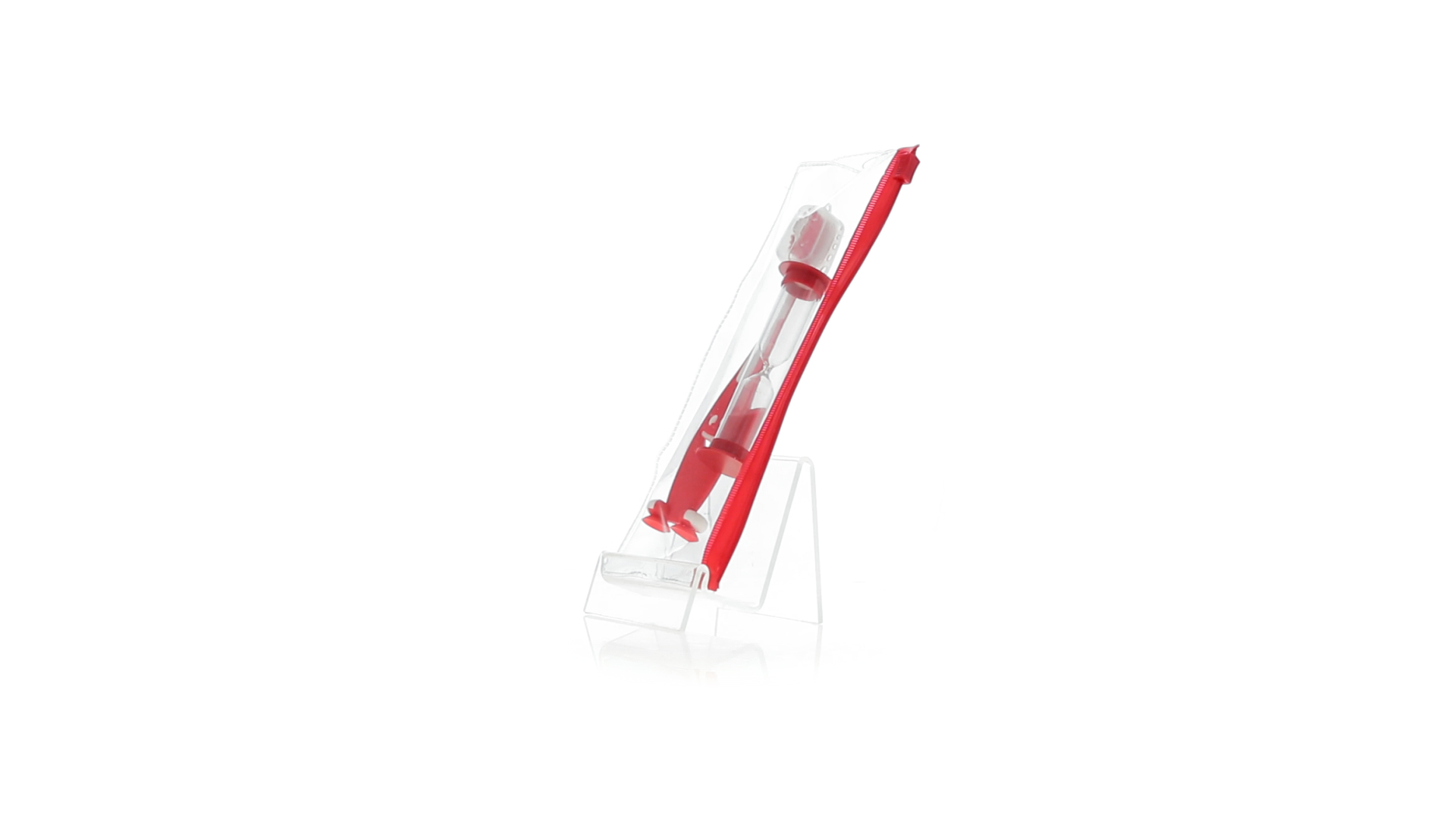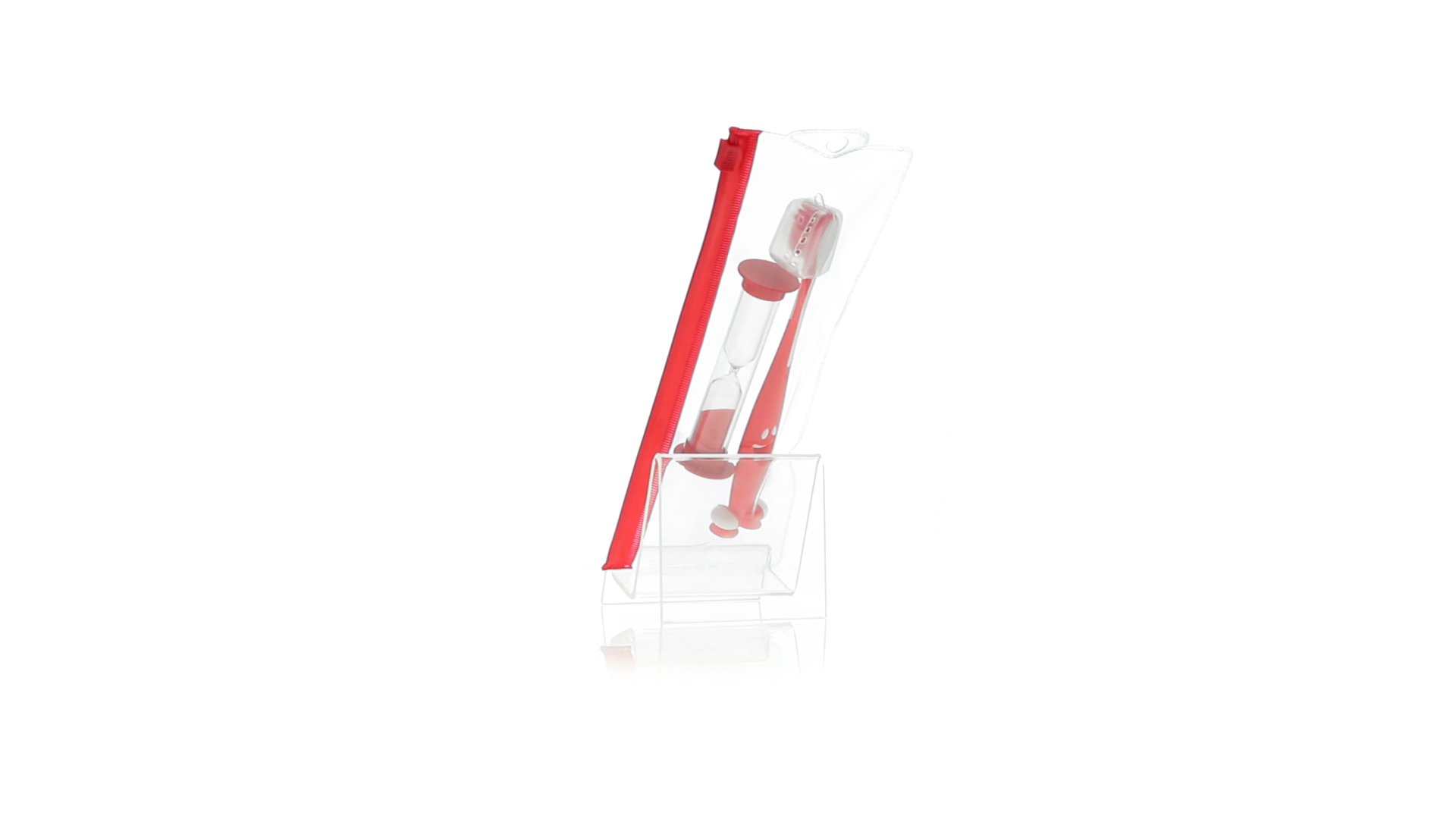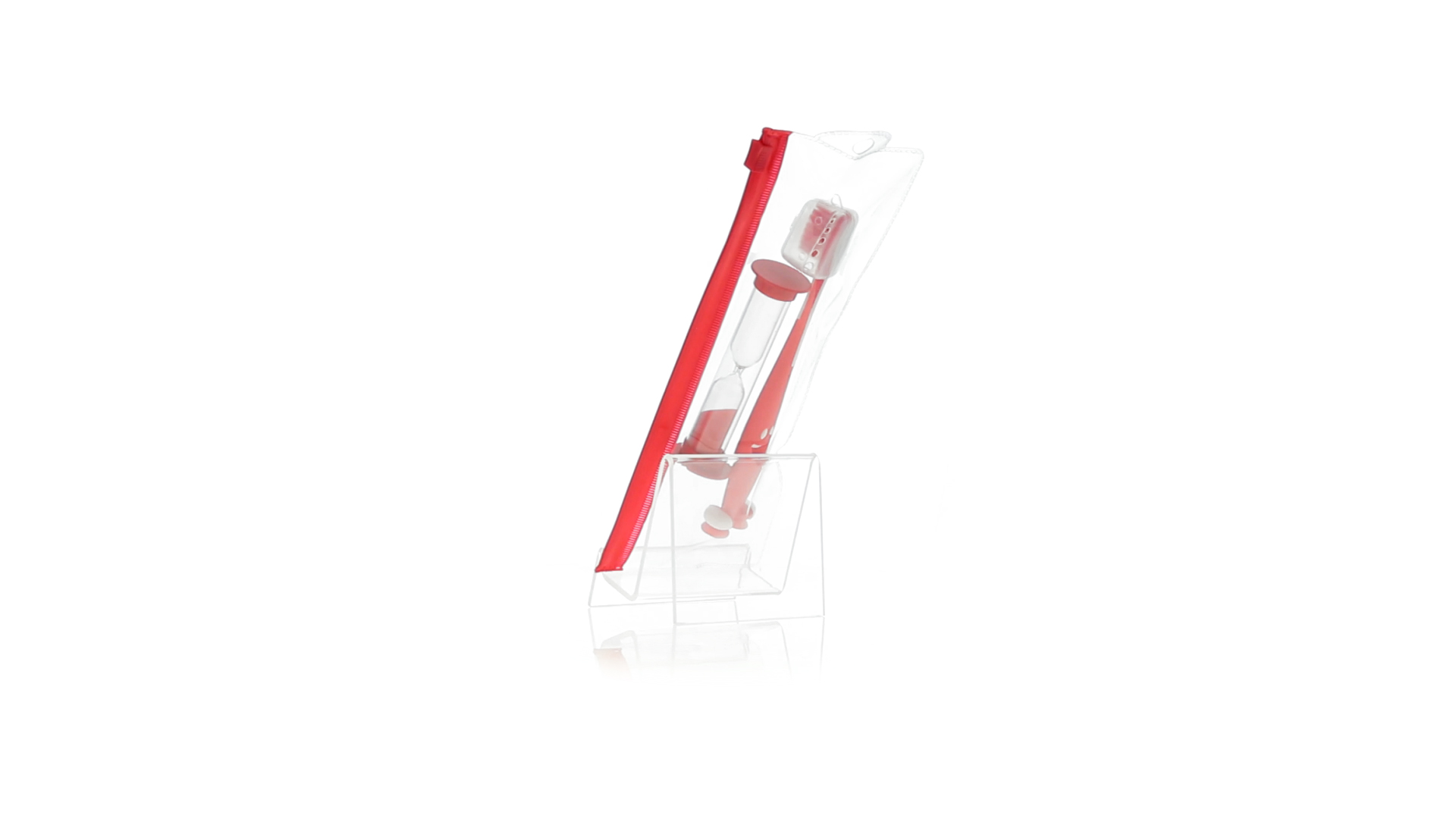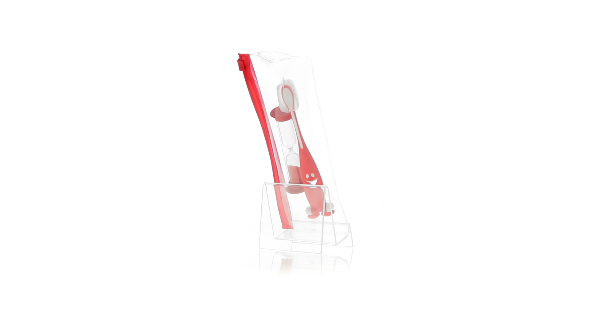 Set aus Zahnbürste und Sanduhr in kräftigen Farben. Enthält Zahnbürste mit lebhaftem Design, weichem Griff und Saugnapf an der Basis sowie eine 2-Minuten-Sanduhr. Präsentiert in einer individuellen Tasche mit Ziplock-Verschluss.