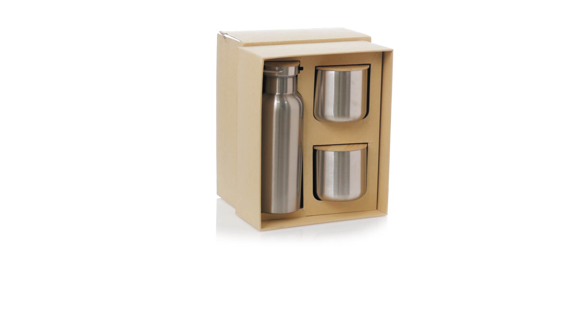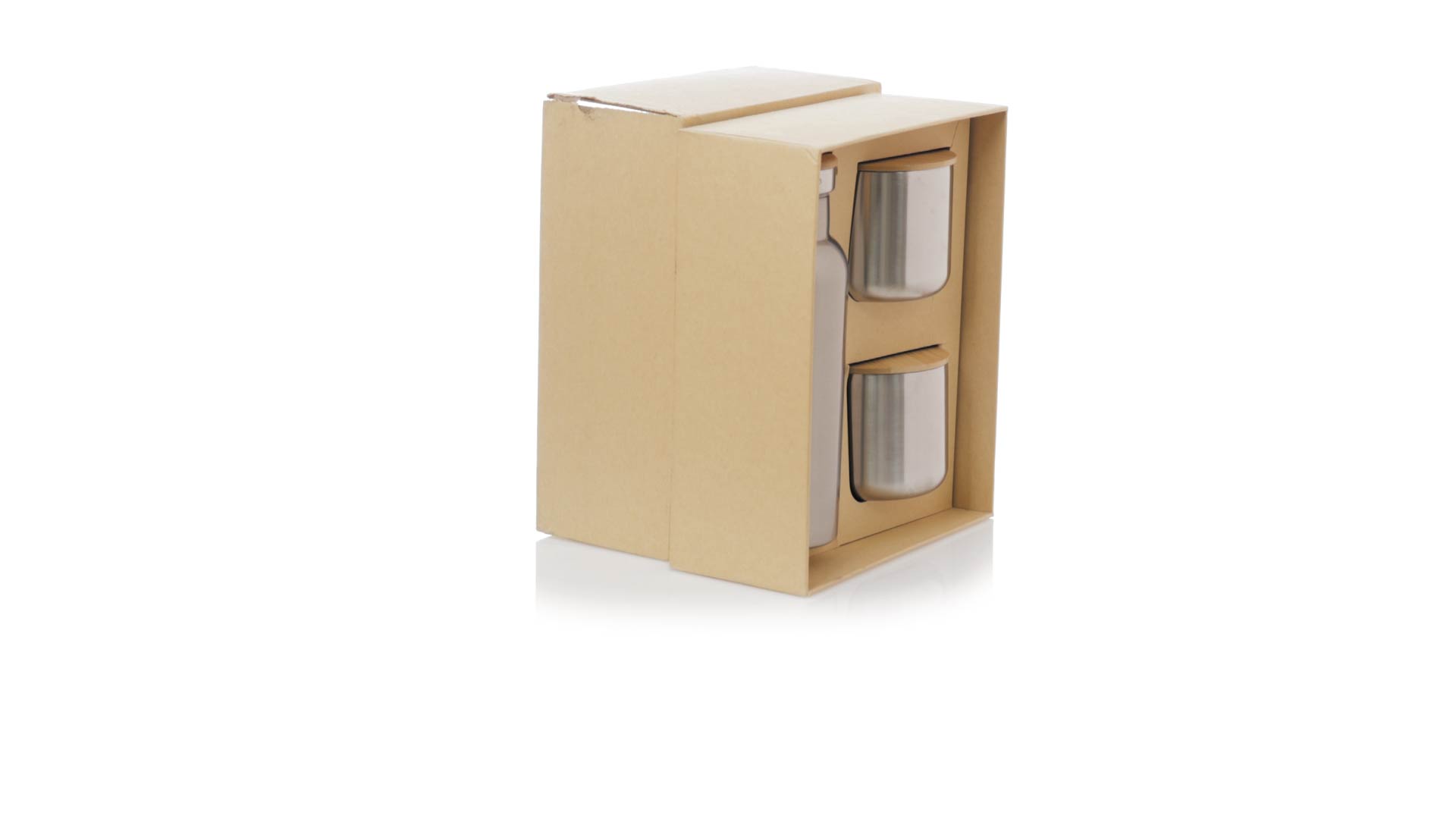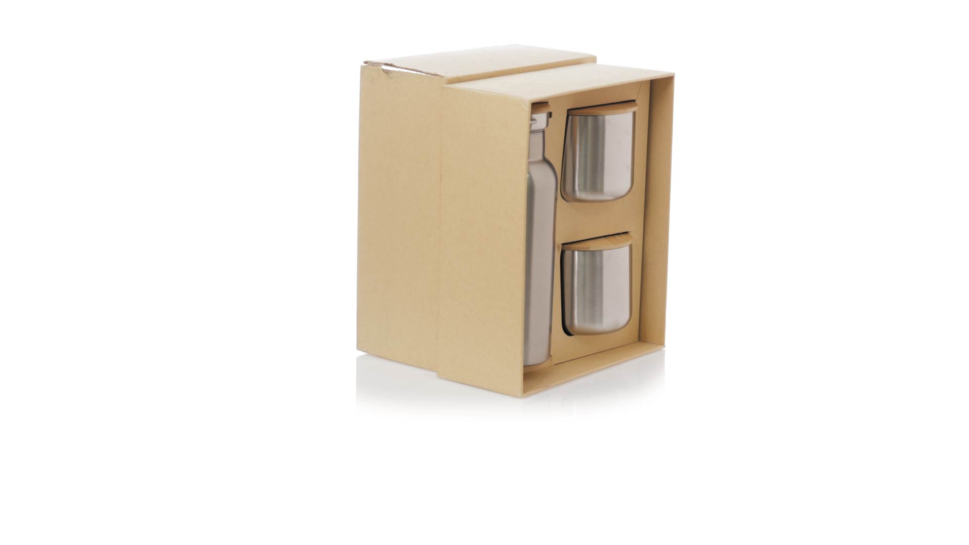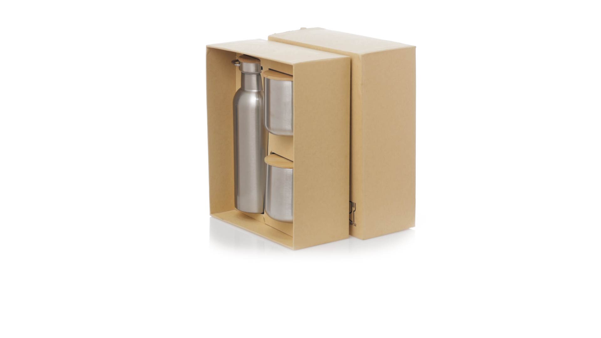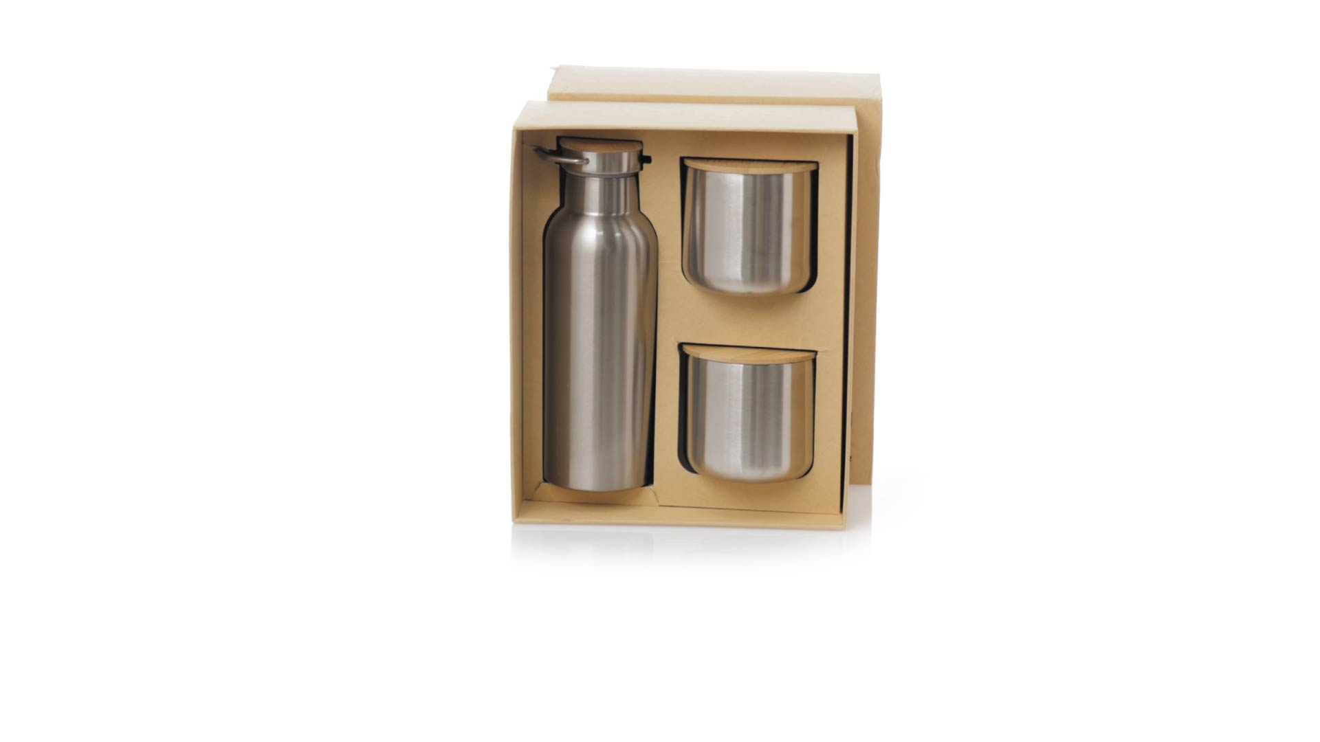 Praktische Thermoskanne und Becher aus Edelstahl. Inklusive 500ml Edelstahl Thermoskanne mit Bambus Detail auf der Oberseite und am Griff. Darüber hinaus enthält es 2 Becher mit je 300 ml Fassungsvermögen, aus Edelstahl, mit Deckel aus Bambus und Push-on-Verschluss. Präsentiert in einer Kraft-Design-Box mit ausstanzungen.