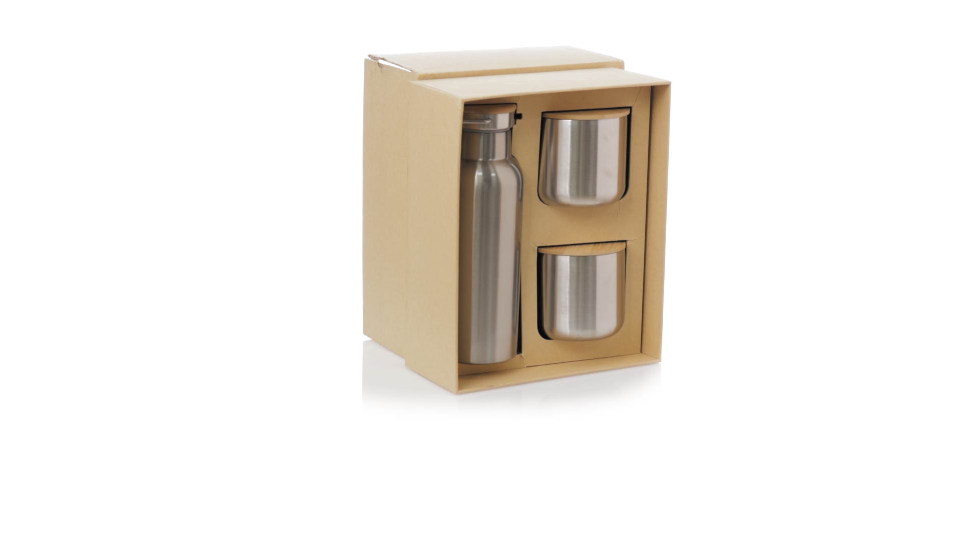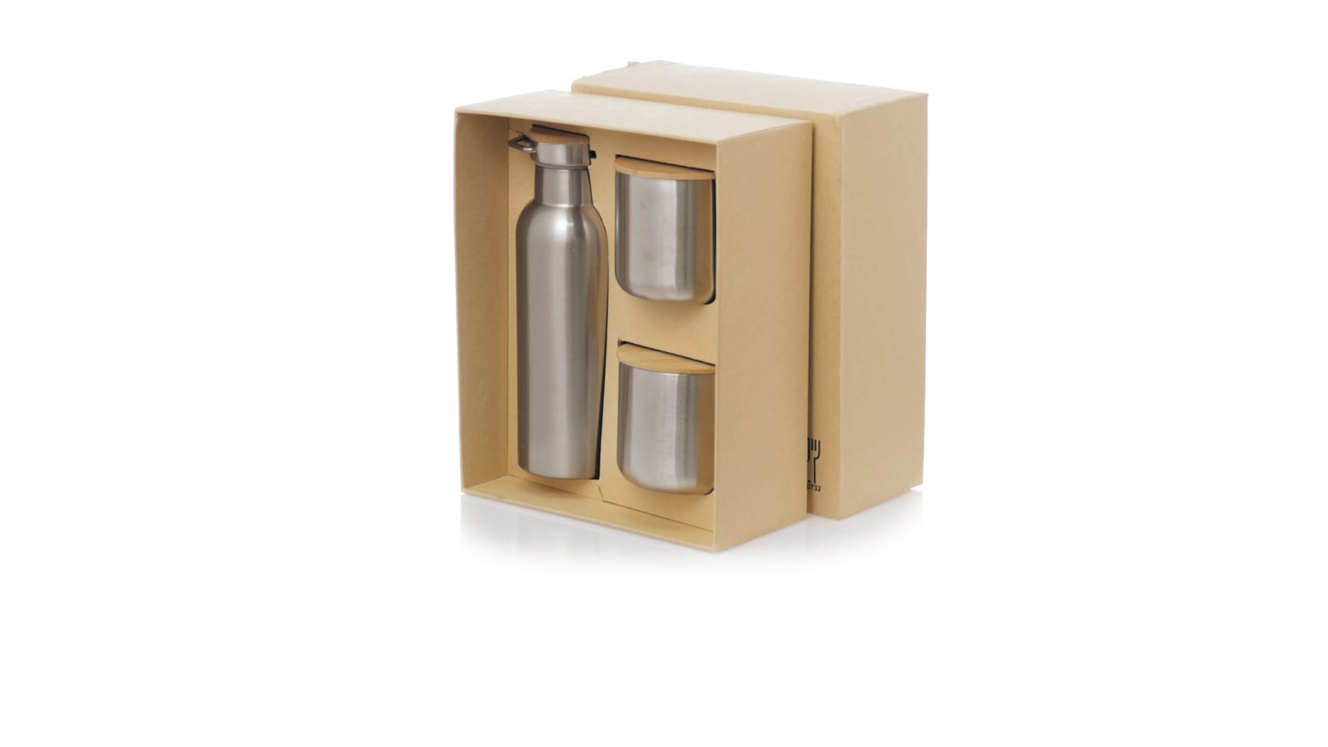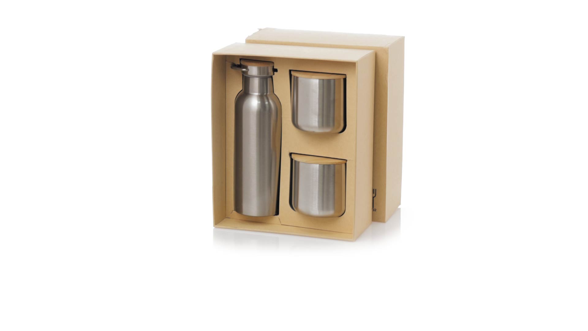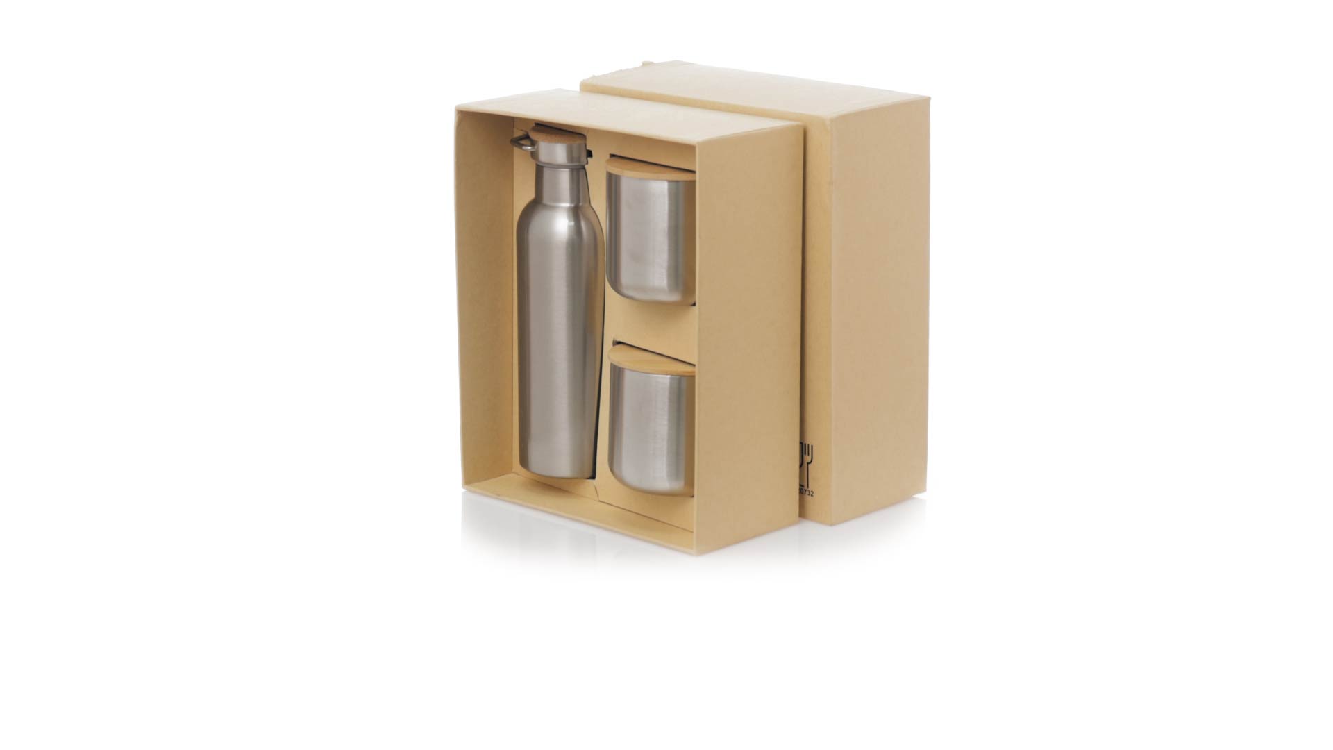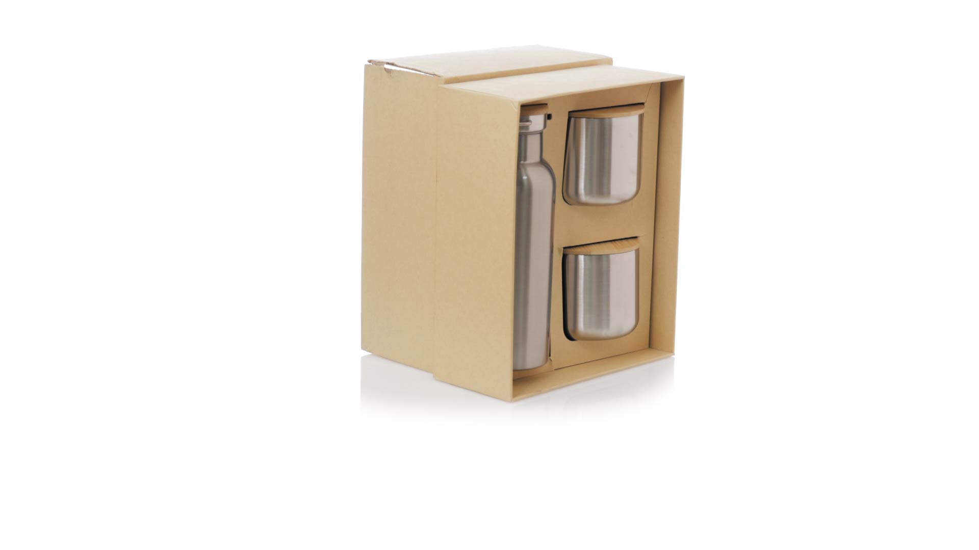 Praktische Thermoskanne und Becher aus Edelstahl. Inklusive 500ml Edelstahl Thermoskanne mit Bambus Detail auf der Oberseite und am Griff. Darüber hinaus enthält es 2 Becher mit je 300 ml Fassungsvermögen, aus Edelstahl, mit Deckel aus Bambus und Push-on-Verschluss. Präsentiert in einer Kraft-Design-Box mit ausstanzungen.