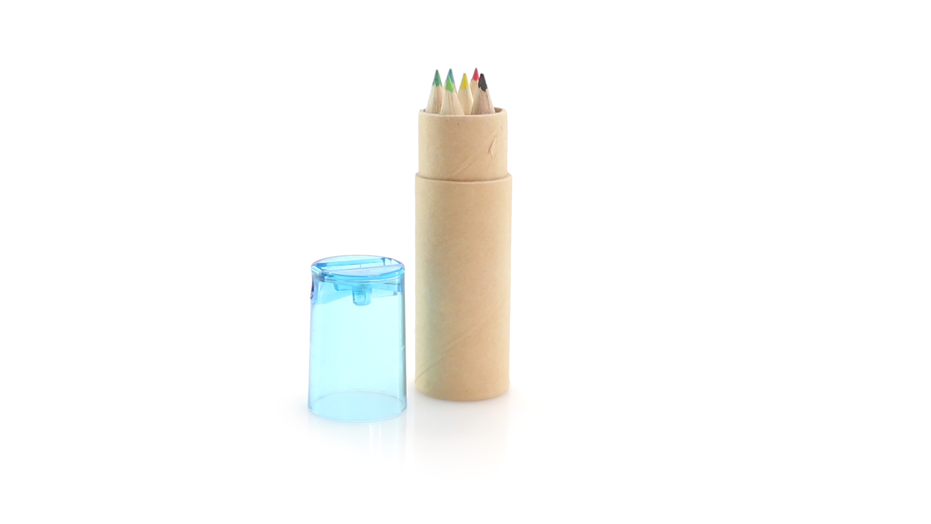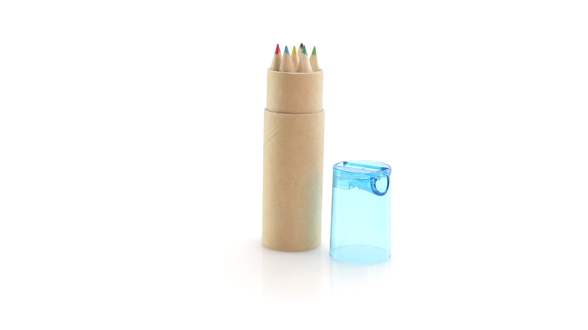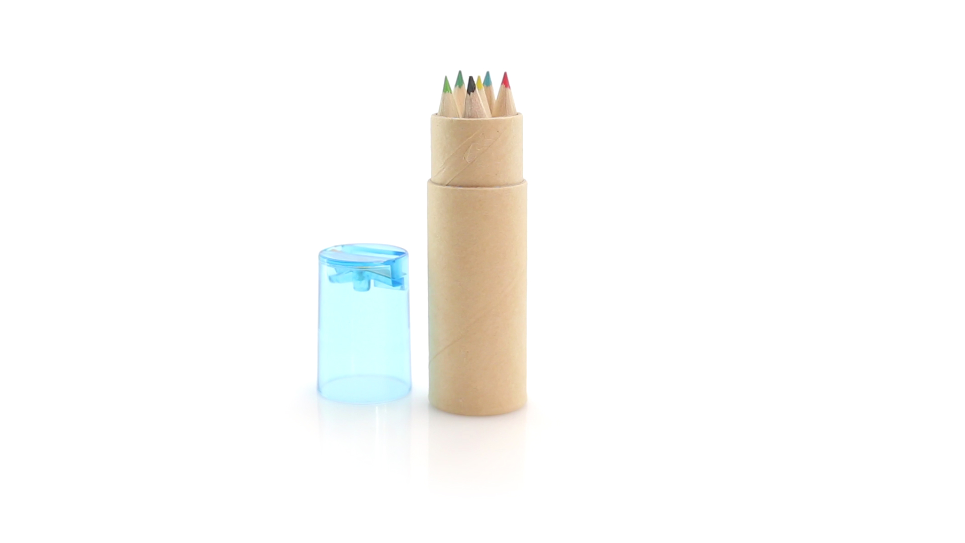 7-teiliges Set in einer zylinderförmigen Box aus Naturkarton mit transparentem Deckel in verschiedenen Farben. Enthält 6 Buntstifte mit sechseckigem Schaft in Naturfarbe und einen im Deckel integrierten Anspitzer.