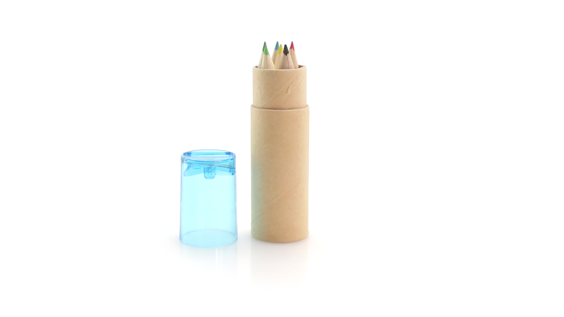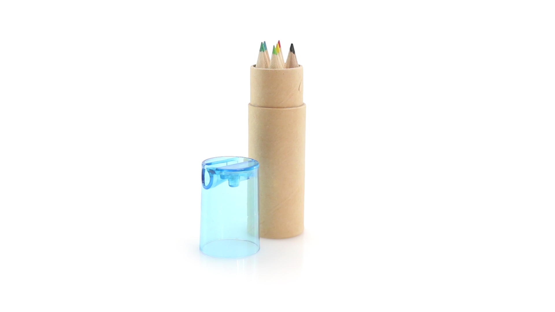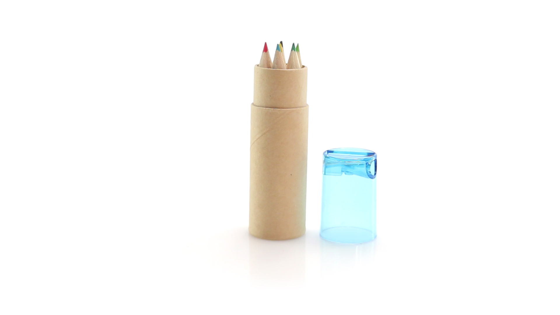 7-teiliges Set in einer zylinderförmigen Box aus Naturkarton mit transparentem Deckel in verschiedenen Farben. Enthält 6 Buntstifte mit sechseckigem Schaft in Naturfarbe und einen im Deckel integrierten Anspitzer.