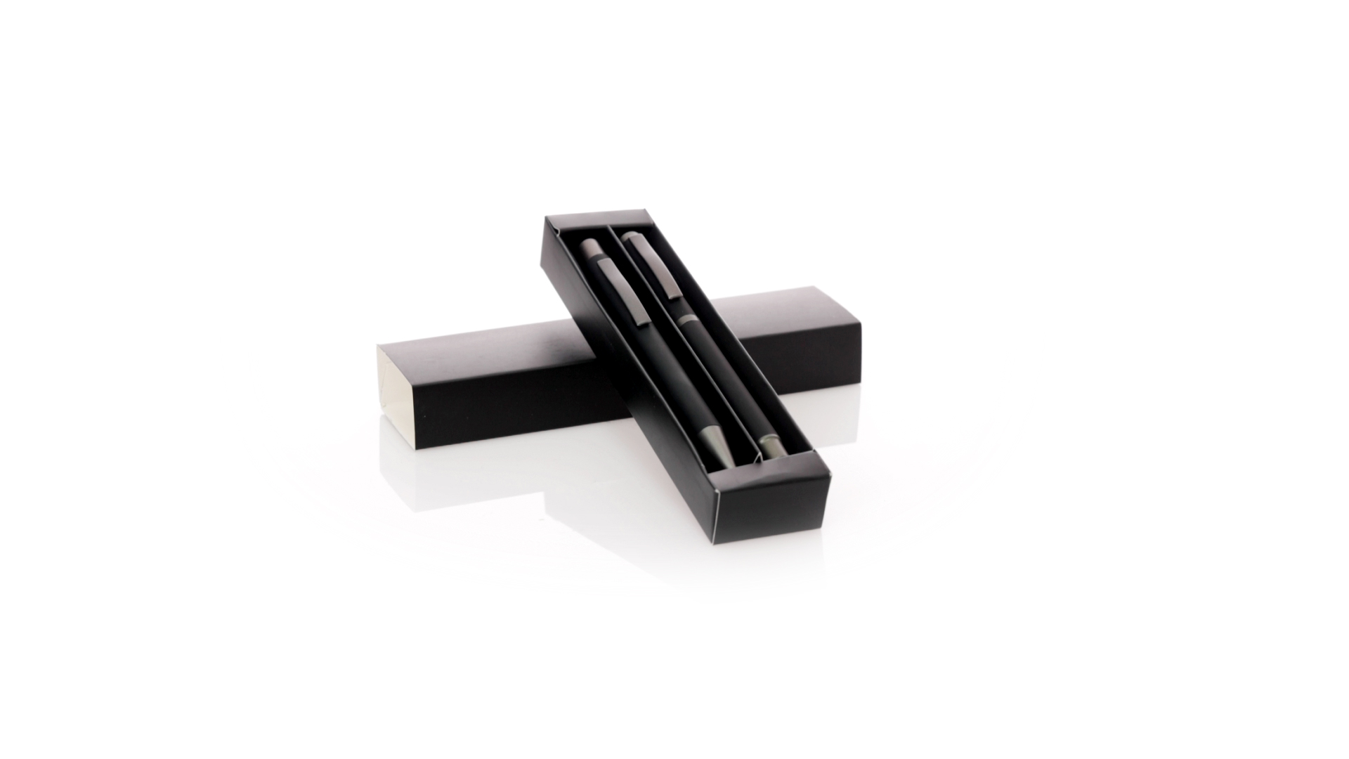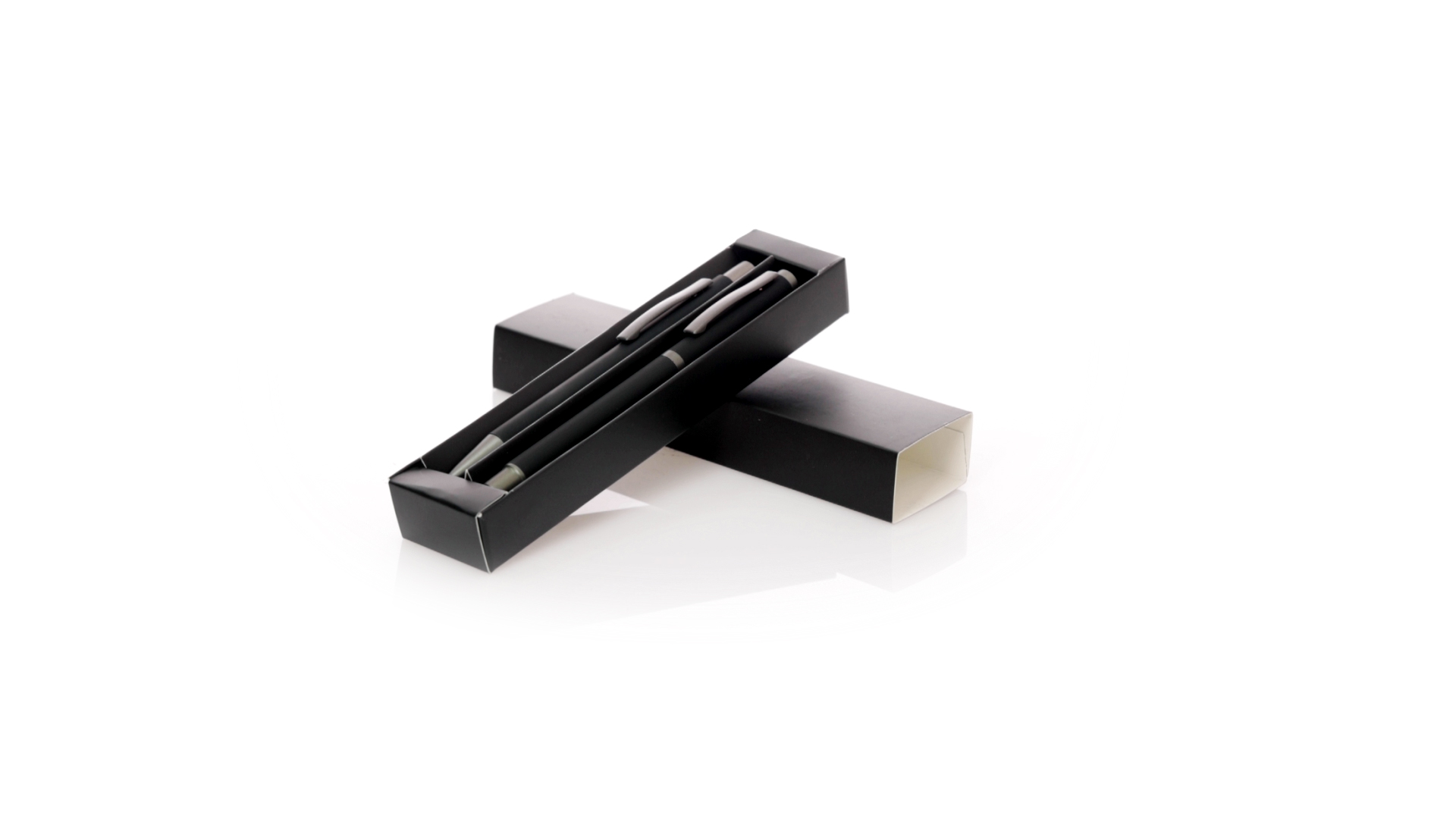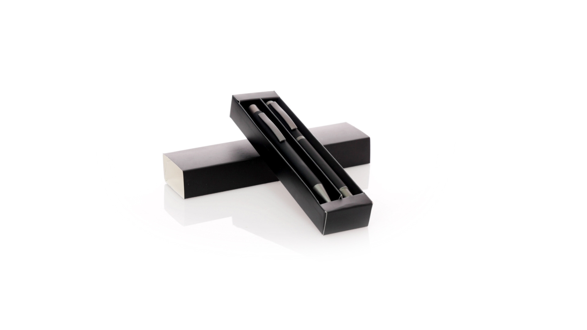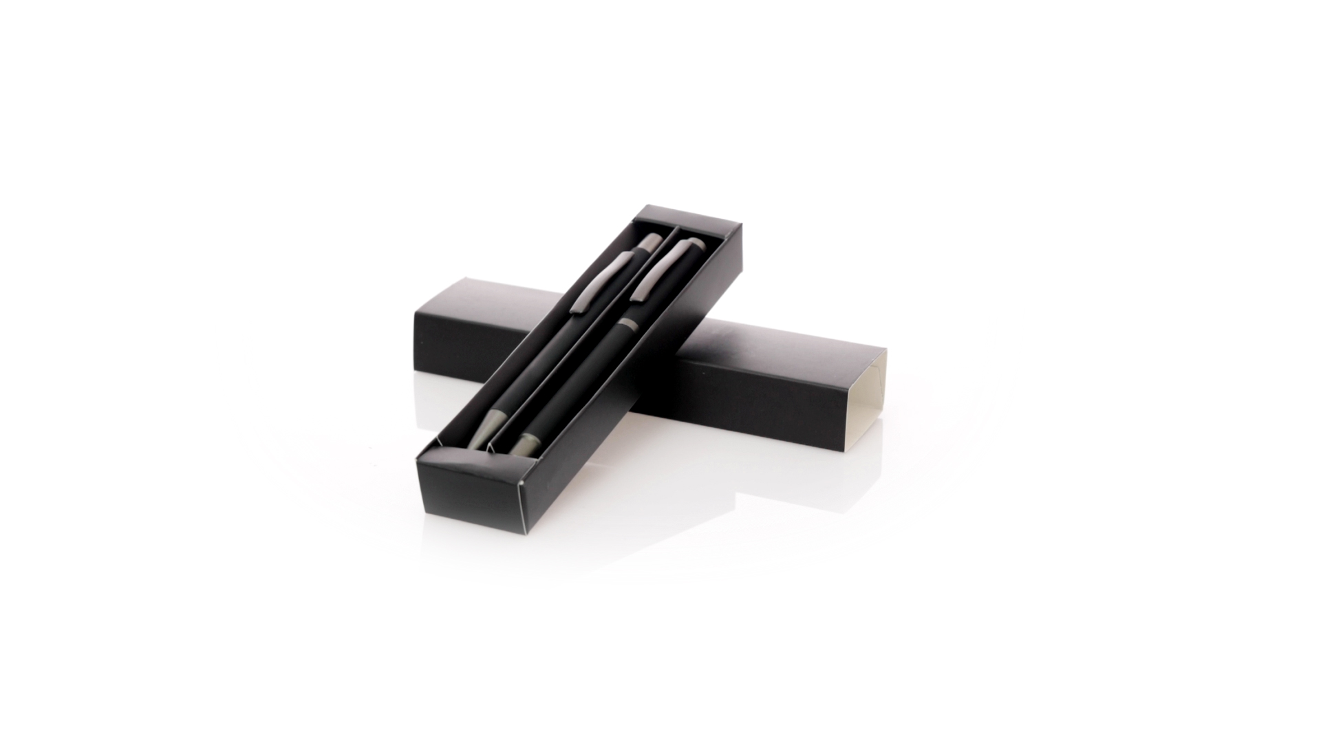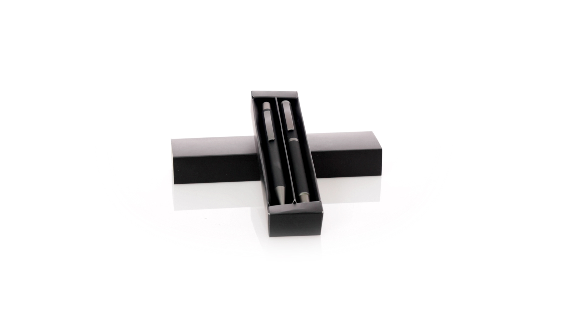 Stilvolles Kugelschreiber- und Tintenroller-Set. Druckkugelschreiber und Tintenroller mit Kappe, beide mit Metallclip, Jumbo-Mine und blauer Tinte. Schaft in verschiedenen Volltonfarben, mit gummierter Oberfläche und dunkelgrauen Metallic-Akzenten. Präsentiert in einem farblich passenden Etui mit einem ausgestanzten Fach für jedes Teil.