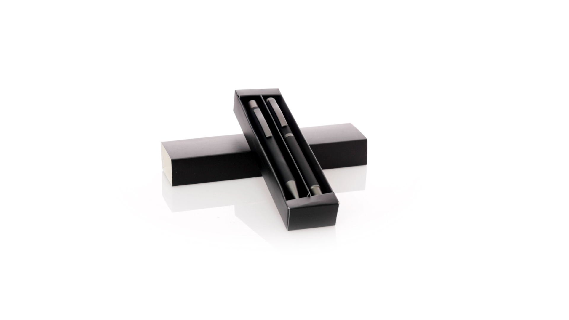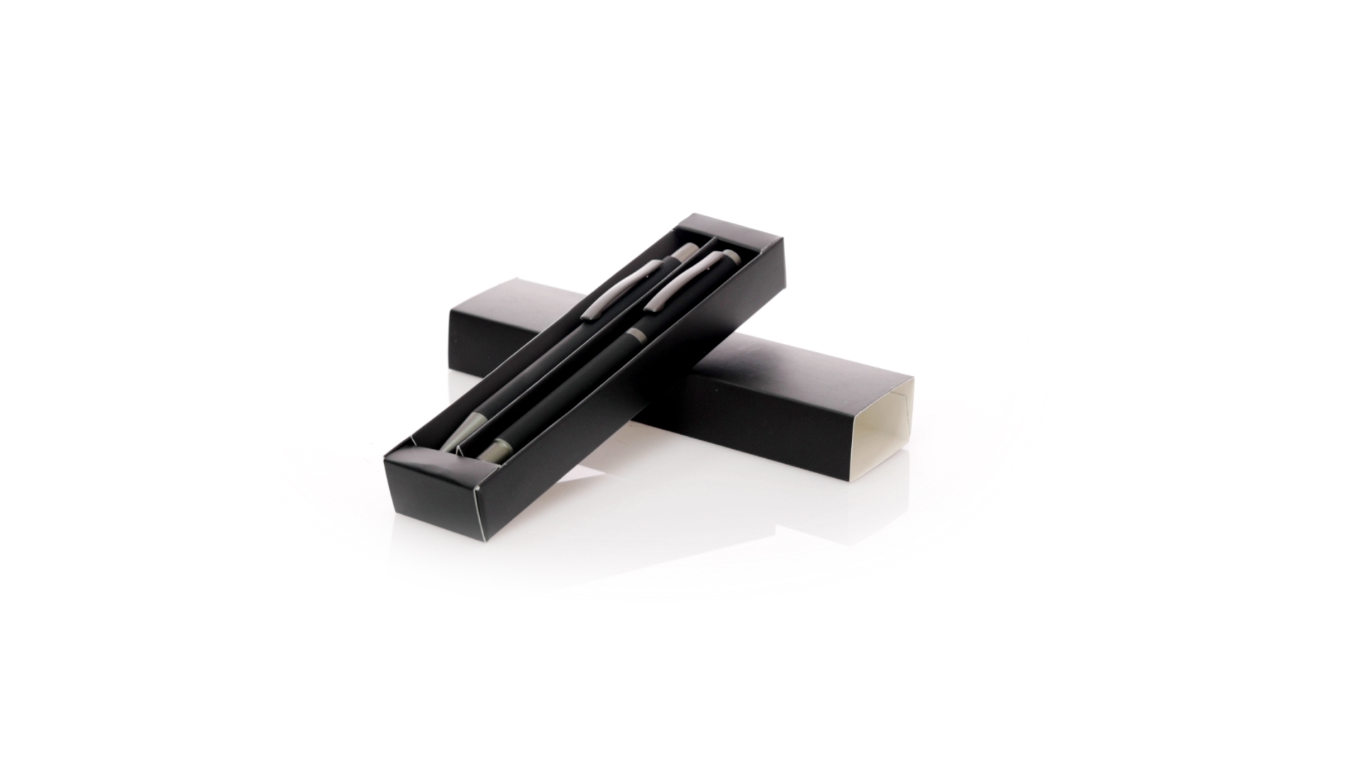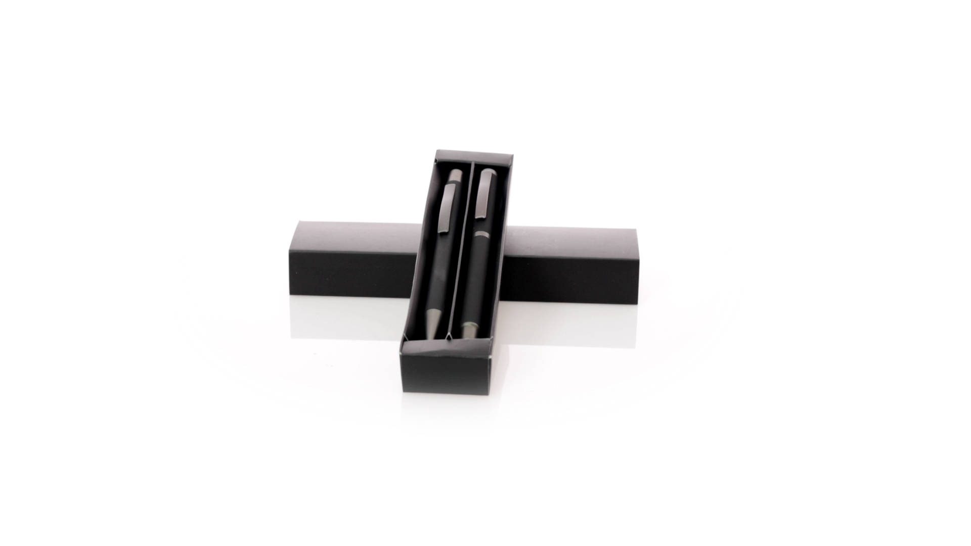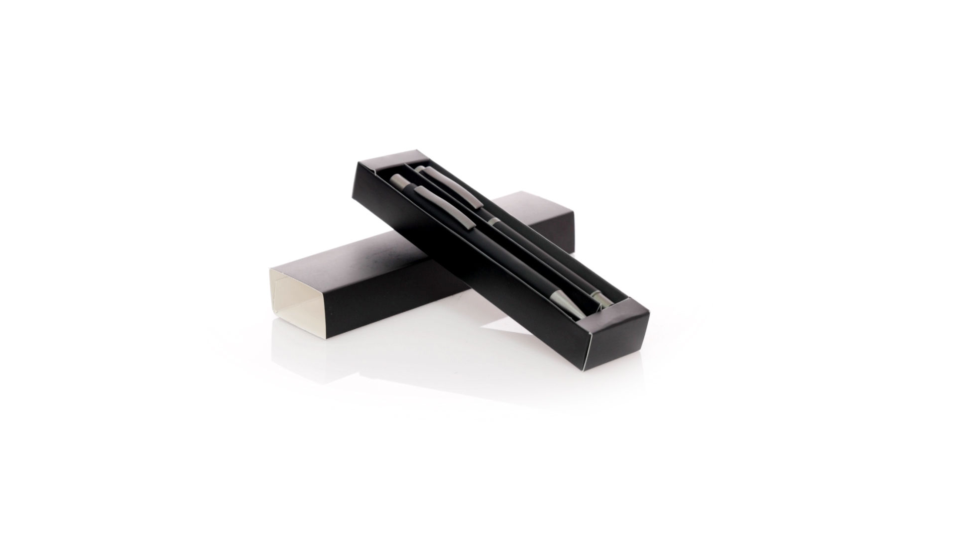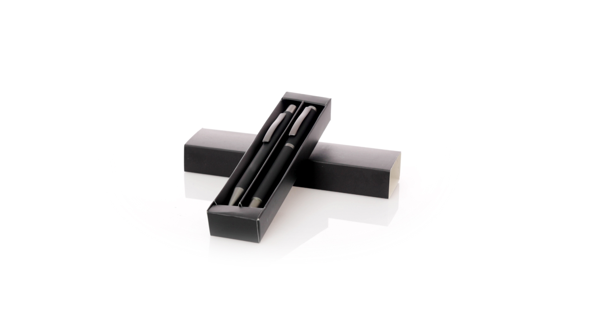Stilvolles Kugelschreiber- und Tintenroller-Set. Druckkugelschreiber und Tintenroller mit Kappe, beide mit Metallclip, Jumbo-Mine und blauer Tinte. Schaft in verschiedenen Volltonfarben, mit gummierter Oberfläche und dunkelgrauen Metallic-Akzenten. Präsentiert in einem farblich passenden Etui mit einem ausgestanzten Fach für jedes Teil.