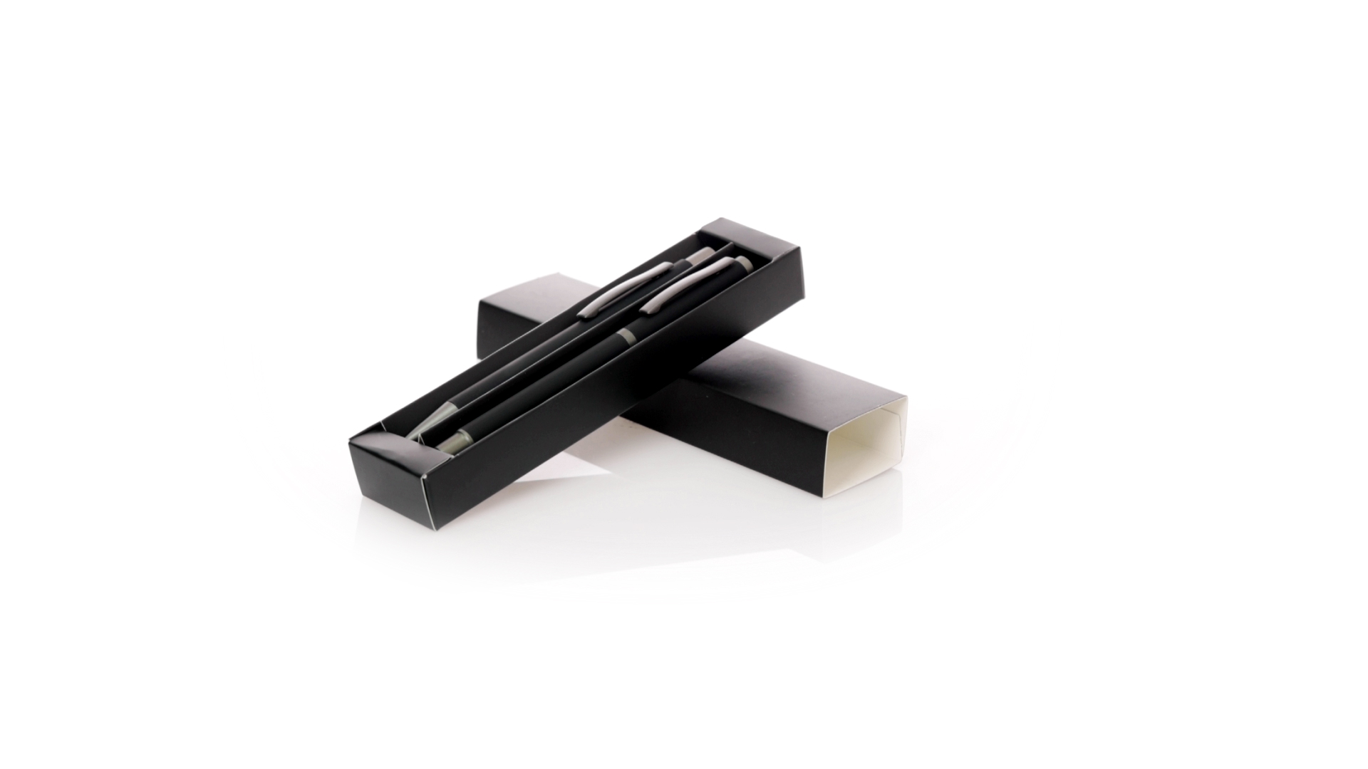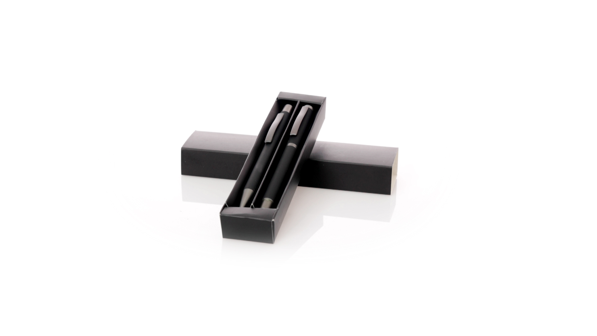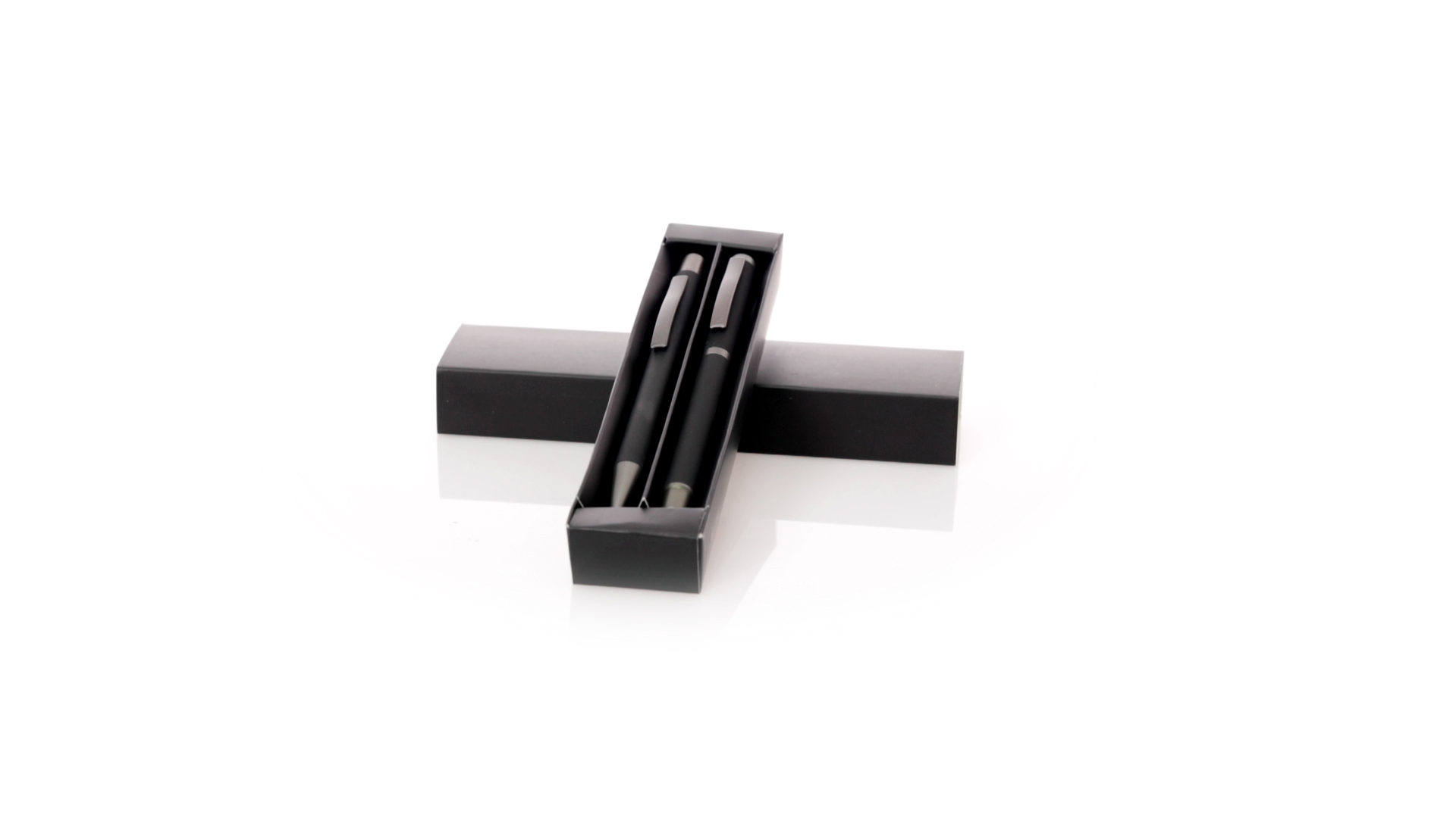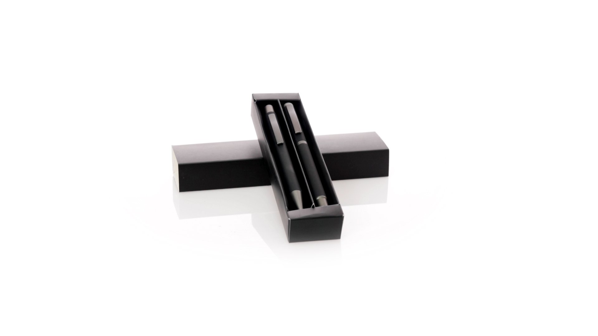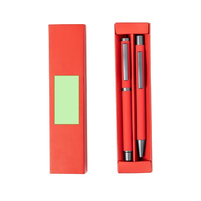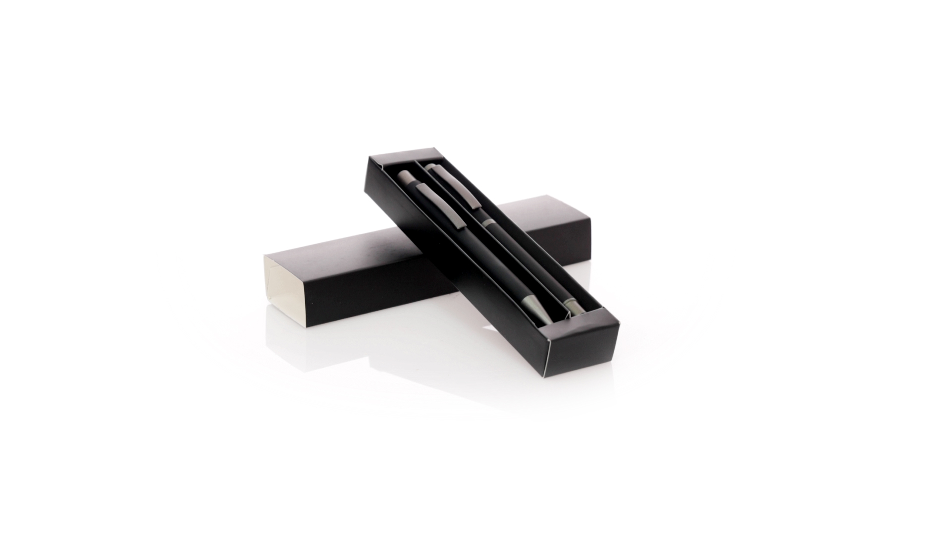 Stilvolles Kugelschreiber- und Tintenroller-Set. Druckkugelschreiber und Tintenroller mit Kappe, beide mit Metallclip, Jumbo-Mine und blauer Tinte. Schaft in verschiedenen Volltonfarben, mit gummierter Oberfläche und dunkelgrauen Metallic-Akzenten. Präsentiert in einem farblich passenden Etui mit einem ausgestanzten Fach für jedes Teil.