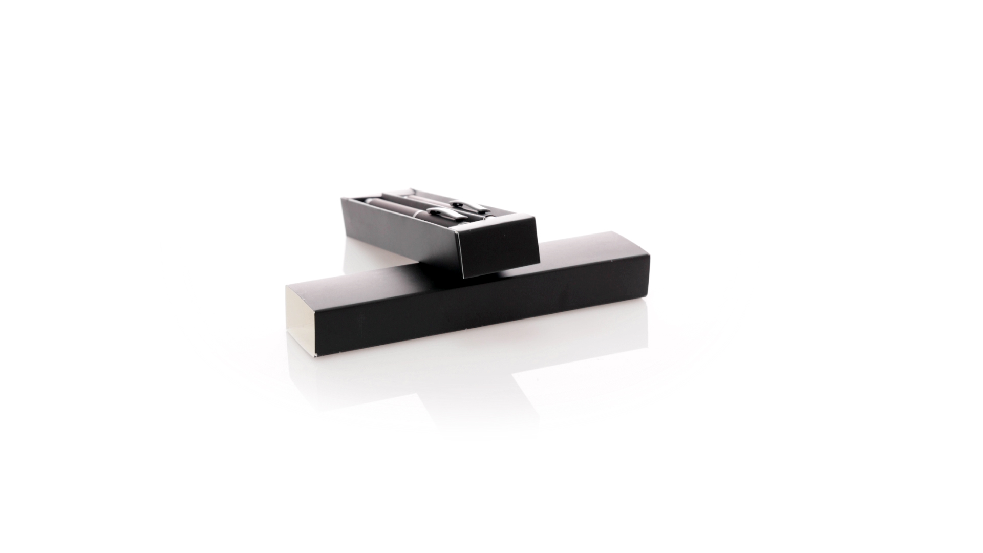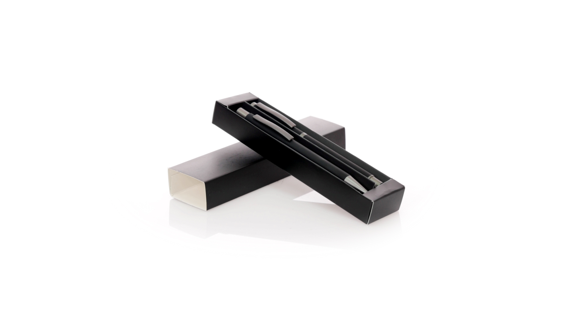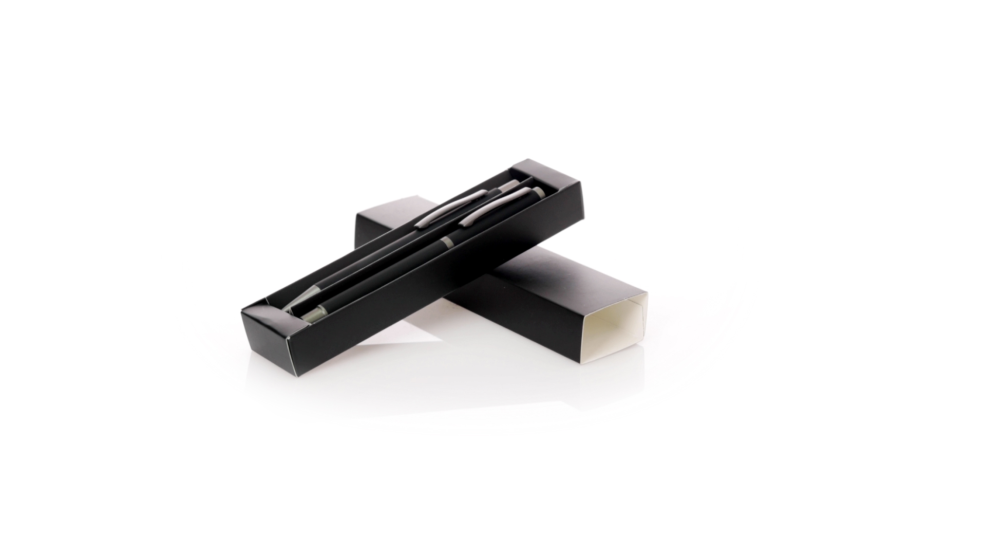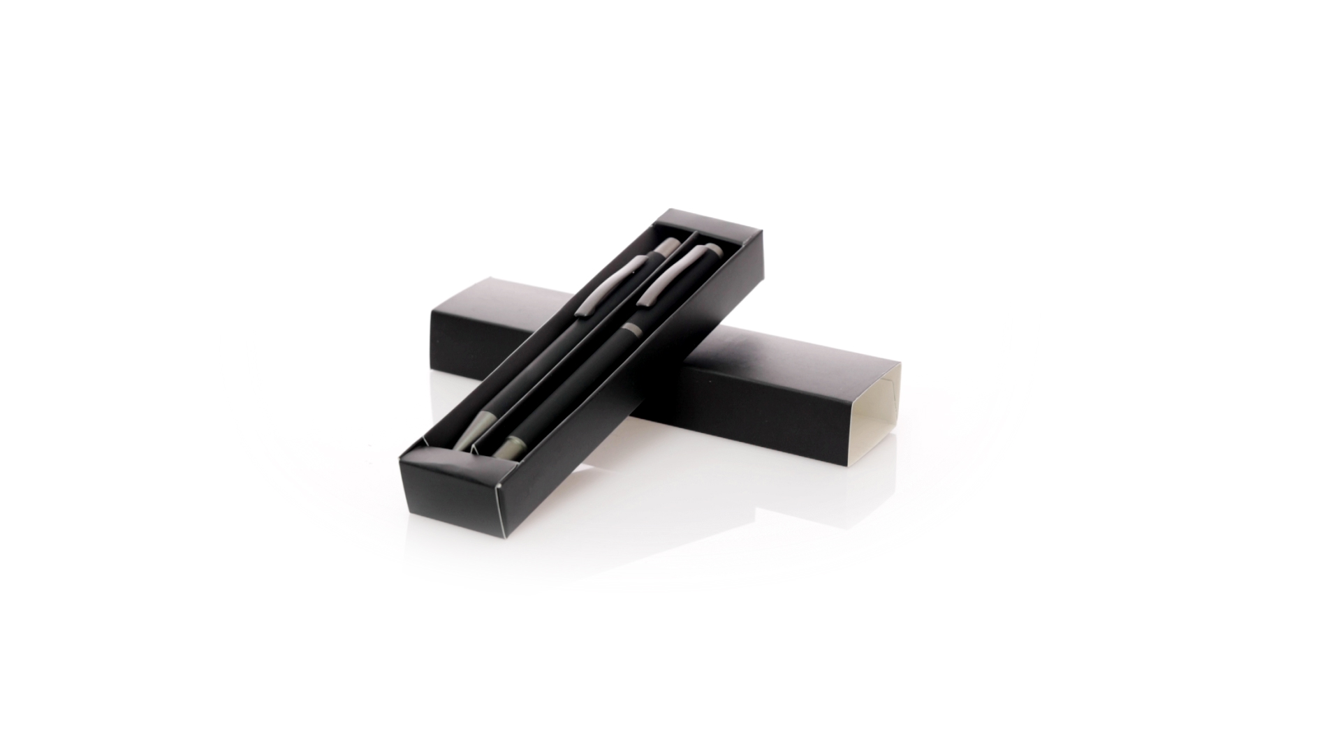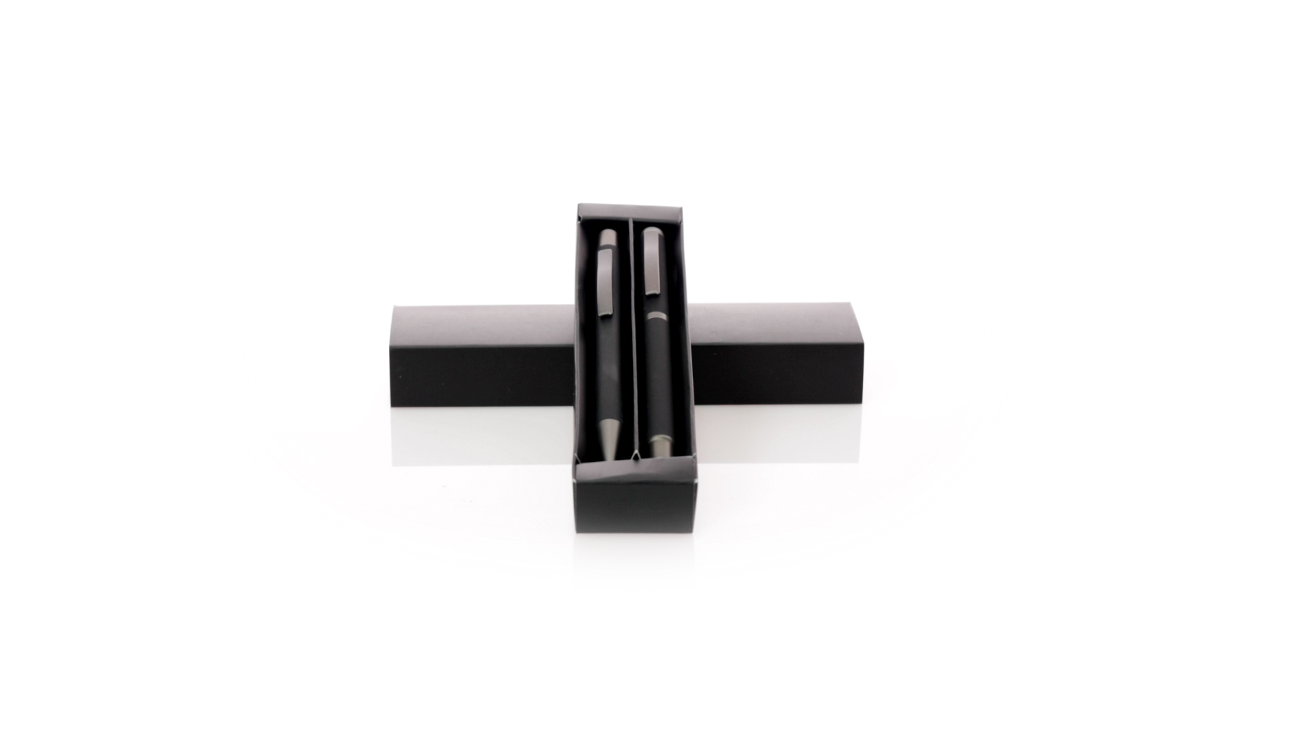 Stilvolles Kugelschreiber- und Tintenroller-Set. Druckkugelschreiber und Tintenroller mit Kappe, beide mit Metallclip, Jumbo-Mine und blauer Tinte. Schaft in verschiedenen Volltonfarben, mit gummierter Oberfläche und dunkelgrauen Metallic-Akzenten. Präsentiert in einem farblich passenden Etui mit einem ausgestanzten Fach für jedes Teil.
