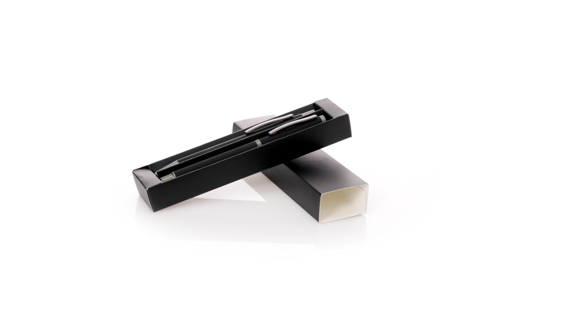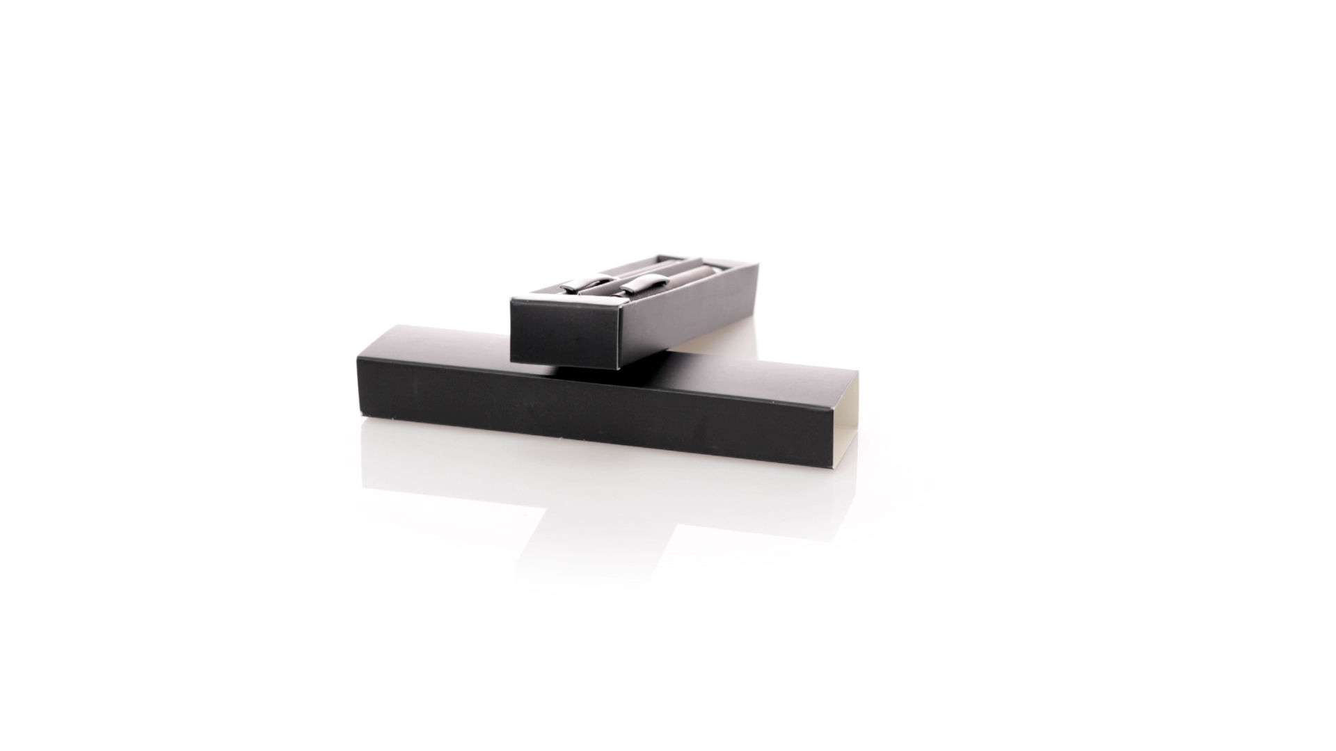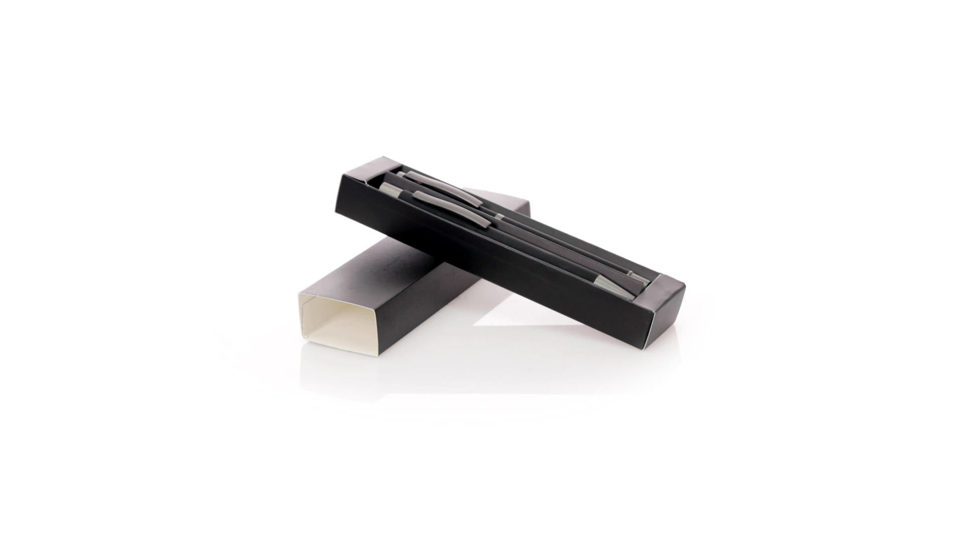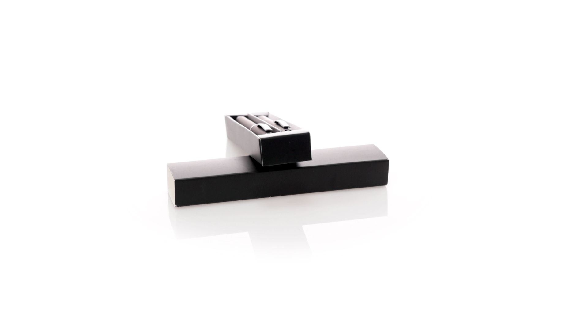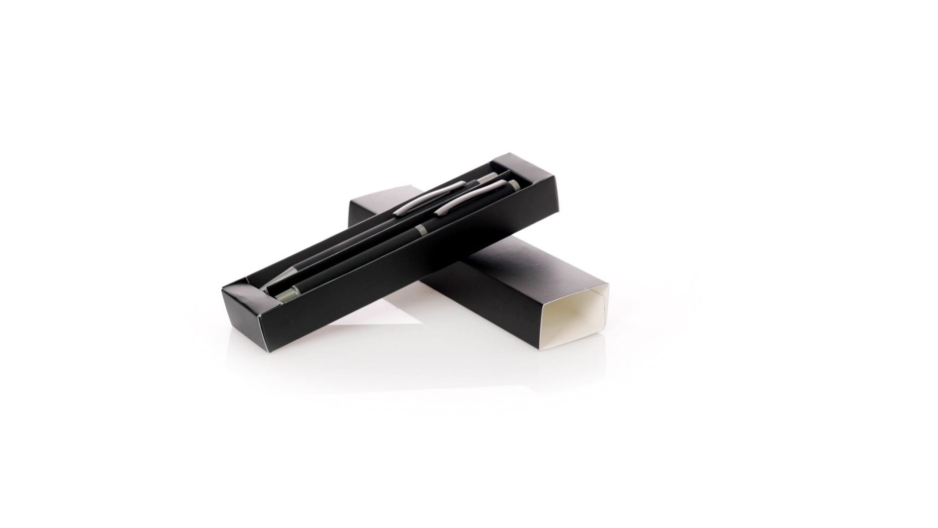 Stilvolles Kugelschreiber- und Tintenroller-Set. Druckkugelschreiber und Tintenroller mit Kappe, beide mit Metallclip, Jumbo-Mine und blauer Tinte. Schaft in verschiedenen Volltonfarben, mit gummierter Oberfläche und dunkelgrauen Metallic-Akzenten. Präsentiert in einem farblich passenden Etui mit einem ausgestanzten Fach für jedes Teil.