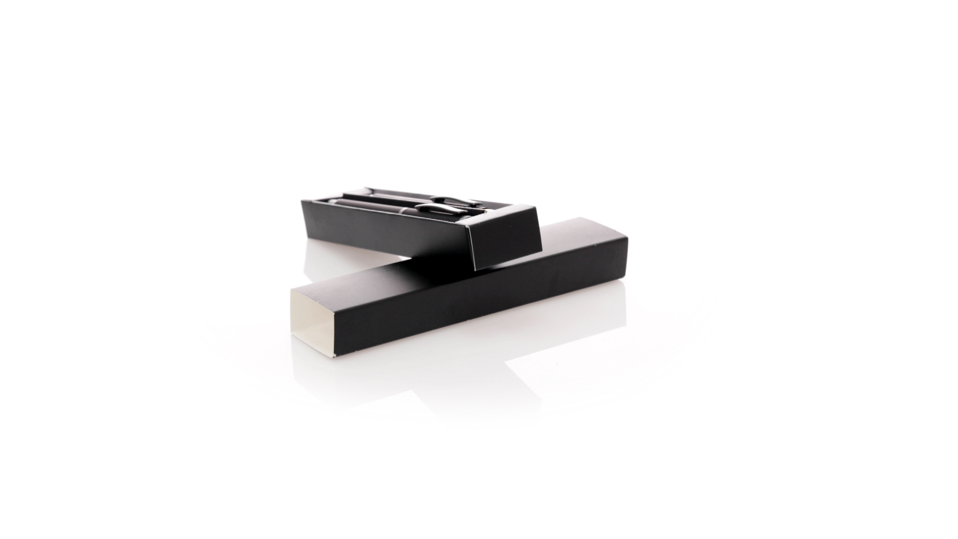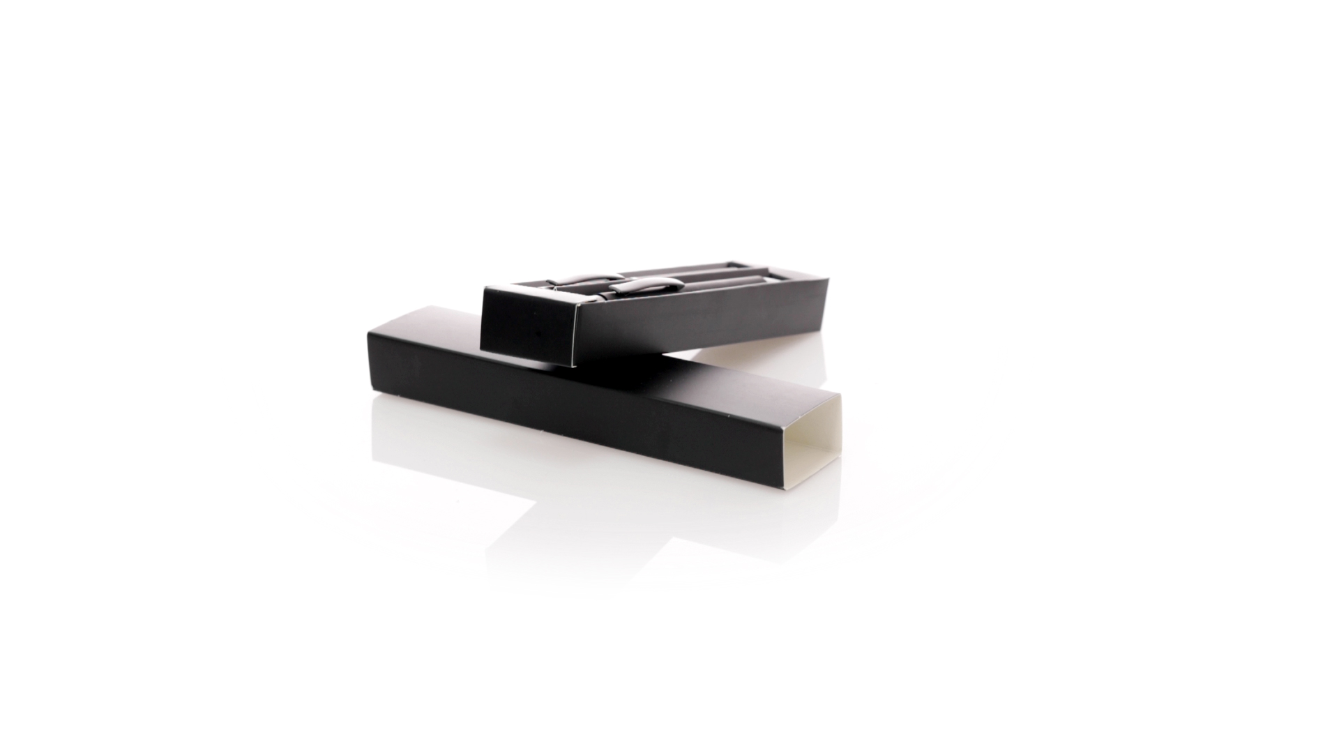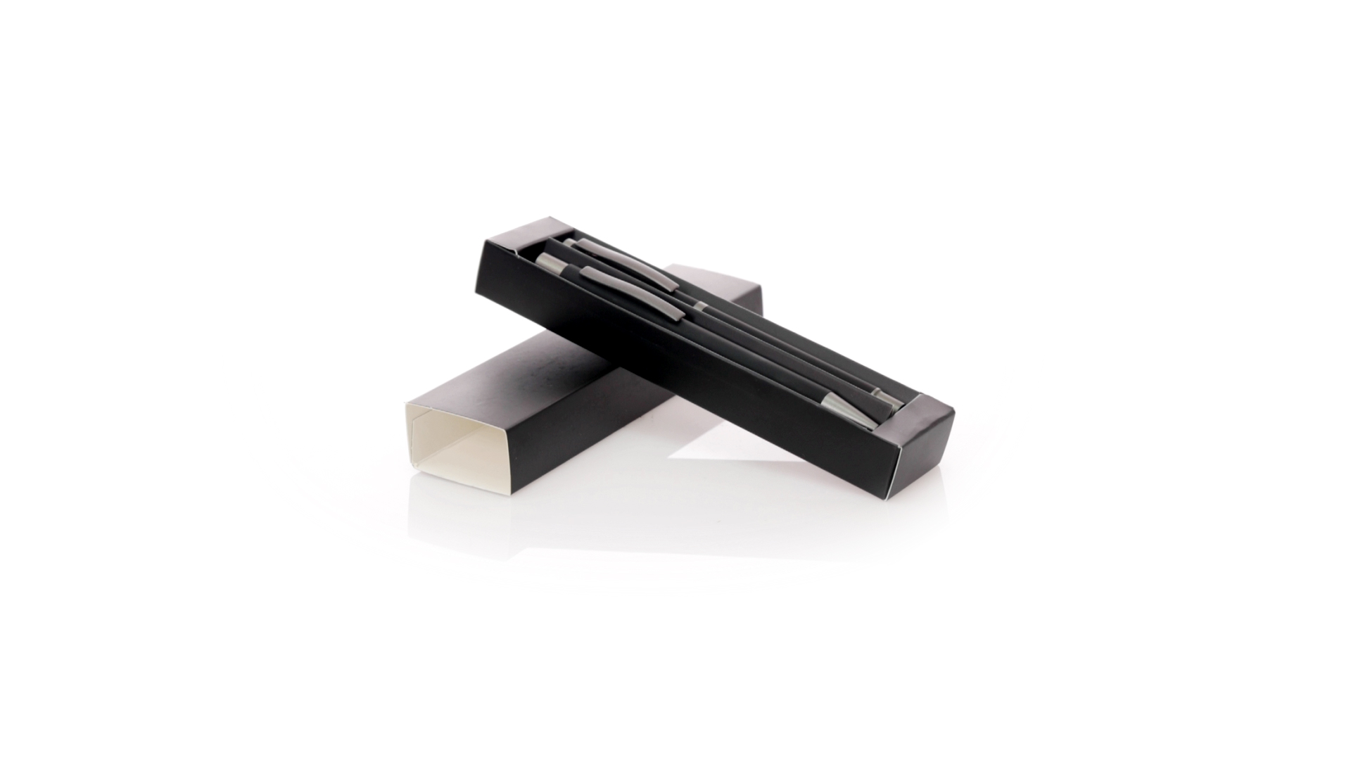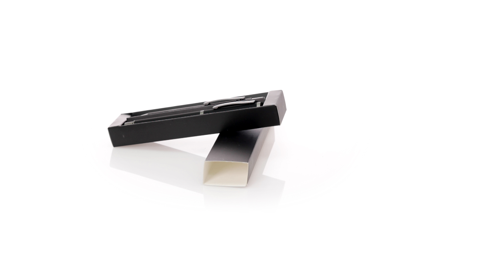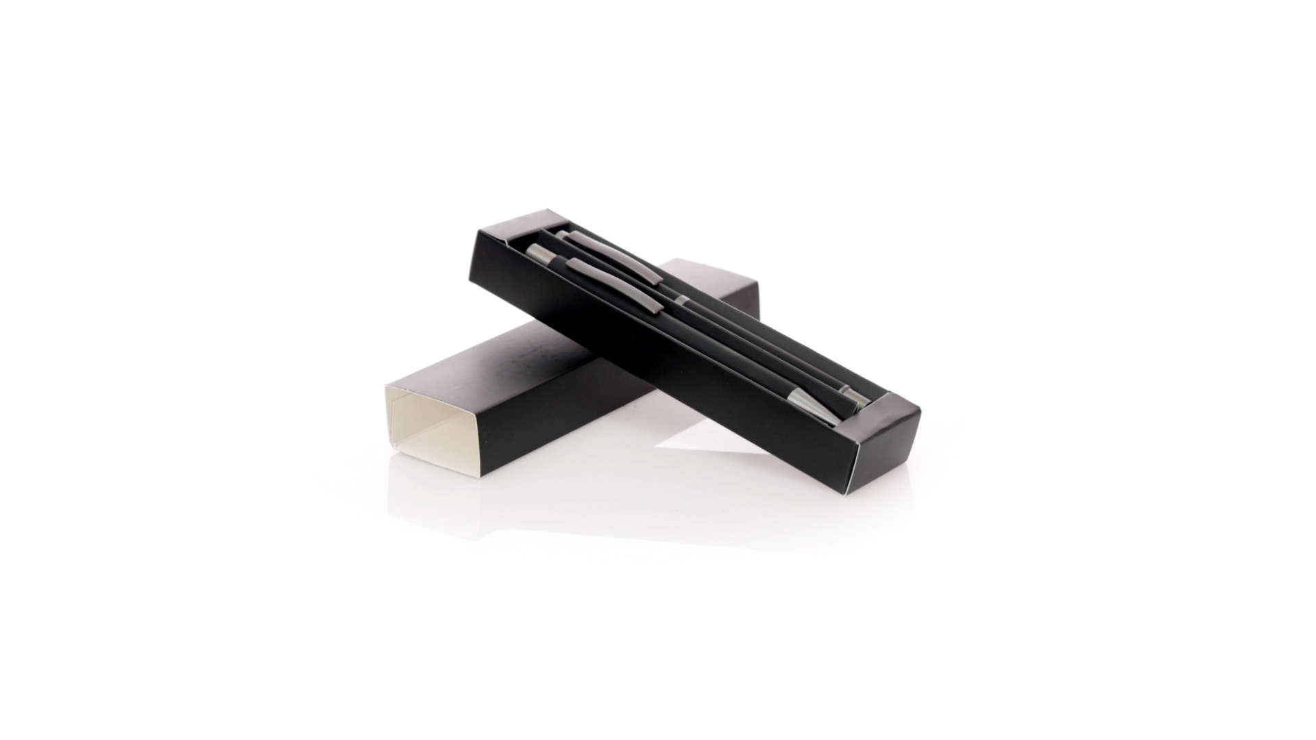 Stilvolles Kugelschreiber- und Tintenroller-Set. Druckkugelschreiber und Tintenroller mit Kappe, beide mit Metallclip, Jumbo-Mine und blauer Tinte. Schaft in verschiedenen Volltonfarben, mit gummierter Oberfläche und dunkelgrauen Metallic-Akzenten. Präsentiert in einem farblich passenden Etui mit einem ausgestanzten Fach für jedes Teil.