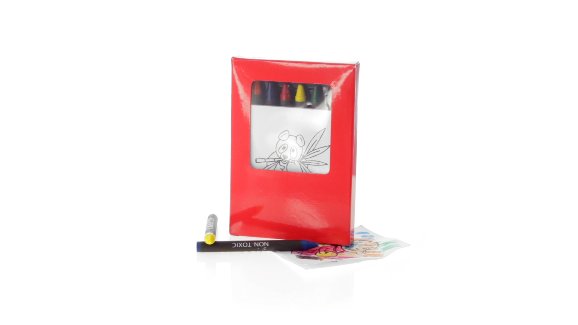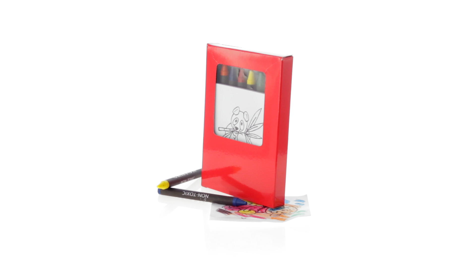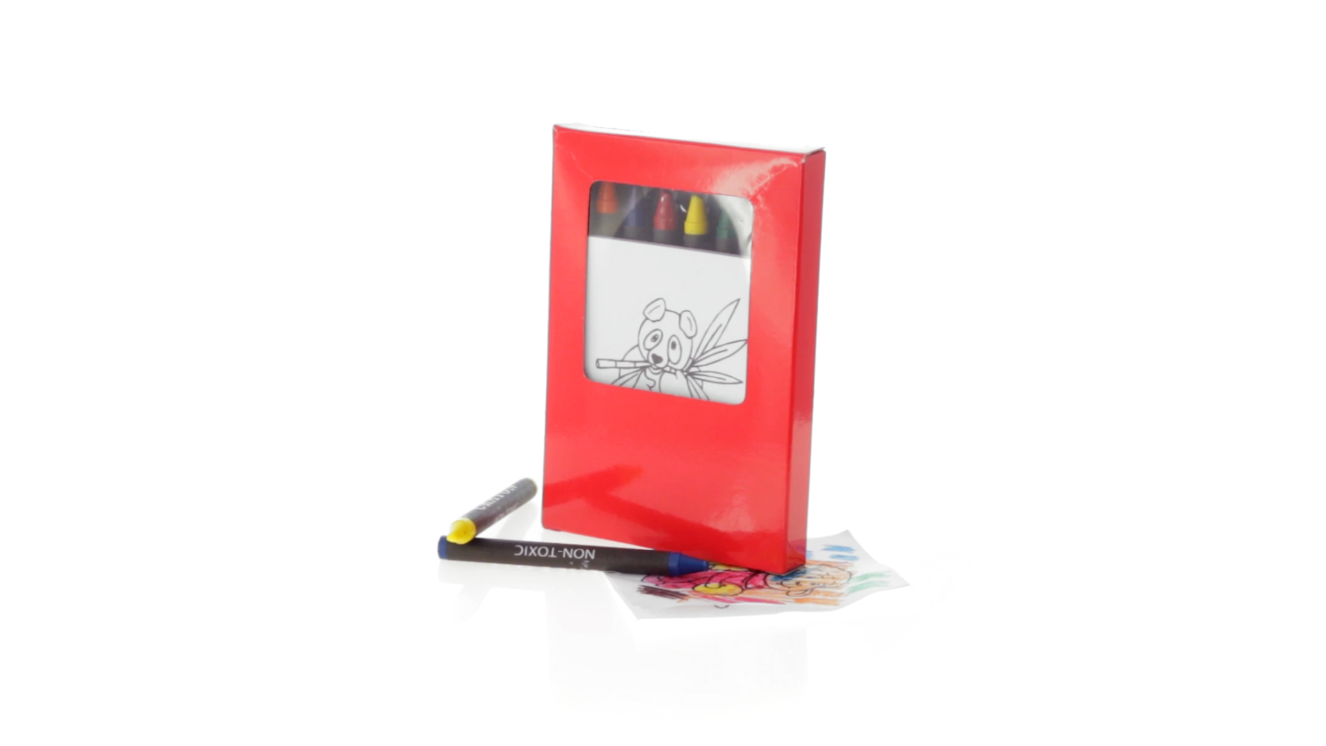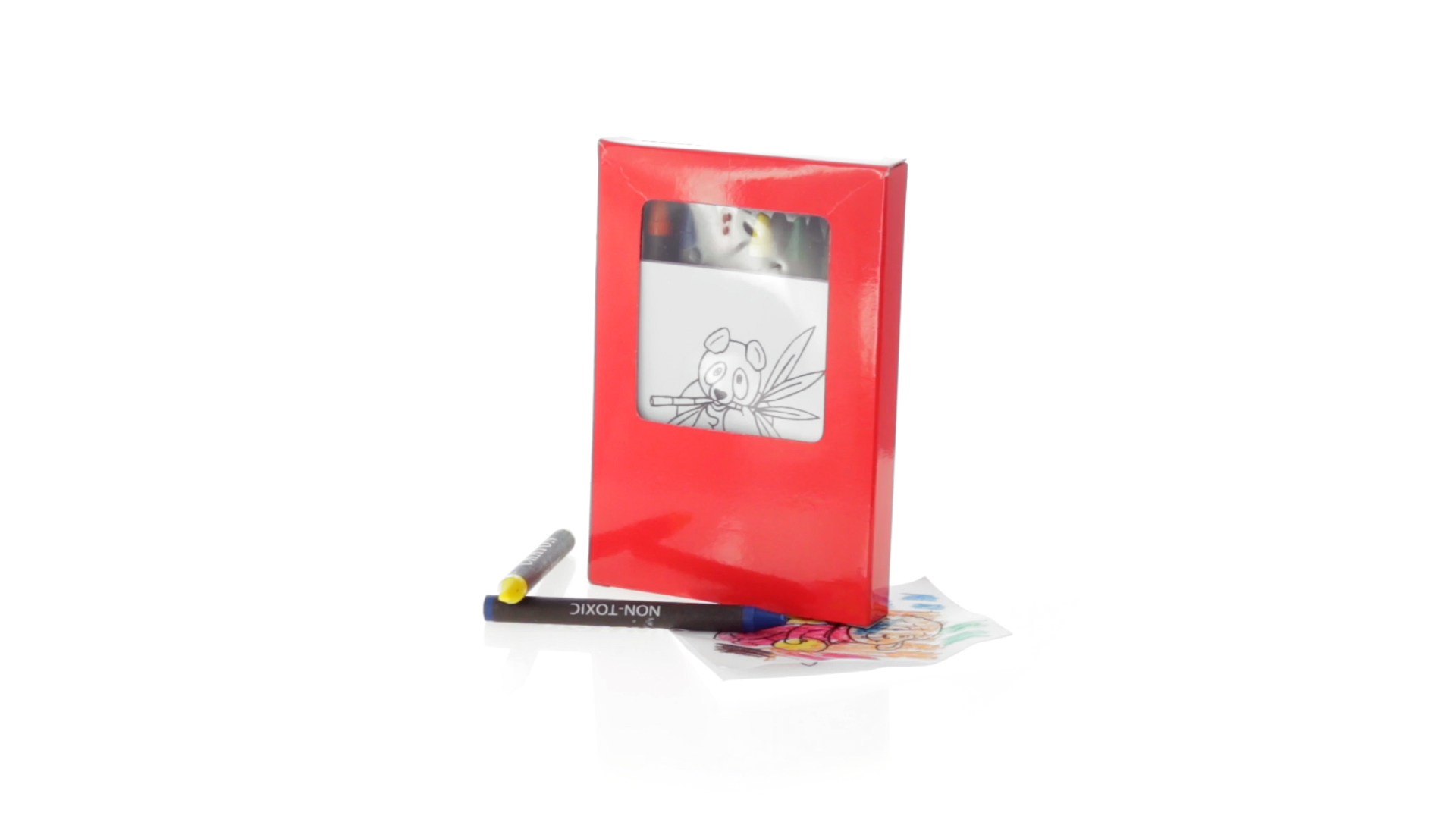 7-teiliges Mal-Set, präsentiert in einer Kartonschachtel in lebendigen Farben. Enthält 6 Wachsmalstifte mit zylinderförmigem Gehäuse in verschiedenen Farben und einen Block mit lustigen Motiven zum Ausmalen.
